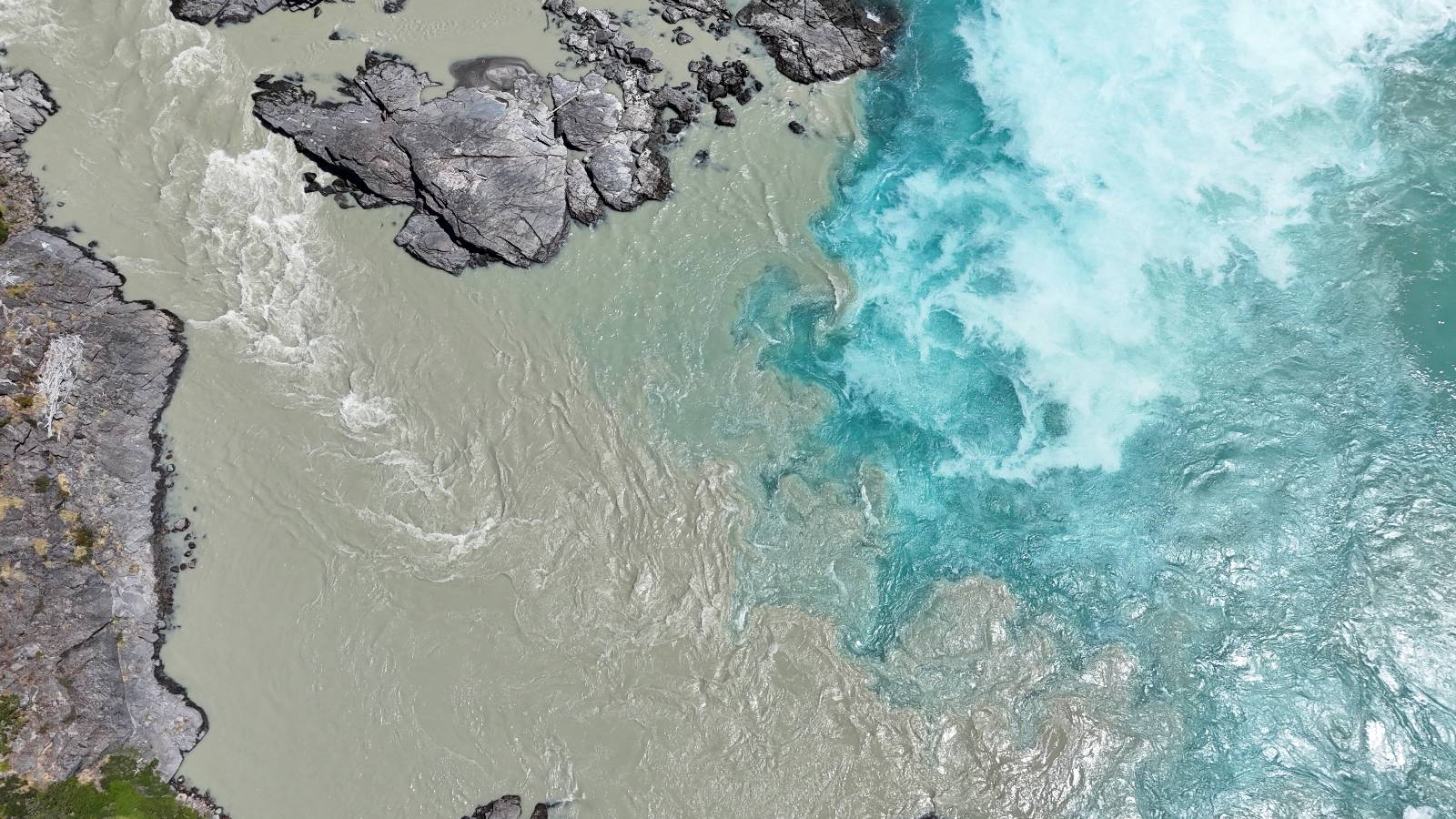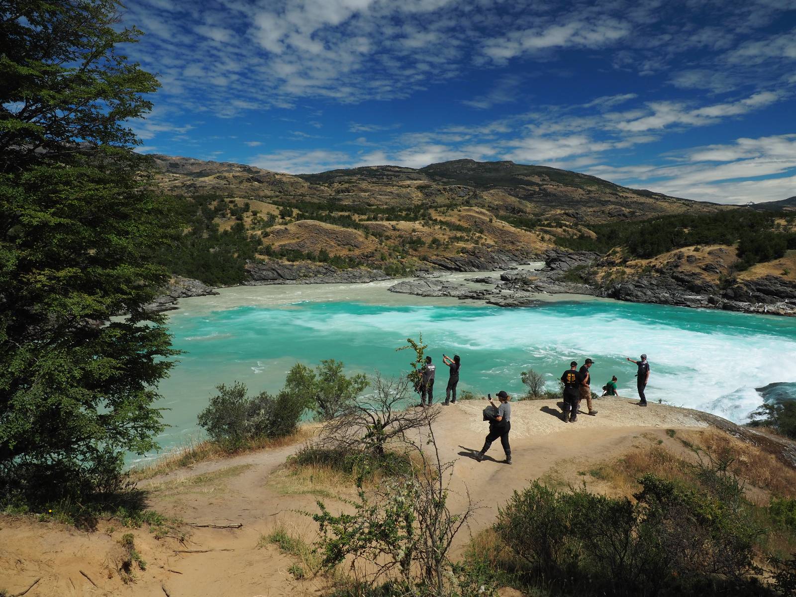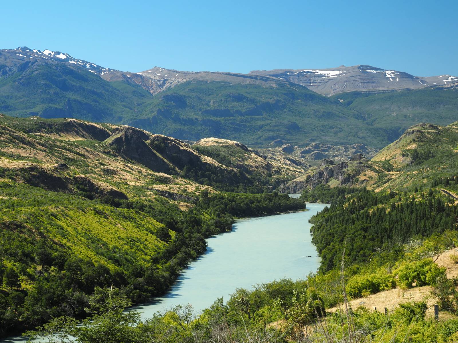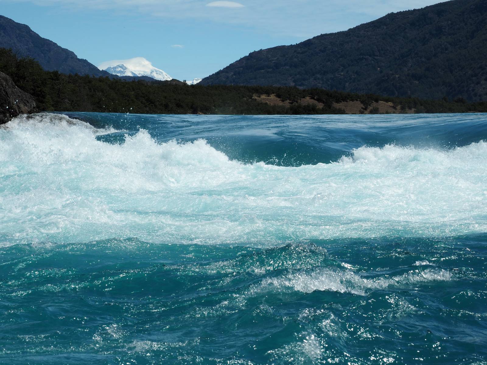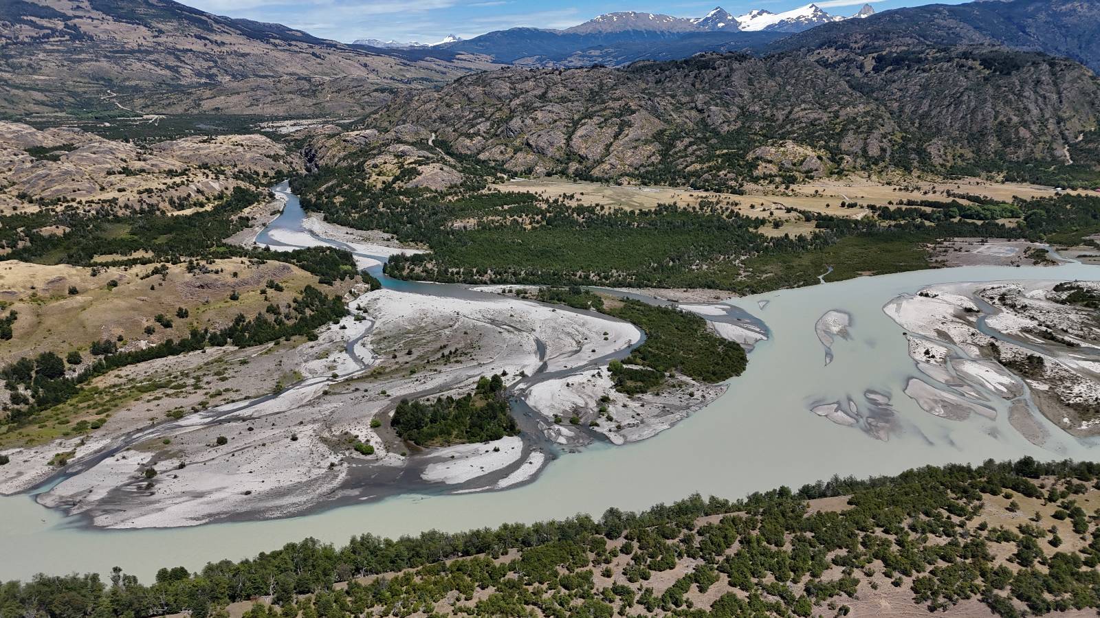 Schon bald fahre ich entlang des Rio Baker, der mit der selben blauen Farbe zu meiner Rechten dahinfließt. Ich zaudere anzuhalten oder nicht…, fahre aber durch, bis ich zum Parkplatz für die Confluencia von Rio Baker und Rio Neff komme. Ich muß ein Stückchen laufen aber es lohnt sich definitiv! Es ist eine wirklich große Stromschnelle, mit der sich der Rio Baker in den etwas schlammigeren Rio Neff ergießt aber gerade dieser Farbunterschied und die Wildheit des Flußßes macht das ganze Schauspiel unwahrscheinlich beeindruckend! Ich fotografiere wie wild, filme und lasse die Drohne fliegen und genieße natürlich auch so das Schauspiel. Die Sonne scheint und es ist ein herrlicher Tag, für den ich mal wieder sehr dankbar bin! An einer passenden Stelle etwas oberhalb erfrische ich mich im Rio Baker und trinke einen Schluck, auch auf die Gefahr hin Schlumpffarbe anzunehmen! Ein Ehepaar aus Argentinien fragt, wo ich her komme und so plauschen wir ein wenig und ich bekomme das Kompliment, das mein Spanisch sehr gut wäre. Hahaha! Ich nehme es gerne an als Motivation aber ich weiß, dass es nur sehr rudimenter taugt! Dafür kann der Herr tatsächlich ein paar Brocken Deutsch! Und so kann ich zurückloben. Der restliche Weg führt mich bis Cochrane, wiederum mit tollen Ausblicken und ein paar doofen Baustellen wo man schon mal 10-15min stehen muß. Das macht es nicht unbedingt gemütlich bei der Wärme und dem Staub, der von den Entgegenkommern aufgewirbelt wird. Vor mir steht ein Paar aus Argentinien mit ihrer R1000 und füllt Dichtmittel in den Hinterreifen und pump ihn noch weitestgehen auf. Ich frage, ob ich helfen kann aber sie wollen es so bis Cochrane schaffen. Ich bleibe eine Weile hinten dran, fallls es doch nötig wäre aber kurz vor Cochrane lasse ich sie ziehen und genieße noch einmal einen herrlichen Aussichtspunkt. Cochrane ist nicht wirklich spannend aber in guter Distanz als Zwischenstop mittendrin. Am ersten Hostal, wo ich anfrage ist alles belegt. lustigerweise sehe ich dort das Motorrad von Matthias stehen. Im Hostal schräg gegenüber werde ich fündig und quartiere mich ein.