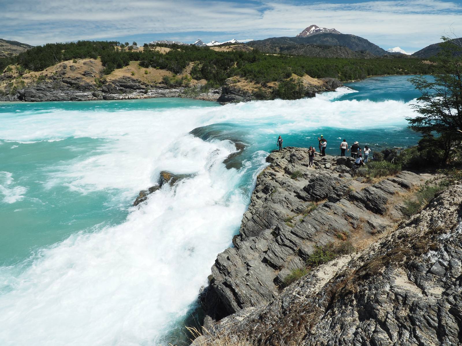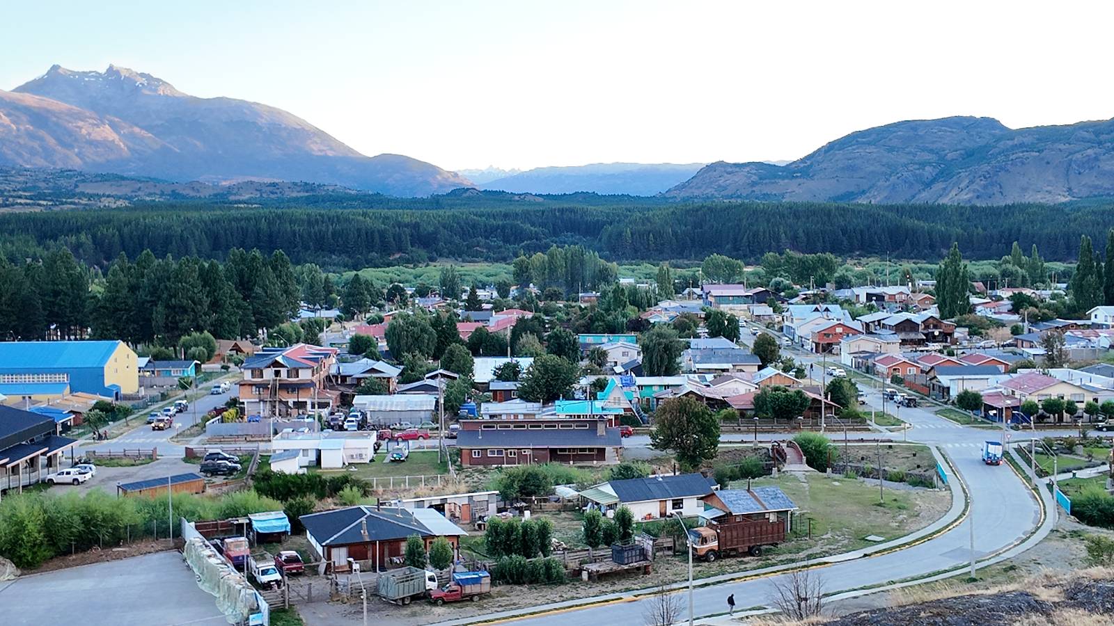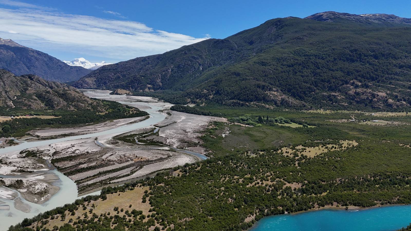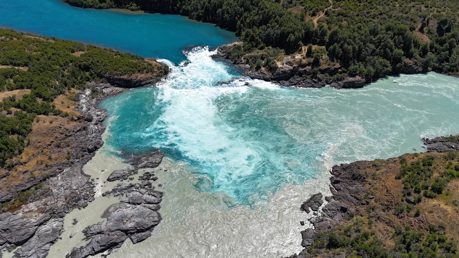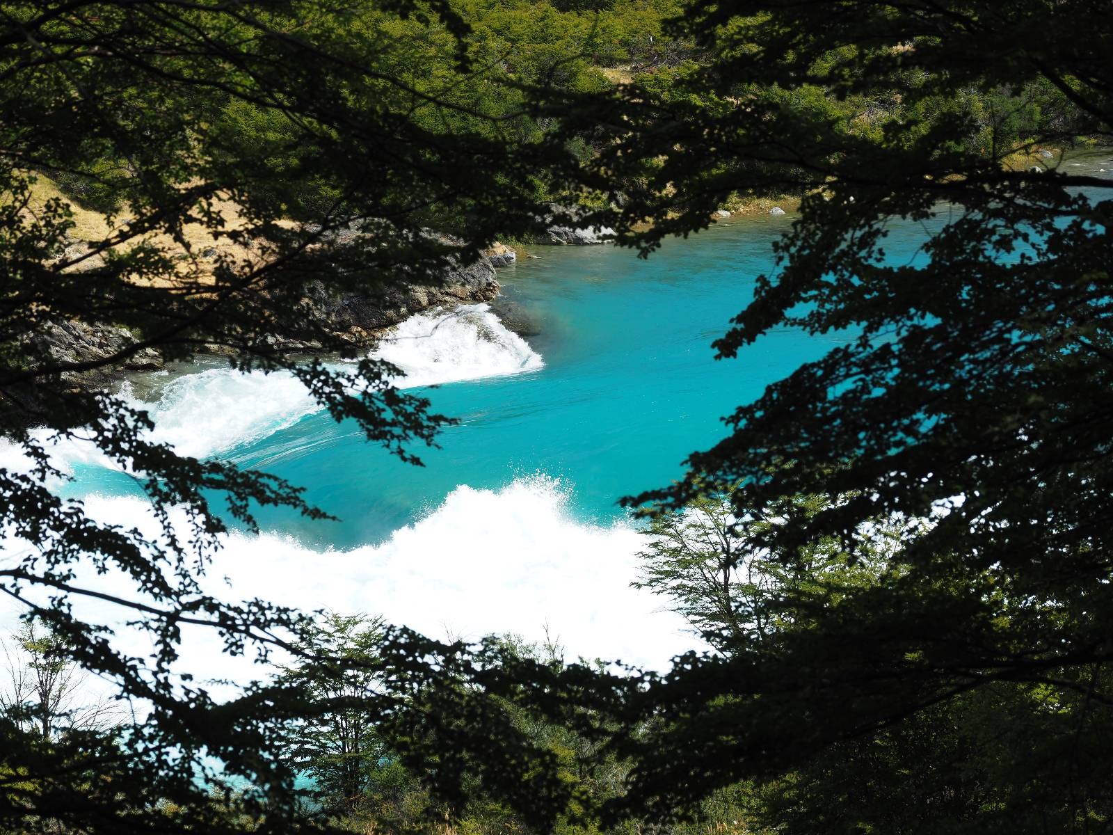 Schon bald fahre ich entlang des Rio Baker, der mit der selben blauen Farbe zu meiner Rechten dahinfließt. Ich zaudere anzuhalten oder nicht…, fahre aber durch, bis ich zum Parkplatz für die Confluencia von Rio Baker und Rio Neff komme. Ich muß ein Stückchen laufen aber es lohnt sich definitiv! Es ist eine wirklich große Stromschnelle, mit der sich der Rio Baker in den etwas schlammigeren Rio Neff ergießt aber gerade dieser Farbunterschied und die Wildheit des Flußßes macht das ganze Schauspiel unwahrscheinlich beeindruckend! Ich fotografiere wie wild, filme und lasse die Drohne fliegen und genieße natürlich auch so das Schauspiel. Die Sonne scheint und es ist ein herrlicher Tag, für den ich mal wieder sehr dankbar bin! An einer passenden Stelle etwas oberhalb erfrische ich mich im Rio Baker und trinke einen Schluck, auch auf die Gefahr hin Schlumpffarbe anzunehmen! Ein Ehepaar aus Argentinien fragt, wo ich her komme und so plauschen wir ein wenig und ich bekomme das Kompliment, das mein Spanisch sehr gut wäre. Hahaha! Ich nehme es gerne an als Motivation aber ich weiß, dass es nur sehr rudimenter taugt! Dafür kann der Herr tatsächlich ein paar Brocken Deutsch! Und so kann ich zurückloben. Der restliche Weg führt mich bis Cochrane, wiederum mit tollen Ausblicken und ein paar doofen Baustellen wo man schon mal 10-15min stehen muß. Das macht es nicht unbedingt gemütlich bei der Wärme und dem Staub, der von den Entgegenkommern aufgewirbelt wird. Vor mir steht ein Paar aus Argentinien mit ihrer R1000 und füllt Dichtmittel in den Hinterreifen und pump ihn noch weitestgehen auf. Ich frage, ob ich helfen kann aber sie wollen es so bis Cochrane schaffen. Ich bleibe eine Weile hinten dran, fallls es doch nötig wäre aber kurz vor Cochrane lasse ich sie ziehen und genieße noch einmal einen herrlichen Aussichtspunkt. Cochrane ist nicht wirklich spannend aber in guter Distanz als Zwischenstop mittendrin. Am ersten Hostal, wo ich anfrage ist alles belegt. lustigerweise sehe ich dort das Motorrad von Matthias stehen. Im Hostal schräg gegenüber werde ich fündig und quartiere mich ein.