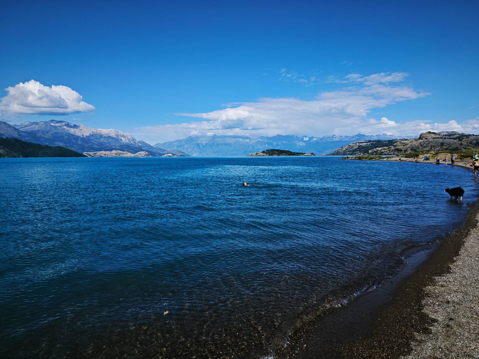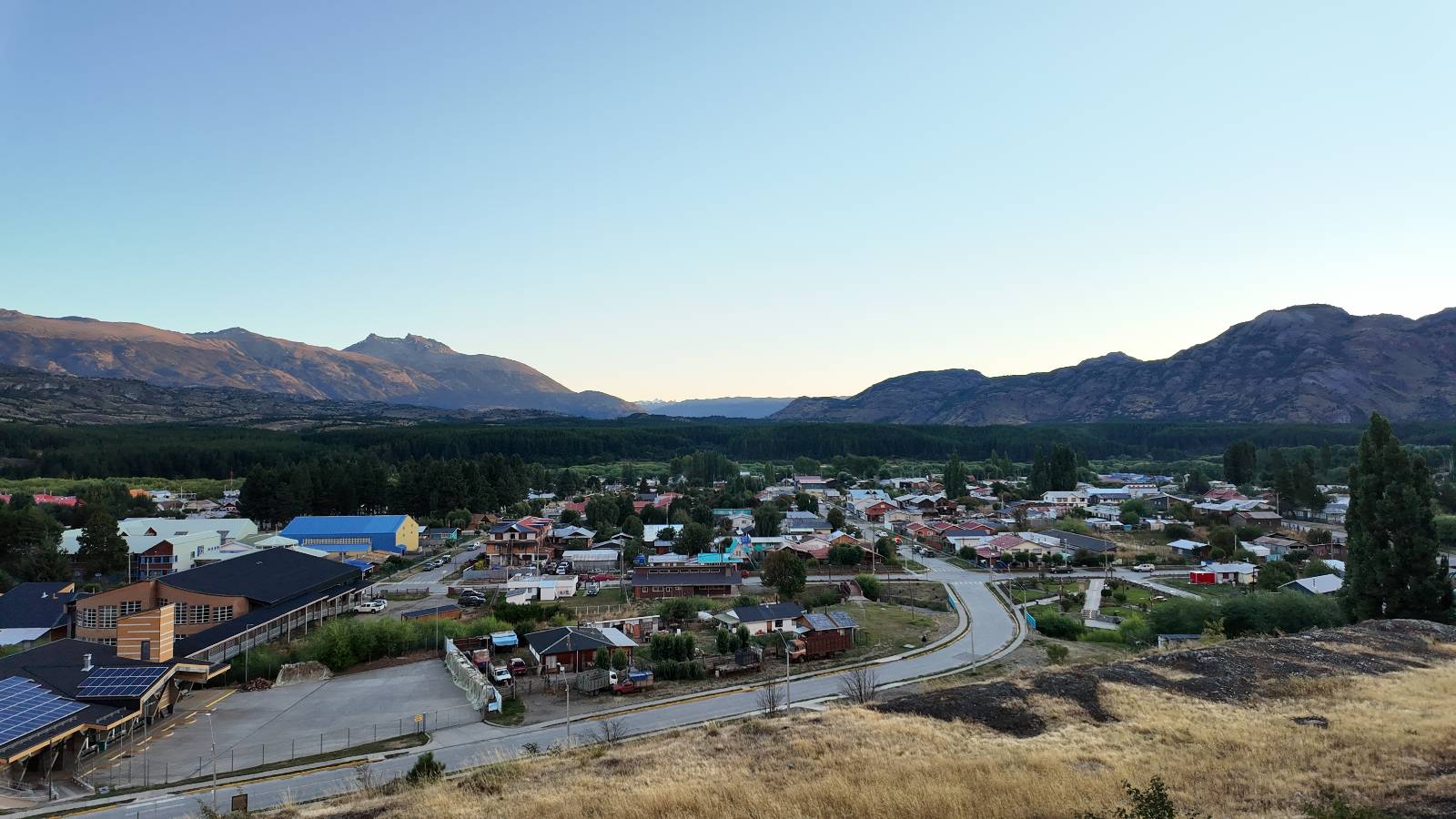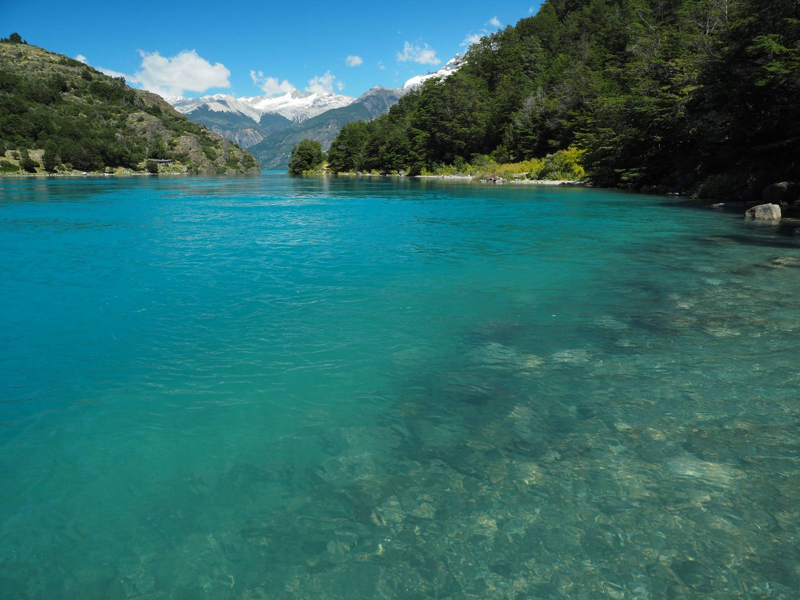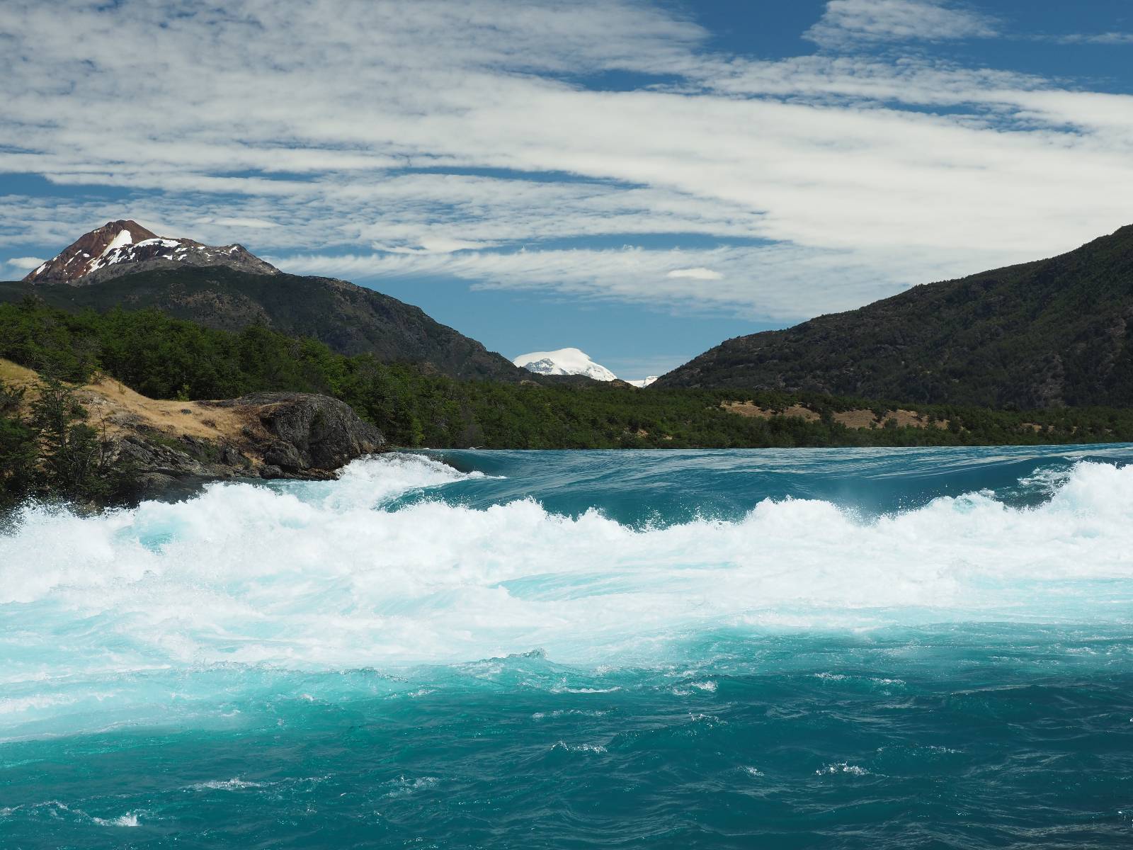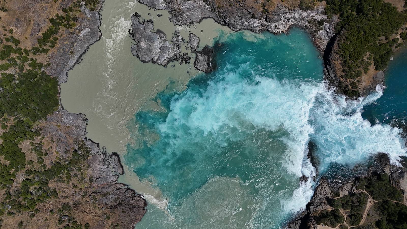 Schon bald fahre ich entlang des Rio Baker, der mit der selben blauen Farbe zu meiner Rechten dahinfließt. Ich zaudere anzuhalten oder nicht…, fahre aber durch, bis ich zum Parkplatz für die Confluencia von Rio Baker und Rio Neff komme. Ich muß ein Stückchen laufen aber es lohnt sich definitiv! Es ist eine wirklich große Stromschnelle, mit der sich der Rio Baker in den etwas schlammigeren Rio Neff ergießt aber gerade dieser Farbunterschied und die Wildheit des Flußßes macht das ganze Schauspiel unwahrscheinlich beeindruckend! Ich fotografiere wie wild, filme und lasse die Drohne fliegen und genieße natürlich auch so das Schauspiel. Die Sonne scheint und es ist ein herrlicher Tag, für den ich mal wieder sehr dankbar bin! An einer passenden Stelle etwas oberhalb erfrische ich mich im Rio Baker und trinke einen Schluck, auch auf die Gefahr hin Schlumpffarbe anzunehmen! Ein Ehepaar aus Argentinien fragt, wo ich her komme und so plauschen wir ein wenig und ich bekomme das Kompliment, das mein Spanisch sehr gut wäre. Hahaha! Ich nehme es gerne an als Motivation aber ich weiß, dass es nur sehr rudimenter taugt! Dafür kann der Herr tatsächlich ein paar Brocken Deutsch! Und so kann ich zurückloben. Der restliche Weg führt mich bis Cochrane, wiederum mit tollen Ausblicken und ein paar doofen Baustellen wo man schon mal 10-15min stehen muß. Das macht es nicht unbedingt gemütlich bei der Wärme und dem Staub, der von den Entgegenkommern aufgewirbelt wird. Vor mir steht ein Paar aus Argentinien mit ihrer R1000 und füllt Dichtmittel in den Hinterreifen und pump ihn noch weitestgehen auf. Ich frage, ob ich helfen kann aber sie wollen es so bis Cochrane schaffen. Ich bleibe eine Weile hinten dran, fallls es doch nötig wäre aber kurz vor Cochrane lasse ich sie ziehen und genieße noch einmal einen herrlichen Aussichtspunkt. Cochrane ist nicht wirklich spannend aber in guter Distanz als Zwischenstop mittendrin. Am ersten Hostal, wo ich anfrage ist alles belegt. lustigerweise sehe ich dort das Motorrad von Matthias stehen. Im Hostal schräg gegenüber werde ich fündig und quartiere mich ein.