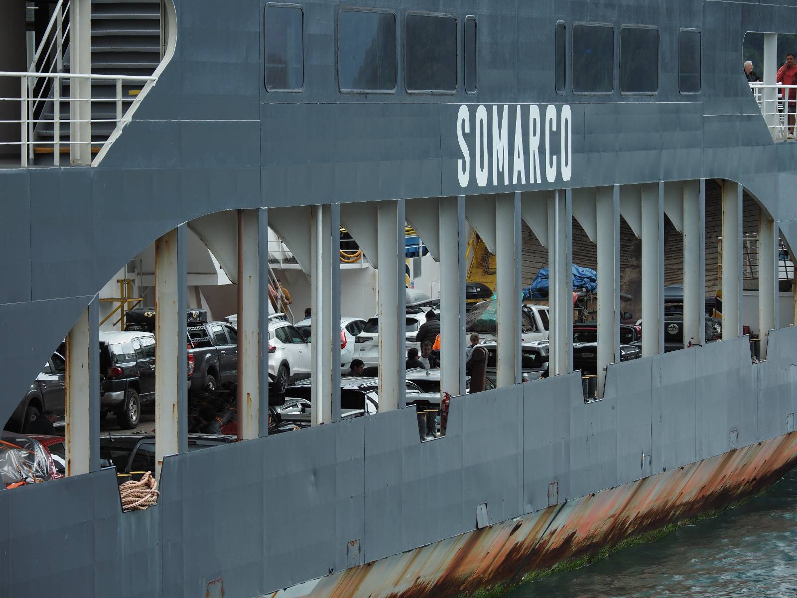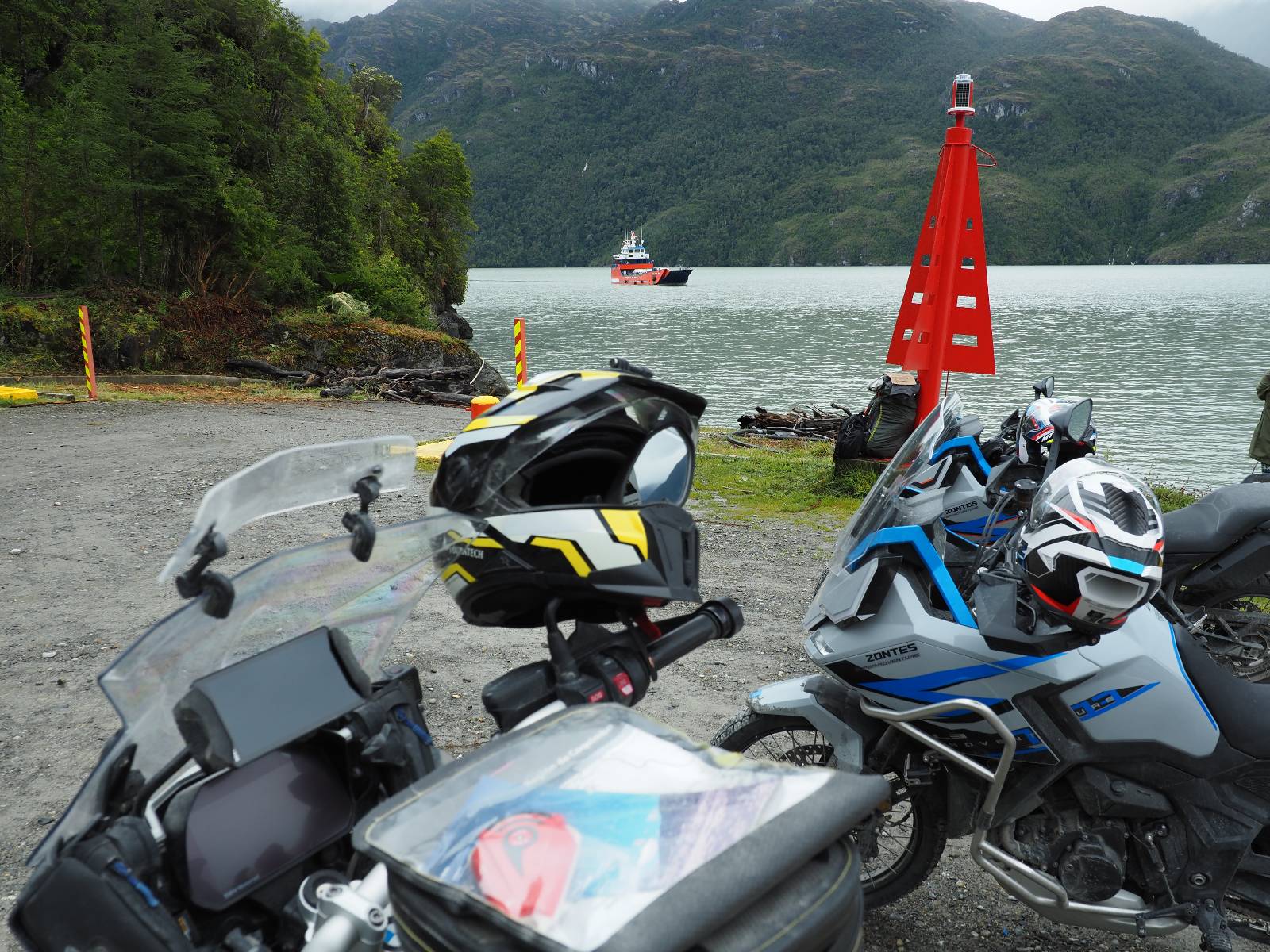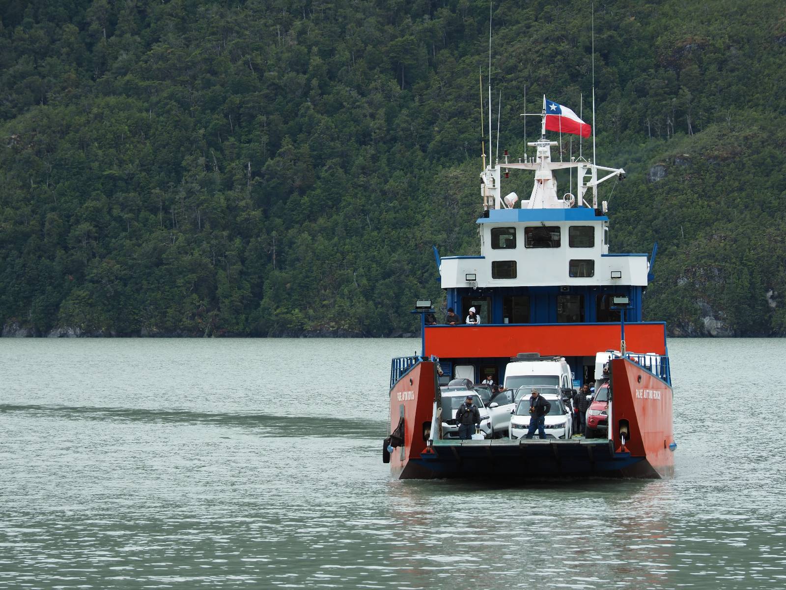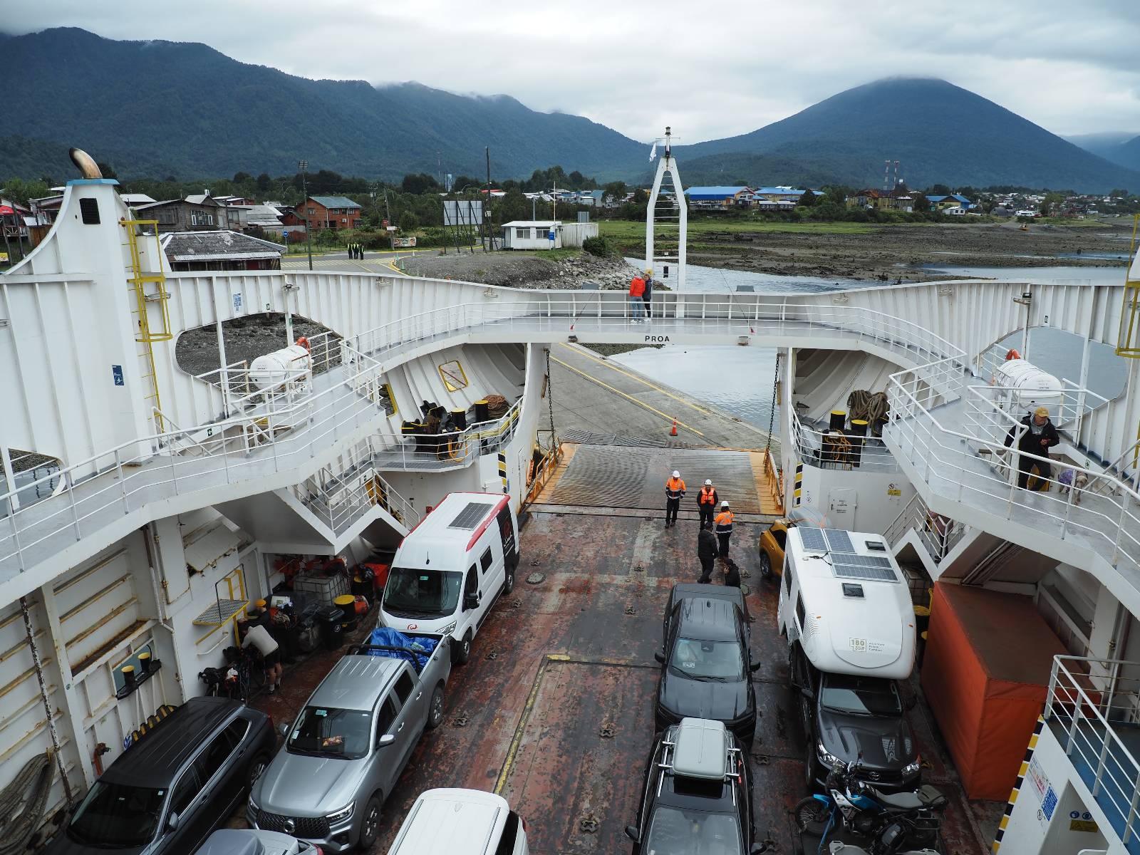 Und so passiert es dann auch. Die Motorräder allesamt als erstes ins Unterdeck und links und rechts vom Mittelstreifen geparkt, damit da dann jeweils die Autos daneben können. Die Jungs sind sichtlich erleichtert! Die erste und fast drei stündige Fahrt geht bis Leptepu, da noch ein paar wenige Kilometer über Land bis nach Fiordo Largo und dann auf eine kleinere Fähre drauf, um noch bis Caleta Gonzalo zu kommen. Die kleine Fähre muss mehrmals fahren, um alle Fahrzeuge die auf der Großen waren abzuarbeiten. Aber Motorräder wieder zuerst!