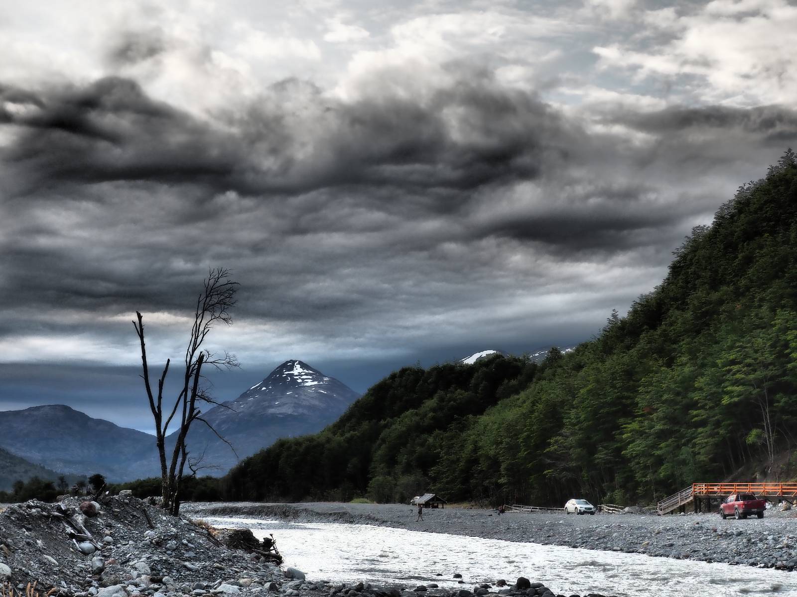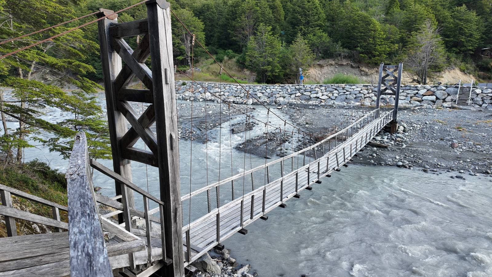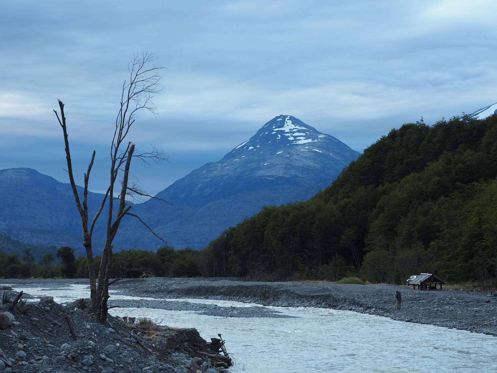 Es regnet in der Nacht und auch am Morgen als ich packe! Ich treffe noch einmal kurz Jose und Carlos. Die beiden wollen, geführt, mit einem Unimog durch den Fluß den ich gestern über die Brücke überquert habe. Ich bin neidisch! Später sehe ich einen kleinen Film! Wirklich cool! Es tröpfelt immer mal wieder und Feuchtigkeit hängt in der Luft aber wirklich nass wird es nicht. Dafür staubt dann auch die Schotterstraße nicht, was ich super angenehm finde! Zurück an der Fähre stehen nur noch zwei andere Motorräder und somit ist das Mitkommen, gleich mit der nächsten kein Problem. Ich komme mit eine Familienvater ins Gespräch. Ich hatte ihn mit seiner Familie in O’Higgins getroffen, als wir gemeinsam den Start einer Herkules vom dortigen Flugplatz beobachteten. Eigentlich können seine Kinder auch deutsch sagt er aber, sie ware dann doch zu scheu. Ich halte noch einmal in Cochrane im selben Hostal, um dann am nächsten Tag etwas nördlich über den wunderschönen Paso Roballo nach Argentinien zu wechseln und somit vorerst die Carretera Austral wirklich beende.