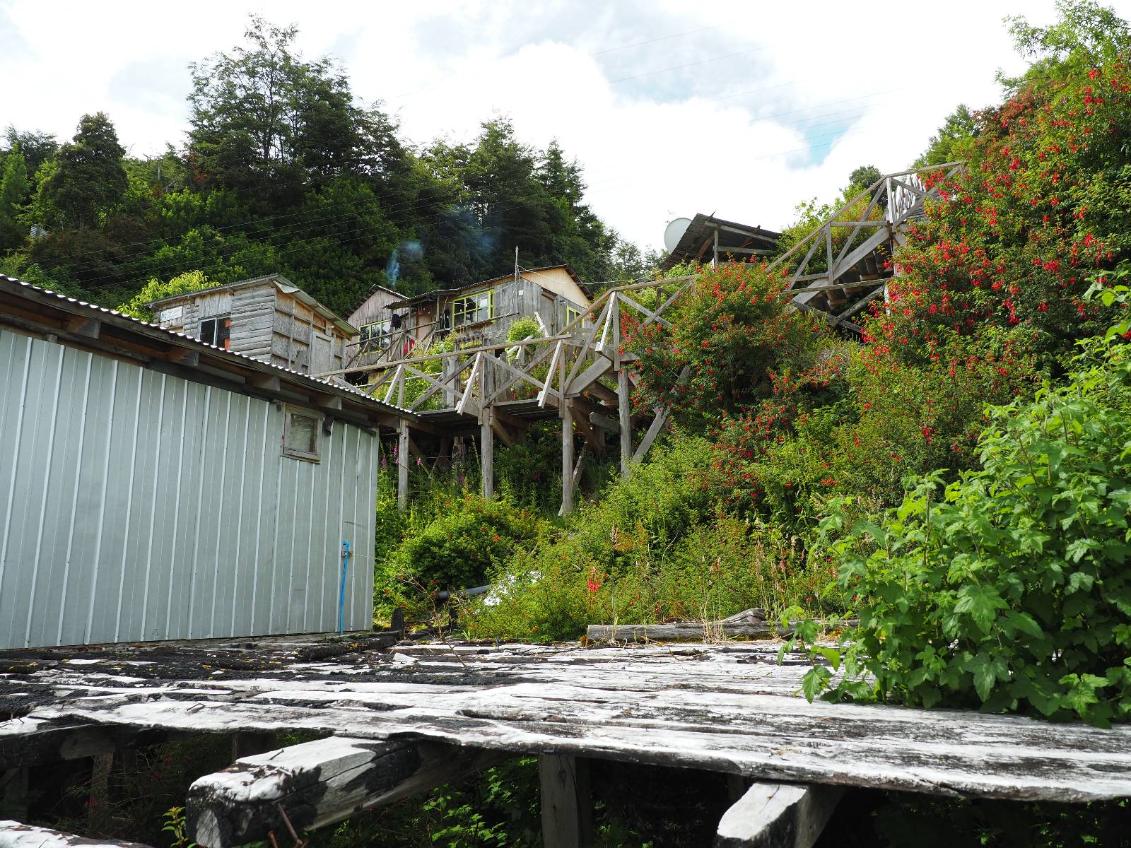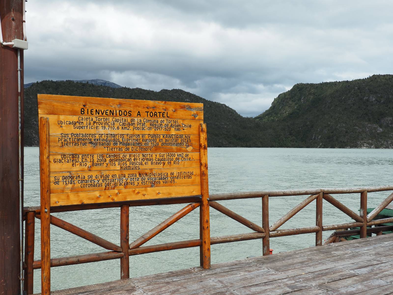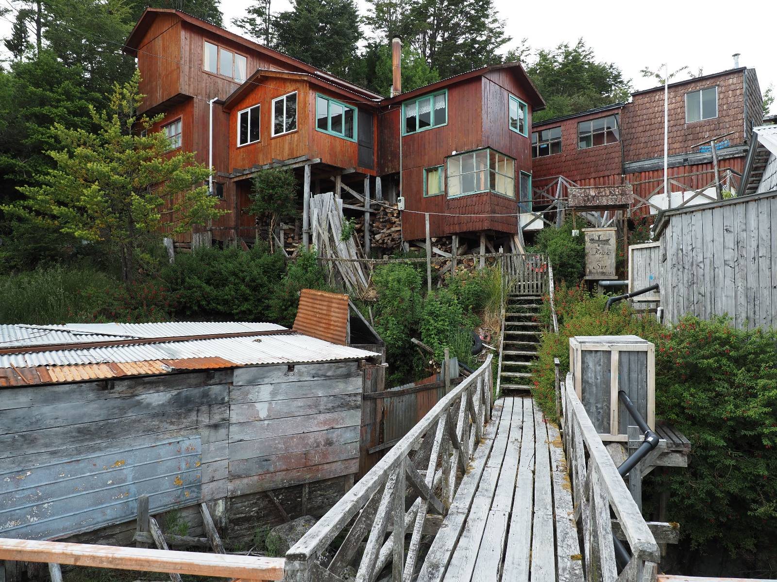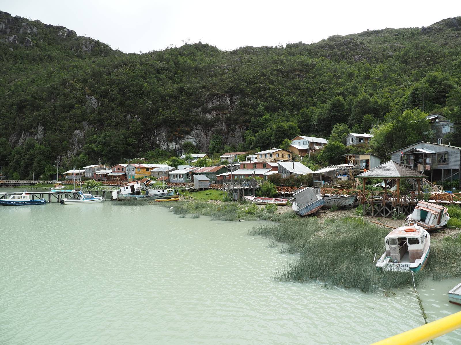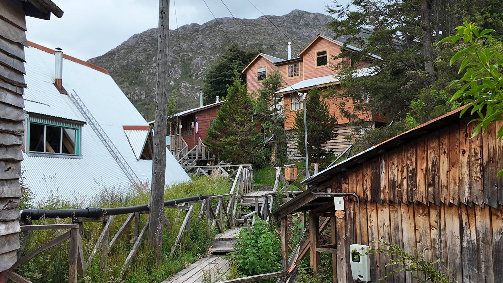 Matthias treffe ich am nächsten Tag an der Tankstelle. Wie wohl für alle ist das nächste Ziel Caleta Tortel. Ein kleines Dorf, was sich entlang der Bucht Tortel erstreckt, das aber bis auf den Parkplatz und ein paar Häuser, Hotels und Tankstelle oberhalb, nur durch Holztreppen und -stege erreichbar ist. Wer sein Hotel also einen Kilometer weiter weg hat, darf schön schleppen! Ich habe wie immer nichts vorgebucht und viel Auswahl scheint es auch nicht zu geben aber ich will das Risiko eingehen! Matthias habe ich recht fix eingeholt und irgendwann auf der Strecke treffe ich auch Wolfgang der ein Päuschen macht. Es geht kein Wind, so wie teilweise an den Tagen davor auch schon und so steht der Staub auf der Schotterpiste beharrlich, egal ob vom Vorrausfahrenden, was ich als schlimmer empfinde, als auch von den Entgegenkommern. Gut durch dessen Wolke ist man irgendwann auch mal durch aber machnchmal sieht man kaum 20m. Wenn das nicht wäre, könnte man fast richtig angenehm die Landschaft drum herum genießen! Ich fahre in Caleta Tortel ein und das Parkplatzrondel ganz vorne ist brechend voll. Ich halte erstmal an der Seite von der Touriinfo aber bzgl. Unterkünften kann er mir nicht sehr viel helfen. Ich soll doch gleich mal da vorne fragen. Ein kleines Restaurant mit angeschlossenem Hostal hat tatsächlich noch was frei, auch zu einem Preis mit dem ich leben kann. Uns was ein Zufall, im Restaurant sitzten „Pi“ und Rowan, die gerade Mittag machen. Glücklicherweise wird direkt davor ein Parkplatz frei, den ich mir gleich schnappe und mich so stelle, dass evtl. auch noch ein zweites Motorrad platz findet. Matthias läuft mir über den Weg, er hat ein Hotel oberhalb mit direktem Parkplatz gefunden. Mein Zimmer ist klein und naja, nicht das allerbeste, was ich bisher hatte, mit Gemeinschaftsbad. Wobei ich erstmal der Einzige zu sein scheine! Ich will für zwei Tage bleiben. Für den nächsten Tag ist ordentlich Regen angesagt, beste Vorraussetzungen für ein bisschen Arbeit am Rechner. Ich gehe hoch ins Restaurant und schwatze noch etwas mit Paolo und esse dann selber eine Kleinigkeit! Der Rest des Tages geht natürlich für einen Spaziergang über die diversen Treppen und Stege drauf. Tortel erstreckt sich schon ein paar weinge Kilometer und irgendwie ist es ganz nett! Ich finde sogar einen kleinen Platz mit einer Kaffee-Imbisbude und nutze die Gelegenheit…, Kaffee und Kuchen zu machen! Ich wundere mich was sie mit „Berlin“ meinen, das haben sie auch im Angebot! Als ich die kleinen Runden Gebäckbälle sehe weiß ich, dass sie Pfannkuchen/Kräppl meinen. Allerdings sind sie, zumindest vom Aussehen, nicht mit unseren vergleichbar! Ich schländere weiter bis fast ans Ende vom Ort und über eine kleine Brücke und Steg laufe ich zum hiesigen Strand. Es gibt da eine kleine Bude für ein paar Souvenirs und ein paar Getränken und mir wäre glatt nach einem Bier… Hat sie aber nicht! Dafür einen Plastebecher mit zwei Pfirsichen und sowas wie Graupen am Boden, das sie mir anbietet. Sie meint, das ist „sehr Chilenisch“! Farblich etwas abschreckend, lasse ich mich darauf ein! Hm, also es ist lecker! Sehr sogar! Es ist süß aber eben nicht zu sehr. Schön fruchtig und die Graupen, von denen ich den Namen schon wieder vergessen habe, runden das ganze ab. Sie machen das Ganze etwas knackiger! Ich steige wieder Treppen rauf, komme in die ein oder andere Sackgasse und sehe das Gerippe von einem neuen Haus! Eigentlich sind es nur Latten, die ein Gerüst bilden, auf die dann Spanplatten genagelt werden. Ob es noch eine Dämmung gibt kann ich nicht sagen aber das was ich so bisher erlebt habe und auch in dem Zimmer in dem ich gerade bin, da hört man alles! Jedes Wort, jede Bewegung und die Temperaturen schwanken zusammen mit den Temperaturen draußen! Vielleicht etwas abgeschwächter aber spürbar, mit nur geringer Verzögerung. Der angekündigte Regen am nächsten Tag kommt und ich bin froh nicht auf dem Bock zu sitzen. Ob er mir allerdings auch das Motorrad sauber wäscht…? Ich sitze oben im Restaurant mit Blick auf die Bucht und den Regen und schreibe. Der Regen plattert ordentlich und ich habe ganz und gar nicht das Gefühl irgendetwas zu verpassen! Zum Abend hin lässt der Regen nach und ich bewege mich vorsichtig die Holztreppen nach unten. Mir läuft Wolfgang über den Weg, wir suchen beide etwas zu essen und ein Bier. Er will die Woche halbwegs aussitzen und dann die Drei-Tages-Fähre nach Puerto Natales nehmen. Sie kostet so um die 300,- EUR aber dafür spart man sich auch eine Menge Fahrerei und die Unterkünfte und bekommt, was ich so gehört habe, wunderbare Blicke auf die Bergen in den Fjorden! Über seinen Status erfahre ich später, dass er nicht mitgekommen ist. Es ist nicht wie bei den anderen Fähren, wo das Motorrad zur Not dazwischen gepresst wird. Hier geht es durch die Dauer der Fahrt darum, dass jeder Mitreisende einen Sitzplatz bekommt. Sind die ausgebucht, kommt man nicht mehr mit.