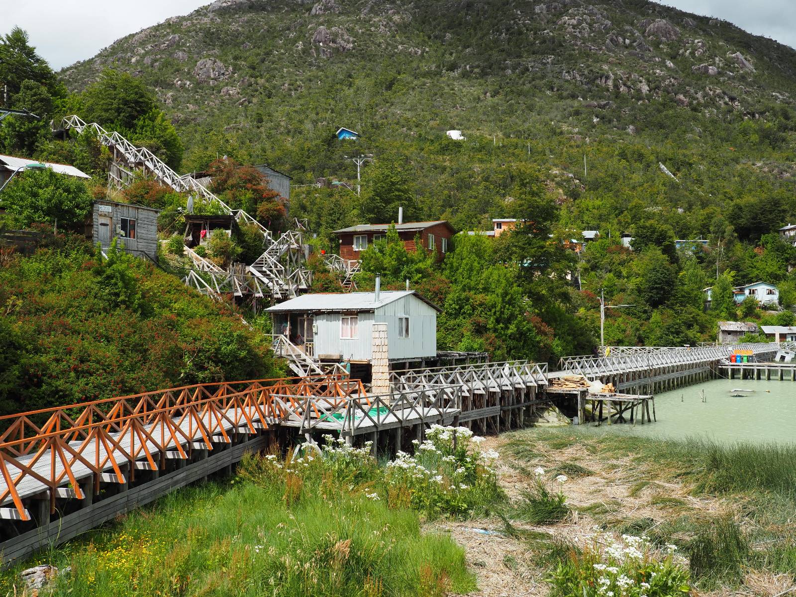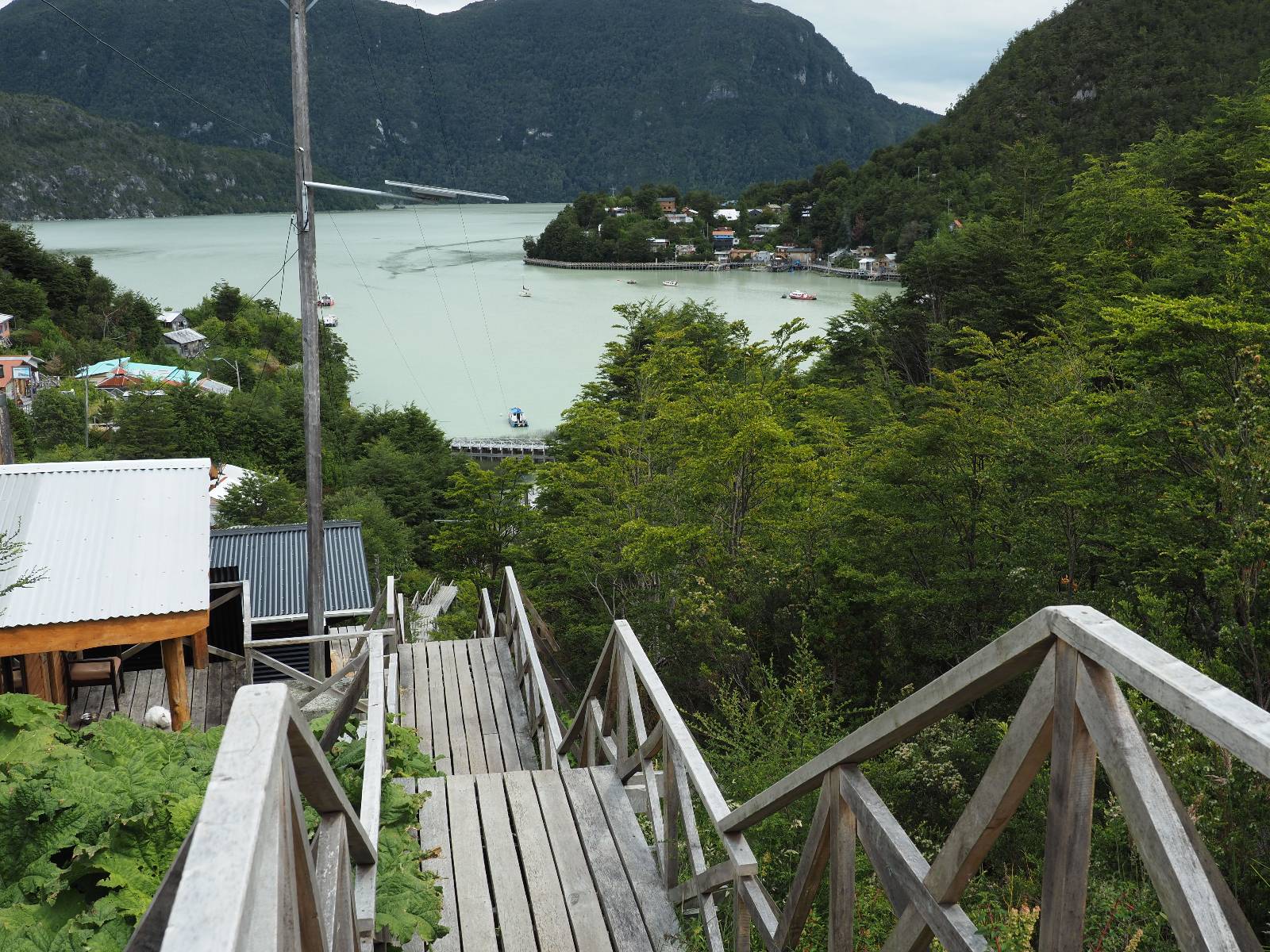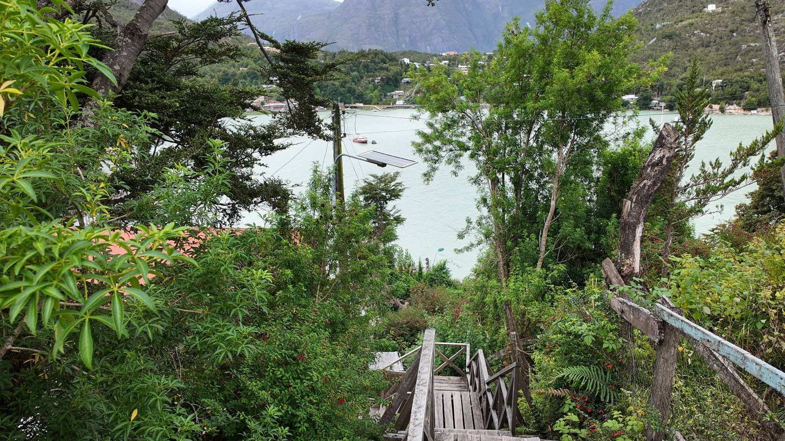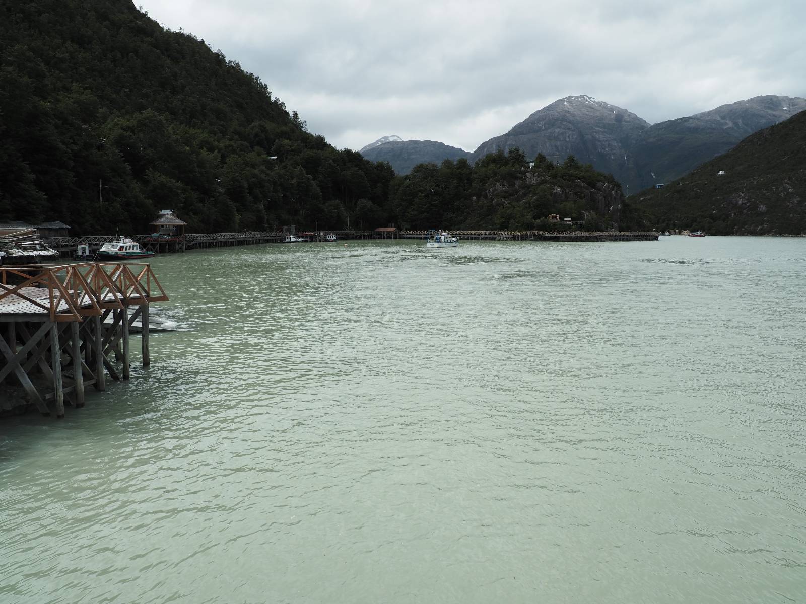 Matthias treffe ich am nächsten Tag an der Tankstelle. Wie wohl für alle ist das nächste Ziel Caleta Tortel. Ein kleines Dorf, was sich entlang der Bucht Tortel erstreckt, das aber bis auf den Parkplatz und ein paar Häuser, Hotels und Tankstelle oberhalb, nur durch Holztreppen und -stege erreichbar ist. Wer sein Hotel also einen Kilometer weiter weg hat, darf schön schleppen! Ich habe wie immer nichts vorgebucht und viel Auswahl scheint es auch nicht zu geben aber ich will das Risiko eingehen! Matthias habe ich recht fix eingeholt und irgendwann auf der Strecke treffe ich auch Wolfgang der ein Päuschen macht. Es geht kein Wind, so wie teilweise an den Tagen davor auch schon und so steht der Staub auf der Schotterpiste beharrlich, egal ob vom Vorrausfahrenden, was ich als schlimmer empfinde, als auch von den Entgegenkommern. Gut durch dessen Wolke ist man irgendwann auch mal durch aber machnchmal sieht man kaum 20m. Wenn das nicht wäre, könnte man fast richtig angenehm die Landschaft drum herum genießen! Ich fahre in Caleta Tortel ein und das Parkplatzrondel ganz vorne ist brechend voll. Ich halte erstmal an der Seite von der Touriinfo aber bzgl. Unterkünften kann er mir nicht sehr viel helfen. Ich soll doch gleich mal da vorne fragen. Ein kleines Restaurant mit angeschlossenem Hostal hat tatsächlich noch was frei, auch zu einem Preis mit dem ich leben kann. Uns was ein Zufall, im Restaurant sitzten „Pi“ und Rowan, die gerade Mittag machen. Glücklicherweise wird direkt davor ein Parkplatz frei, den ich mir gleich schnappe und mich so stelle, dass evtl. auch noch ein zweites Motorrad platz findet. Matthias läuft mir über den Weg, er hat ein Hotel oberhalb mit direktem Parkplatz gefunden. Mein Zimmer ist klein und naja, nicht das allerbeste, was ich bisher hatte, mit Gemeinschaftsbad. Wobei ich erstmal der Einzige zu sein scheine! Ich will für zwei Tage bleiben. Für den nächsten Tag ist ordentlich Regen angesagt, beste Vorraussetzungen für ein bisschen Arbeit am Rechner. Ich gehe hoch ins Restaurant und schwatze noch etwas mit Paolo und esse dann selber eine Kleinigkeit! Der Rest des Tages geht natürlich für einen Spaziergang über die diversen Treppen und Stege drauf. Tortel erstreckt sich schon ein paar weinge Kilometer und irgendwie ist es ganz nett! Ich finde sogar einen kleinen Platz mit einer Kaffee-Imbisbude und nutze die Gelegenheit…, Kaffee und Kuchen zu machen! Ich wundere mich was sie mit „Berlin“ meinen, das haben sie auch im Angebot! Als ich die kleinen Runden Gebäckbälle sehe weiß ich, dass sie Pfannkuchen/Kräppl meinen. Allerdings sind sie, zumindest vom Aussehen, nicht mit unseren vergleichbar! Ich schländere weiter bis fast ans Ende vom Ort und über eine kleine Brücke und Steg laufe ich zum hiesigen Strand. Es gibt da eine kleine Bude für ein paar Souvenirs und ein paar Getränken und mir wäre glatt nach einem Bier… Hat sie aber nicht! Dafür einen Plastebecher mit zwei Pfirsichen und sowas wie Graupen am Boden, das sie mir anbietet. Sie meint, das ist „sehr Chilenisch“! Farblich etwas abschreckend, lasse ich mich darauf ein! Hm, also es ist lecker! Sehr sogar! Es ist süß aber eben nicht zu sehr. Schön fruchtig und die Graupen, von denen ich den Namen schon wieder vergessen habe, runden das ganze ab. Sie machen das Ganze etwas knackiger! Ich steige wieder Treppen rauf, komme in die ein oder andere Sackgasse und sehe das Gerippe von einem neuen Haus! Eigentlich sind es nur Latten, die ein Gerüst bilden, auf die dann Spanplatten genagelt werden. Ob es noch eine Dämmung gibt kann ich nicht sagen aber das was ich so bisher erlebt habe und auch in dem Zimmer in dem ich gerade bin, da hört man alles! Jedes Wort, jede Bewegung und die Temperaturen schwanken zusammen mit den Temperaturen draußen! Vielleicht etwas abgeschwächter aber spürbar, mit nur geringer Verzögerung. Der angekündigte Regen am nächsten Tag kommt und ich bin froh nicht auf dem Bock zu sitzen. Ob er mir allerdings auch das Motorrad sauber wäscht…? Ich sitze oben im Restaurant mit Blick auf die Bucht und den Regen und schreibe. Der Regen plattert ordentlich und ich habe ganz und gar nicht das Gefühl irgendetwas zu verpassen! Zum Abend hin lässt der Regen nach und ich bewege mich vorsichtig die Holztreppen nach unten. Mir läuft Wolfgang über den Weg, wir suchen beide etwas zu essen und ein Bier. Er will die Woche halbwegs aussitzen und dann die Drei-Tages-Fähre nach Puerto Natales nehmen. Sie kostet so um die 300,- EUR aber dafür spart man sich auch eine Menge Fahrerei und die Unterkünfte und bekommt, was ich so gehört habe, wunderbare Blicke auf die Bergen in den Fjorden! Über seinen Status erfahre ich später, dass er nicht mitgekommen ist. Es ist nicht wie bei den anderen Fähren, wo das Motorrad zur Not dazwischen gepresst wird. Hier geht es durch die Dauer der Fahrt darum, dass jeder Mitreisende einen Sitzplatz bekommt. Sind die ausgebucht, kommt man nicht mehr mit.