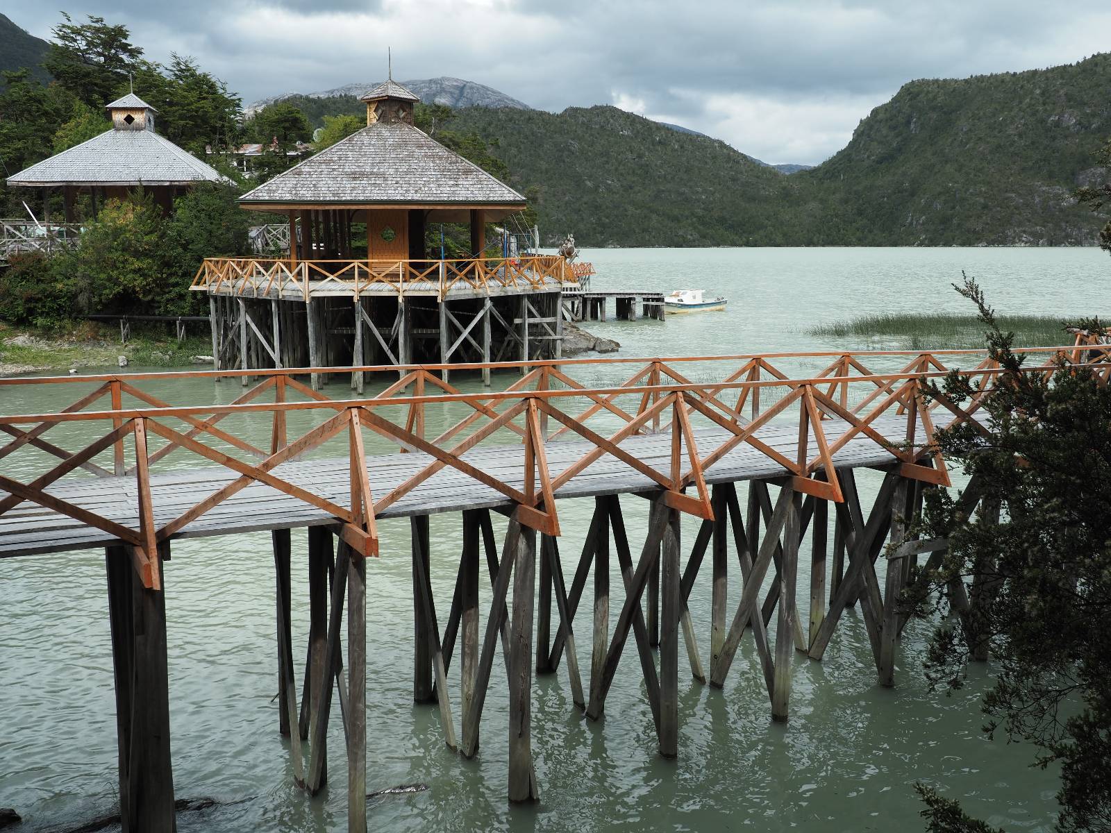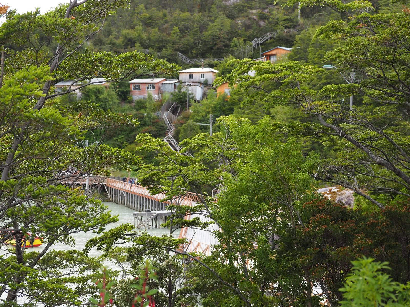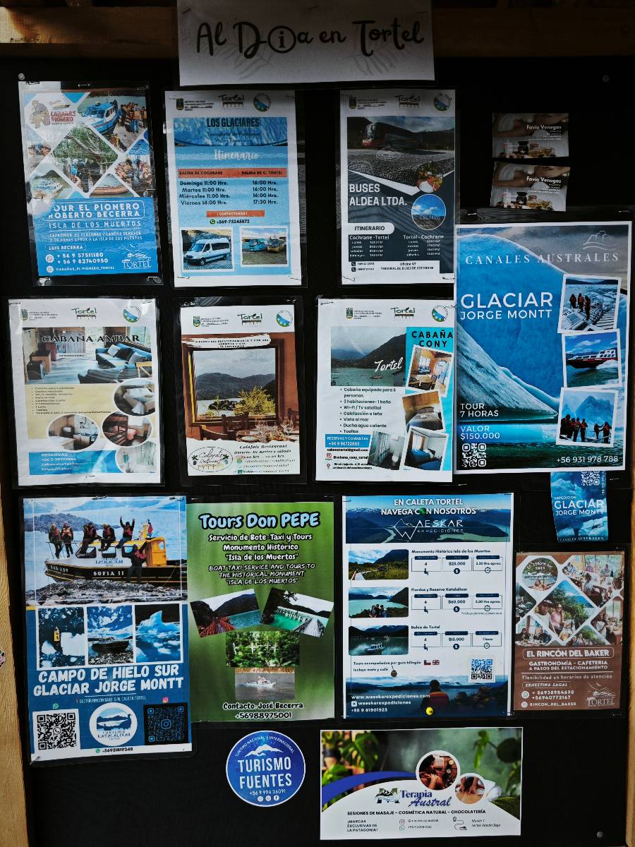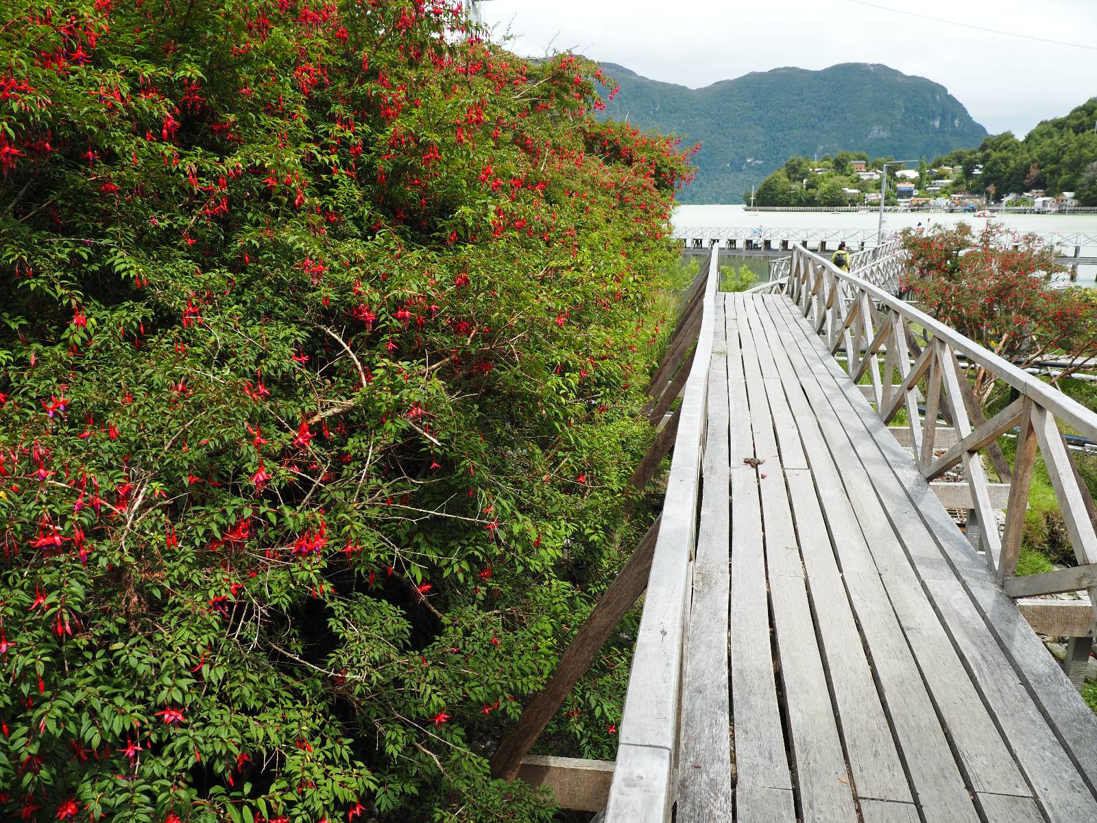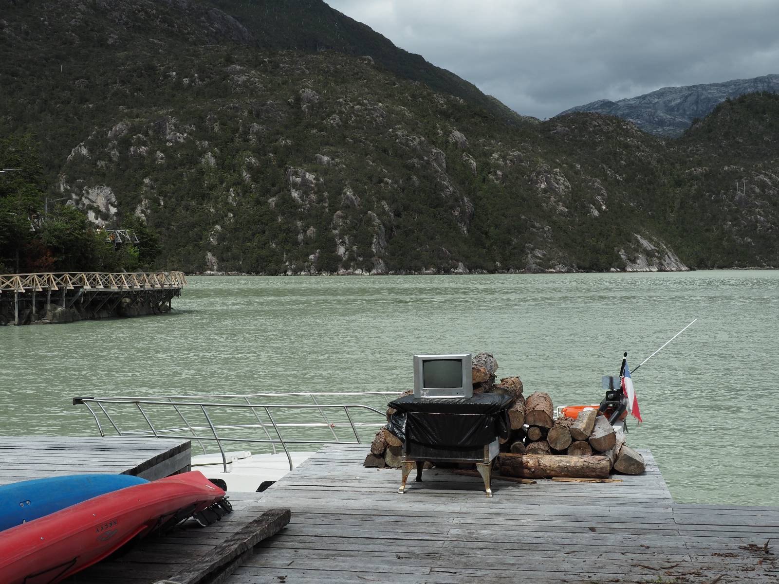 Matthias treffe ich am nächsten Tag an der Tankstelle. Wie wohl für alle ist das nächste Ziel Caleta Tortel. Ein kleines Dorf, was sich entlang der Bucht Tortel erstreckt, das aber bis auf den Parkplatz und ein paar Häuser, Hotels und Tankstelle oberhalb, nur durch Holztreppen und -stege erreichbar ist. Wer sein Hotel also einen Kilometer weiter weg hat, darf schön schleppen! Ich habe wie immer nichts vorgebucht und viel Auswahl scheint es auch nicht zu geben aber ich will das Risiko eingehen! Matthias habe ich recht fix eingeholt und irgendwann auf der Strecke treffe ich auch Wolfgang der ein Päuschen macht. Es geht kein Wind, so wie teilweise an den Tagen davor auch schon und so steht der Staub auf der Schotterpiste beharrlich, egal ob vom Vorrausfahrenden, was ich als schlimmer empfinde, als auch von den Entgegenkommern. Gut durch dessen Wolke ist man irgendwann auch mal durch aber machnchmal sieht man kaum 20m. Wenn das nicht wäre, könnte man fast richtig angenehm die Landschaft drum herum genießen! Ich fahre in Caleta Tortel ein und das Parkplatzrondel ganz vorne ist brechend voll. Ich halte erstmal an der Seite von der Touriinfo aber bzgl. Unterkünften kann er mir nicht sehr viel helfen. Ich soll doch gleich mal da vorne fragen. Ein kleines Restaurant mit angeschlossenem Hostal hat tatsächlich noch was frei, auch zu einem Preis mit dem ich leben kann. Uns was ein Zufall, im Restaurant sitzten „Pi“ und Rowan, die gerade Mittag machen. Glücklicherweise wird direkt davor ein Parkplatz frei, den ich mir gleich schnappe und mich so stelle, dass evtl. auch noch ein zweites Motorrad platz findet. Matthias läuft mir über den Weg, er hat ein Hotel oberhalb mit direktem Parkplatz gefunden. Mein Zimmer ist klein und naja, nicht das allerbeste, was ich bisher hatte, mit Gemeinschaftsbad. Wobei ich erstmal der Einzige zu sein scheine! Ich will für zwei Tage bleiben. Für den nächsten Tag ist ordentlich Regen angesagt, beste Vorraussetzungen für ein bisschen Arbeit am Rechner. Ich gehe hoch ins Restaurant und schwatze noch etwas mit Paolo und esse dann selber eine Kleinigkeit! Der Rest des Tages geht natürlich für einen Spaziergang über die diversen Treppen und Stege drauf. Tortel erstreckt sich schon ein paar weinge Kilometer und irgendwie ist es ganz nett! Ich finde sogar einen kleinen Platz mit einer Kaffee-Imbisbude und nutze die Gelegenheit…, Kaffee und Kuchen zu machen! Ich wundere mich was sie mit „Berlin“ meinen, das haben sie auch im Angebot! Als ich die kleinen Runden Gebäckbälle sehe weiß ich, dass sie Pfannkuchen/Kräppl meinen. Allerdings sind sie, zumindest vom Aussehen, nicht mit unseren vergleichbar! Ich schländere weiter bis fast ans Ende vom Ort und über eine kleine Brücke und Steg laufe ich zum hiesigen Strand. Es gibt da eine kleine Bude für ein paar Souvenirs und ein paar Getränken und mir wäre glatt nach einem Bier… Hat sie aber nicht! Dafür einen Plastebecher mit zwei Pfirsichen und sowas wie Graupen am Boden, das sie mir anbietet. Sie meint, das ist „sehr Chilenisch“! Farblich etwas abschreckend, lasse ich mich darauf ein! Hm, also es ist lecker! Sehr sogar! Es ist süß aber eben nicht zu sehr. Schön fruchtig und die Graupen, von denen ich den Namen schon wieder vergessen habe, runden das ganze ab. Sie machen das Ganze etwas knackiger! Ich steige wieder Treppen rauf, komme in die ein oder andere Sackgasse und sehe das Gerippe von einem neuen Haus! Eigentlich sind es nur Latten, die ein Gerüst bilden, auf die dann Spanplatten genagelt werden. Ob es noch eine Dämmung gibt kann ich nicht sagen aber das was ich so bisher erlebt habe und auch in dem Zimmer in dem ich gerade bin, da hört man alles! Jedes Wort, jede Bewegung und die Temperaturen schwanken zusammen mit den Temperaturen draußen! Vielleicht etwas abgeschwächter aber spürbar, mit nur geringer Verzögerung. Der angekündigte Regen am nächsten Tag kommt und ich bin froh nicht auf dem Bock zu sitzen. Ob er mir allerdings auch das Motorrad sauber wäscht…? Ich sitze oben im Restaurant mit Blick auf die Bucht und den Regen und schreibe. Der Regen plattert ordentlich und ich habe ganz und gar nicht das Gefühl irgendetwas zu verpassen! Zum Abend hin lässt der Regen nach und ich bewege mich vorsichtig die Holztreppen nach unten. Mir läuft Wolfgang über den Weg, wir suchen beide etwas zu essen und ein Bier. Er will die Woche halbwegs aussitzen und dann die Drei-Tages-Fähre nach Puerto Natales nehmen. Sie kostet so um die 300,- EUR aber dafür spart man sich auch eine Menge Fahrerei und die Unterkünfte und bekommt, was ich so gehört habe, wunderbare Blicke auf die Bergen in den Fjorden! Über seinen Status erfahre ich später, dass er nicht mitgekommen ist. Es ist nicht wie bei den anderen Fähren, wo das Motorrad zur Not dazwischen gepresst wird. Hier geht es durch die Dauer der Fahrt darum, dass jeder Mitreisende einen Sitzplatz bekommt. Sind die ausgebucht, kommt man nicht mehr mit.