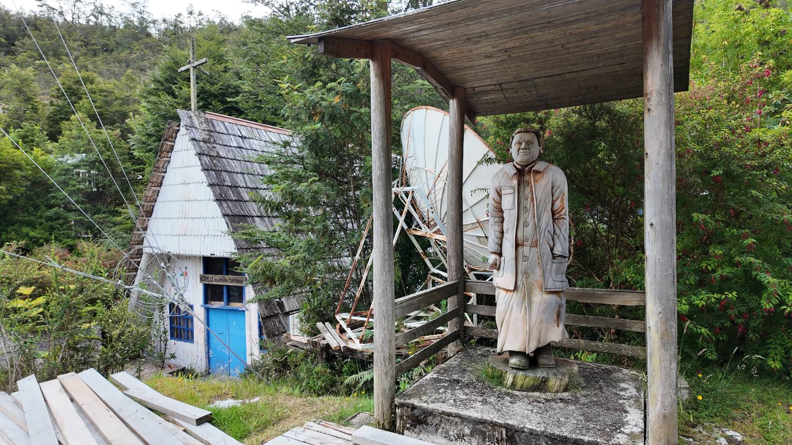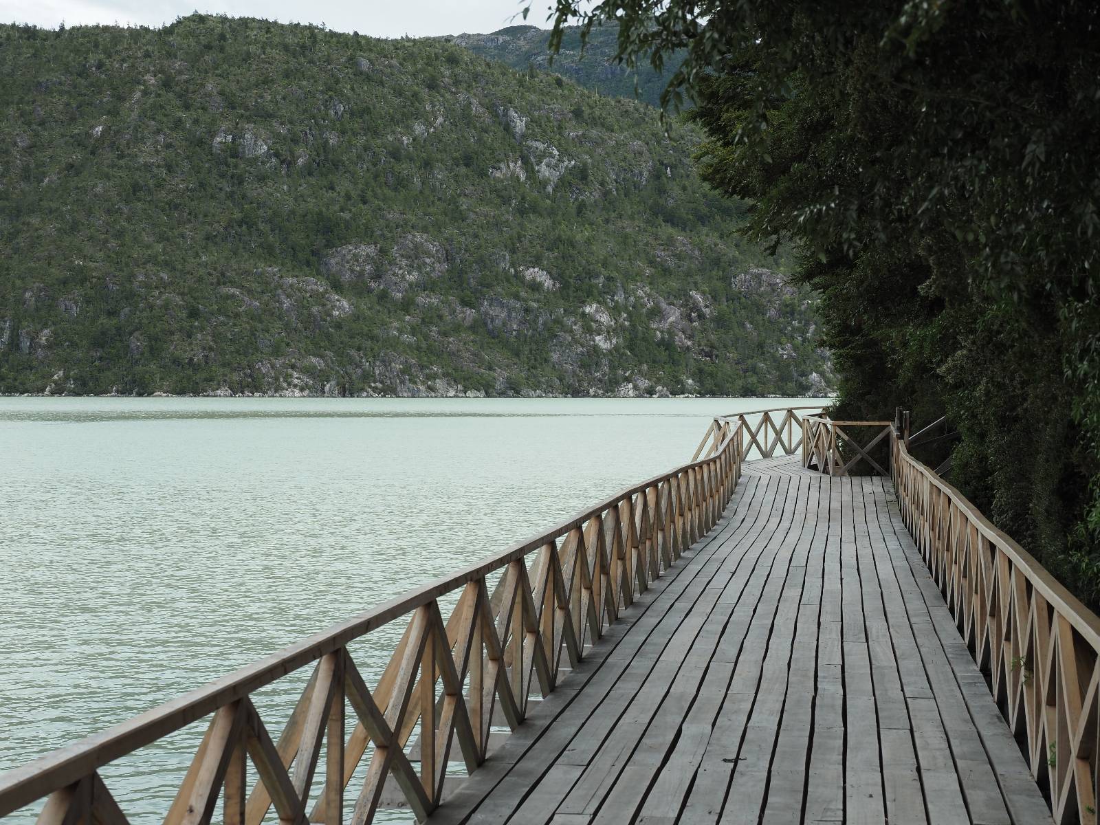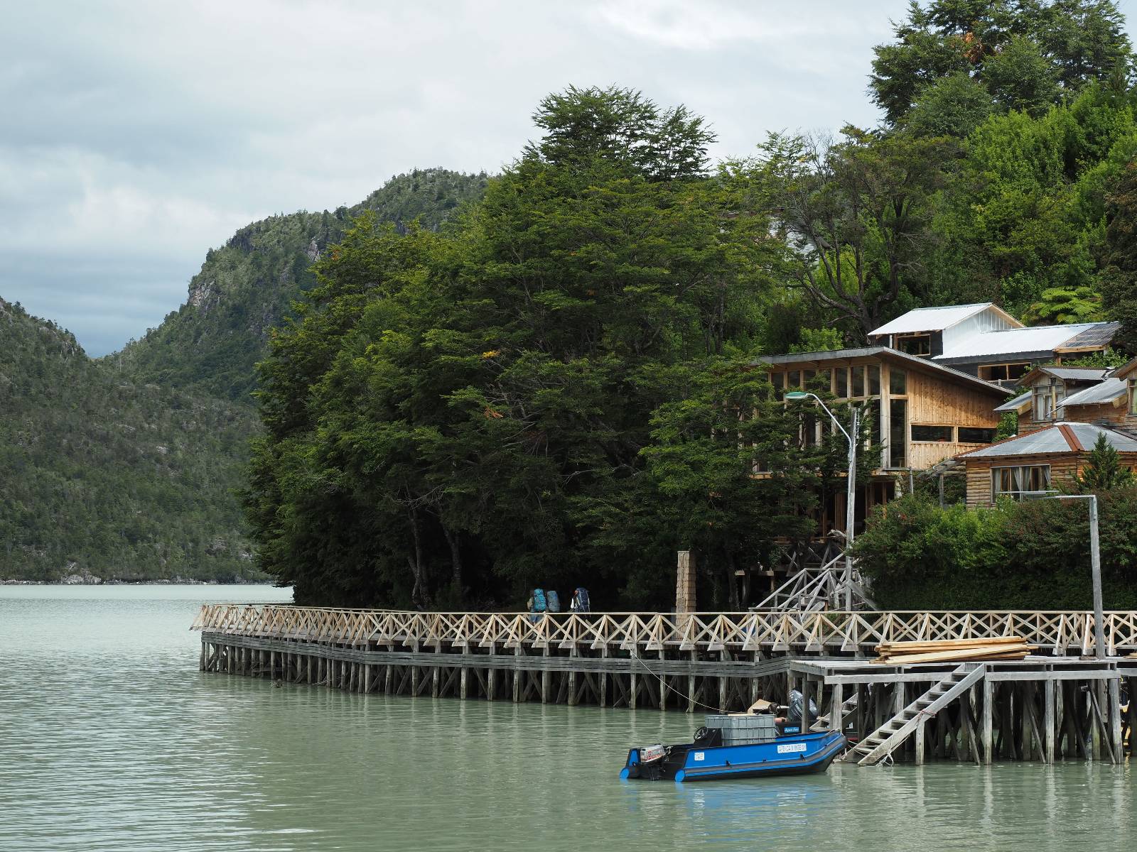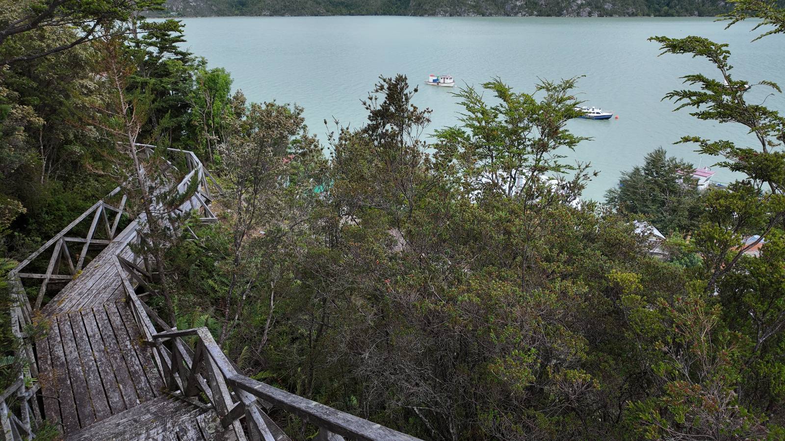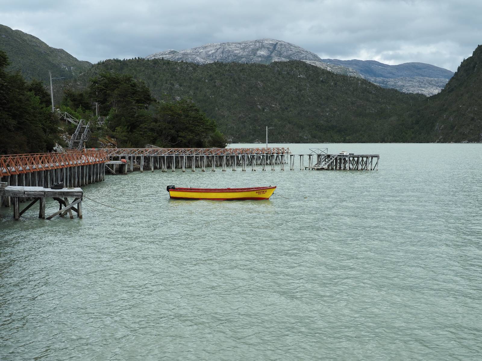 Matthias treffe ich am nächsten Tag an der Tankstelle. Wie wohl für alle ist das nächste Ziel Caleta Tortel. Ein kleines Dorf, was sich entlang der Bucht Tortel erstreckt, das aber bis auf den Parkplatz und ein paar Häuser, Hotels und Tankstelle oberhalb, nur durch Holztreppen und -stege erreichbar ist. Wer sein Hotel also einen Kilometer weiter weg hat, darf schön schleppen! Ich habe wie immer nichts vorgebucht und viel Auswahl scheint es auch nicht zu geben aber ich will das Risiko eingehen! Matthias habe ich recht fix eingeholt und irgendwann auf der Strecke treffe ich auch Wolfgang der ein Päuschen macht. Es geht kein Wind, so wie teilweise an den Tagen davor auch schon und so steht der Staub auf der Schotterpiste beharrlich, egal ob vom Vorrausfahrenden, was ich als schlimmer empfinde, als auch von den Entgegenkommern. Gut durch dessen Wolke ist man irgendwann auch mal durch aber machnchmal sieht man kaum 20m. Wenn das nicht wäre, könnte man fast richtig angenehm die Landschaft drum herum genießen! Ich fahre in Caleta Tortel ein und das Parkplatzrondel ganz vorne ist brechend voll. Ich halte erstmal an der Seite von der Touriinfo aber bzgl. Unterkünften kann er mir nicht sehr viel helfen. Ich soll doch gleich mal da vorne fragen. Ein kleines Restaurant mit angeschlossenem Hostal hat tatsächlich noch was frei, auch zu einem Preis mit dem ich leben kann. Uns was ein Zufall, im Restaurant sitzten „Pi“ und Rowan, die gerade Mittag machen. Glücklicherweise wird direkt davor ein Parkplatz frei, den ich mir gleich schnappe und mich so stelle, dass evtl. auch noch ein zweites Motorrad platz findet. Matthias läuft mir über den Weg, er hat ein Hotel oberhalb mit direktem Parkplatz gefunden. Mein Zimmer ist klein und naja, nicht das allerbeste, was ich bisher hatte, mit Gemeinschaftsbad. Wobei ich erstmal der Einzige zu sein scheine! Ich will für zwei Tage bleiben. Für den nächsten Tag ist ordentlich Regen angesagt, beste Vorraussetzungen für ein bisschen Arbeit am Rechner. Ich gehe hoch ins Restaurant und schwatze noch etwas mit Paolo und esse dann selber eine Kleinigkeit! Der Rest des Tages geht natürlich für einen Spaziergang über die diversen Treppen und Stege drauf. Tortel erstreckt sich schon ein paar weinge Kilometer und irgendwie ist es ganz nett! Ich finde sogar einen kleinen Platz mit einer Kaffee-Imbisbude und nutze die Gelegenheit…, Kaffee und Kuchen zu machen! Ich wundere mich was sie mit „Berlin“ meinen, das haben sie auch im Angebot! Als ich die kleinen Runden Gebäckbälle sehe weiß ich, dass sie Pfannkuchen/Kräppl meinen. Allerdings sind sie, zumindest vom Aussehen, nicht mit unseren vergleichbar! Ich schländere weiter bis fast ans Ende vom Ort und über eine kleine Brücke und Steg laufe ich zum hiesigen Strand. Es gibt da eine kleine Bude für ein paar Souvenirs und ein paar Getränken und mir wäre glatt nach einem Bier… Hat sie aber nicht! Dafür einen Plastebecher mit zwei Pfirsichen und sowas wie Graupen am Boden, das sie mir anbietet. Sie meint, das ist „sehr Chilenisch“! Farblich etwas abschreckend, lasse ich mich darauf ein! Hm, also es ist lecker! Sehr sogar! Es ist süß aber eben nicht zu sehr. Schön fruchtig und die Graupen, von denen ich den Namen schon wieder vergessen habe, runden das ganze ab. Sie machen das Ganze etwas knackiger! Ich steige wieder Treppen rauf, komme in die ein oder andere Sackgasse und sehe das Gerippe von einem neuen Haus! Eigentlich sind es nur Latten, die ein Gerüst bilden, auf die dann Spanplatten genagelt werden. Ob es noch eine Dämmung gibt kann ich nicht sagen aber das was ich so bisher erlebt habe und auch in dem Zimmer in dem ich gerade bin, da hört man alles! Jedes Wort, jede Bewegung und die Temperaturen schwanken zusammen mit den Temperaturen draußen! Vielleicht etwas abgeschwächter aber spürbar, mit nur geringer Verzögerung. Der angekündigte Regen am nächsten Tag kommt und ich bin froh nicht auf dem Bock zu sitzen. Ob er mir allerdings auch das Motorrad sauber wäscht…? Ich sitze oben im Restaurant mit Blick auf die Bucht und den Regen und schreibe. Der Regen plattert ordentlich und ich habe ganz und gar nicht das Gefühl irgendetwas zu verpassen! Zum Abend hin lässt der Regen nach und ich bewege mich vorsichtig die Holztreppen nach unten. Mir läuft Wolfgang über den Weg, wir suchen beide etwas zu essen und ein Bier. Er will die Woche halbwegs aussitzen und dann die Drei-Tages-Fähre nach Puerto Natales nehmen. Sie kostet so um die 300,- EUR aber dafür spart man sich auch eine Menge Fahrerei und die Unterkünfte und bekommt, was ich so gehört habe, wunderbare Blicke auf die Bergen in den Fjorden! Über seinen Status erfahre ich später, dass er nicht mitgekommen ist. Es ist nicht wie bei den anderen Fähren, wo das Motorrad zur Not dazwischen gepresst wird. Hier geht es durch die Dauer der Fahrt darum, dass jeder Mitreisende einen Sitzplatz bekommt. Sind die ausgebucht, kommt man nicht mehr mit.