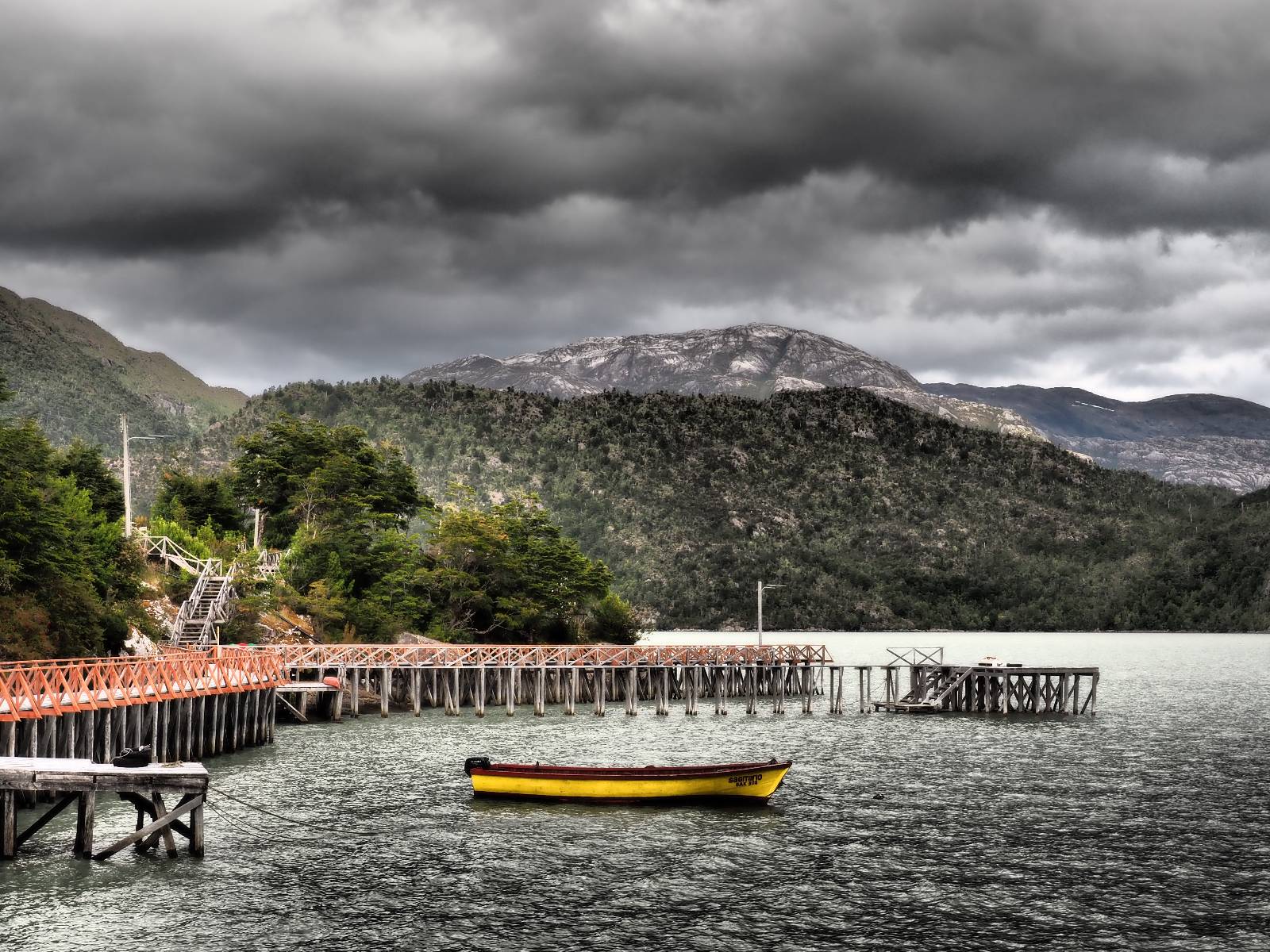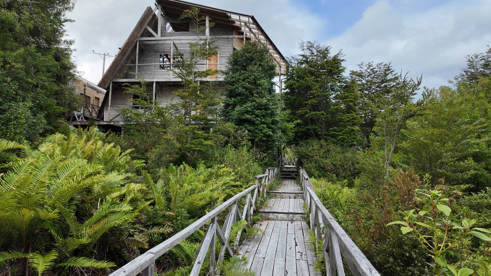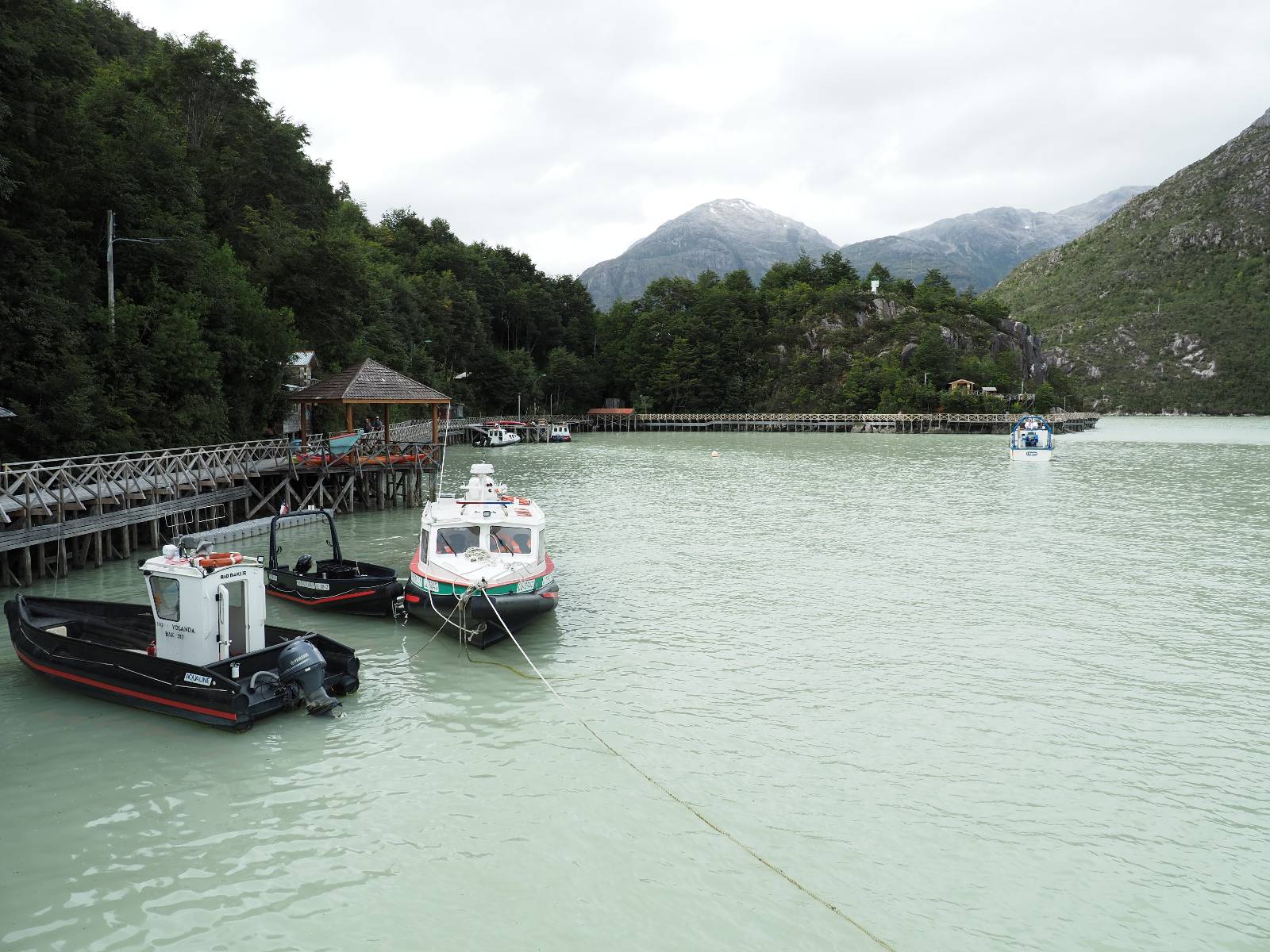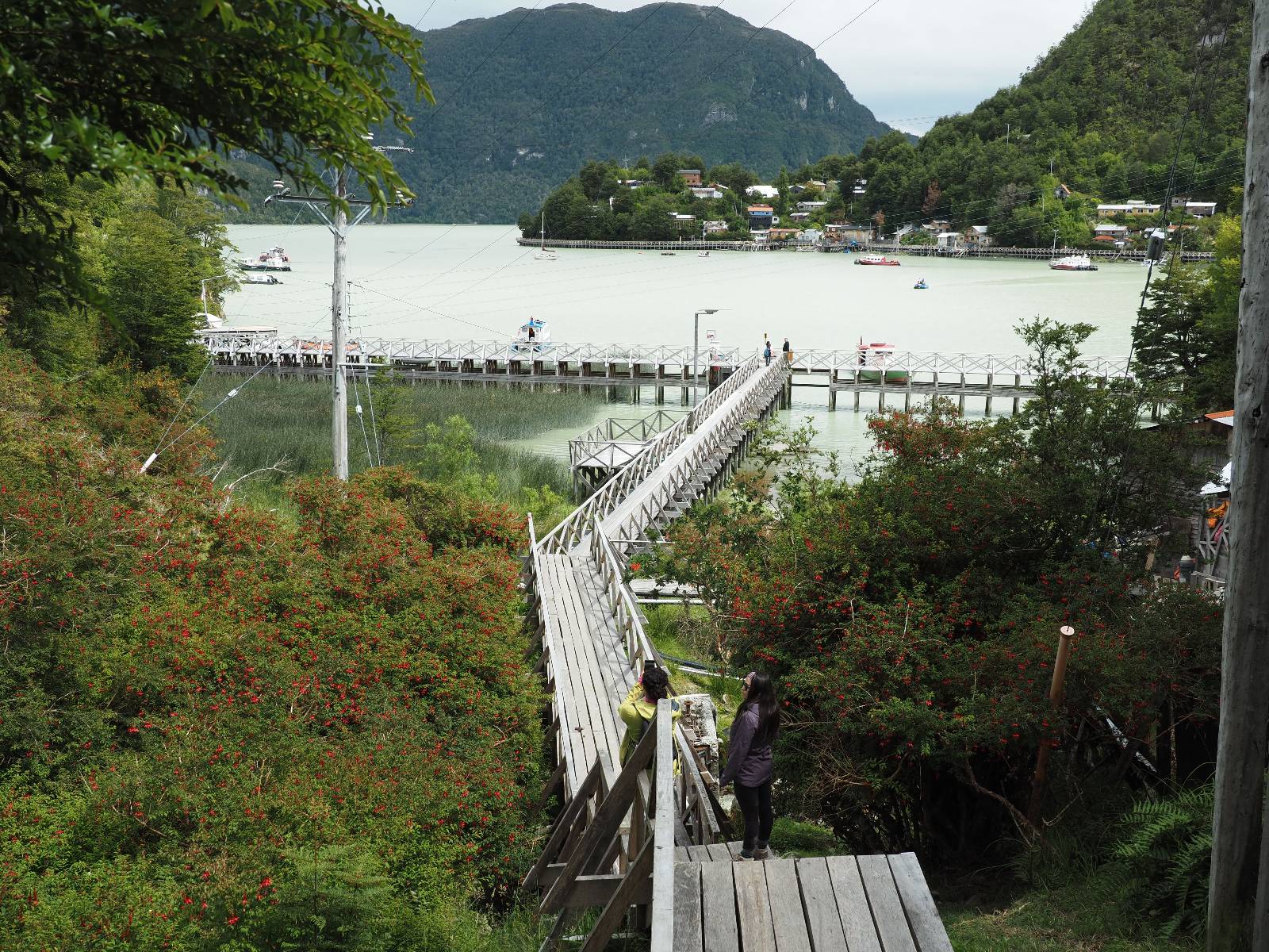 Matthias treffe ich am nächsten Tag an der Tankstelle. Wie wohl für alle ist das nächste Ziel Caleta Tortel. Ein kleines Dorf, was sich entlang der Bucht Tortel erstreckt, das aber bis auf den Parkplatz und ein paar Häuser, Hotels und Tankstelle oberhalb, nur durch Holztreppen und -stege erreichbar ist. Wer sein Hotel also einen Kilometer weiter weg hat, darf schön schleppen! Ich habe wie immer nichts vorgebucht und viel Auswahl scheint es auch nicht zu geben aber ich will das Risiko eingehen! Matthias habe ich recht fix eingeholt und irgendwann auf der Strecke treffe ich auch Wolfgang der ein Päuschen macht. Es geht kein Wind, so wie teilweise an den Tagen davor auch schon und so steht der Staub auf der Schotterpiste beharrlich, egal ob vom Vorrausfahrenden, was ich als schlimmer empfinde, als auch von den Entgegenkommern. Gut durch dessen Wolke ist man irgendwann auch mal durch aber machnchmal sieht man kaum 20m. Wenn das nicht wäre, könnte man fast richtig angenehm die Landschaft drum herum genießen! Ich fahre in Caleta Tortel ein und das Parkplatzrondel ganz vorne ist brechend voll. Ich halte erstmal an der Seite von der Touriinfo aber bzgl. Unterkünften kann er mir nicht sehr viel helfen. Ich soll doch gleich mal da vorne fragen. Ein kleines Restaurant mit angeschlossenem Hostal hat tatsächlich noch was frei, auch zu einem Preis mit dem ich leben kann. Uns was ein Zufall, im Restaurant sitzten „Pi“ und Rowan, die gerade Mittag machen. Glücklicherweise wird direkt davor ein Parkplatz frei, den ich mir gleich schnappe und mich so stelle, dass evtl. auch noch ein zweites Motorrad platz findet. Matthias läuft mir über den Weg, er hat ein Hotel oberhalb mit direktem Parkplatz gefunden. Mein Zimmer ist klein und naja, nicht das allerbeste, was ich bisher hatte, mit Gemeinschaftsbad. Wobei ich erstmal der Einzige zu sein scheine! Ich will für zwei Tage bleiben. Für den nächsten Tag ist ordentlich Regen angesagt, beste Vorraussetzungen für ein bisschen Arbeit am Rechner. Ich gehe hoch ins Restaurant und schwatze noch etwas mit Paolo und esse dann selber eine Kleinigkeit! Der Rest des Tages geht natürlich für einen Spaziergang über die diversen Treppen und Stege drauf. Tortel erstreckt sich schon ein paar weinge Kilometer und irgendwie ist es ganz nett! Ich finde sogar einen kleinen Platz mit einer Kaffee-Imbisbude und nutze die Gelegenheit…, Kaffee und Kuchen zu machen! Ich wundere mich was sie mit „Berlin“ meinen, das haben sie auch im Angebot! Als ich die kleinen Runden Gebäckbälle sehe weiß ich, dass sie Pfannkuchen/Kräppl meinen. Allerdings sind sie, zumindest vom Aussehen, nicht mit unseren vergleichbar! Ich schländere weiter bis fast ans Ende vom Ort und über eine kleine Brücke und Steg laufe ich zum hiesigen Strand. Es gibt da eine kleine Bude für ein paar Souvenirs und ein paar Getränken und mir wäre glatt nach einem Bier… Hat sie aber nicht! Dafür einen Plastebecher mit zwei Pfirsichen und sowas wie Graupen am Boden, das sie mir anbietet. Sie meint, das ist „sehr Chilenisch“! Farblich etwas abschreckend, lasse ich mich darauf ein! Hm, also es ist lecker! Sehr sogar! Es ist süß aber eben nicht zu sehr. Schön fruchtig und die Graupen, von denen ich den Namen schon wieder vergessen habe, runden das ganze ab. Sie machen das Ganze etwas knackiger! Ich steige wieder Treppen rauf, komme in die ein oder andere Sackgasse und sehe das Gerippe von einem neuen Haus! Eigentlich sind es nur Latten, die ein Gerüst bilden, auf die dann Spanplatten genagelt werden. Ob es noch eine Dämmung gibt kann ich nicht sagen aber das was ich so bisher erlebt habe und auch in dem Zimmer in dem ich gerade bin, da hört man alles! Jedes Wort, jede Bewegung und die Temperaturen schwanken zusammen mit den Temperaturen draußen! Vielleicht etwas abgeschwächter aber spürbar, mit nur geringer Verzögerung. Der angekündigte Regen am nächsten Tag kommt und ich bin froh nicht auf dem Bock zu sitzen. Ob er mir allerdings auch das Motorrad sauber wäscht…? Ich sitze oben im Restaurant mit Blick auf die Bucht und den Regen und schreibe. Der Regen plattert ordentlich und ich habe ganz und gar nicht das Gefühl irgendetwas zu verpassen! Zum Abend hin lässt der Regen nach und ich bewege mich vorsichtig die Holztreppen nach unten. Mir läuft Wolfgang über den Weg, wir suchen beide etwas zu essen und ein Bier. Er will die Woche halbwegs aussitzen und dann die Drei-Tages-Fähre nach Puerto Natales nehmen. Sie kostet so um die 300,- EUR aber dafür spart man sich auch eine Menge Fahrerei und die Unterkünfte und bekommt, was ich so gehört habe, wunderbare Blicke auf die Bergen in den Fjorden! Über seinen Status erfahre ich später, dass er nicht mitgekommen ist. Es ist nicht wie bei den anderen Fähren, wo das Motorrad zur Not dazwischen gepresst wird. Hier geht es durch die Dauer der Fahrt darum, dass jeder Mitreisende einen Sitzplatz bekommt. Sind die ausgebucht, kommt man nicht mehr mit.