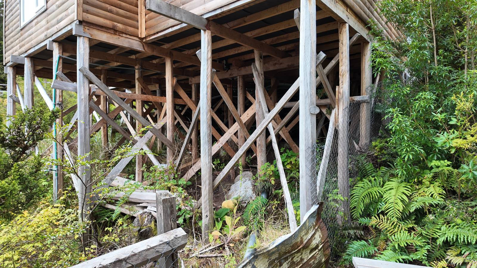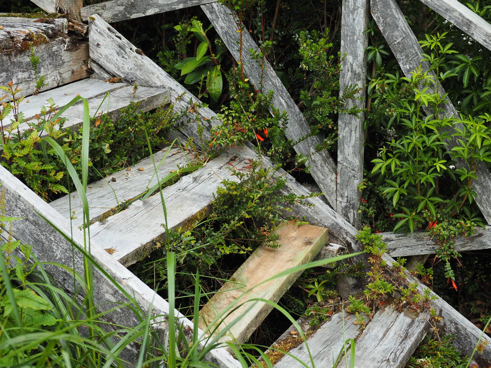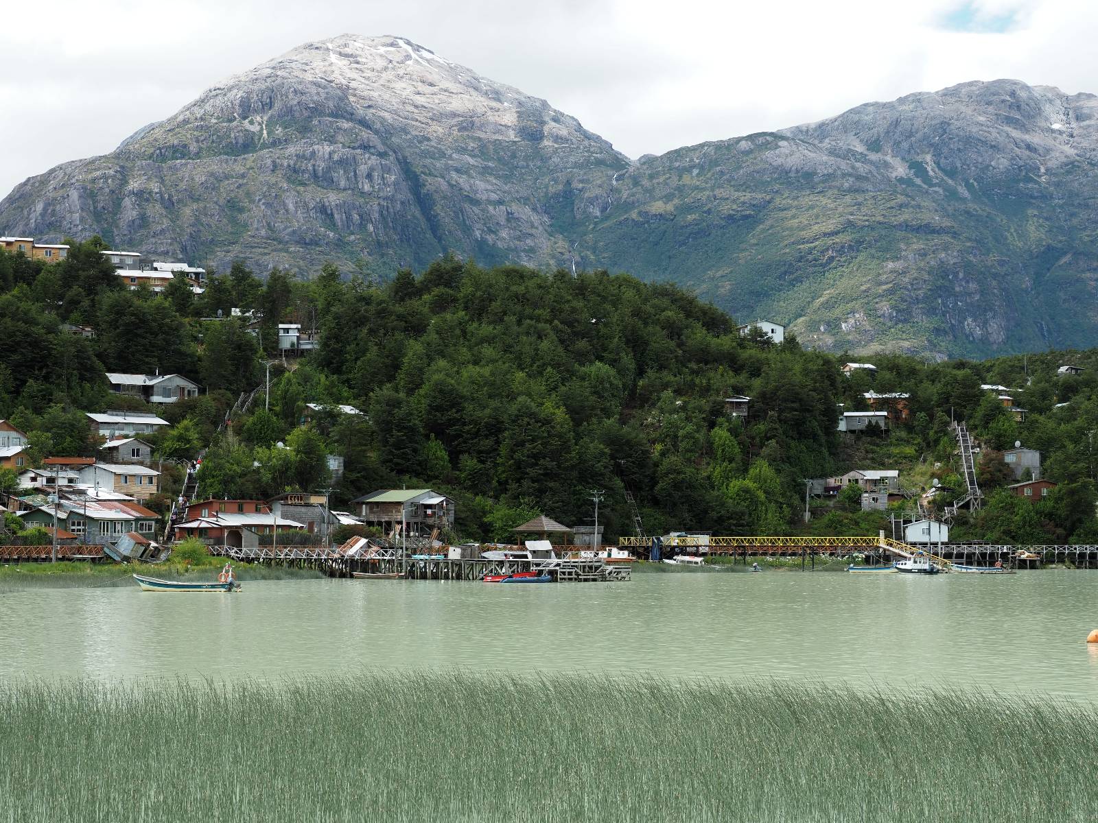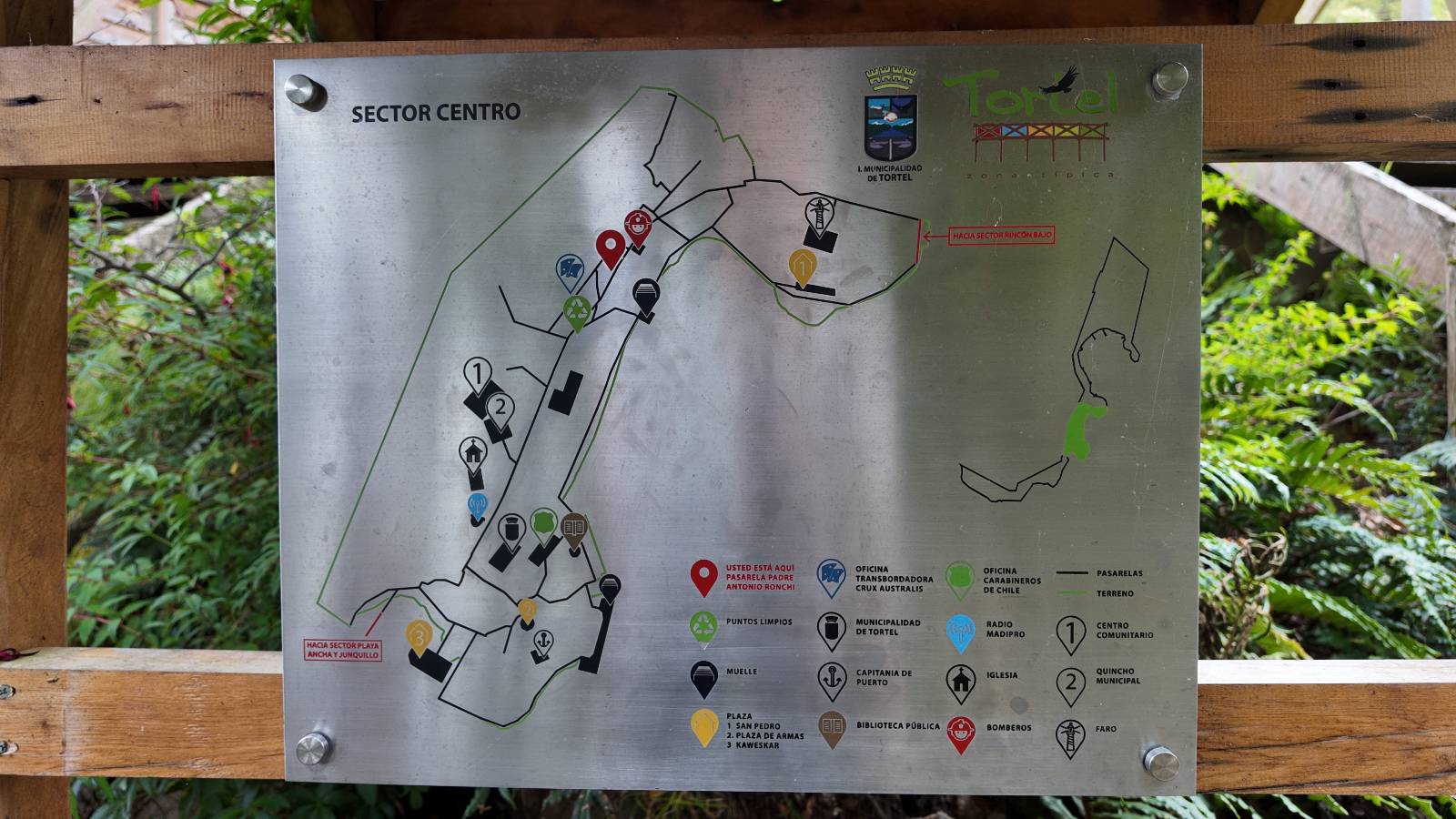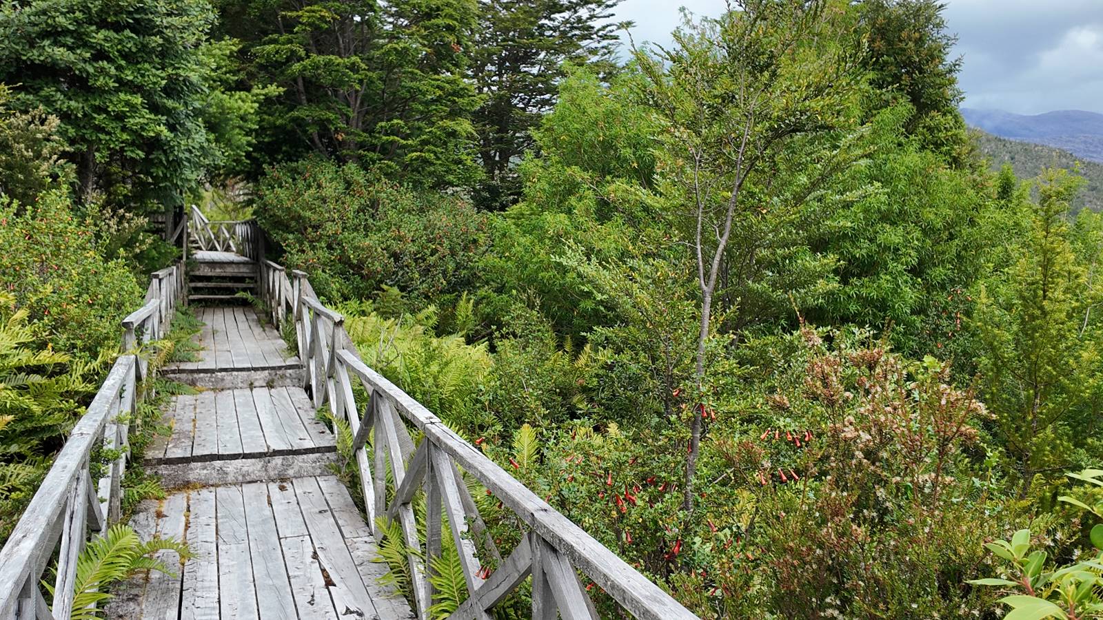 Matthias treffe ich am nächsten Tag an der Tankstelle. Wie wohl für alle ist das nächste Ziel Caleta Tortel. Ein kleines Dorf, was sich entlang der Bucht Tortel erstreckt, das aber bis auf den Parkplatz und ein paar Häuser, Hotels und Tankstelle oberhalb, nur durch Holztreppen und -stege erreichbar ist. Wer sein Hotel also einen Kilometer weiter weg hat, darf schön schleppen! Ich habe wie immer nichts vorgebucht und viel Auswahl scheint es auch nicht zu geben aber ich will das Risiko eingehen! Matthias habe ich recht fix eingeholt und irgendwann auf der Strecke treffe ich auch Wolfgang der ein Päuschen macht. Es geht kein Wind, so wie teilweise an den Tagen davor auch schon und so steht der Staub auf der Schotterpiste beharrlich, egal ob vom Vorrausfahrenden, was ich als schlimmer empfinde, als auch von den Entgegenkommern. Gut durch dessen Wolke ist man irgendwann auch mal durch aber machnchmal sieht man kaum 20m. Wenn das nicht wäre, könnte man fast richtig angenehm die Landschaft drum herum genießen! Ich fahre in Caleta Tortel ein und das Parkplatzrondel ganz vorne ist brechend voll. Ich halte erstmal an der Seite von der Touriinfo aber bzgl. Unterkünften kann er mir nicht sehr viel helfen. Ich soll doch gleich mal da vorne fragen. Ein kleines Restaurant mit angeschlossenem Hostal hat tatsächlich noch was frei, auch zu einem Preis mit dem ich leben kann. Uns was ein Zufall, im Restaurant sitzten „Pi“ und Rowan, die gerade Mittag machen. Glücklicherweise wird direkt davor ein Parkplatz frei, den ich mir gleich schnappe und mich so stelle, dass evtl. auch noch ein zweites Motorrad platz findet. Matthias läuft mir über den Weg, er hat ein Hotel oberhalb mit direktem Parkplatz gefunden. Mein Zimmer ist klein und naja, nicht das allerbeste, was ich bisher hatte, mit Gemeinschaftsbad. Wobei ich erstmal der Einzige zu sein scheine! Ich will für zwei Tage bleiben. Für den nächsten Tag ist ordentlich Regen angesagt, beste Vorraussetzungen für ein bisschen Arbeit am Rechner. Ich gehe hoch ins Restaurant und schwatze noch etwas mit Paolo und esse dann selber eine Kleinigkeit! Der Rest des Tages geht natürlich für einen Spaziergang über die diversen Treppen und Stege drauf. Tortel erstreckt sich schon ein paar weinge Kilometer und irgendwie ist es ganz nett! Ich finde sogar einen kleinen Platz mit einer Kaffee-Imbisbude und nutze die Gelegenheit…, Kaffee und Kuchen zu machen! Ich wundere mich was sie mit „Berlin“ meinen, das haben sie auch im Angebot! Als ich die kleinen Runden Gebäckbälle sehe weiß ich, dass sie Pfannkuchen/Kräppl meinen. Allerdings sind sie, zumindest vom Aussehen, nicht mit unseren vergleichbar! Ich schländere weiter bis fast ans Ende vom Ort und über eine kleine Brücke und Steg laufe ich zum hiesigen Strand. Es gibt da eine kleine Bude für ein paar Souvenirs und ein paar Getränken und mir wäre glatt nach einem Bier… Hat sie aber nicht! Dafür einen Plastebecher mit zwei Pfirsichen und sowas wie Graupen am Boden, das sie mir anbietet. Sie meint, das ist „sehr Chilenisch“! Farblich etwas abschreckend, lasse ich mich darauf ein! Hm, also es ist lecker! Sehr sogar! Es ist süß aber eben nicht zu sehr. Schön fruchtig und die Graupen, von denen ich den Namen schon wieder vergessen habe, runden das ganze ab. Sie machen das Ganze etwas knackiger! Ich steige wieder Treppen rauf, komme in die ein oder andere Sackgasse und sehe das Gerippe von einem neuen Haus! Eigentlich sind es nur Latten, die ein Gerüst bilden, auf die dann Spanplatten genagelt werden. Ob es noch eine Dämmung gibt kann ich nicht sagen aber das was ich so bisher erlebt habe und auch in dem Zimmer in dem ich gerade bin, da hört man alles! Jedes Wort, jede Bewegung und die Temperaturen schwanken zusammen mit den Temperaturen draußen! Vielleicht etwas abgeschwächter aber spürbar, mit nur geringer Verzögerung. Der angekündigte Regen am nächsten Tag kommt und ich bin froh nicht auf dem Bock zu sitzen. Ob er mir allerdings auch das Motorrad sauber wäscht…? Ich sitze oben im Restaurant mit Blick auf die Bucht und den Regen und schreibe. Der Regen plattert ordentlich und ich habe ganz und gar nicht das Gefühl irgendetwas zu verpassen! Zum Abend hin lässt der Regen nach und ich bewege mich vorsichtig die Holztreppen nach unten. Mir läuft Wolfgang über den Weg, wir suchen beide etwas zu essen und ein Bier. Er will die Woche halbwegs aussitzen und dann die Drei-Tages-Fähre nach Puerto Natales nehmen. Sie kostet so um die 300,- EUR aber dafür spart man sich auch eine Menge Fahrerei und die Unterkünfte und bekommt, was ich so gehört habe, wunderbare Blicke auf die Bergen in den Fjorden! Über seinen Status erfahre ich später, dass er nicht mitgekommen ist. Es ist nicht wie bei den anderen Fähren, wo das Motorrad zur Not dazwischen gepresst wird. Hier geht es durch die Dauer der Fahrt darum, dass jeder Mitreisende einen Sitzplatz bekommt. Sind die ausgebucht, kommt man nicht mehr mit.