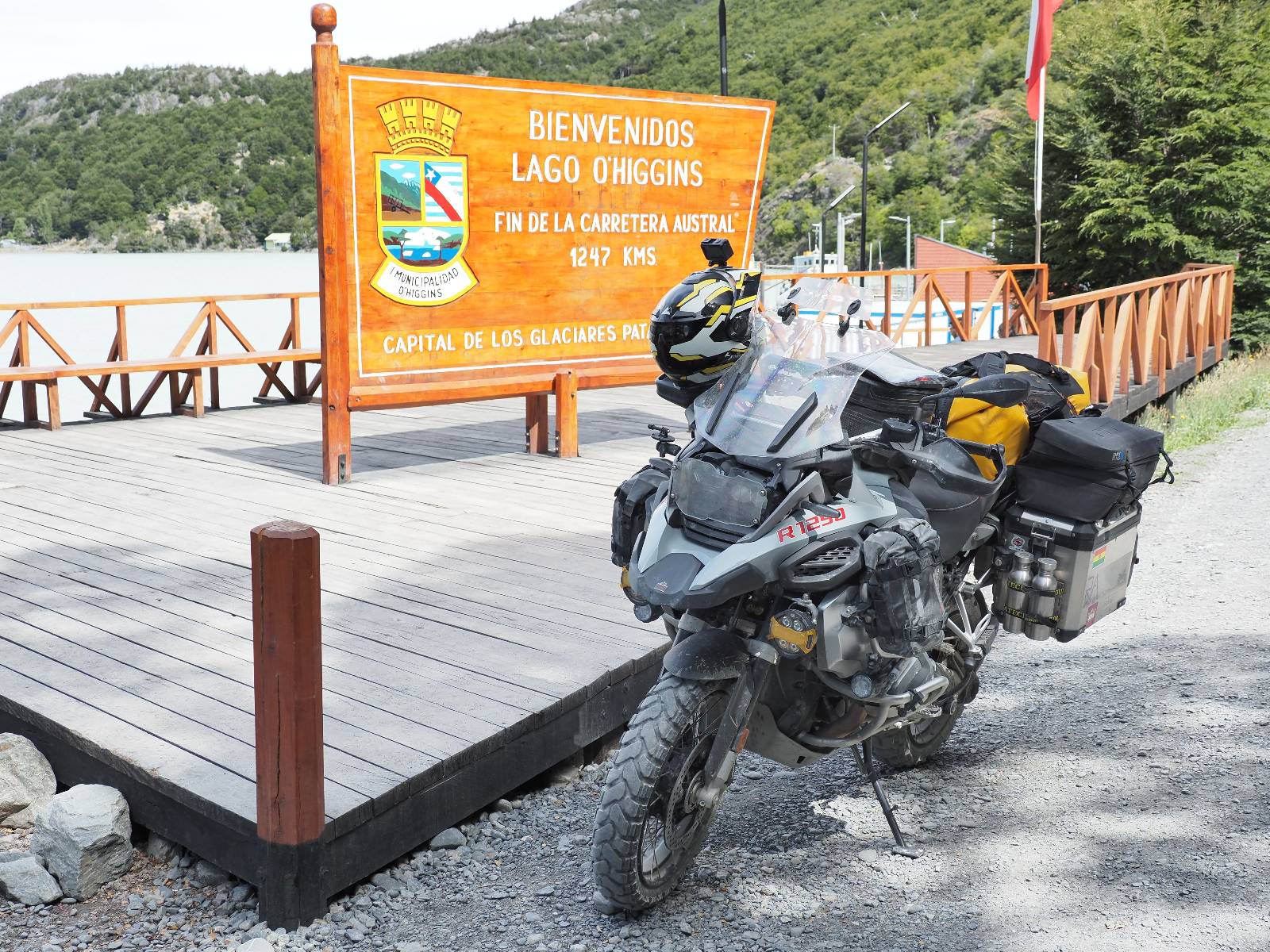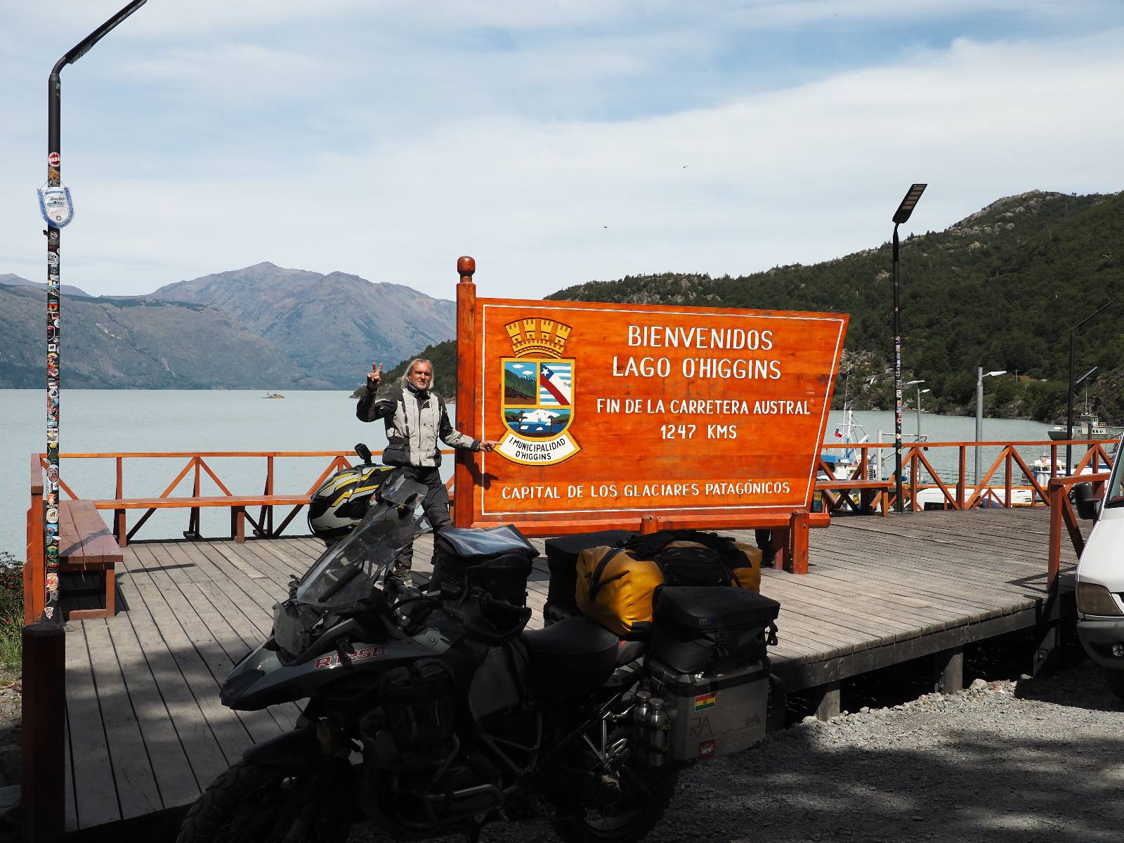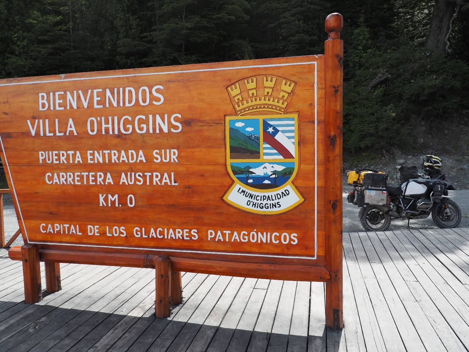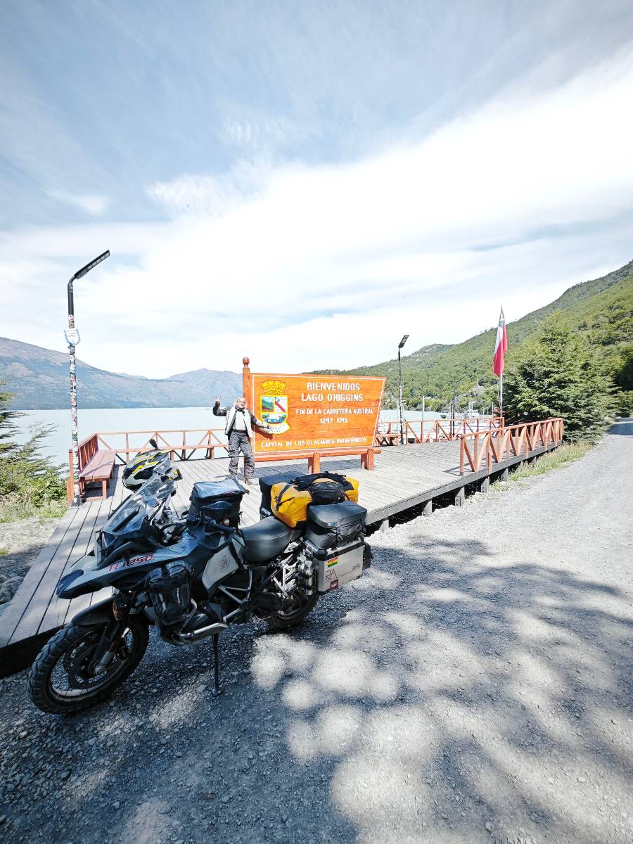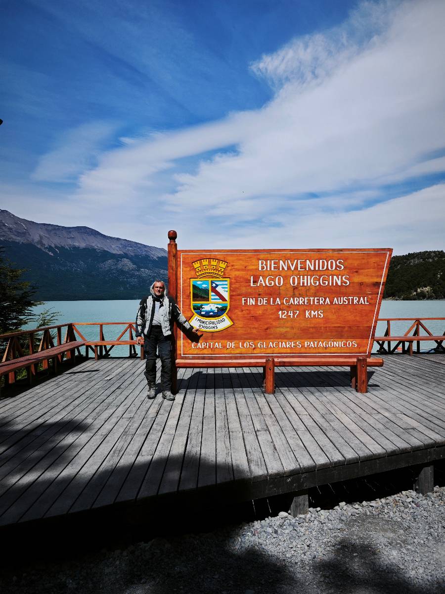 So wirklich sauber ist das Motorrad nicht geworden. Es bräuchte ein bisschen Shampoo und wirkliche Zuwendung aber Schätzelein murrt nicht und wir machen uns auf zum Endspurrt ans Ende der Carretera Austral nach Villa O’higgins. Aber unweit von Caleta Tortel ist Caleta Yungai von wo die letzte Fähre geht, um den letzten Abschnitt zu meistern. Ich lerne Carlos und Jose kennen, beide auf einer 1300er BMW unterwegs, die die Carretera Austral gerade mal so abgespult haben. Coole Jungs! Diese Fähre ist mal Kostenlos und wie üblich geht auf der anderen Seite das Rennen um den ersten Platz los. Ich gehe davon aus, dass die beiden gewonnen haben. Gerade hier erinnert mich die Landschaft mal wieder total an Schweden. Ein weites Tal mit Fluß, Gestrüpp und Fjell liegt vor mir. Eigentlich fehlen nur die Rentiere. Schon bald reite ich in Villa O’Higgins ein und natürlich gibts die Obligatorischen Ortseingangsfotos! Aber das eigentliche Ziel liegt ein paar Kilometer weiter hinten am großen Schild, wo auch hier ALLE hin müssen, ans Ende der Carretera Austral! Da ich ganz gut in meiner Zeit liege, laufe ich etwas durch den kleinen Ort und mache natürlich Kaffee und Kuchen, dabei wird mir stolz ein Brocken Gletschereis presentiert! Ja, dass muss ich mir auch noch anschauen, einen Gletscher! Aber hier gibt es genug und spätestens den Perito Moreno werde ich ganz sicher besuchen. In dem kleinen Restaurant erfahre ich, was man hier noch alles für Wanderungen machen kann und so mache ich mich auf eine kleine Tour. Weiter als zu einer kleinen Hängebrücke gehe ich aber nicht, denn es ist nun doch schon später und bisschen was essen möchte ich dann doch noch. Ich werde von einem Maler, der mit seiner Staffelei am Fluß stand mitgenommen und somit schaffe ich es wieder ins selbe Restaurant, bevor es schließt!