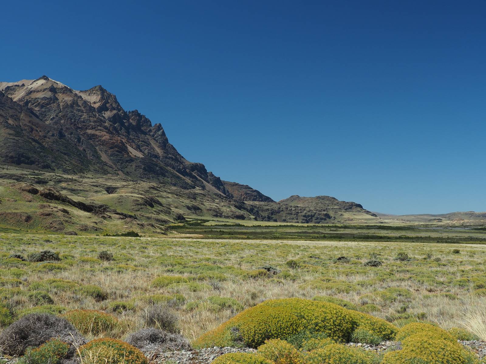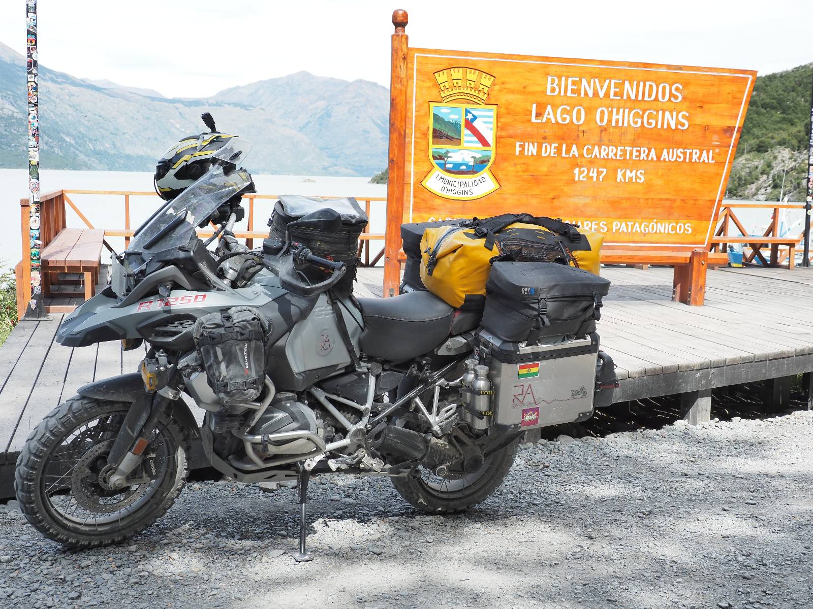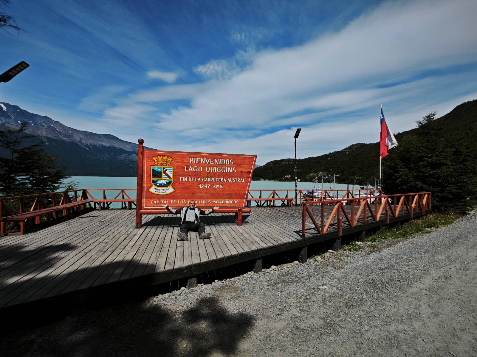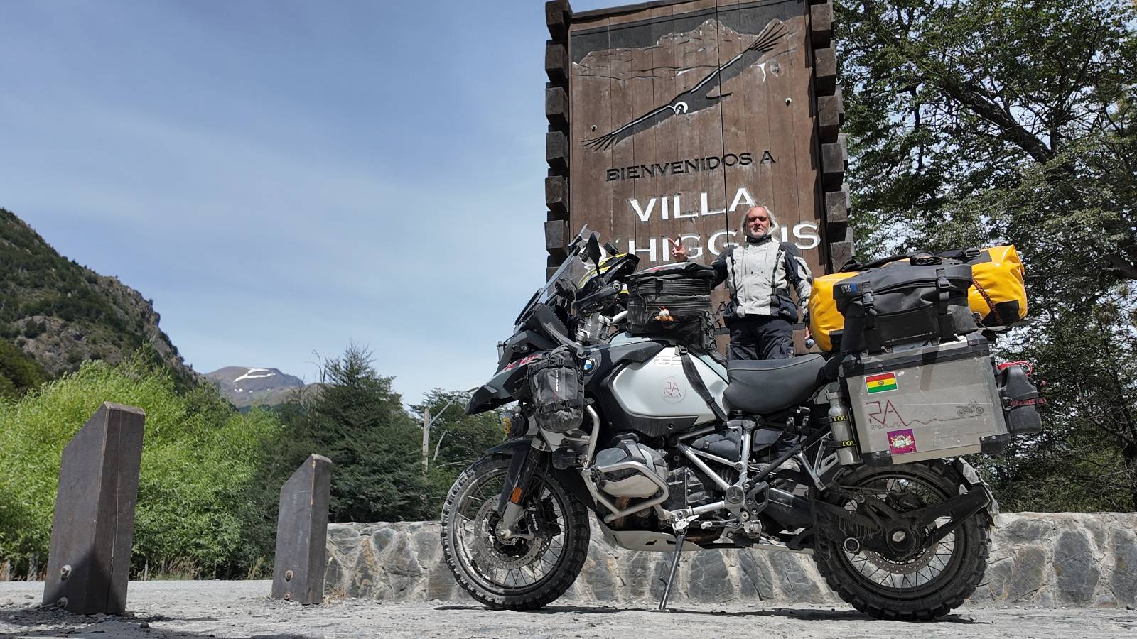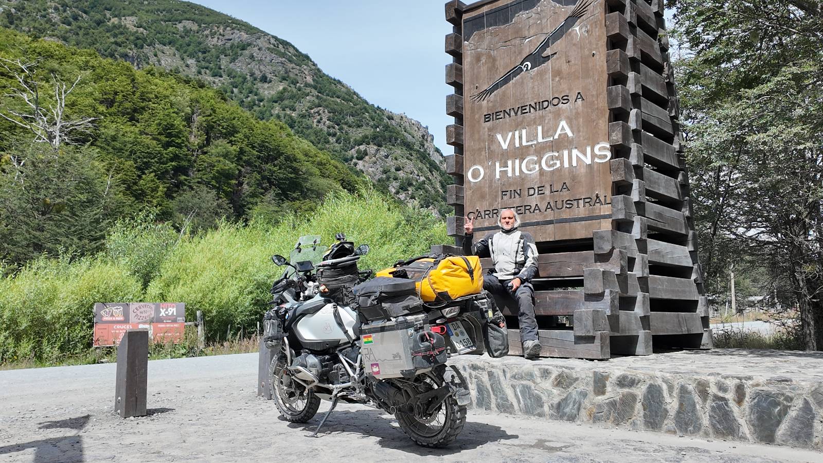 So wirklich sauber ist das Motorrad nicht geworden. Es bräuchte ein bisschen Shampoo und wirkliche Zuwendung aber Schätzelein murrt nicht und wir machen uns auf zum Endspurrt ans Ende der Carretera Austral nach Villa O’higgins. Aber unweit von Caleta Tortel ist Caleta Yungai von wo die letzte Fähre geht, um den letzten Abschnitt zu meistern. Ich lerne Carlos und Jose kennen, beide auf einer 1300er BMW unterwegs, die die Carretera Austral gerade mal so abgespult haben. Coole Jungs! Diese Fähre ist mal Kostenlos und wie üblich geht auf der anderen Seite das Rennen um den ersten Platz los. Ich gehe davon aus, dass die beiden gewonnen haben. Gerade hier erinnert mich die Landschaft mal wieder total an Schweden. Ein weites Tal mit Fluß, Gestrüpp und Fjell liegt vor mir. Eigentlich fehlen nur die Rentiere. Schon bald reite ich in Villa O’Higgins ein und natürlich gibts die Obligatorischen Ortseingangsfotos! Aber das eigentliche Ziel liegt ein paar Kilometer weiter hinten am großen Schild, wo auch hier ALLE hin müssen, ans Ende der Carretera Austral! Da ich ganz gut in meiner Zeit liege, laufe ich etwas durch den kleinen Ort und mache natürlich Kaffee und Kuchen, dabei wird mir stolz ein Brocken Gletschereis presentiert! Ja, dass muss ich mir auch noch anschauen, einen Gletscher! Aber hier gibt es genug und spätestens den Perito Moreno werde ich ganz sicher besuchen. In dem kleinen Restaurant erfahre ich, was man hier noch alles für Wanderungen machen kann und so mache ich mich auf eine kleine Tour. Weiter als zu einer kleinen Hängebrücke gehe ich aber nicht, denn es ist nun doch schon später und bisschen was essen möchte ich dann doch noch. Ich werde von einem Maler, der mit seiner Staffelei am Fluß stand mitgenommen und somit schaffe ich es wieder ins selbe Restaurant, bevor es schließt!