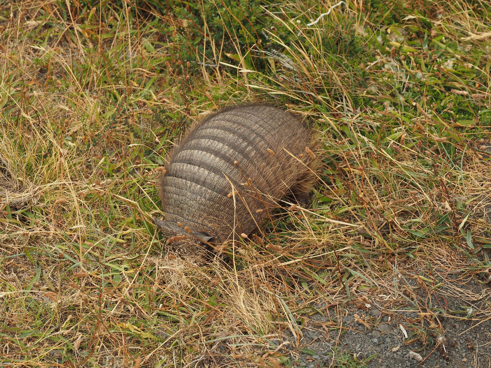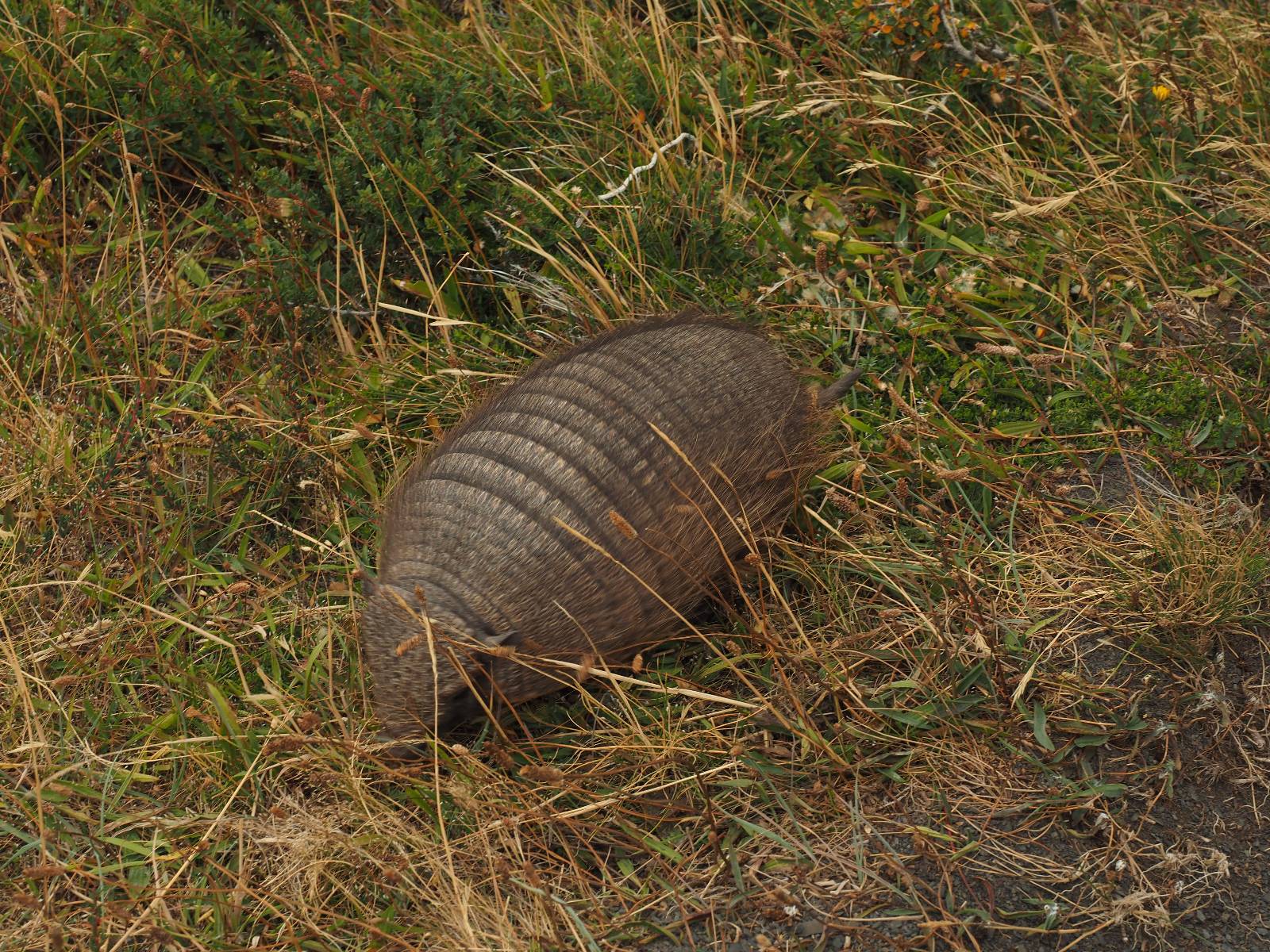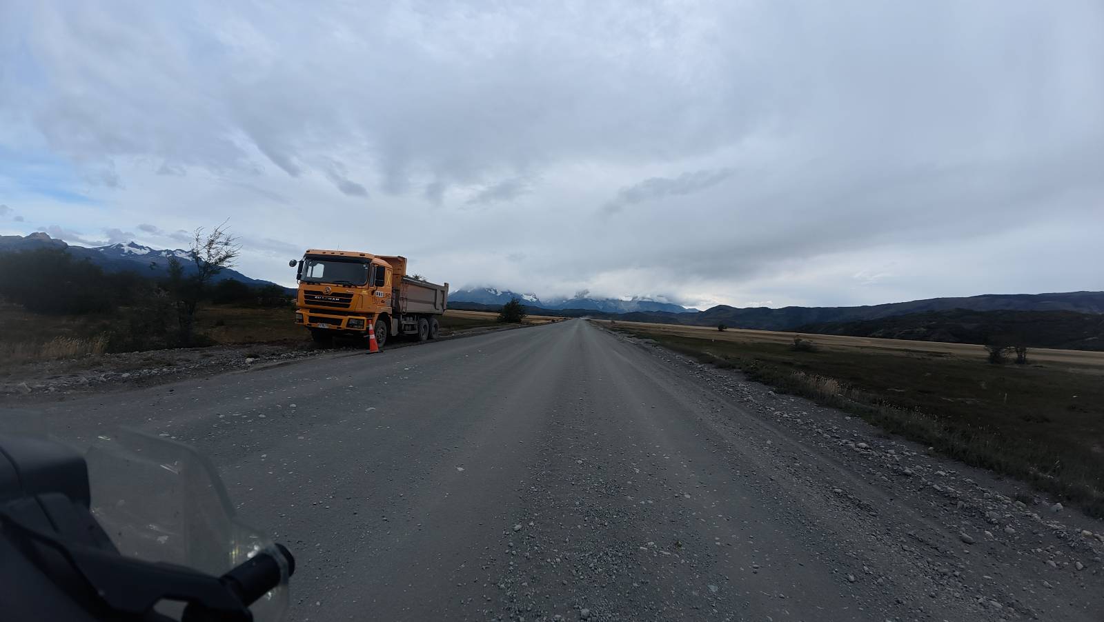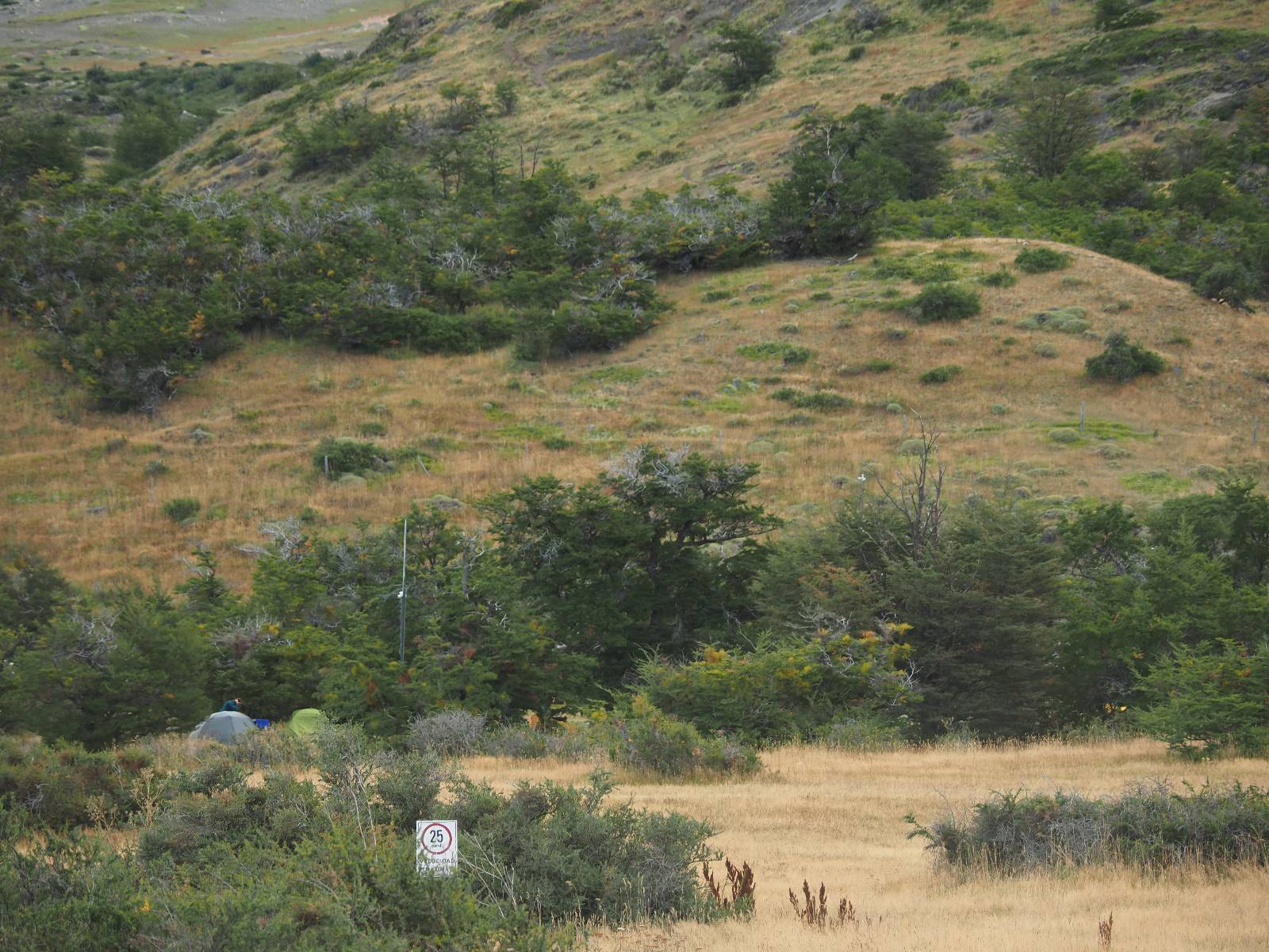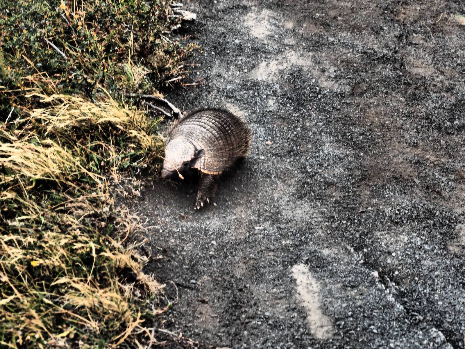 Ich mache ein leichtes Frühstück, mit Banane, Avocado, ein paar Nüssen und einem Powerriegel und baue mein Zelt ab, packe zusammen und mache mich weiter auf den Weg. Aber nur wenig weiter gibt es noch einen Aussichtspunkt, der zwar ca. eine Stunde vom Parkplatz weg liegt aber noch einmal viel Näher an den Bergen dran ist. Ich entscheide mich auch hier wieder in voller Montur und gerüstet mit zwei Kameras, zusammen mit den üblichen Verdächtigen dorthin zu laufen. Gleich am Anfang gibt es noch einen ganz netten Wasserfall und nach tatsächlich fast eine Stunde bin ich hinten. Heute ist es etwas wolkiger aber wie üblich holen alle ihre Snacks raus, machen Pause und genießen den See und die Berge davor. Ich komme mit einem New Yorker etwas intensiever ins Gespräch. Er ist auf einem Mehrtages-Trip und hat sich den vorschlagen und die Planung von seiner KI erstellen lassen. Verrückt! Viel mehr wird heute also nicht passieren. Ich werde heute dann doch wieder die Seiten wechseln und einfach mal schauen wie weit ich komme. Aber auf einmal bleiben einige stehen und fotografieren auf den Weg. Als ich dazu komme sehe ich warum! Ganz seelenruhig spaziert ein Armadillo zwischen den Leuten hin und her und lässt sich bei seine Suche nach Käfern und Würmern nicht stören. Mal nicht so ein Feigling wie der Letzte, der gleich weggelaufen ist! Ich verlasse den Park, da wo ich vor zwei Tagen schon einmal mit dem Bus reingekommen bin. Im Grenzdorf Cerro Castillo, in dem großen Souvenierladen und Restaurant mache ich stopp, esse und trinke eine Kleinigkeit. und gehe gleich um die Ecke zum Zoll, meine Papiere abgeben, um ein paar Kilometer weiter von den Argentiniern neue Dokumente ausgestellt zu bekommen. Ein paar Füchse schleichen herum und hoffen wohl auf einen Leckerbissen. Aber meine Kekse und Riegel täten ihnen wahrscheinlich nicht so gut. Ich bin einmal mehr in Esperanza, tanke und und mache mich auf den Weg zum heutigen Ziel El Calafate. Und dann wird es dunkel am Horizont!