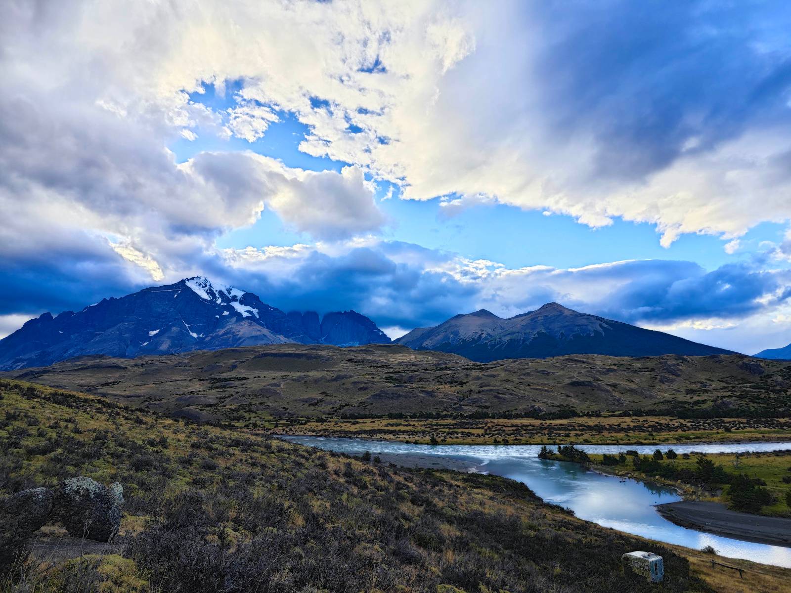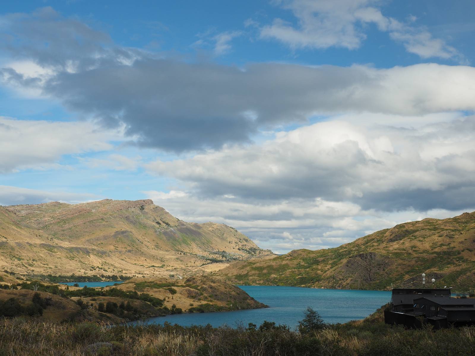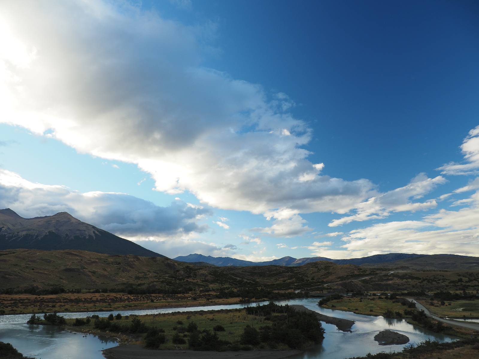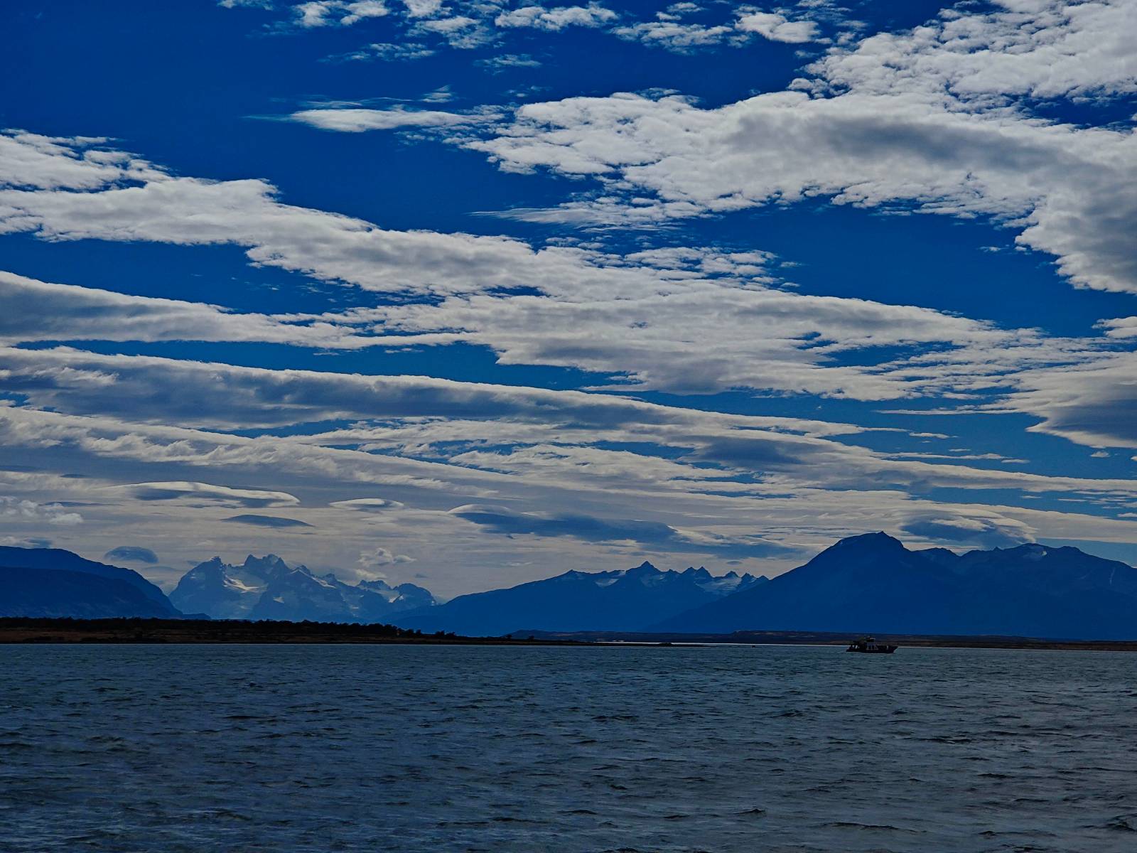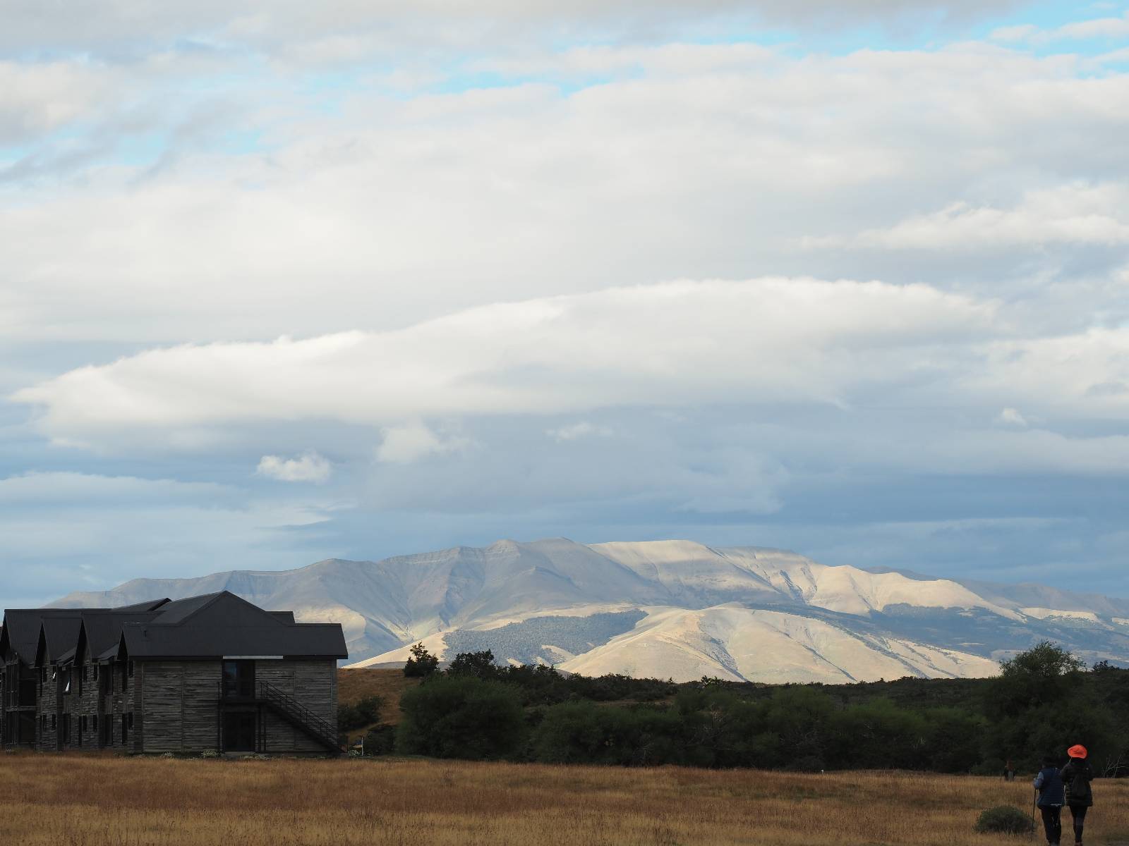 Ich mache ein leichtes Frühstück, mit Banane, Avocado, ein paar Nüssen und einem Powerriegel und baue mein Zelt ab, packe zusammen und mache mich weiter auf den Weg. Aber nur wenig weiter gibt es noch einen Aussichtspunkt, der zwar ca. eine Stunde vom Parkplatz weg liegt aber noch einmal viel Näher an den Bergen dran ist. Ich entscheide mich auch hier wieder in voller Montur und gerüstet mit zwei Kameras, zusammen mit den üblichen Verdächtigen dorthin zu laufen. Gleich am Anfang gibt es noch einen ganz netten Wasserfall und nach tatsächlich fast eine Stunde bin ich hinten. Heute ist es etwas wolkiger aber wie üblich holen alle ihre Snacks raus, machen Pause und genießen den See und die Berge davor. Ich komme mit einem New Yorker etwas intensiever ins Gespräch. Er ist auf einem Mehrtages-Trip und hat sich den vorschlagen und die Planung von seiner KI erstellen lassen. Verrückt! Viel mehr wird heute also nicht passieren. Ich werde heute dann doch wieder die Seiten wechseln und einfach mal schauen wie weit ich komme. Aber auf einmal bleiben einige stehen und fotografieren auf den Weg. Als ich dazu komme sehe ich warum! Ganz seelenruhig spaziert ein Armadillo zwischen den Leuten hin und her und lässt sich bei seine Suche nach Käfern und Würmern nicht stören. Mal nicht so ein Feigling wie der Letzte, der gleich weggelaufen ist! Ich verlasse den Park, da wo ich vor zwei Tagen schon einmal mit dem Bus reingekommen bin. Im Grenzdorf Cerro Castillo, in dem großen Souvenierladen und Restaurant mache ich stopp, esse und trinke eine Kleinigkeit. und gehe gleich um die Ecke zum Zoll, meine Papiere abgeben, um ein paar Kilometer weiter von den Argentiniern neue Dokumente ausgestellt zu bekommen. Ein paar Füchse schleichen herum und hoffen wohl auf einen Leckerbissen. Aber meine Kekse und Riegel täten ihnen wahrscheinlich nicht so gut. Ich bin einmal mehr in Esperanza, tanke und und mache mich auf den Weg zum heutigen Ziel El Calafate. Und dann wird es dunkel am Horizont!