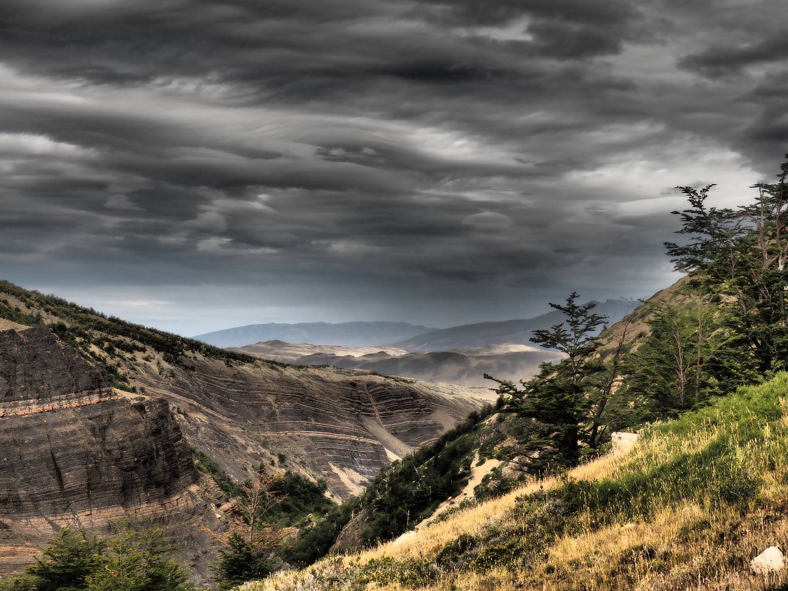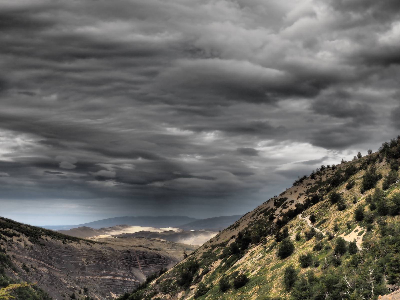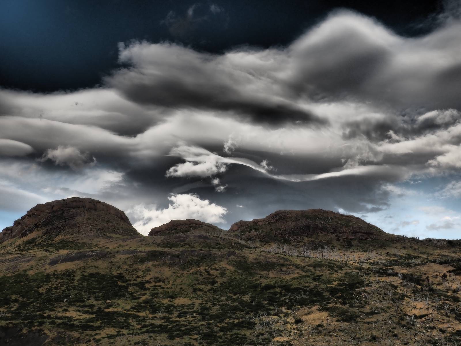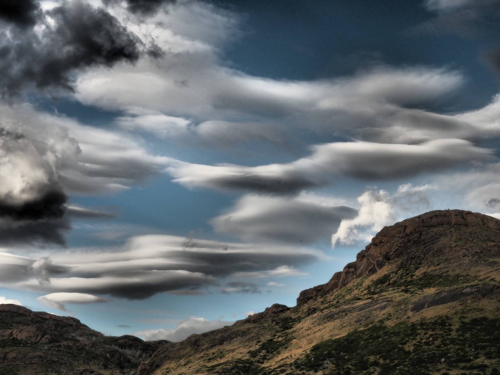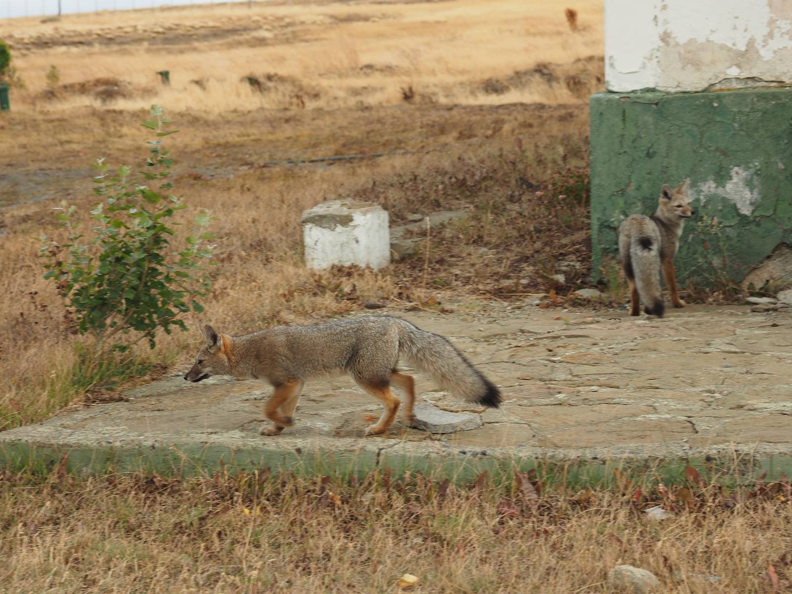 Ich mache ein leichtes Frühstück, mit Banane, Avocado, ein paar Nüssen und einem Powerriegel und baue mein Zelt ab, packe zusammen und mache mich weiter auf den Weg. Aber nur wenig weiter gibt es noch einen Aussichtspunkt, der zwar ca. eine Stunde vom Parkplatz weg liegt aber noch einmal viel Näher an den Bergen dran ist. Ich entscheide mich auch hier wieder in voller Montur und gerüstet mit zwei Kameras, zusammen mit den üblichen Verdächtigen dorthin zu laufen. Gleich am Anfang gibt es noch einen ganz netten Wasserfall und nach tatsächlich fast eine Stunde bin ich hinten. Heute ist es etwas wolkiger aber wie üblich holen alle ihre Snacks raus, machen Pause und genießen den See und die Berge davor. Ich komme mit einem New Yorker etwas intensiever ins Gespräch. Er ist auf einem Mehrtages-Trip und hat sich den vorschlagen und die Planung von seiner KI erstellen lassen. Verrückt! Viel mehr wird heute also nicht passieren. Ich werde heute dann doch wieder die Seiten wechseln und einfach mal schauen wie weit ich komme. Aber auf einmal bleiben einige stehen und fotografieren auf den Weg. Als ich dazu komme sehe ich warum! Ganz seelenruhig spaziert ein Armadillo zwischen den Leuten hin und her und lässt sich bei seine Suche nach Käfern und Würmern nicht stören. Mal nicht so ein Feigling wie der Letzte, der gleich weggelaufen ist! Ich verlasse den Park, da wo ich vor zwei Tagen schon einmal mit dem Bus reingekommen bin. Im Grenzdorf Cerro Castillo, in dem großen Souvenierladen und Restaurant mache ich stopp, esse und trinke eine Kleinigkeit. und gehe gleich um die Ecke zum Zoll, meine Papiere abgeben, um ein paar Kilometer weiter von den Argentiniern neue Dokumente ausgestellt zu bekommen. Ein paar Füchse schleichen herum und hoffen wohl auf einen Leckerbissen. Aber meine Kekse und Riegel täten ihnen wahrscheinlich nicht so gut. Ich bin einmal mehr in Esperanza, tanke und und mache mich auf den Weg zum heutigen Ziel El Calafate. Und dann wird es dunkel am Horizont!