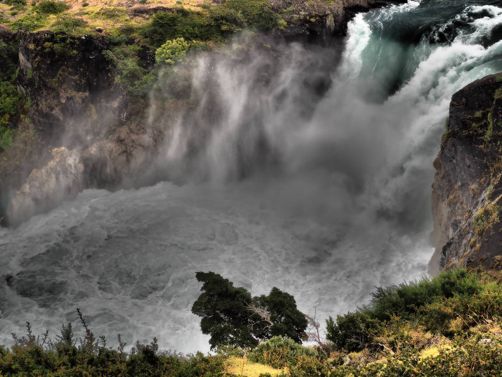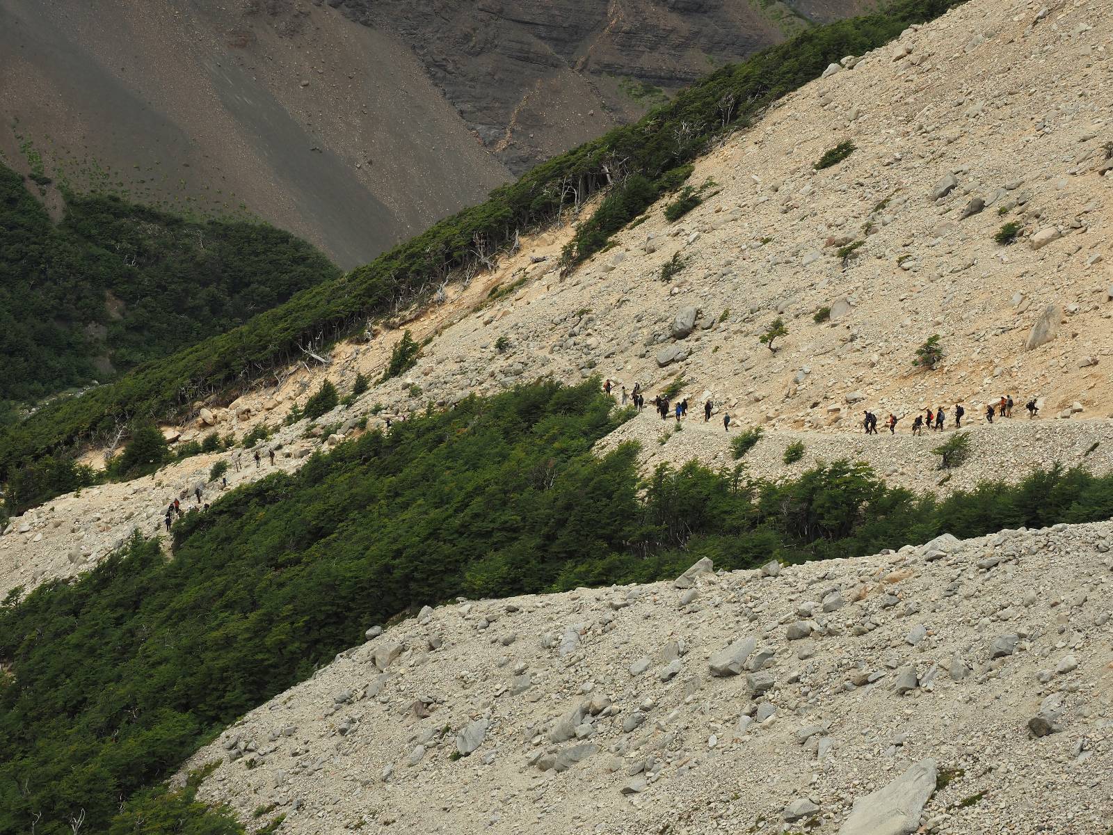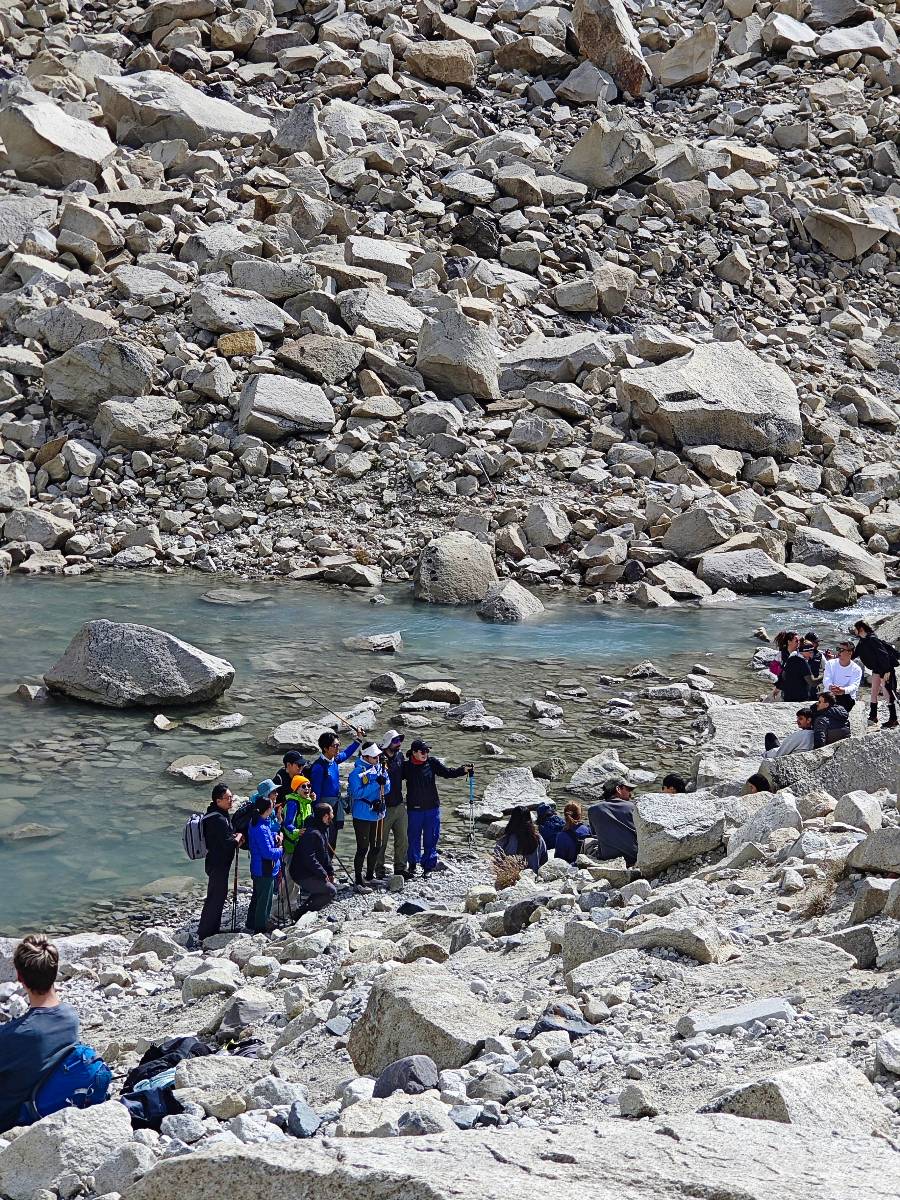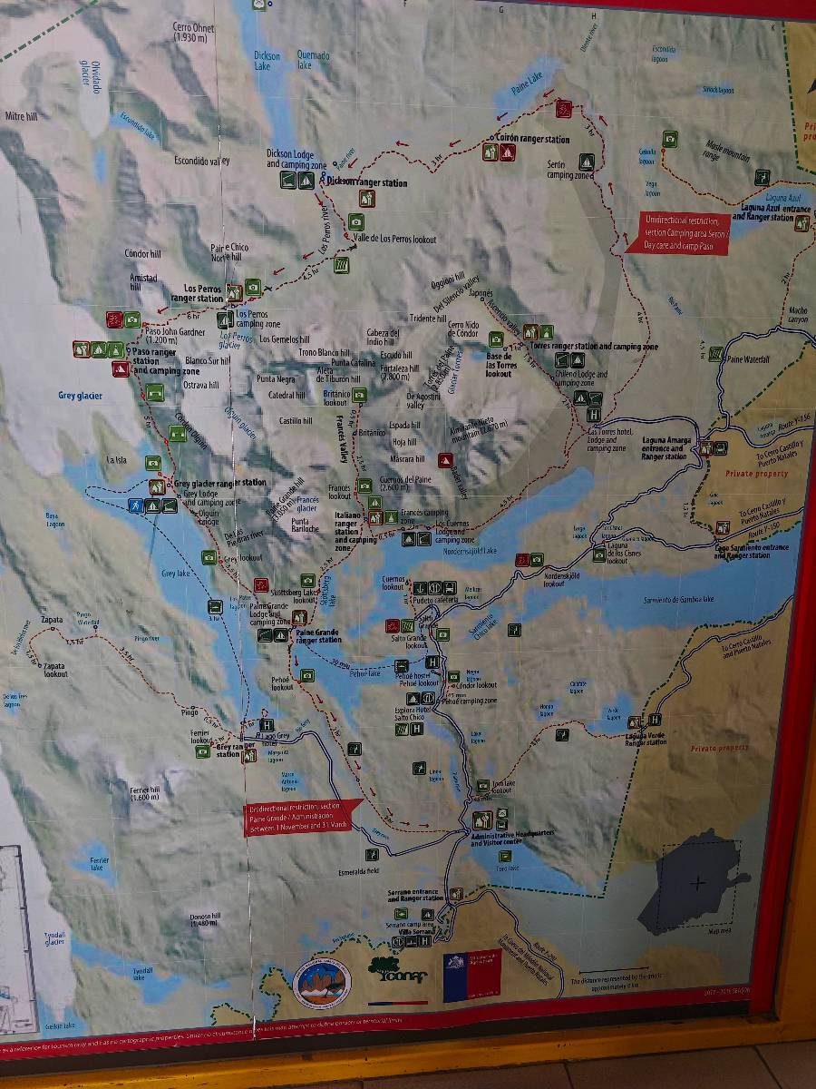 Zeitig aufstehen ist ja nunmal gar nicht so mein Ding aber die über hundert Kilometer in den Park mit dem Motorrad in Wanderklamotten zu fahren wäre mir zu kalt und anstrengend. Gerade auf den Rückweg hätte ich da keinen Bock, daher der Bus. Somit kann ich noch etwas vor mich hindösen, so wie alle anderen hier auch! Am Parkeingang kaufe ich mir meine Eintrittskarte, steige auf den „internen“ Bus um, der auch nochmal kostet und mich und die vielen Anderen zum Welcome Center bringt, von wo letztendlich die Wanderung los geht. Aber erst einmal ein Muffin und einen Kaffee! Jetzt kann es an die 10km Aufstieg gehen! Der Wettergott ist mir hold, die Temperaturen stimmen, Sonne gibt es auch und so reihe ich mich in die Schlange derer, die alle zum Base Camp wollen ein. Es lässt sich gut laufen und der Bilck rund herum gefällt! Ein bisschen habe ich ein Fitz Roy Déjàvu! Aber das lässt sich heutzutage wohl nicht mehr ändern. Zwischendrin komme ich an einem „Zeltplatz“ vorbei. Letztendlich sind es sowas wie Autodachzelte die im Wald an den Hang gestellt sind, mit einem festen Haus für Sanitäranlagen und einem Restaurant. Aber über 200,- EUR die Nacht dafür finde ich weit zu viel! Trotzdem scheint es doch einige zu geben, die diese Möglichkeit nutzen! Ich muss mit meinem Chef reden, ich verdiene eindeutig zu wenig! Ich ziehe mit der Masse weiter, bestaune die Landschaft um mich herum, bis es zum finalen Aufstieg geht, der natürlich wieder etwas steiler und steiniger ist! Das wäre gar nicht so sehr das Problem aber es bewegen sich halt zwei Schlangen an einander vorbei und das bringt den Aufstieg immer mal wieder ins Stocken. Nichts desto trotz ist es bald geschafft und ähnlich wie am Fitz eröffnet sich das Panorama auf den Torres del Paine mit seinen umgebenden Felsen und dem See davor. Und irgend jemand hat auch hier einen Felsen am Rand des Sees hingelegt, damit die Touris sich auch hier anstellen können, um dort drauf zusteigen und Fotos von sich zu machen! Herrlich! Und dann wundere ich mich noch, warum alle den Chilenischen ein Peso Schein aus der Tasche ziehen und damit ein Foto machen. Also ziehe ich ihn selber und stelle fest, das der Torres del Paine darauf abgebildet ist! Das Foto damit mache ich nicht. Aber genießen tue ich den Anblick schon und mal wieder glüht der Fotoapparat. Trotzdem muss ich sagen, die Stimmung am Fitz fand ich besser. Vielleicht liegt es am Einfall des Sonnenlichts oder ich hatte etwas noch viel Spektakuläreres erwartet. Aber grandios ist es schon! Ich fotografiere in die Felsen hinein, suche mir Details, Condore fliegen auch wieder weit oben und es mach Spaß die Leute zu beobachten. Ich genieße die Zeit!
