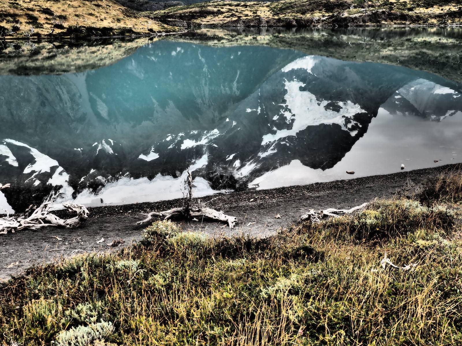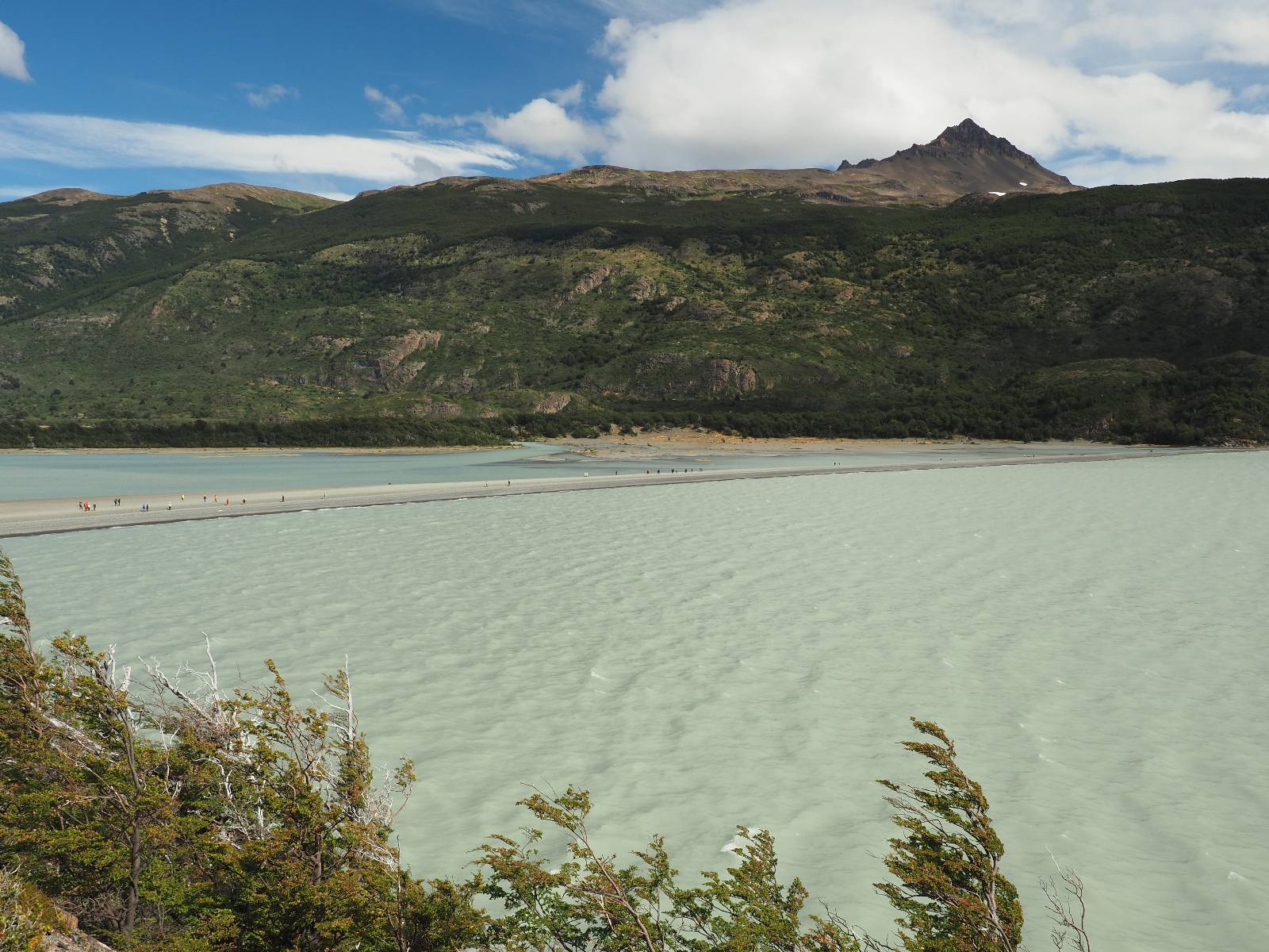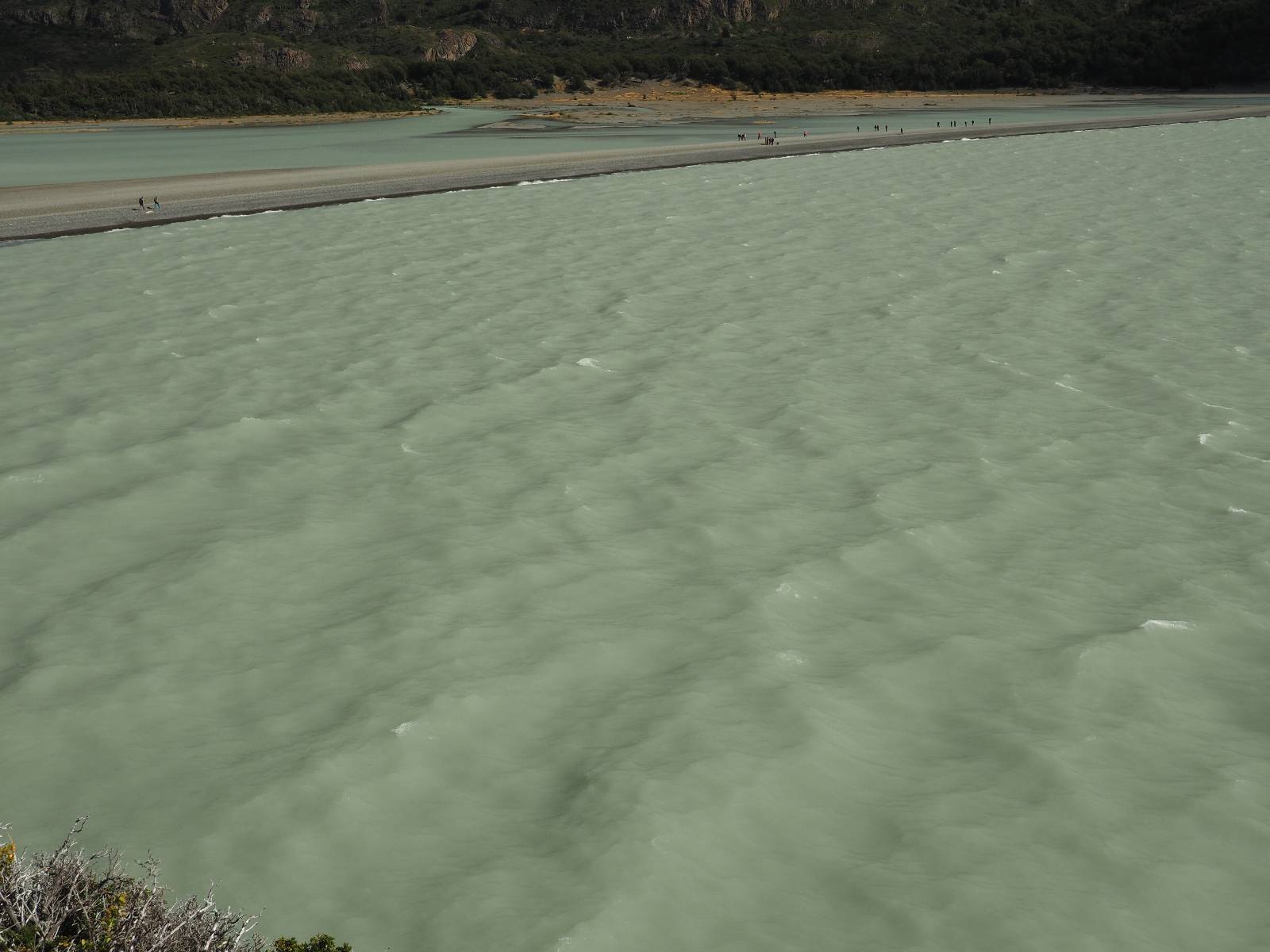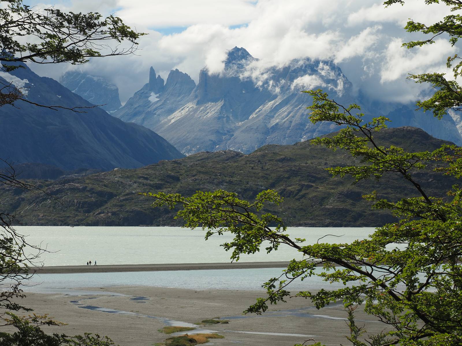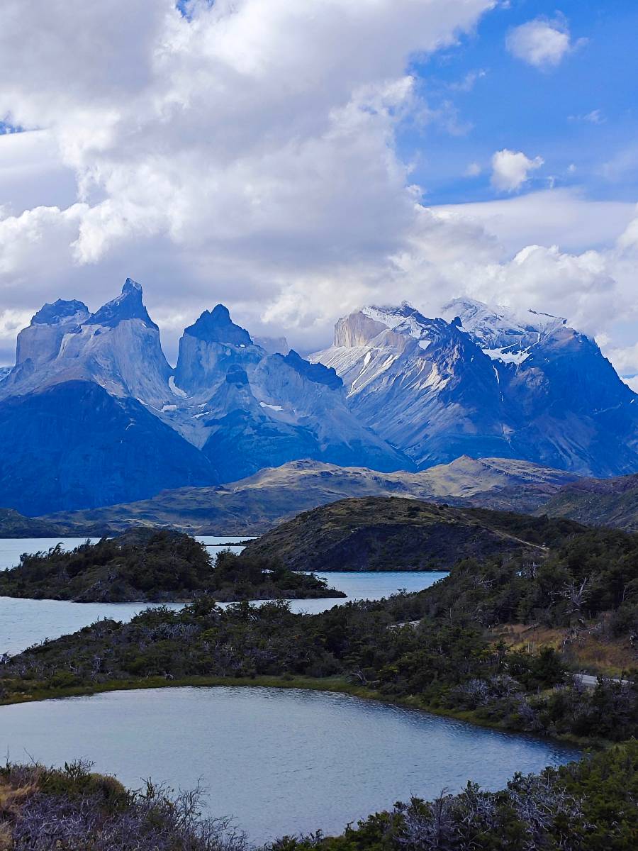 Tags drauf reise ich ab. Die Tour steckt noch etwas in den Oberschenkeln und der Wetterbericht sag so lala aber das Zimmer verlängern ging nicht mehr. Ich hatte mitbekommen, dass das Ticket vom Park drei Tage Gültigkeit hat und so will ich je nachdem, wie sich das Wetter nun entwickelt einmal von der anderen Seite aus durch den Park fahren oder vielleicht sogar eine Nacht drin verbringen. Ich begebe mich in die Spur, die mich am Milodon vorbei an den anderen Parkeingang führt. Ich darf mit meinem Ticket passieren und erfreue mich am herrlichen Anblick der Felsenformationen von der anderen Seite. Mir kommt es heute fast viel schöner vor, obwohl ich den Torres selber fast nicht sehe. Mein erstes Ziel im Park ist eine kleine fast Insel auf die man Laufen kann und von der aus man auf den weit dahinter liegenden Gletscher schauen kann. Ich lasse das Motorrad auf dem Parkplatz bei vielen anderen Ausflüglerautos und stiefle in voller Montur los. Das Wetter hat etwas aufgeklart und so mache ich mir vorerst keine Sorgen, dass es nass werden könnte. Über eine Art Strandstreifen stapfe ich zum Inselchen und dort vor bis zum Aussichtspunkt. Ok, ich kann den Gletscher sehen aber er ist wirklich noch weit weg!! Macht aber nichts! Die Sonne tut gut und macht warm und ich habe Zeit und kein sehr weites Ziel. Zumindest würde ich nur bis hinter den Park fahren und dort in dem kleinen Ort ein Bett für eine Nacht finden, sagt zumindest Google-Maps. Ich laufe zurück und mache Mittagspause im Restauran was direkat am Parkplatz liegt und überlege, wie ich nun weiterfahre. Der Tag ist nun doch schon etwas fortgeschritten aber vielleicht taugt ja der Campingplatz an dem ich einige Kilometer weiter vorbeikommen werde. Oder es ist auch wieder so etwas wie ich bereits gesehen habe, mit überteuerten Preisen.