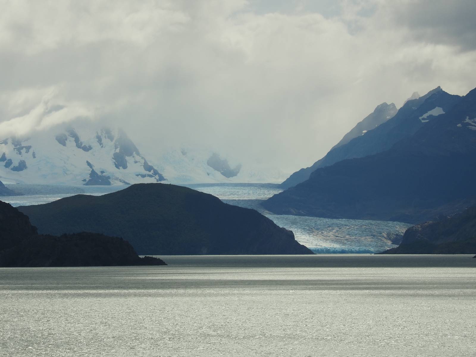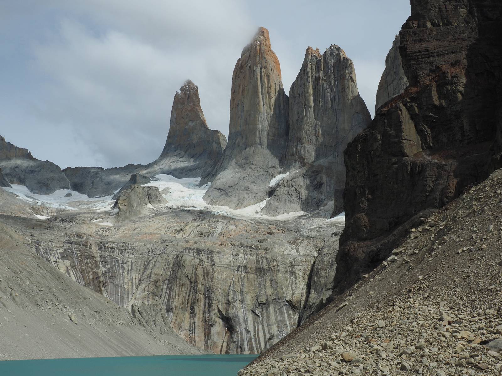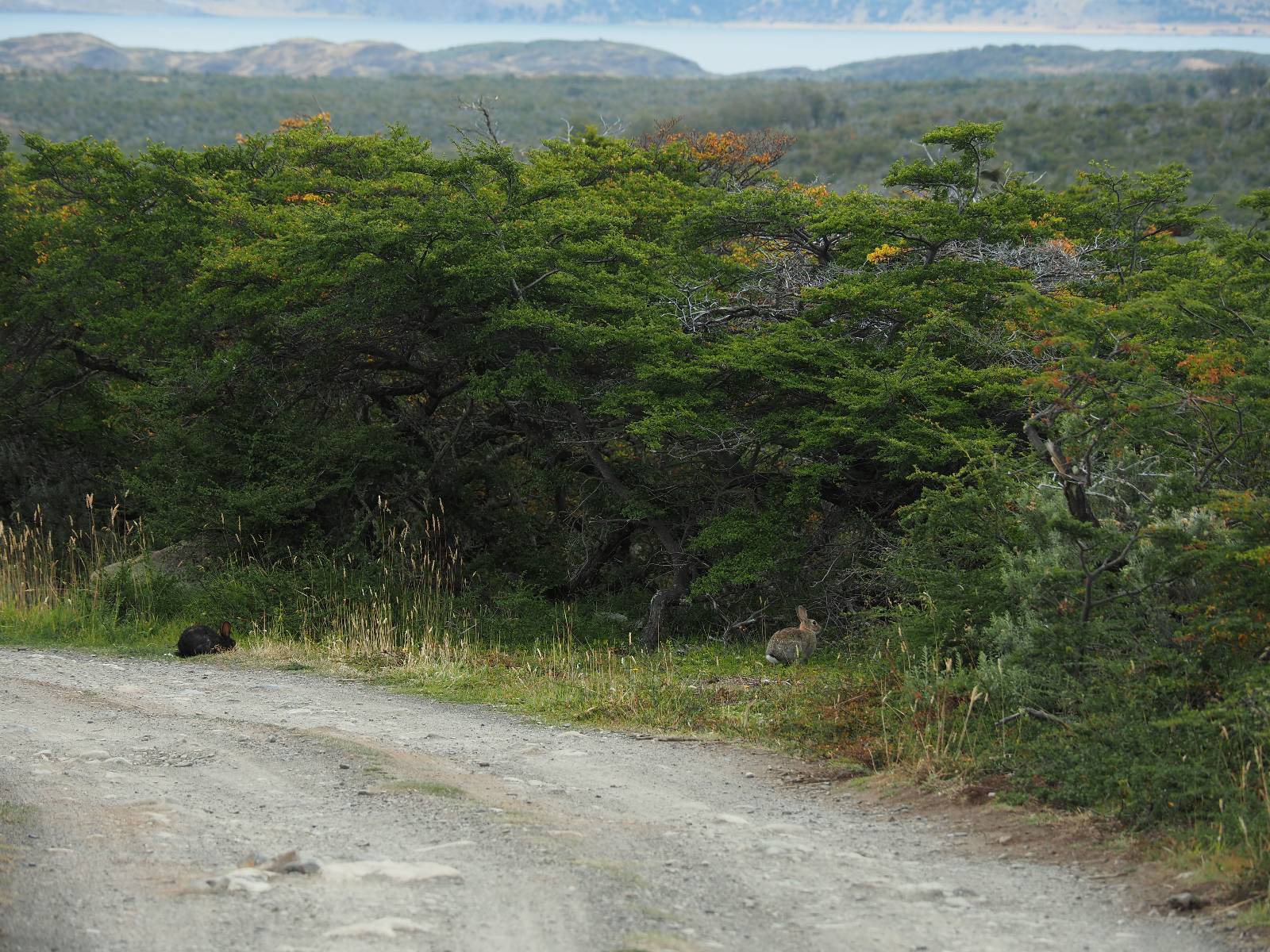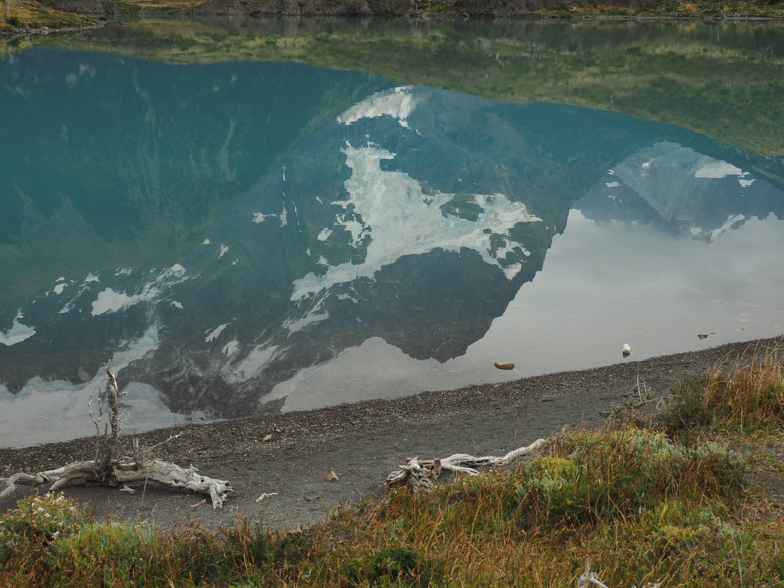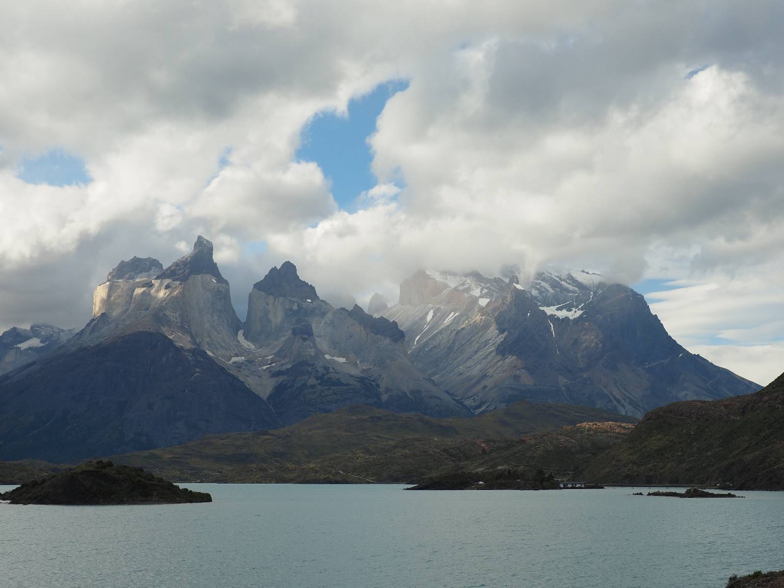 Tags drauf reise ich ab. Die Tour steckt noch etwas in den Oberschenkeln und der Wetterbericht sag so lala aber das Zimmer verlängern ging nicht mehr. Ich hatte mitbekommen, dass das Ticket vom Park drei Tage Gültigkeit hat und so will ich je nachdem, wie sich das Wetter nun entwickelt einmal von der anderen Seite aus durch den Park fahren oder vielleicht sogar eine Nacht drin verbringen. Ich begebe mich in die Spur, die mich am Milodon vorbei an den anderen Parkeingang führt. Ich darf mit meinem Ticket passieren und erfreue mich am herrlichen Anblick der Felsenformationen von der anderen Seite. Mir kommt es heute fast viel schöner vor, obwohl ich den Torres selber fast nicht sehe. Mein erstes Ziel im Park ist eine kleine fast Insel auf die man Laufen kann und von der aus man auf den weit dahinter liegenden Gletscher schauen kann. Ich lasse das Motorrad auf dem Parkplatz bei vielen anderen Ausflüglerautos und stiefle in voller Montur los. Das Wetter hat etwas aufgeklart und so mache ich mir vorerst keine Sorgen, dass es nass werden könnte. Über eine Art Strandstreifen stapfe ich zum Inselchen und dort vor bis zum Aussichtspunkt. Ok, ich kann den Gletscher sehen aber er ist wirklich noch weit weg!! Macht aber nichts! Die Sonne tut gut und macht warm und ich habe Zeit und kein sehr weites Ziel. Zumindest würde ich nur bis hinter den Park fahren und dort in dem kleinen Ort ein Bett für eine Nacht finden, sagt zumindest Google-Maps. Ich laufe zurück und mache Mittagspause im Restauran was direkat am Parkplatz liegt und überlege, wie ich nun weiterfahre. Der Tag ist nun doch schon etwas fortgeschritten aber vielleicht taugt ja der Campingplatz an dem ich einige Kilometer weiter vorbeikommen werde. Oder es ist auch wieder so etwas wie ich bereits gesehen habe, mit überteuerten Preisen.