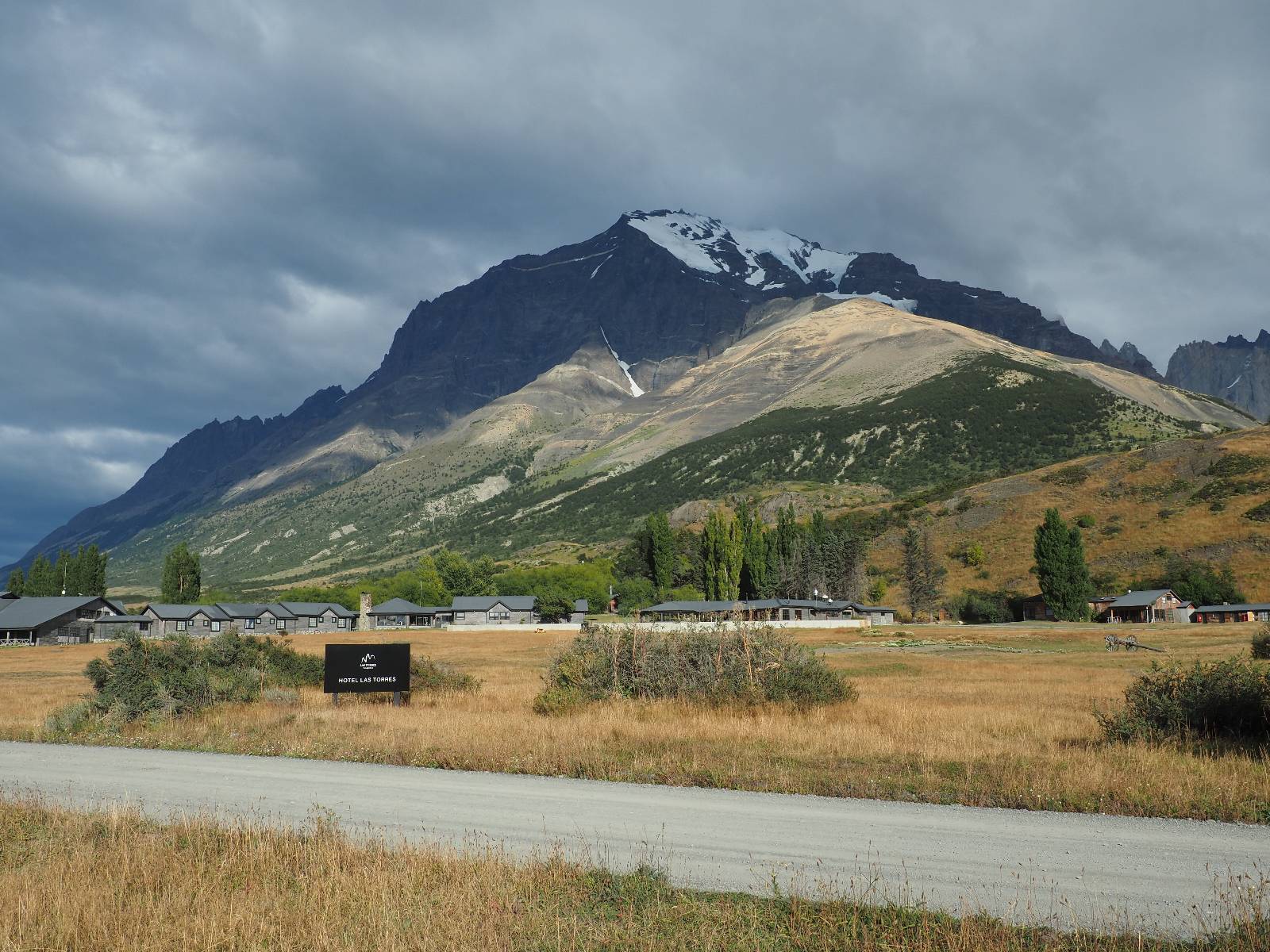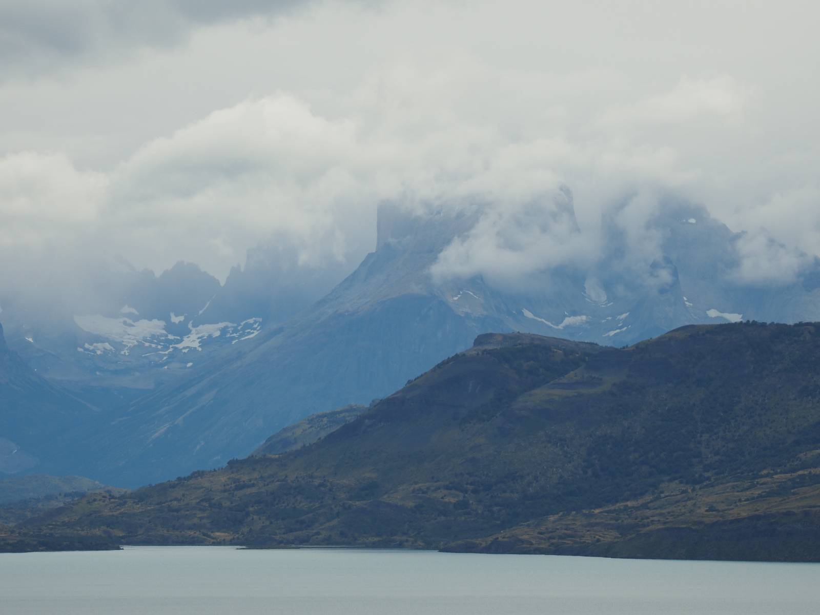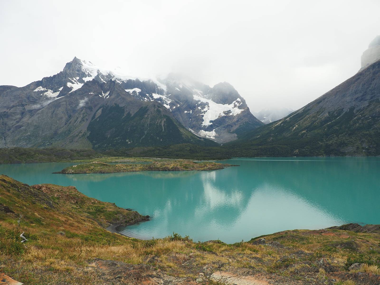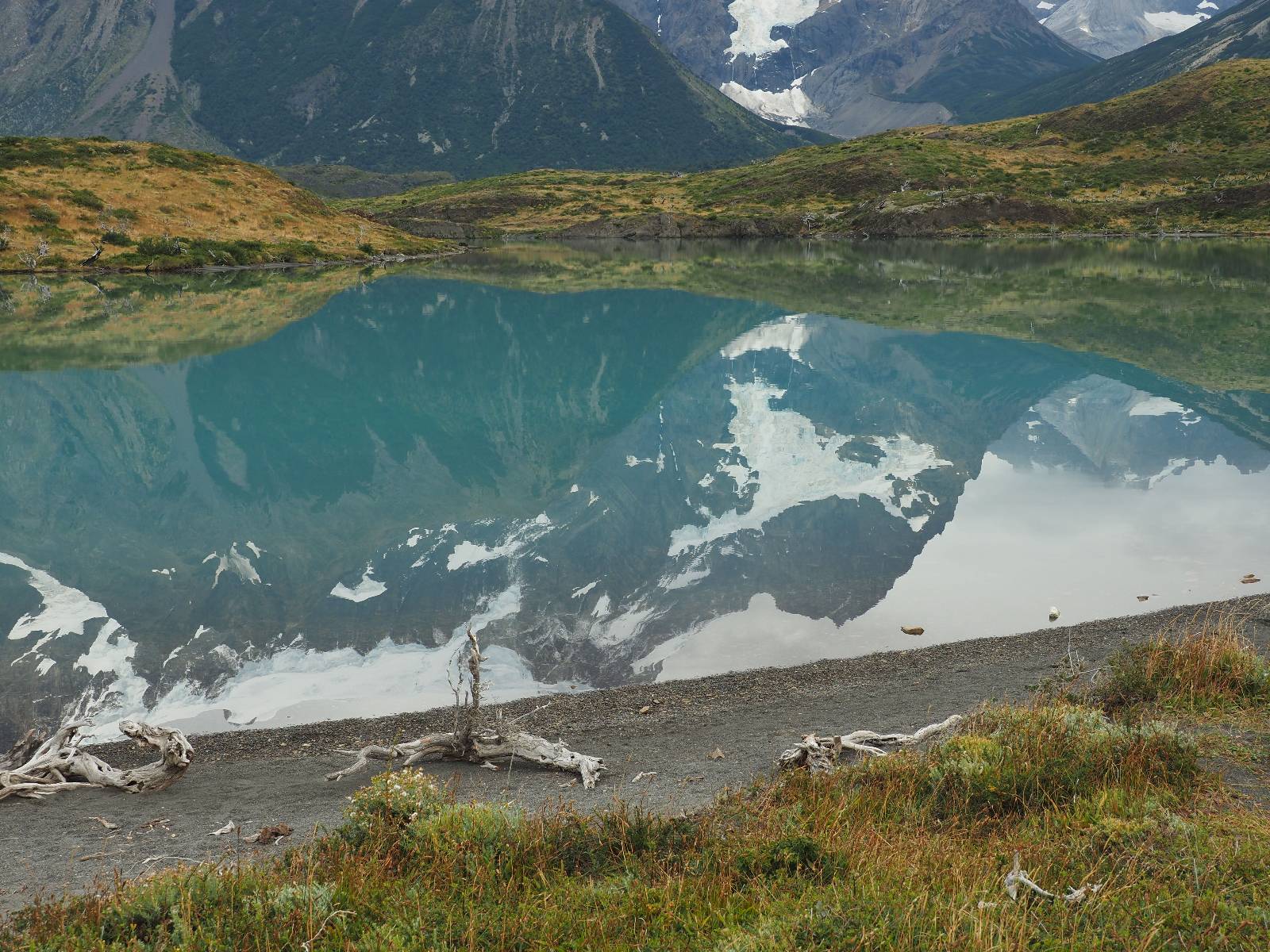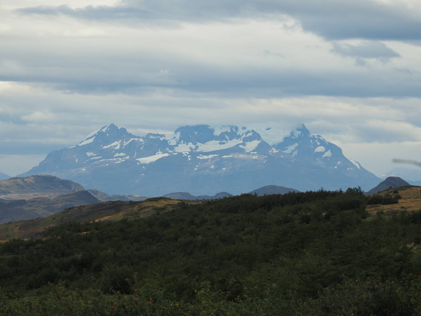 Tags drauf reise ich ab. Die Tour steckt noch etwas in den Oberschenkeln und der Wetterbericht sag so lala aber das Zimmer verlängern ging nicht mehr. Ich hatte mitbekommen, dass das Ticket vom Park drei Tage Gültigkeit hat und so will ich je nachdem, wie sich das Wetter nun entwickelt einmal von der anderen Seite aus durch den Park fahren oder vielleicht sogar eine Nacht drin verbringen. Ich begebe mich in die Spur, die mich am Milodon vorbei an den anderen Parkeingang führt. Ich darf mit meinem Ticket passieren und erfreue mich am herrlichen Anblick der Felsenformationen von der anderen Seite. Mir kommt es heute fast viel schöner vor, obwohl ich den Torres selber fast nicht sehe. Mein erstes Ziel im Park ist eine kleine fast Insel auf die man Laufen kann und von der aus man auf den weit dahinter liegenden Gletscher schauen kann. Ich lasse das Motorrad auf dem Parkplatz bei vielen anderen Ausflüglerautos und stiefle in voller Montur los. Das Wetter hat etwas aufgeklart und so mache ich mir vorerst keine Sorgen, dass es nass werden könnte. Über eine Art Strandstreifen stapfe ich zum Inselchen und dort vor bis zum Aussichtspunkt. Ok, ich kann den Gletscher sehen aber er ist wirklich noch weit weg!! Macht aber nichts! Die Sonne tut gut und macht warm und ich habe Zeit und kein sehr weites Ziel. Zumindest würde ich nur bis hinter den Park fahren und dort in dem kleinen Ort ein Bett für eine Nacht finden, sagt zumindest Google-Maps. Ich laufe zurück und mache Mittagspause im Restauran was direkat am Parkplatz liegt und überlege, wie ich nun weiterfahre. Der Tag ist nun doch schon etwas fortgeschritten aber vielleicht taugt ja der Campingplatz an dem ich einige Kilometer weiter vorbeikommen werde. Oder es ist auch wieder so etwas wie ich bereits gesehen habe, mit überteuerten Preisen.