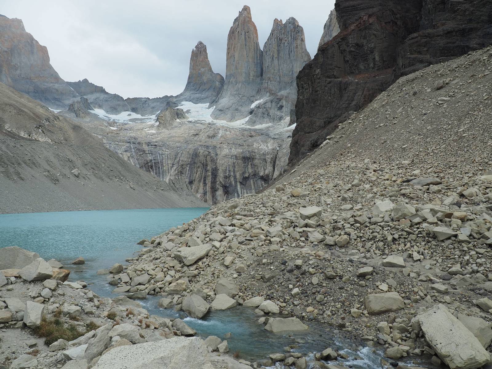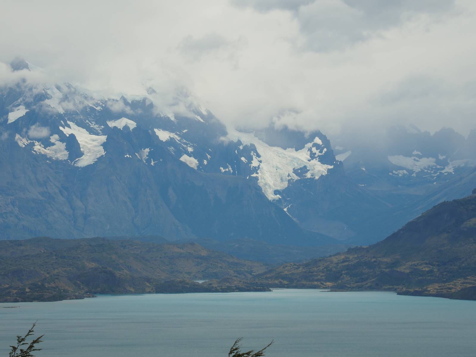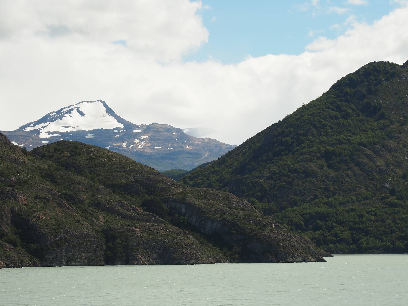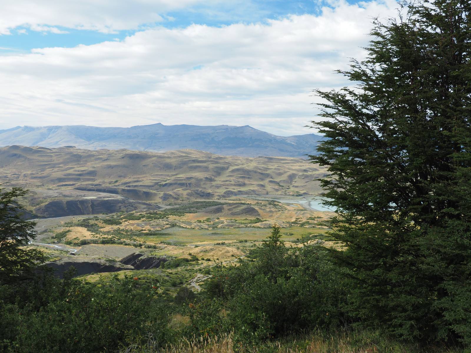 Tags drauf reise ich ab. Die Tour steckt noch etwas in den Oberschenkeln und der Wetterbericht sag so lala aber das Zimmer verlängern ging nicht mehr. Ich hatte mitbekommen, dass das Ticket vom Park drei Tage Gültigkeit hat und so will ich je nachdem, wie sich das Wetter nun entwickelt einmal von der anderen Seite aus durch den Park fahren oder vielleicht sogar eine Nacht drin verbringen. Ich begebe mich in die Spur, die mich am Milodon vorbei an den anderen Parkeingang führt. Ich darf mit meinem Ticket passieren und erfreue mich am herrlichen Anblick der Felsenformationen von der anderen Seite. Mir kommt es heute fast viel schöner vor, obwohl ich den Torres selber fast nicht sehe. Mein erstes Ziel im Park ist eine kleine fast Insel auf die man Laufen kann und von der aus man auf den weit dahinter liegenden Gletscher schauen kann. Ich lasse das Motorrad auf dem Parkplatz bei vielen anderen Ausflüglerautos und stiefle in voller Montur los. Das Wetter hat etwas aufgeklart und so mache ich mir vorerst keine Sorgen, dass es nass werden könnte. Über eine Art Strandstreifen stapfe ich zum Inselchen und dort vor bis zum Aussichtspunkt. Ok, ich kann den Gletscher sehen aber er ist wirklich noch weit weg!! Macht aber nichts! Die Sonne tut gut und macht warm und ich habe Zeit und kein sehr weites Ziel. Zumindest würde ich nur bis hinter den Park fahren und dort in dem kleinen Ort ein Bett für eine Nacht finden, sagt zumindest Google-Maps. Ich laufe zurück und mache Mittagspause im Restauran was direkat am Parkplatz liegt und überlege, wie ich nun weiterfahre. Der Tag ist nun doch schon etwas fortgeschritten aber vielleicht taugt ja der Campingplatz an dem ich einige Kilometer weiter vorbeikommen werde. Oder es ist auch wieder so etwas wie ich bereits gesehen habe, mit überteuerten Preisen.