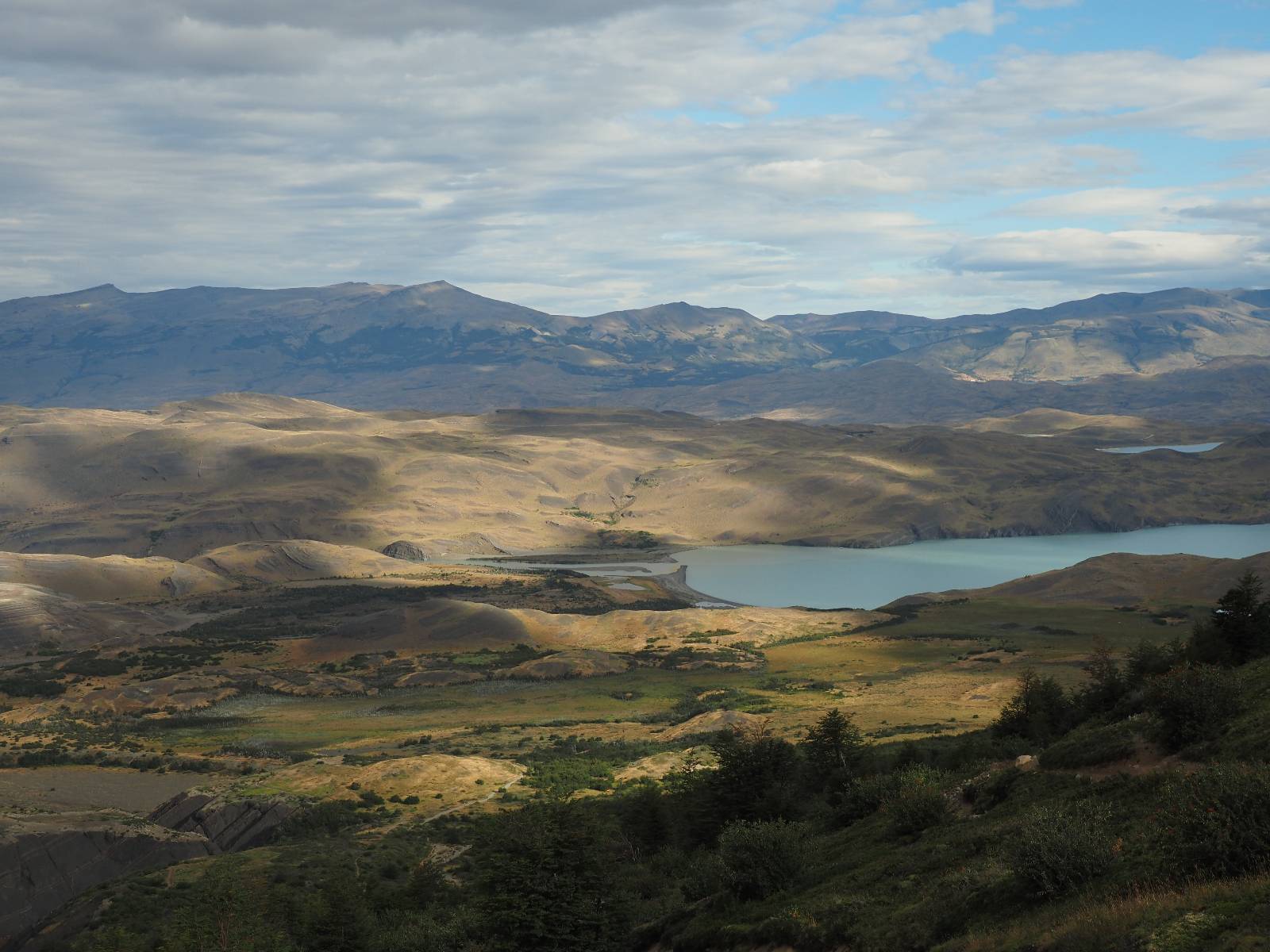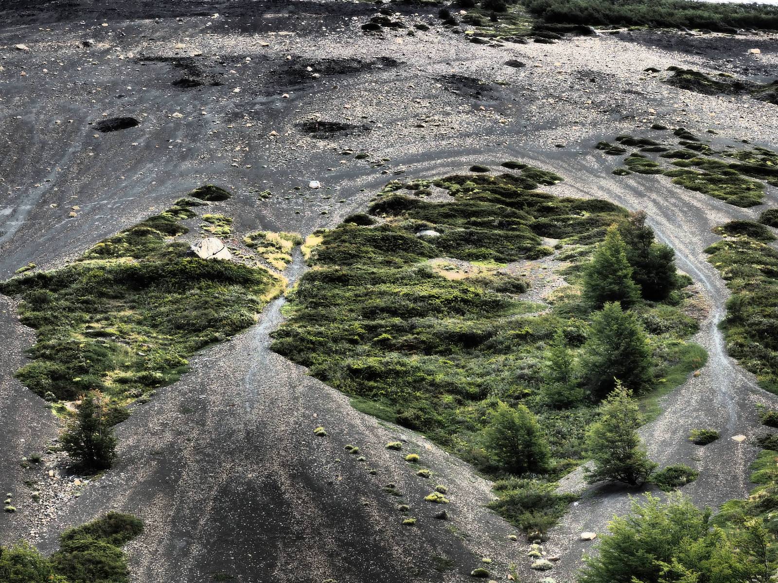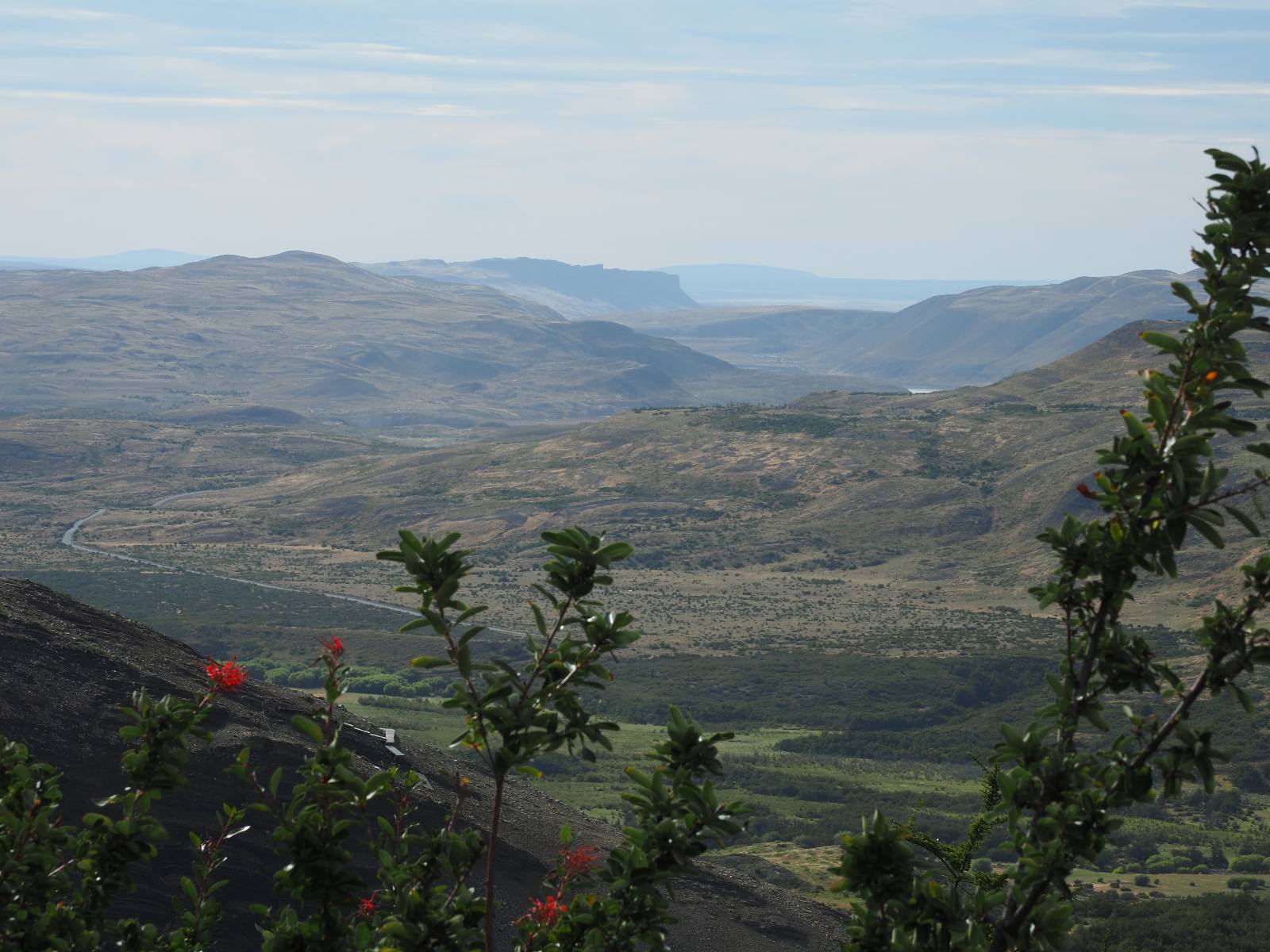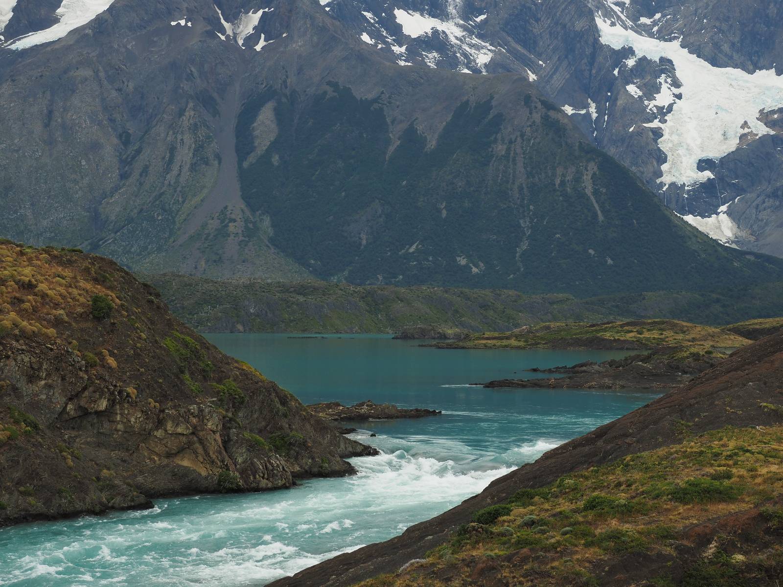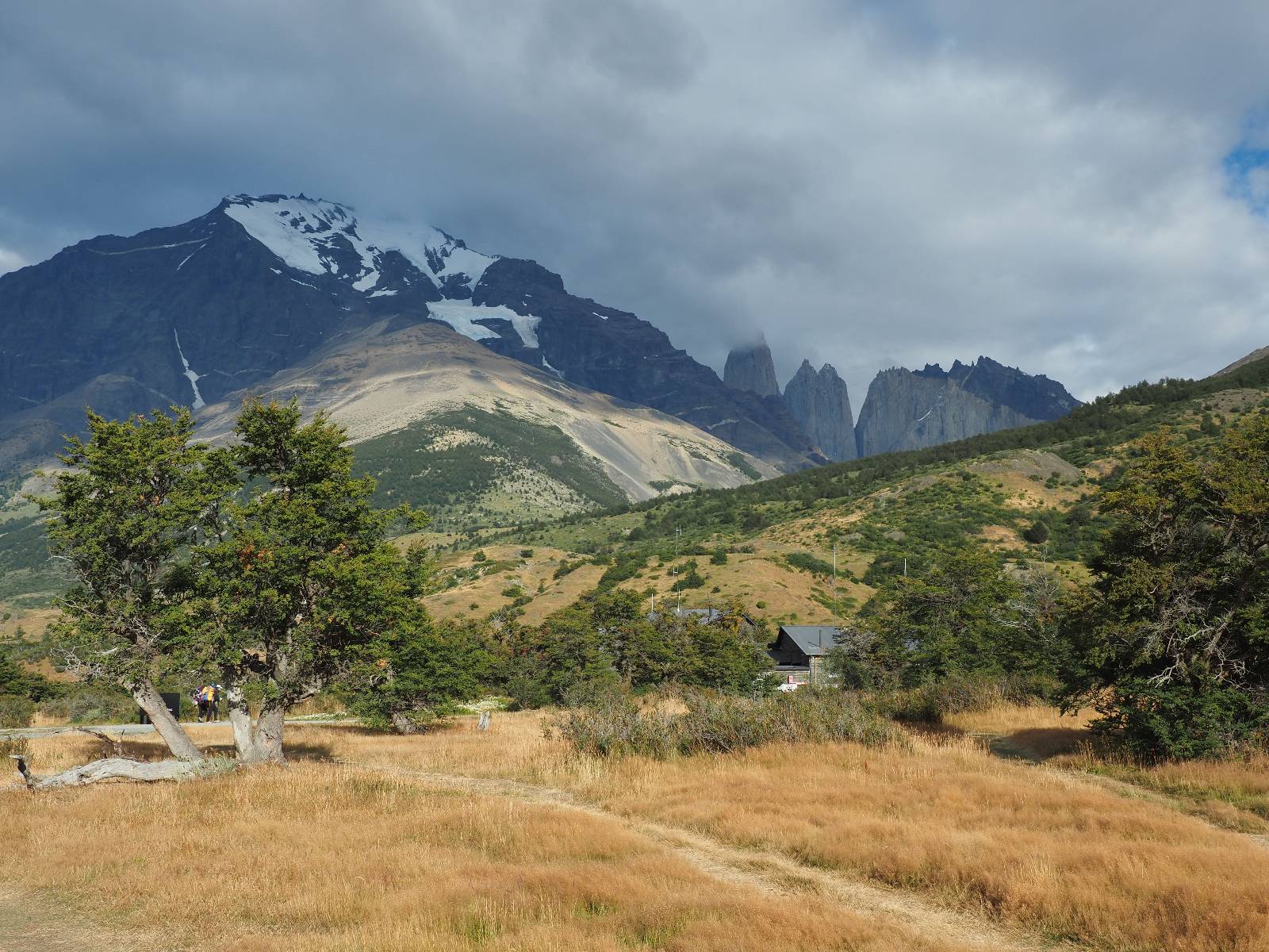 Tags drauf reise ich ab. Die Tour steckt noch etwas in den Oberschenkeln und der Wetterbericht sag so lala aber das Zimmer verlängern ging nicht mehr. Ich hatte mitbekommen, dass das Ticket vom Park drei Tage Gültigkeit hat und so will ich je nachdem, wie sich das Wetter nun entwickelt einmal von der anderen Seite aus durch den Park fahren oder vielleicht sogar eine Nacht drin verbringen. Ich begebe mich in die Spur, die mich am Milodon vorbei an den anderen Parkeingang führt. Ich darf mit meinem Ticket passieren und erfreue mich am herrlichen Anblick der Felsenformationen von der anderen Seite. Mir kommt es heute fast viel schöner vor, obwohl ich den Torres selber fast nicht sehe. Mein erstes Ziel im Park ist eine kleine fast Insel auf die man Laufen kann und von der aus man auf den weit dahinter liegenden Gletscher schauen kann. Ich lasse das Motorrad auf dem Parkplatz bei vielen anderen Ausflüglerautos und stiefle in voller Montur los. Das Wetter hat etwas aufgeklart und so mache ich mir vorerst keine Sorgen, dass es nass werden könnte. Über eine Art Strandstreifen stapfe ich zum Inselchen und dort vor bis zum Aussichtspunkt. Ok, ich kann den Gletscher sehen aber er ist wirklich noch weit weg!! Macht aber nichts! Die Sonne tut gut und macht warm und ich habe Zeit und kein sehr weites Ziel. Zumindest würde ich nur bis hinter den Park fahren und dort in dem kleinen Ort ein Bett für eine Nacht finden, sagt zumindest Google-Maps. Ich laufe zurück und mache Mittagspause im Restauran was direkat am Parkplatz liegt und überlege, wie ich nun weiterfahre. Der Tag ist nun doch schon etwas fortgeschritten aber vielleicht taugt ja der Campingplatz an dem ich einige Kilometer weiter vorbeikommen werde. Oder es ist auch wieder so etwas wie ich bereits gesehen habe, mit überteuerten Preisen.