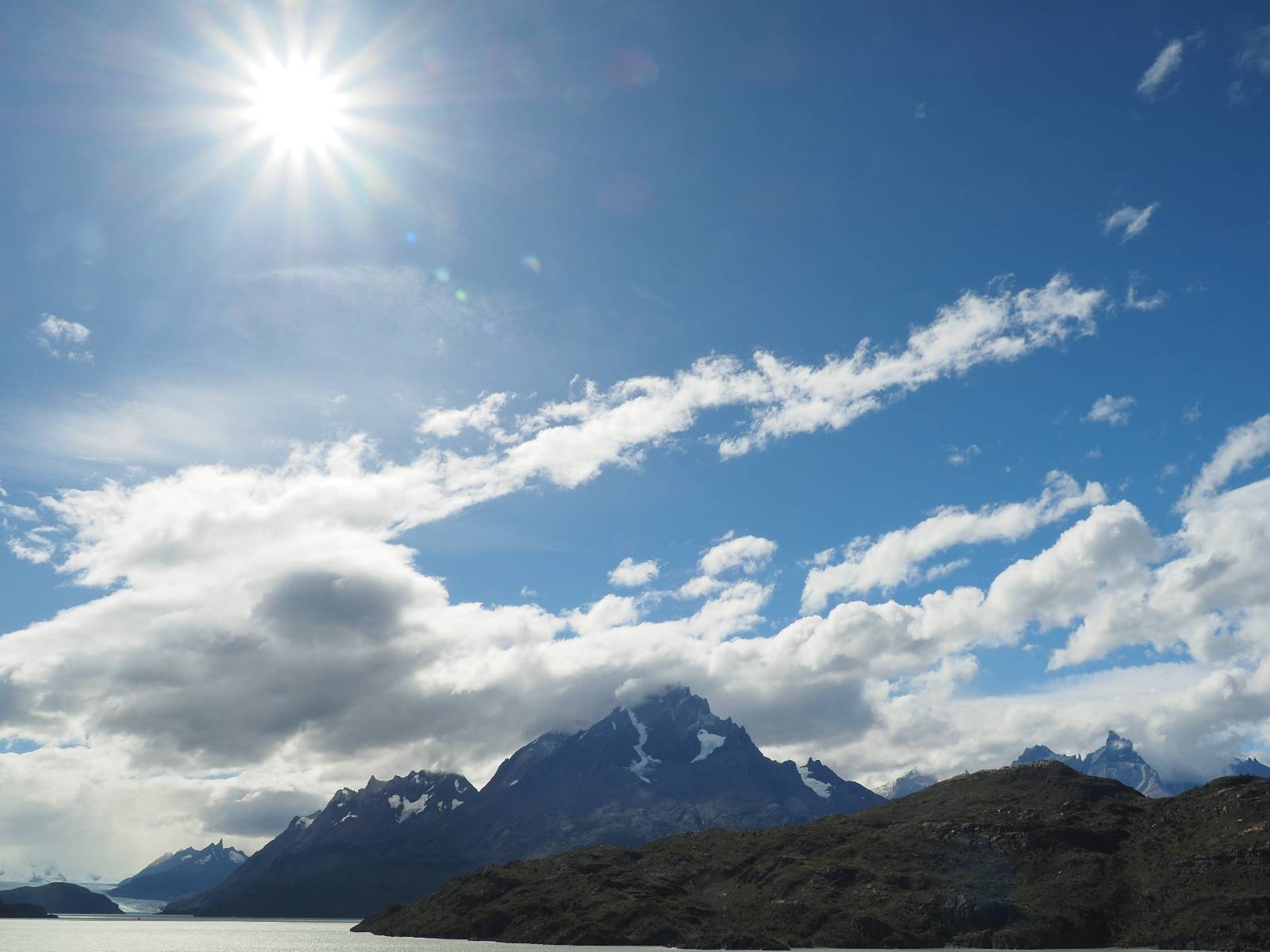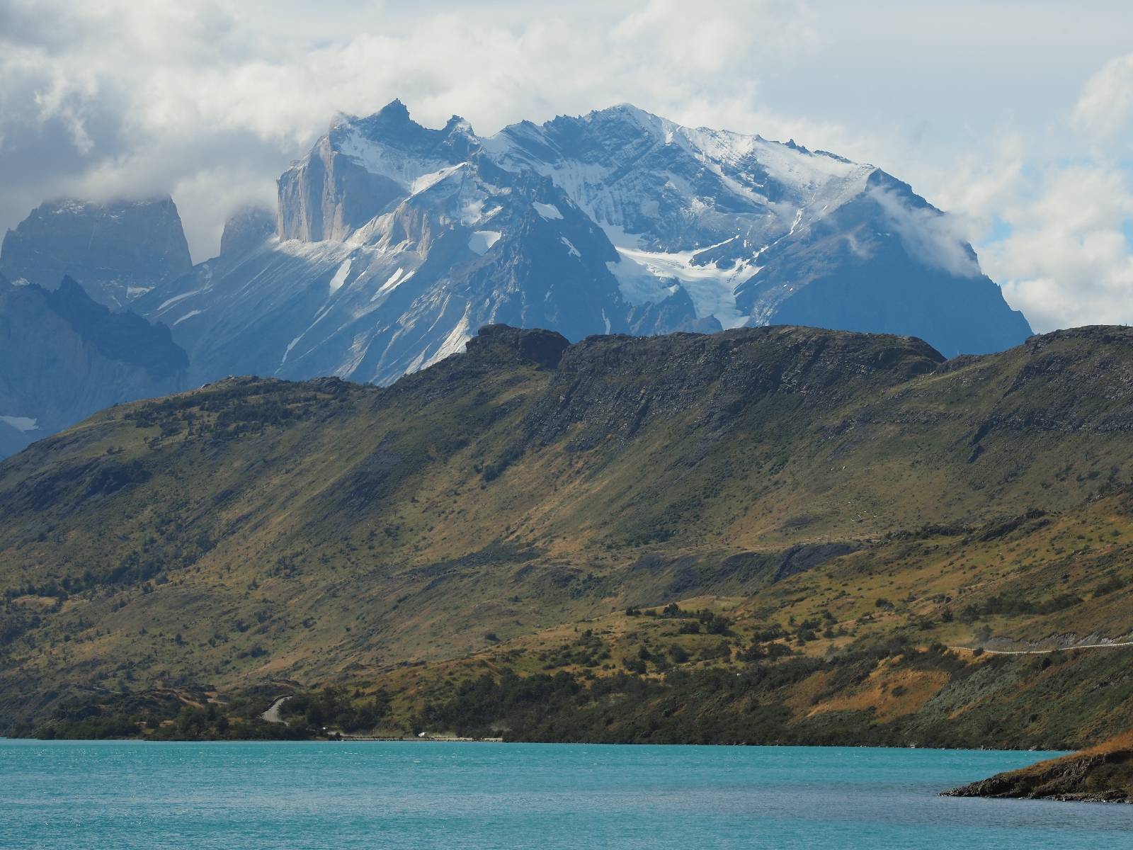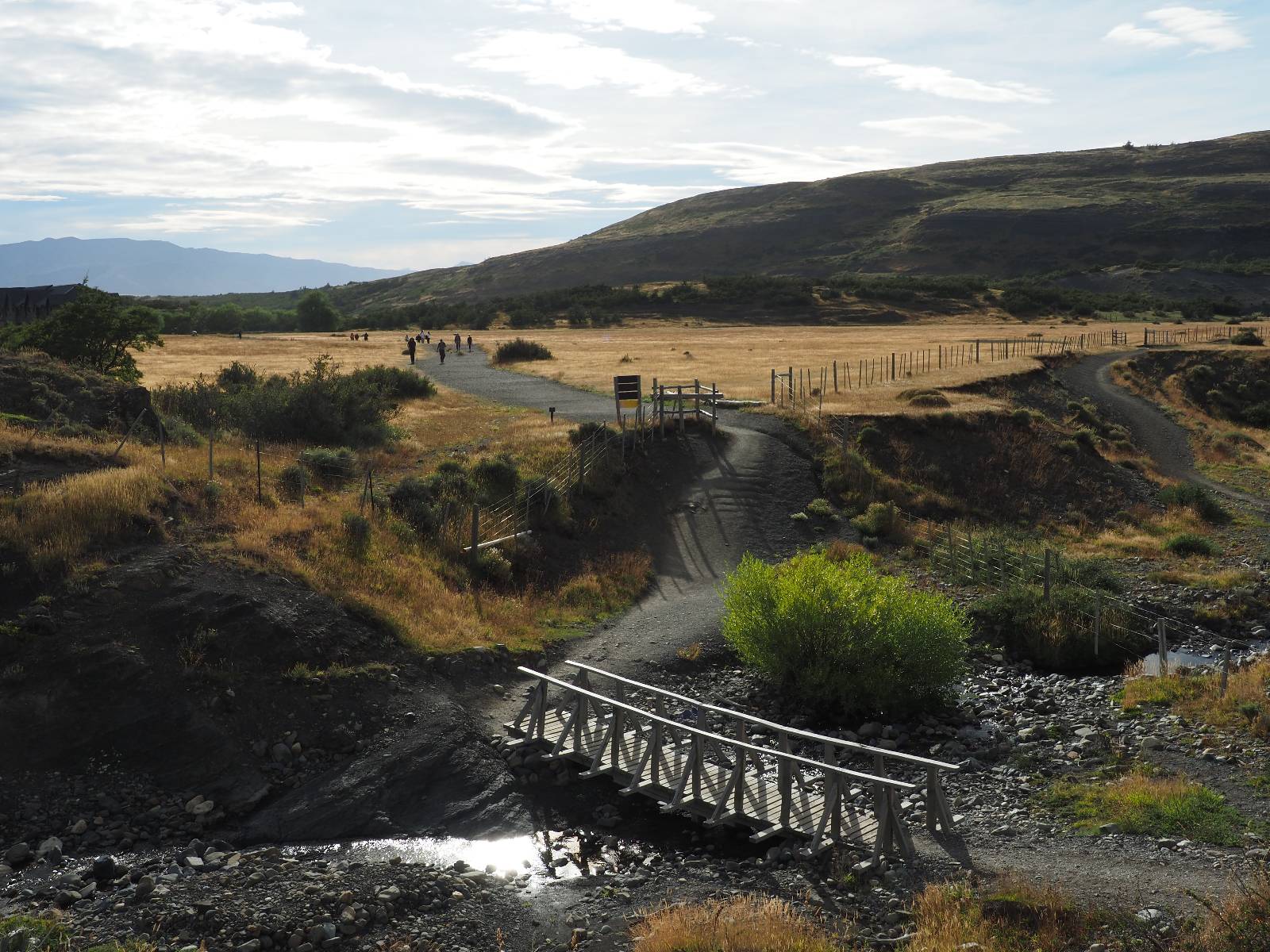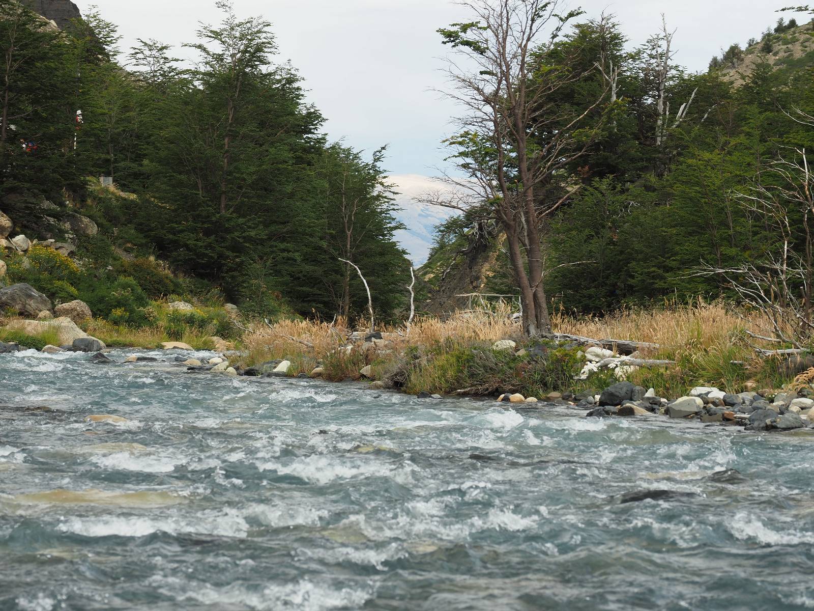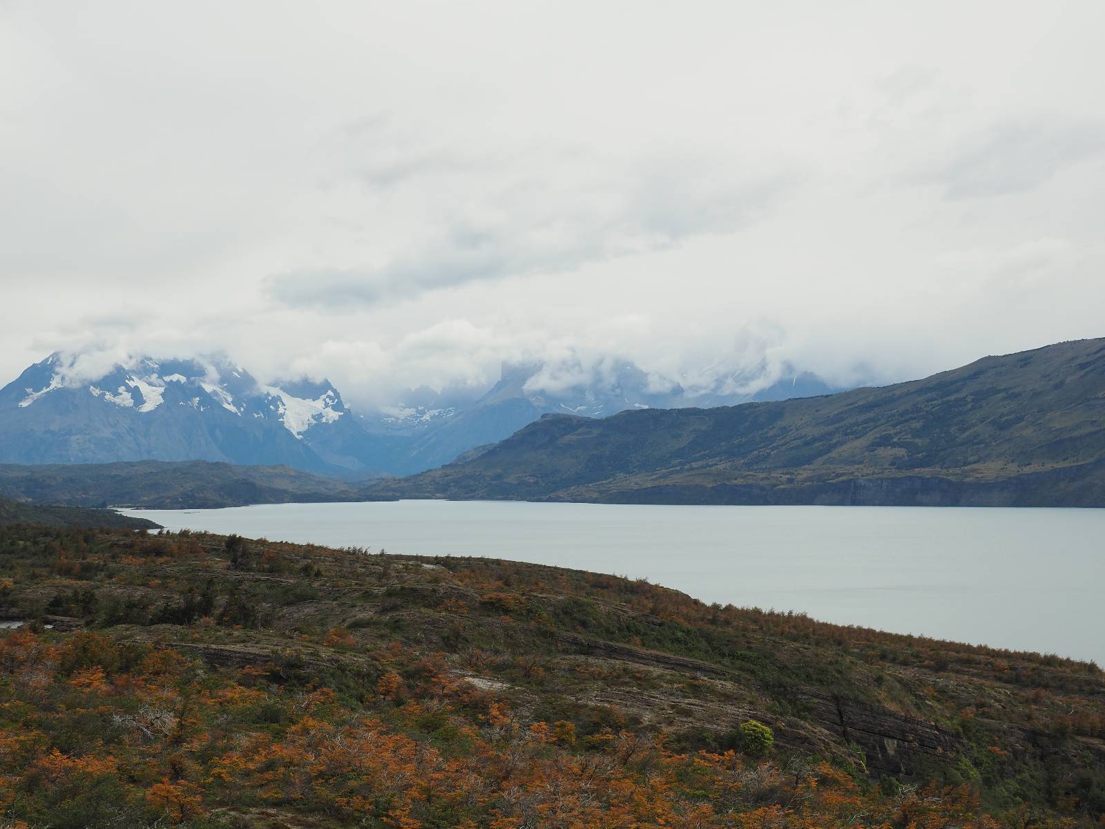 Tags drauf reise ich ab. Die Tour steckt noch etwas in den Oberschenkeln und der Wetterbericht sag so lala aber das Zimmer verlängern ging nicht mehr. Ich hatte mitbekommen, dass das Ticket vom Park drei Tage Gültigkeit hat und so will ich je nachdem, wie sich das Wetter nun entwickelt einmal von der anderen Seite aus durch den Park fahren oder vielleicht sogar eine Nacht drin verbringen. Ich begebe mich in die Spur, die mich am Milodon vorbei an den anderen Parkeingang führt. Ich darf mit meinem Ticket passieren und erfreue mich am herrlichen Anblick der Felsenformationen von der anderen Seite. Mir kommt es heute fast viel schöner vor, obwohl ich den Torres selber fast nicht sehe. Mein erstes Ziel im Park ist eine kleine fast Insel auf die man Laufen kann und von der aus man auf den weit dahinter liegenden Gletscher schauen kann. Ich lasse das Motorrad auf dem Parkplatz bei vielen anderen Ausflüglerautos und stiefle in voller Montur los. Das Wetter hat etwas aufgeklart und so mache ich mir vorerst keine Sorgen, dass es nass werden könnte. Über eine Art Strandstreifen stapfe ich zum Inselchen und dort vor bis zum Aussichtspunkt. Ok, ich kann den Gletscher sehen aber er ist wirklich noch weit weg!! Macht aber nichts! Die Sonne tut gut und macht warm und ich habe Zeit und kein sehr weites Ziel. Zumindest würde ich nur bis hinter den Park fahren und dort in dem kleinen Ort ein Bett für eine Nacht finden, sagt zumindest Google-Maps. Ich laufe zurück und mache Mittagspause im Restauran was direkat am Parkplatz liegt und überlege, wie ich nun weiterfahre. Der Tag ist nun doch schon etwas fortgeschritten aber vielleicht taugt ja der Campingplatz an dem ich einige Kilometer weiter vorbeikommen werde. Oder es ist auch wieder so etwas wie ich bereits gesehen habe, mit überteuerten Preisen.