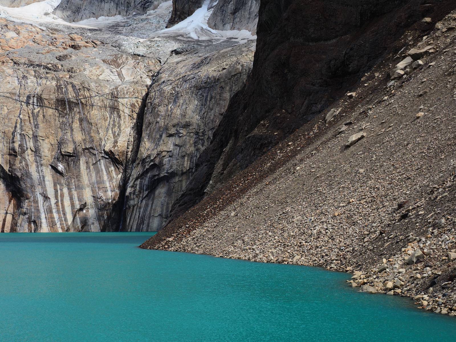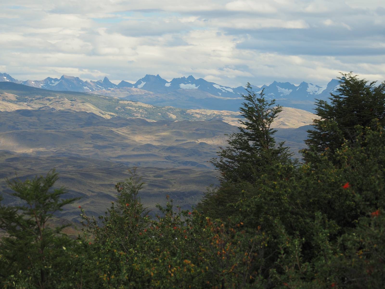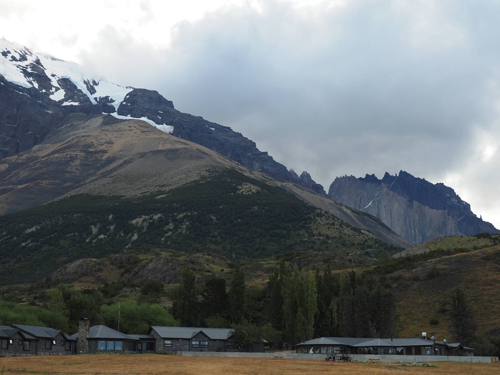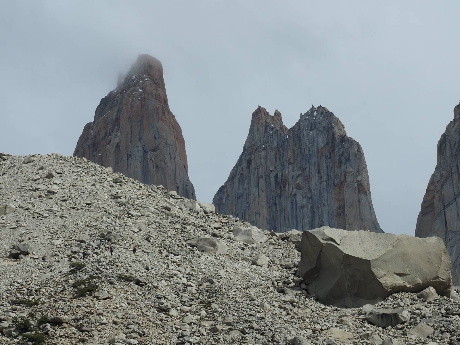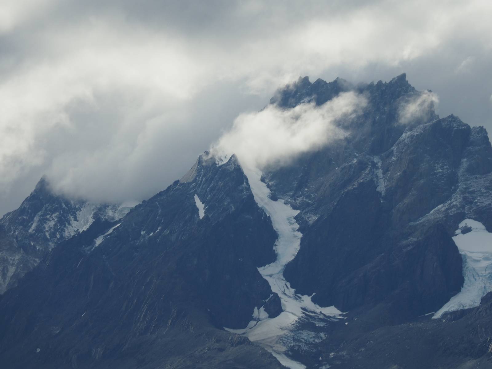 Tags drauf reise ich ab. Die Tour steckt noch etwas in den Oberschenkeln und der Wetterbericht sag so lala aber das Zimmer verlängern ging nicht mehr. Ich hatte mitbekommen, dass das Ticket vom Park drei Tage Gültigkeit hat und so will ich je nachdem, wie sich das Wetter nun entwickelt einmal von der anderen Seite aus durch den Park fahren oder vielleicht sogar eine Nacht drin verbringen. Ich begebe mich in die Spur, die mich am Milodon vorbei an den anderen Parkeingang führt. Ich darf mit meinem Ticket passieren und erfreue mich am herrlichen Anblick der Felsenformationen von der anderen Seite. Mir kommt es heute fast viel schöner vor, obwohl ich den Torres selber fast nicht sehe. Mein erstes Ziel im Park ist eine kleine fast Insel auf die man Laufen kann und von der aus man auf den weit dahinter liegenden Gletscher schauen kann. Ich lasse das Motorrad auf dem Parkplatz bei vielen anderen Ausflüglerautos und stiefle in voller Montur los. Das Wetter hat etwas aufgeklart und so mache ich mir vorerst keine Sorgen, dass es nass werden könnte. Über eine Art Strandstreifen stapfe ich zum Inselchen und dort vor bis zum Aussichtspunkt. Ok, ich kann den Gletscher sehen aber er ist wirklich noch weit weg!! Macht aber nichts! Die Sonne tut gut und macht warm und ich habe Zeit und kein sehr weites Ziel. Zumindest würde ich nur bis hinter den Park fahren und dort in dem kleinen Ort ein Bett für eine Nacht finden, sagt zumindest Google-Maps. Ich laufe zurück und mache Mittagspause im Restauran was direkat am Parkplatz liegt und überlege, wie ich nun weiterfahre. Der Tag ist nun doch schon etwas fortgeschritten aber vielleicht taugt ja der Campingplatz an dem ich einige Kilometer weiter vorbeikommen werde. Oder es ist auch wieder so etwas wie ich bereits gesehen habe, mit überteuerten Preisen.