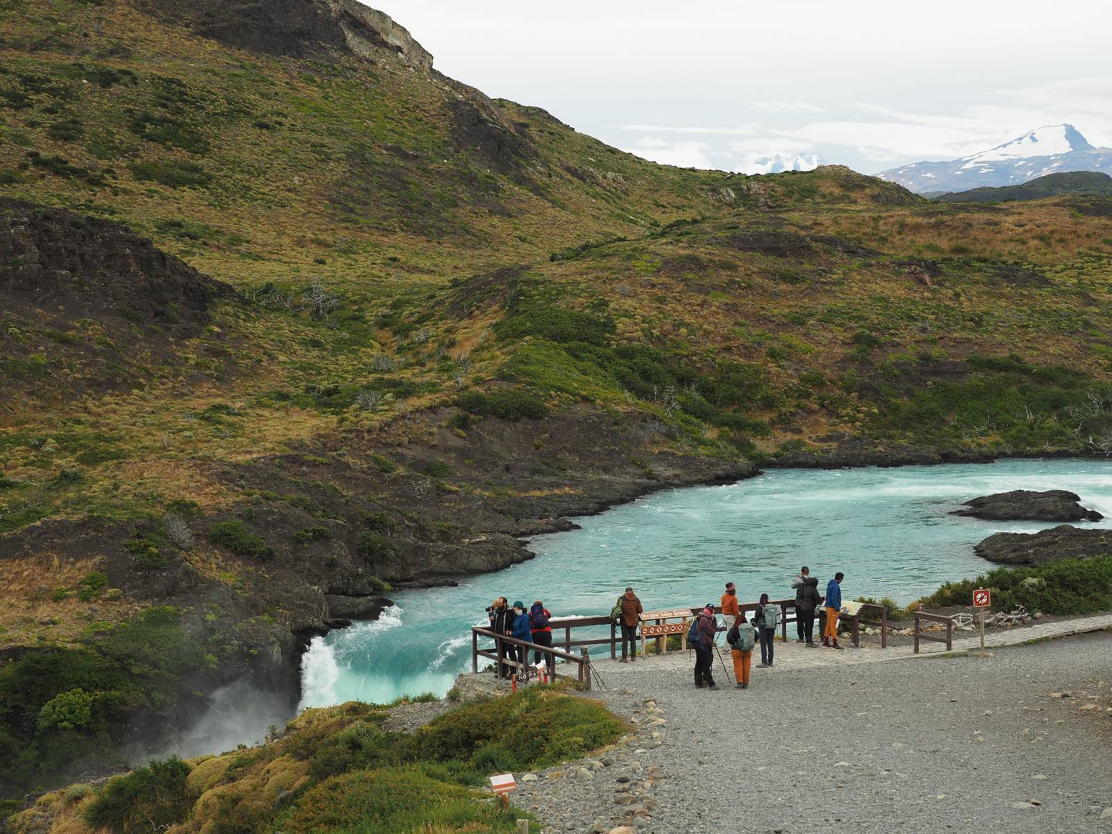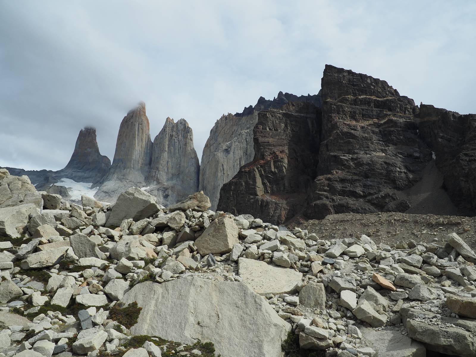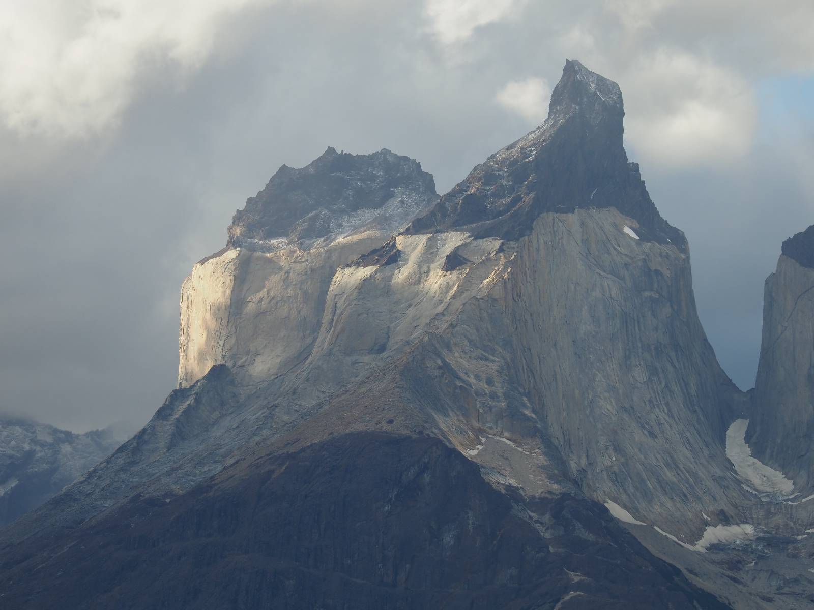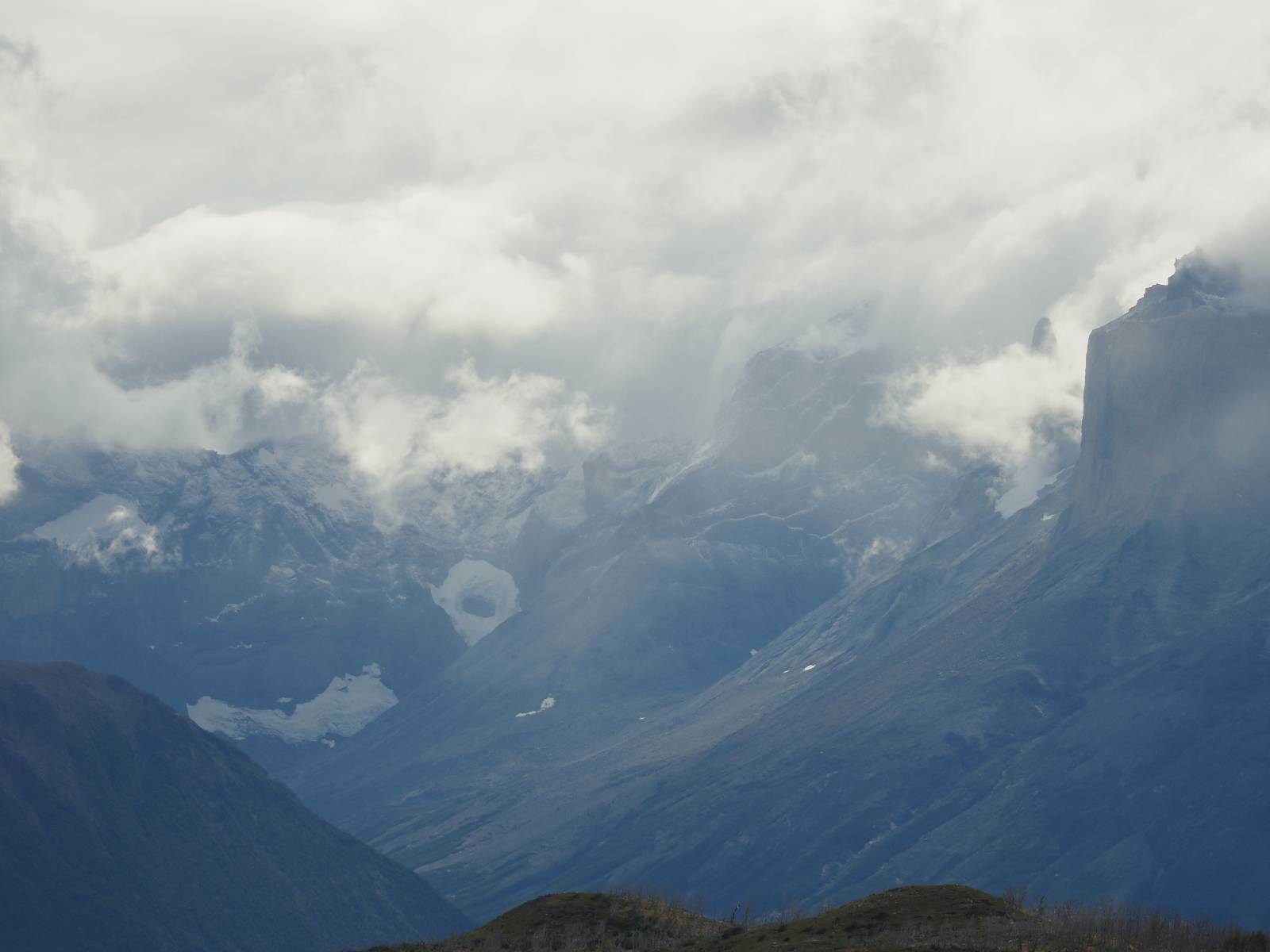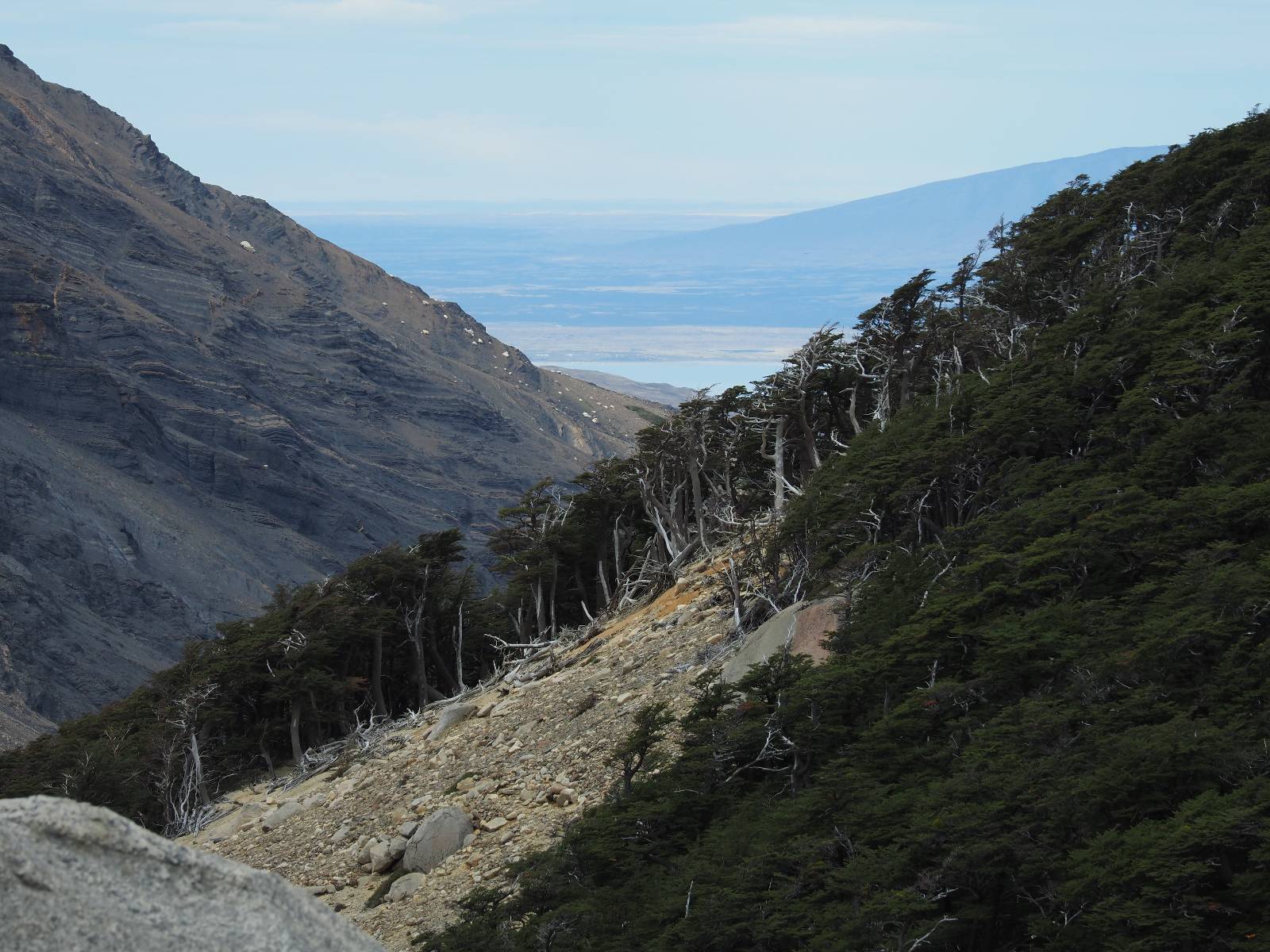 Tags drauf reise ich ab. Die Tour steckt noch etwas in den Oberschenkeln und der Wetterbericht sag so lala aber das Zimmer verlängern ging nicht mehr. Ich hatte mitbekommen, dass das Ticket vom Park drei Tage Gültigkeit hat und so will ich je nachdem, wie sich das Wetter nun entwickelt einmal von der anderen Seite aus durch den Park fahren oder vielleicht sogar eine Nacht drin verbringen. Ich begebe mich in die Spur, die mich am Milodon vorbei an den anderen Parkeingang führt. Ich darf mit meinem Ticket passieren und erfreue mich am herrlichen Anblick der Felsenformationen von der anderen Seite. Mir kommt es heute fast viel schöner vor, obwohl ich den Torres selber fast nicht sehe. Mein erstes Ziel im Park ist eine kleine fast Insel auf die man Laufen kann und von der aus man auf den weit dahinter liegenden Gletscher schauen kann. Ich lasse das Motorrad auf dem Parkplatz bei vielen anderen Ausflüglerautos und stiefle in voller Montur los. Das Wetter hat etwas aufgeklart und so mache ich mir vorerst keine Sorgen, dass es nass werden könnte. Über eine Art Strandstreifen stapfe ich zum Inselchen und dort vor bis zum Aussichtspunkt. Ok, ich kann den Gletscher sehen aber er ist wirklich noch weit weg!! Macht aber nichts! Die Sonne tut gut und macht warm und ich habe Zeit und kein sehr weites Ziel. Zumindest würde ich nur bis hinter den Park fahren und dort in dem kleinen Ort ein Bett für eine Nacht finden, sagt zumindest Google-Maps. Ich laufe zurück und mache Mittagspause im Restauran was direkat am Parkplatz liegt und überlege, wie ich nun weiterfahre. Der Tag ist nun doch schon etwas fortgeschritten aber vielleicht taugt ja der Campingplatz an dem ich einige Kilometer weiter vorbeikommen werde. Oder es ist auch wieder so etwas wie ich bereits gesehen habe, mit überteuerten Preisen.