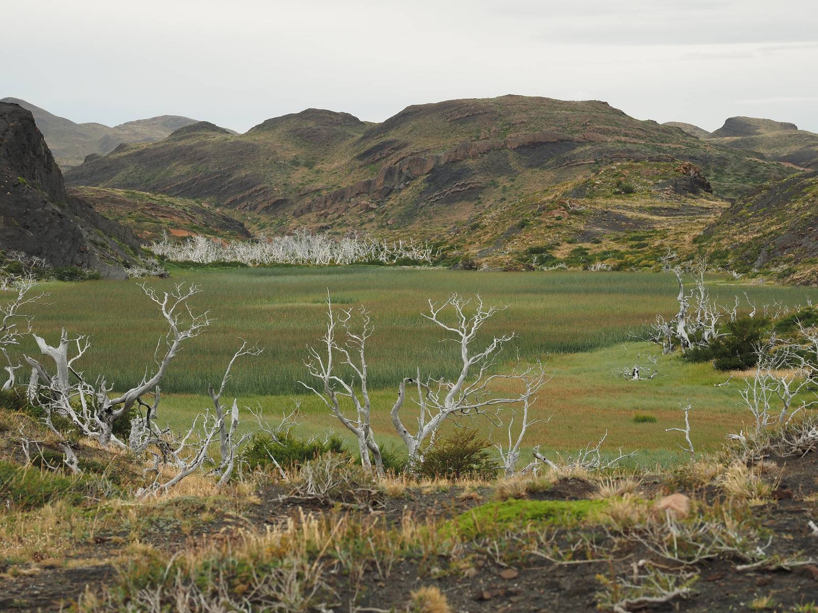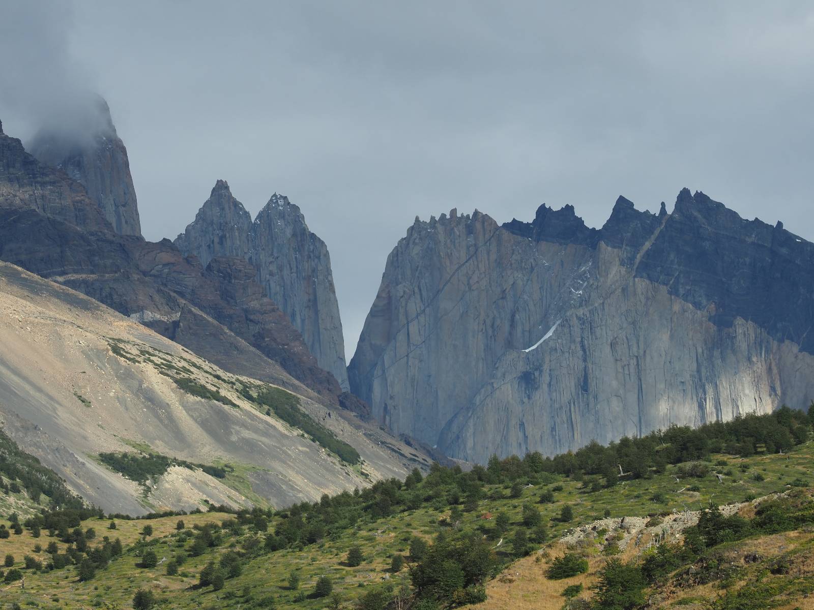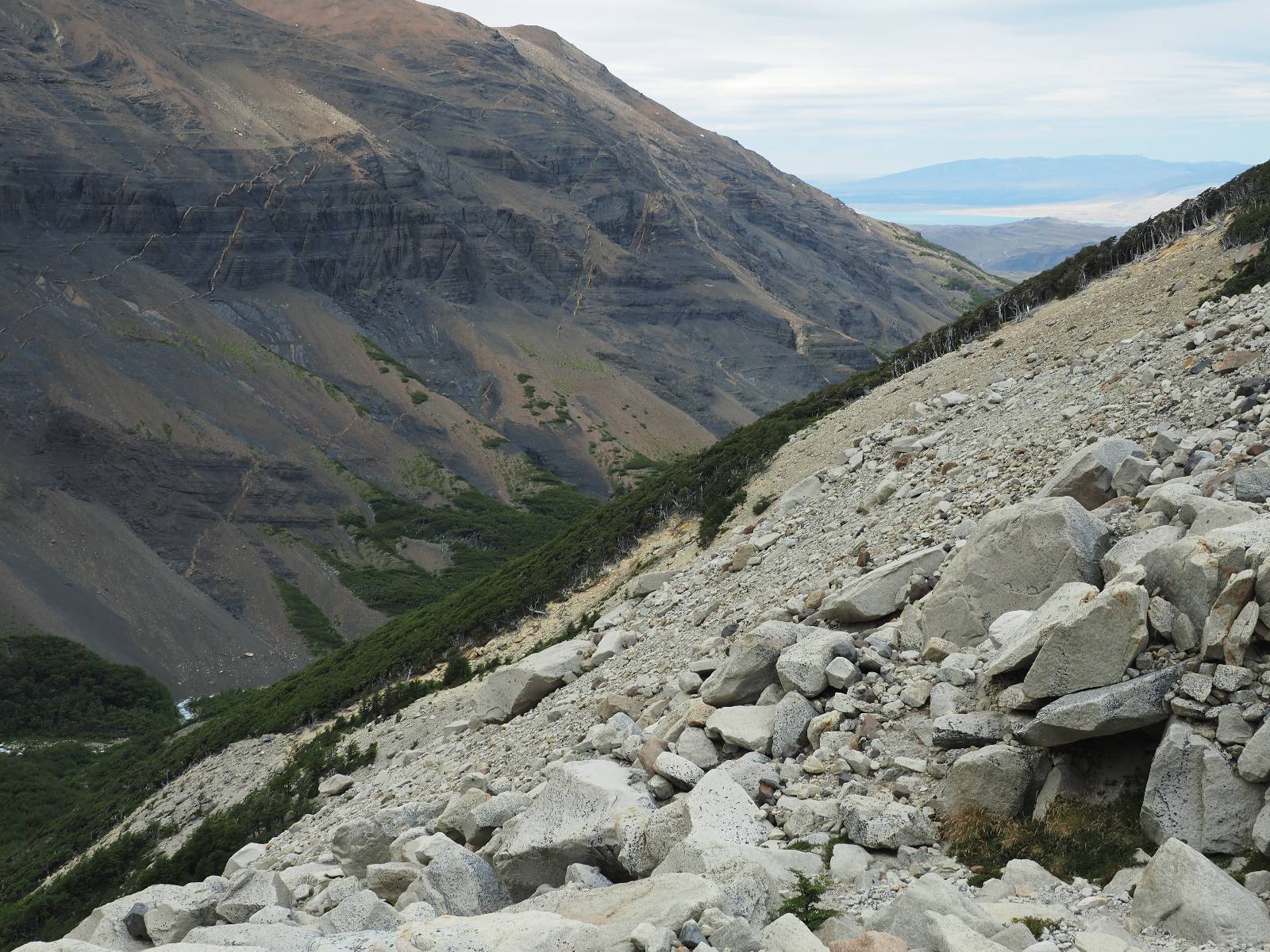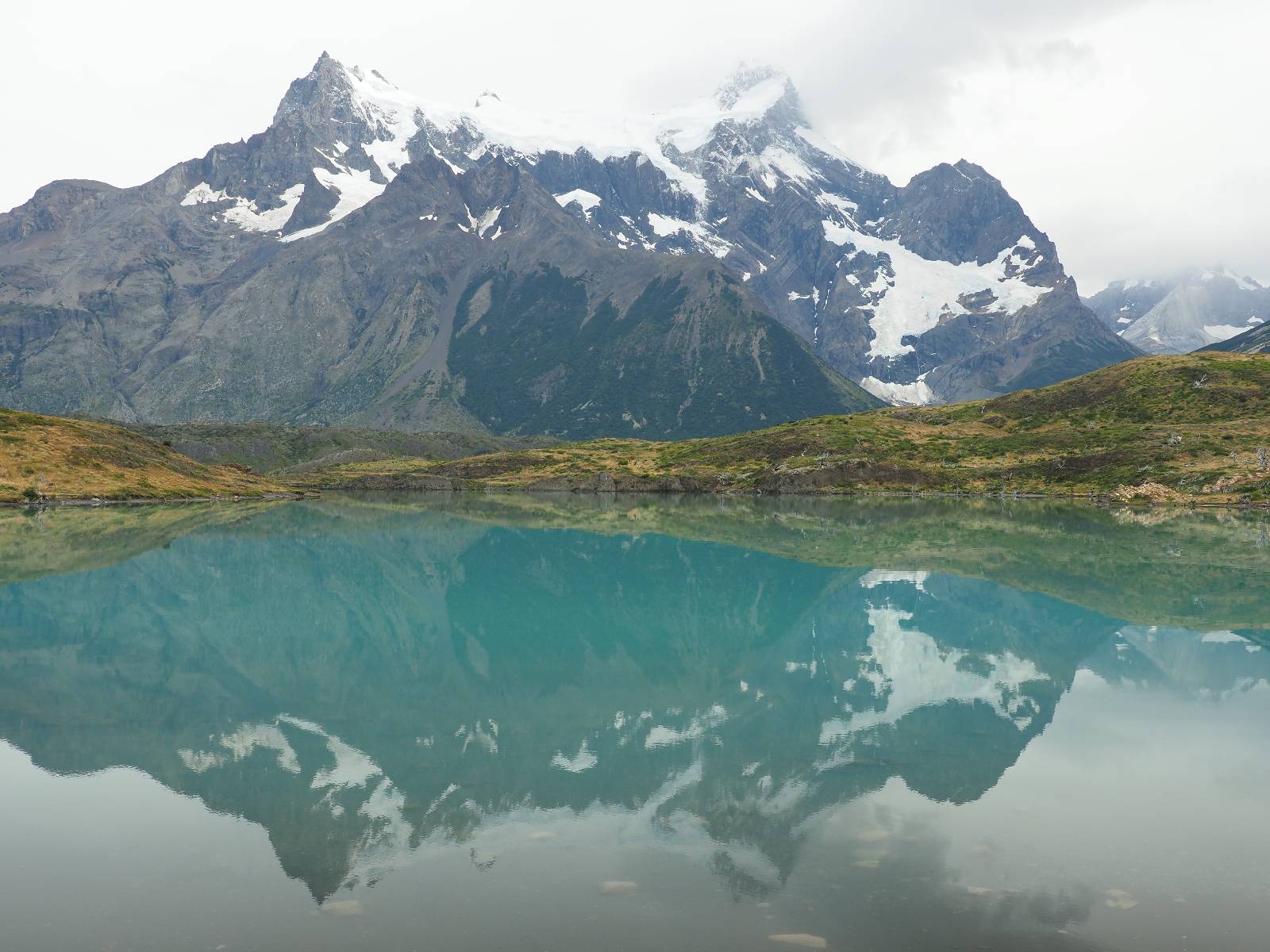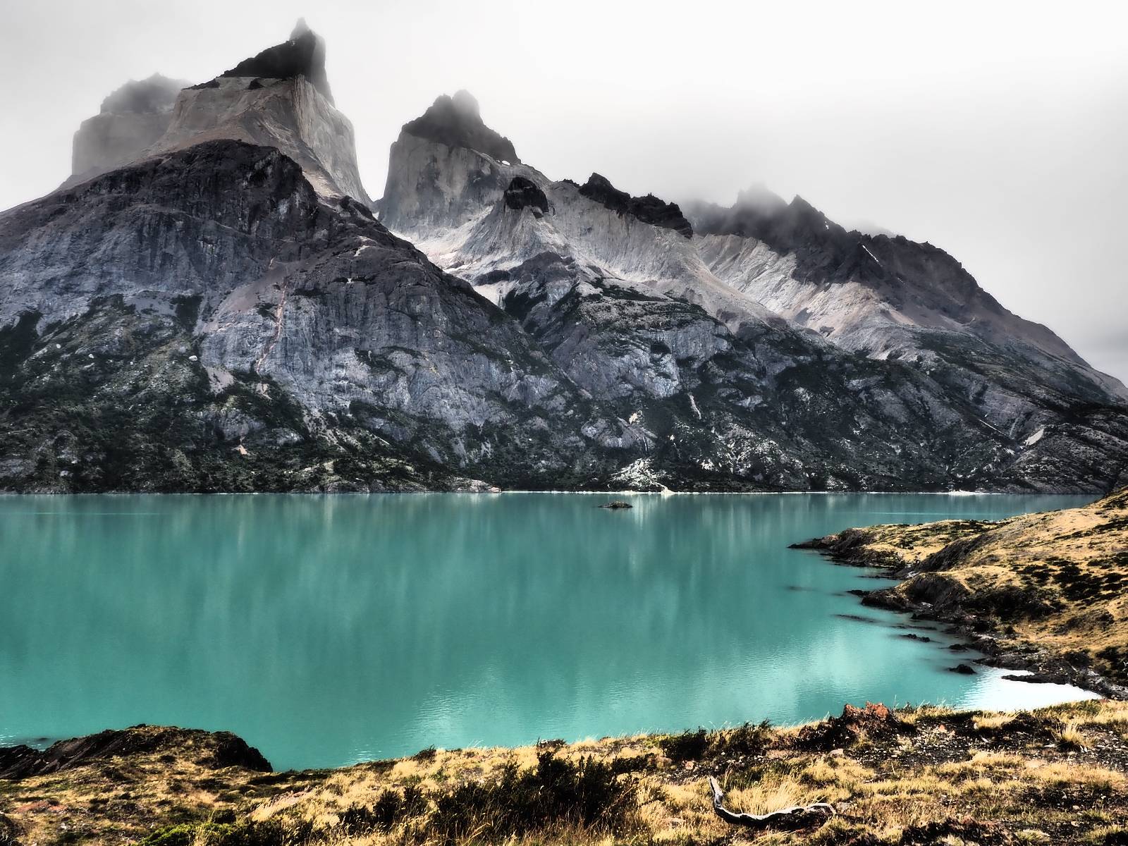 Tags drauf reise ich ab. Die Tour steckt noch etwas in den Oberschenkeln und der Wetterbericht sag so lala aber das Zimmer verlängern ging nicht mehr. Ich hatte mitbekommen, dass das Ticket vom Park drei Tage Gültigkeit hat und so will ich je nachdem, wie sich das Wetter nun entwickelt einmal von der anderen Seite aus durch den Park fahren oder vielleicht sogar eine Nacht drin verbringen. Ich begebe mich in die Spur, die mich am Milodon vorbei an den anderen Parkeingang führt. Ich darf mit meinem Ticket passieren und erfreue mich am herrlichen Anblick der Felsenformationen von der anderen Seite. Mir kommt es heute fast viel schöner vor, obwohl ich den Torres selber fast nicht sehe. Mein erstes Ziel im Park ist eine kleine fast Insel auf die man Laufen kann und von der aus man auf den weit dahinter liegenden Gletscher schauen kann. Ich lasse das Motorrad auf dem Parkplatz bei vielen anderen Ausflüglerautos und stiefle in voller Montur los. Das Wetter hat etwas aufgeklart und so mache ich mir vorerst keine Sorgen, dass es nass werden könnte. Über eine Art Strandstreifen stapfe ich zum Inselchen und dort vor bis zum Aussichtspunkt. Ok, ich kann den Gletscher sehen aber er ist wirklich noch weit weg!! Macht aber nichts! Die Sonne tut gut und macht warm und ich habe Zeit und kein sehr weites Ziel. Zumindest würde ich nur bis hinter den Park fahren und dort in dem kleinen Ort ein Bett für eine Nacht finden, sagt zumindest Google-Maps. Ich laufe zurück und mache Mittagspause im Restauran was direkat am Parkplatz liegt und überlege, wie ich nun weiterfahre. Der Tag ist nun doch schon etwas fortgeschritten aber vielleicht taugt ja der Campingplatz an dem ich einige Kilometer weiter vorbeikommen werde. Oder es ist auch wieder so etwas wie ich bereits gesehen habe, mit überteuerten Preisen.
