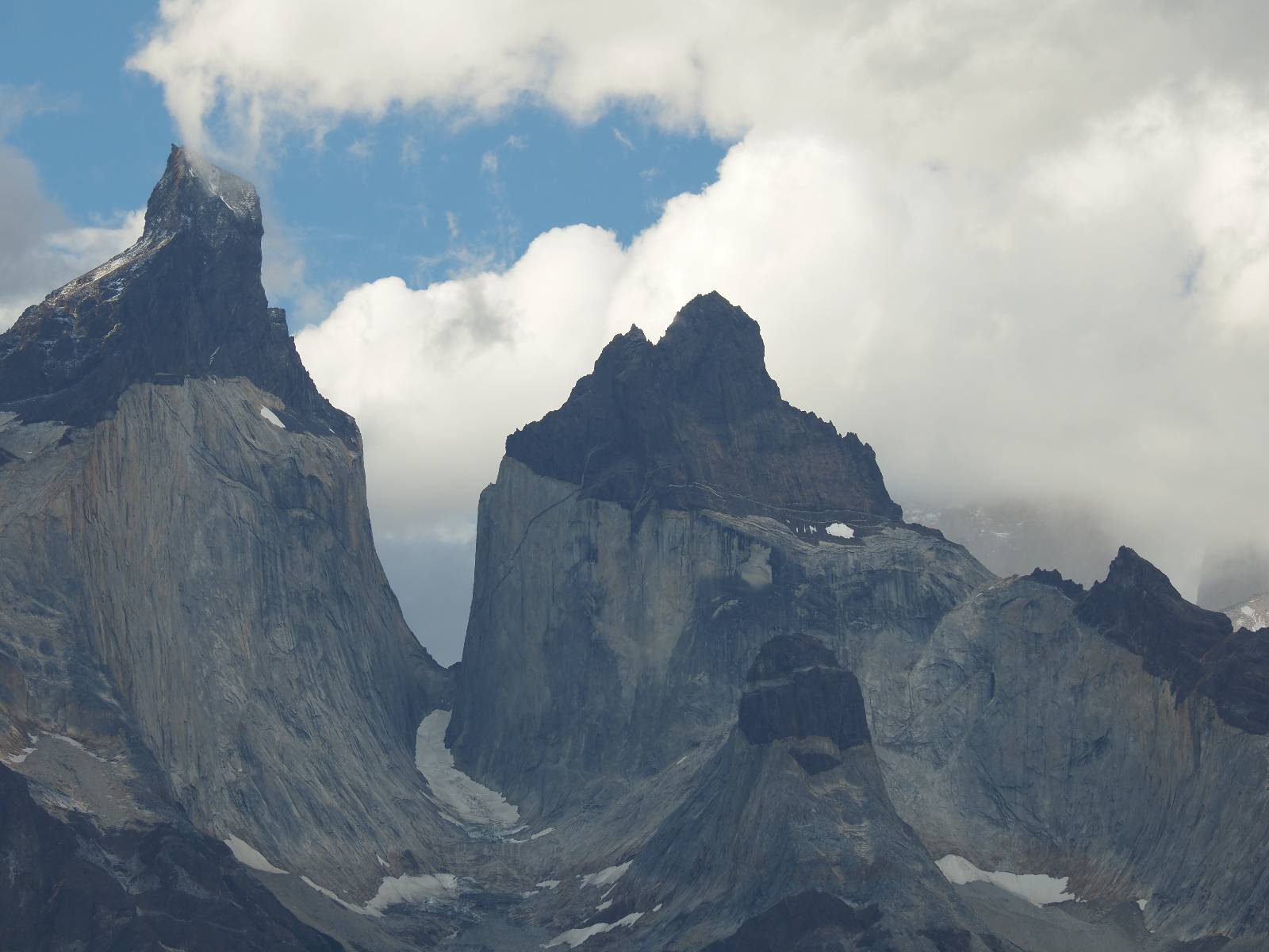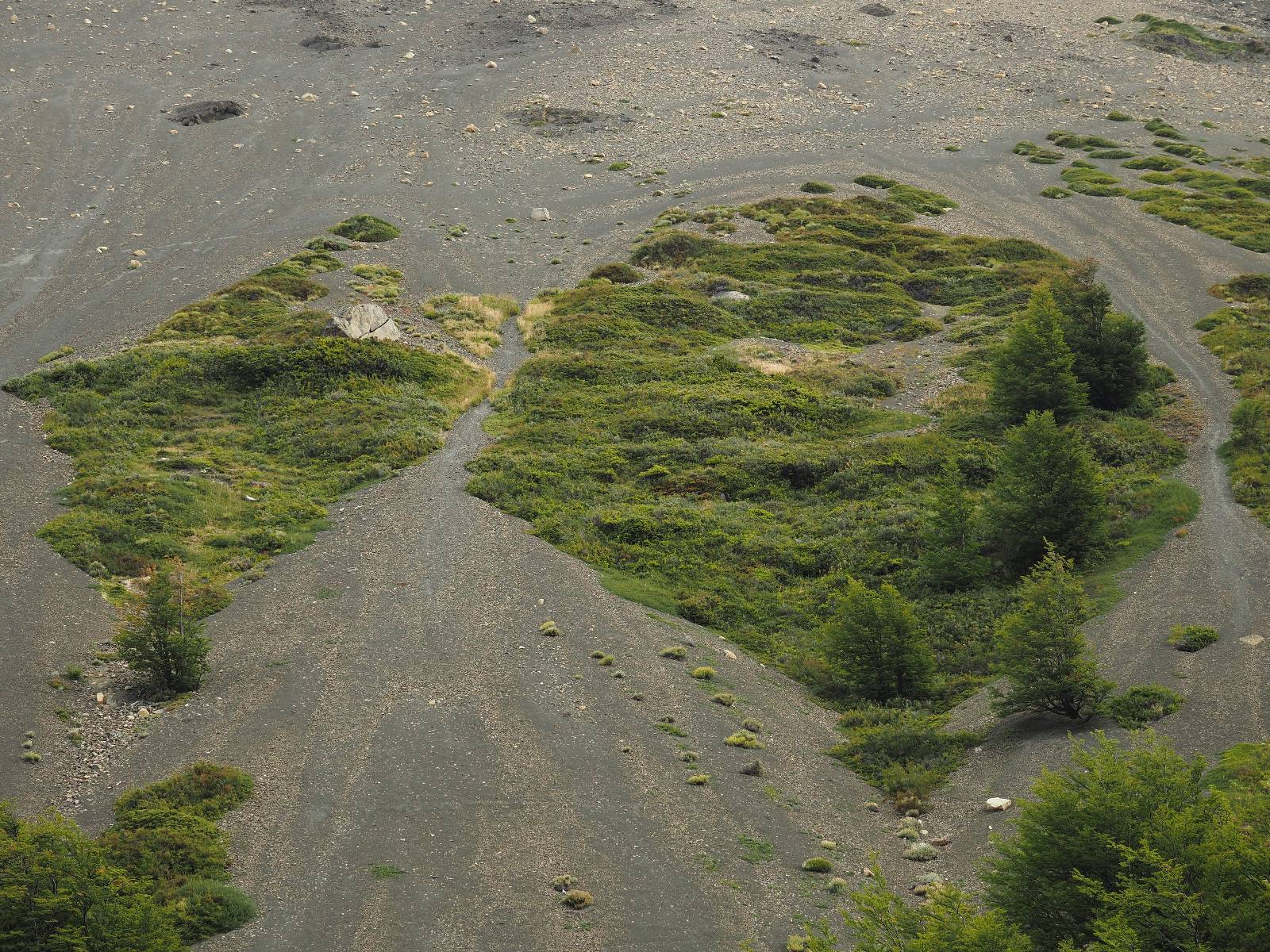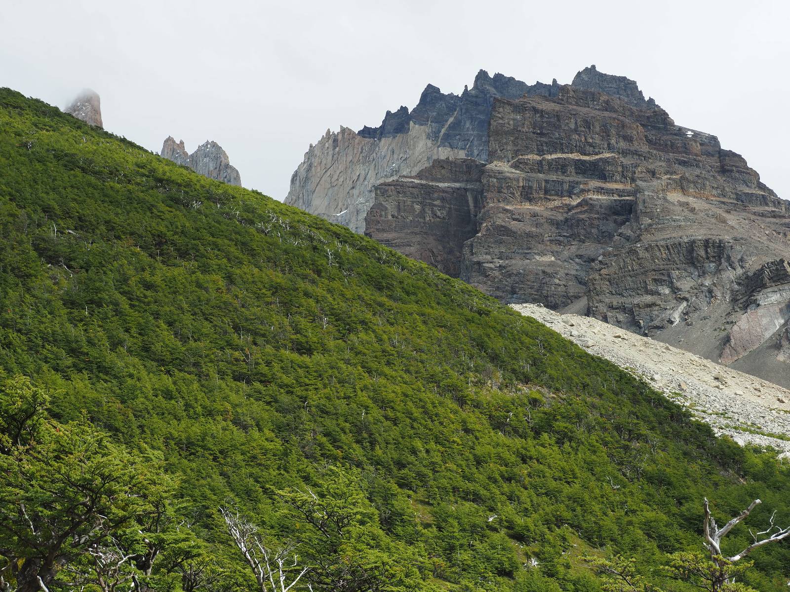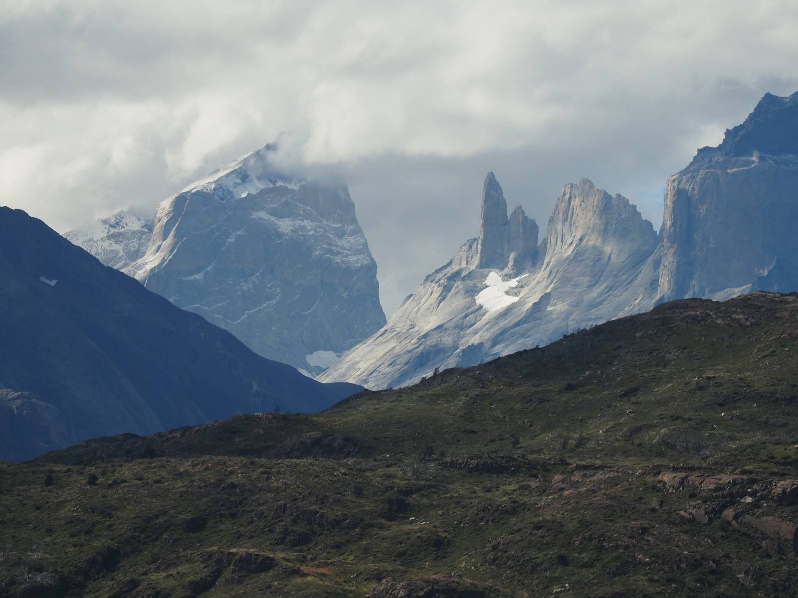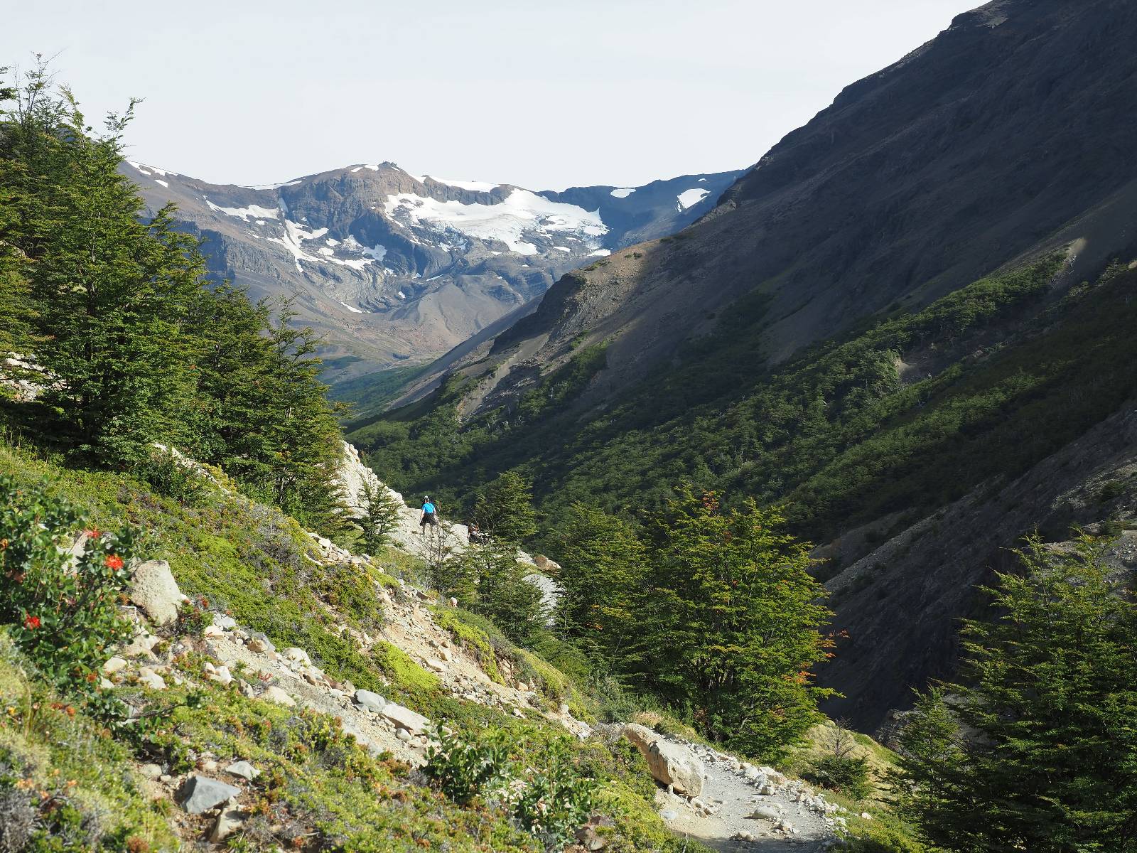 Tags drauf reise ich ab. Die Tour steckt noch etwas in den Oberschenkeln und der Wetterbericht sag so lala aber das Zimmer verlängern ging nicht mehr. Ich hatte mitbekommen, dass das Ticket vom Park drei Tage Gültigkeit hat und so will ich je nachdem, wie sich das Wetter nun entwickelt einmal von der anderen Seite aus durch den Park fahren oder vielleicht sogar eine Nacht drin verbringen. Ich begebe mich in die Spur, die mich am Milodon vorbei an den anderen Parkeingang führt. Ich darf mit meinem Ticket passieren und erfreue mich am herrlichen Anblick der Felsenformationen von der anderen Seite. Mir kommt es heute fast viel schöner vor, obwohl ich den Torres selber fast nicht sehe. Mein erstes Ziel im Park ist eine kleine fast Insel auf die man Laufen kann und von der aus man auf den weit dahinter liegenden Gletscher schauen kann. Ich lasse das Motorrad auf dem Parkplatz bei vielen anderen Ausflüglerautos und stiefle in voller Montur los. Das Wetter hat etwas aufgeklart und so mache ich mir vorerst keine Sorgen, dass es nass werden könnte. Über eine Art Strandstreifen stapfe ich zum Inselchen und dort vor bis zum Aussichtspunkt. Ok, ich kann den Gletscher sehen aber er ist wirklich noch weit weg!! Macht aber nichts! Die Sonne tut gut und macht warm und ich habe Zeit und kein sehr weites Ziel. Zumindest würde ich nur bis hinter den Park fahren und dort in dem kleinen Ort ein Bett für eine Nacht finden, sagt zumindest Google-Maps. Ich laufe zurück und mache Mittagspause im Restauran was direkat am Parkplatz liegt und überlege, wie ich nun weiterfahre. Der Tag ist nun doch schon etwas fortgeschritten aber vielleicht taugt ja der Campingplatz an dem ich einige Kilometer weiter vorbeikommen werde. Oder es ist auch wieder so etwas wie ich bereits gesehen habe, mit überteuerten Preisen.