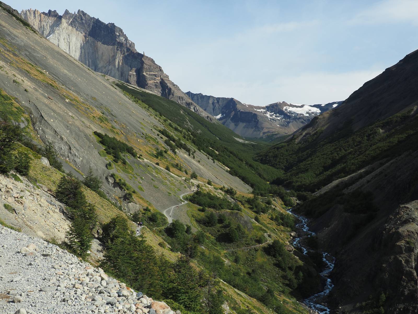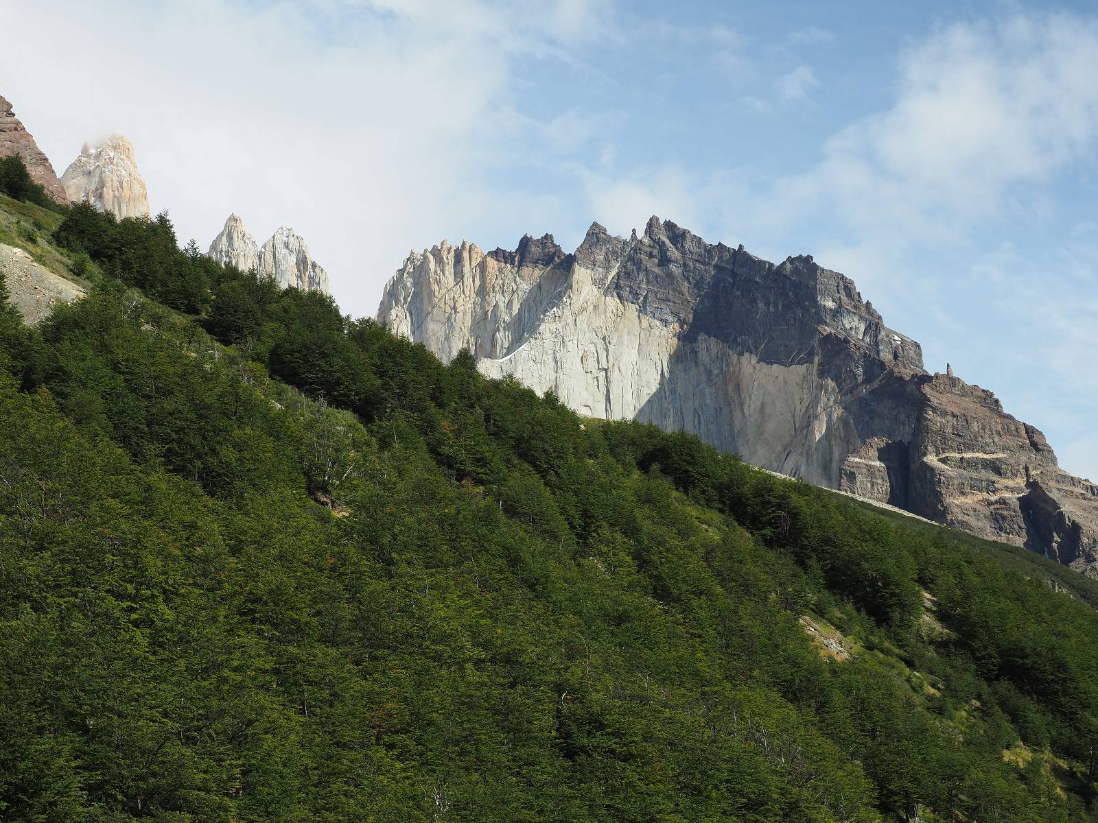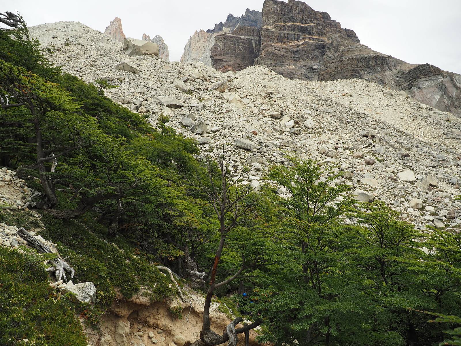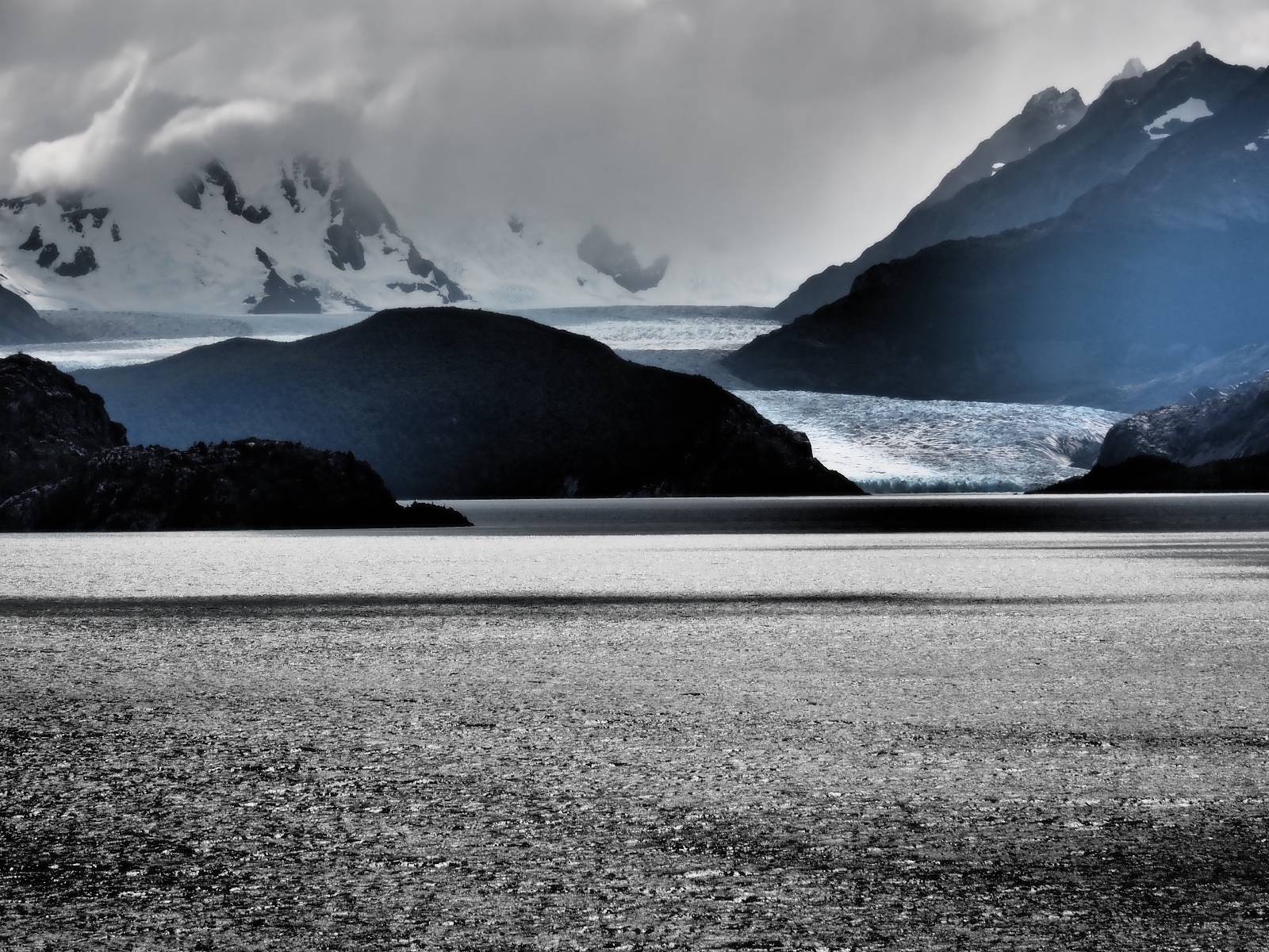 Tags drauf reise ich ab. Die Tour steckt noch etwas in den Oberschenkeln und der Wetterbericht sag so lala aber das Zimmer verlängern ging nicht mehr. Ich hatte mitbekommen, dass das Ticket vom Park drei Tage Gültigkeit hat und so will ich je nachdem, wie sich das Wetter nun entwickelt einmal von der anderen Seite aus durch den Park fahren oder vielleicht sogar eine Nacht drin verbringen. Ich begebe mich in die Spur, die mich am Milodon vorbei an den anderen Parkeingang führt. Ich darf mit meinem Ticket passieren und erfreue mich am herrlichen Anblick der Felsenformationen von der anderen Seite. Mir kommt es heute fast viel schöner vor, obwohl ich den Torres selber fast nicht sehe. Mein erstes Ziel im Park ist eine kleine fast Insel auf die man Laufen kann und von der aus man auf den weit dahinter liegenden Gletscher schauen kann. Ich lasse das Motorrad auf dem Parkplatz bei vielen anderen Ausflüglerautos und stiefle in voller Montur los. Das Wetter hat etwas aufgeklart und so mache ich mir vorerst keine Sorgen, dass es nass werden könnte. Über eine Art Strandstreifen stapfe ich zum Inselchen und dort vor bis zum Aussichtspunkt. Ok, ich kann den Gletscher sehen aber er ist wirklich noch weit weg!! Macht aber nichts! Die Sonne tut gut und macht warm und ich habe Zeit und kein sehr weites Ziel. Zumindest würde ich nur bis hinter den Park fahren und dort in dem kleinen Ort ein Bett für eine Nacht finden, sagt zumindest Google-Maps. Ich laufe zurück und mache Mittagspause im Restauran was direkat am Parkplatz liegt und überlege, wie ich nun weiterfahre. Der Tag ist nun doch schon etwas fortgeschritten aber vielleicht taugt ja der Campingplatz an dem ich einige Kilometer weiter vorbeikommen werde. Oder es ist auch wieder so etwas wie ich bereits gesehen habe, mit überteuerten Preisen.