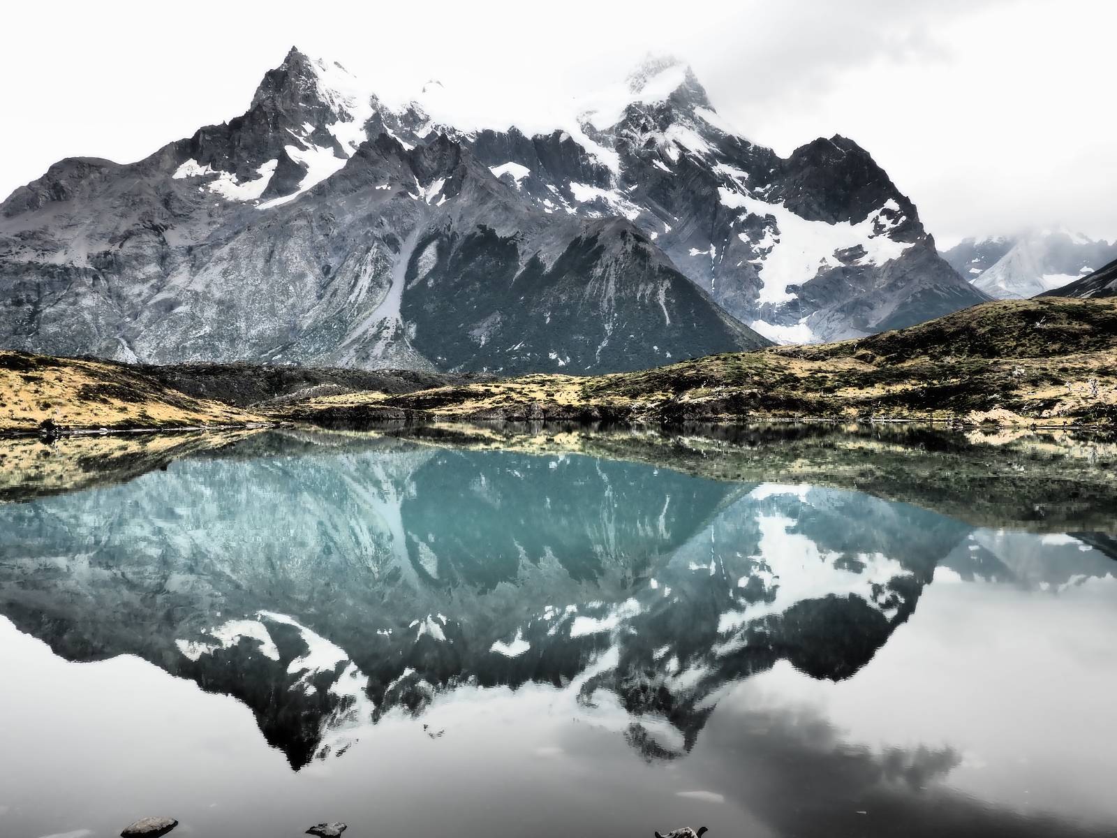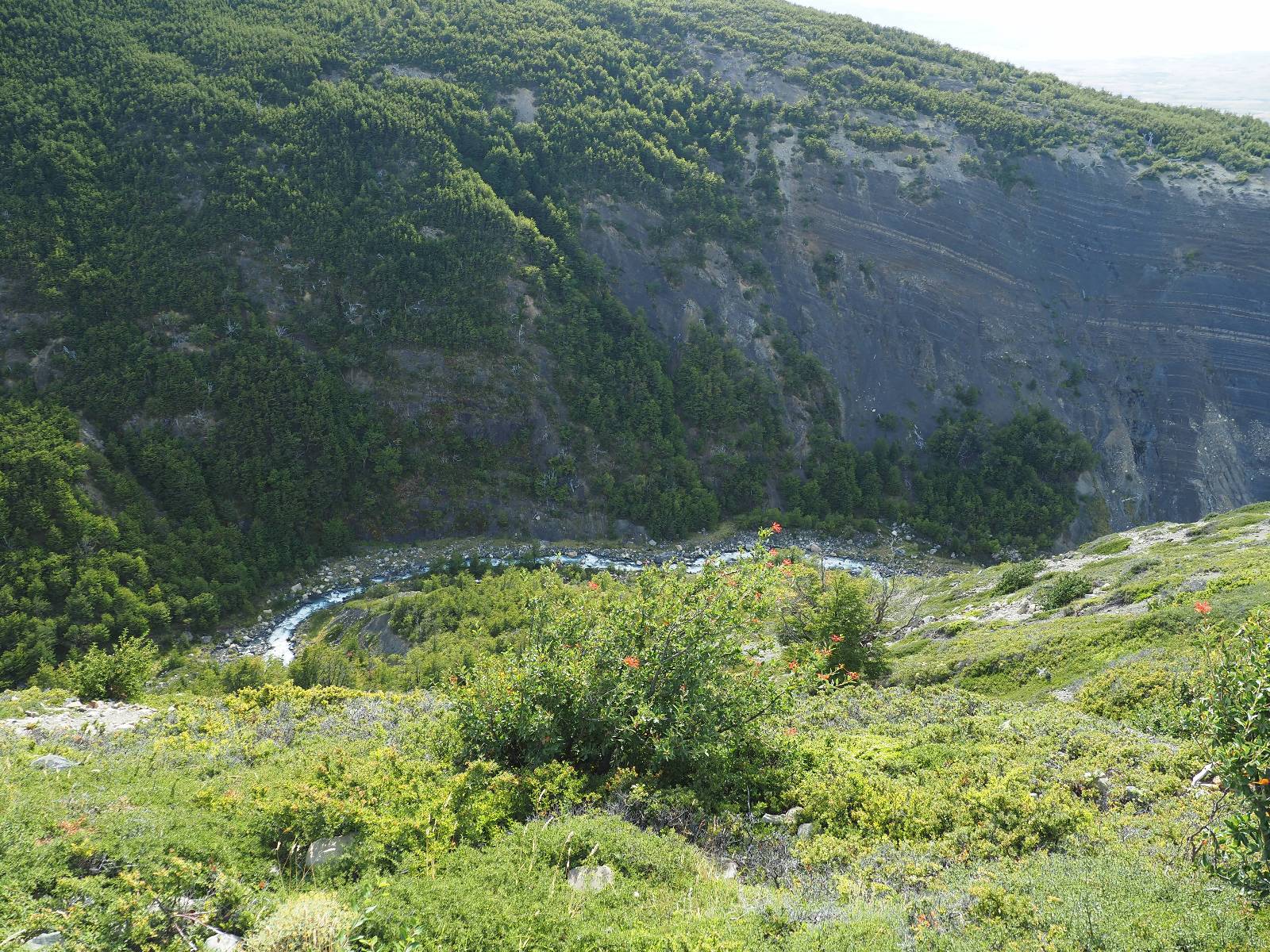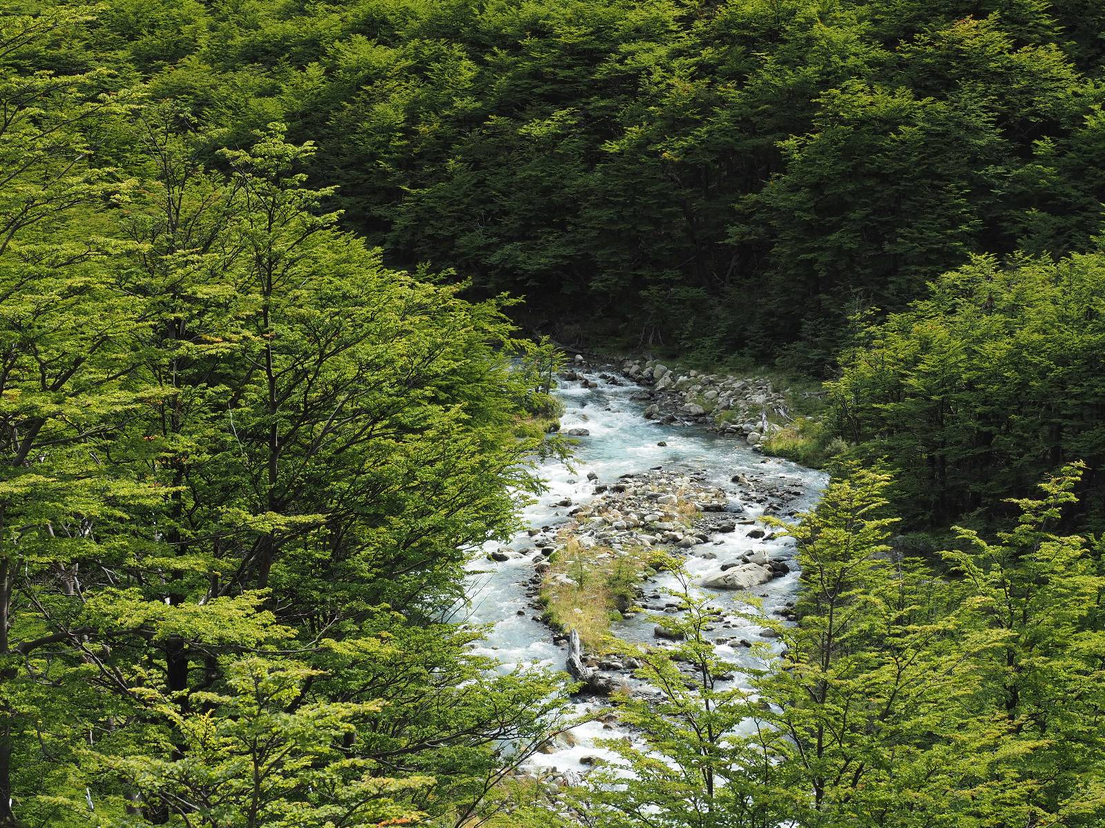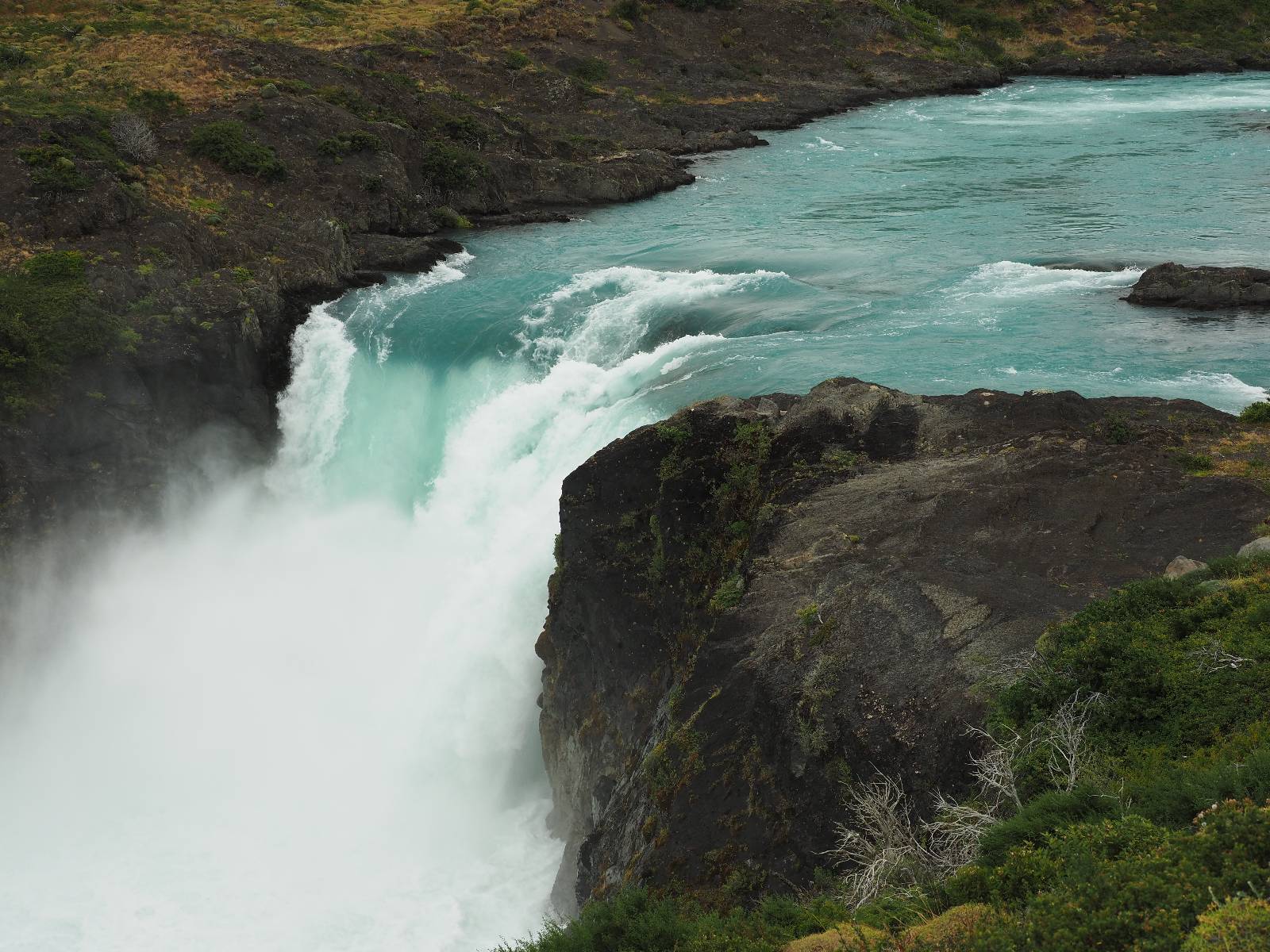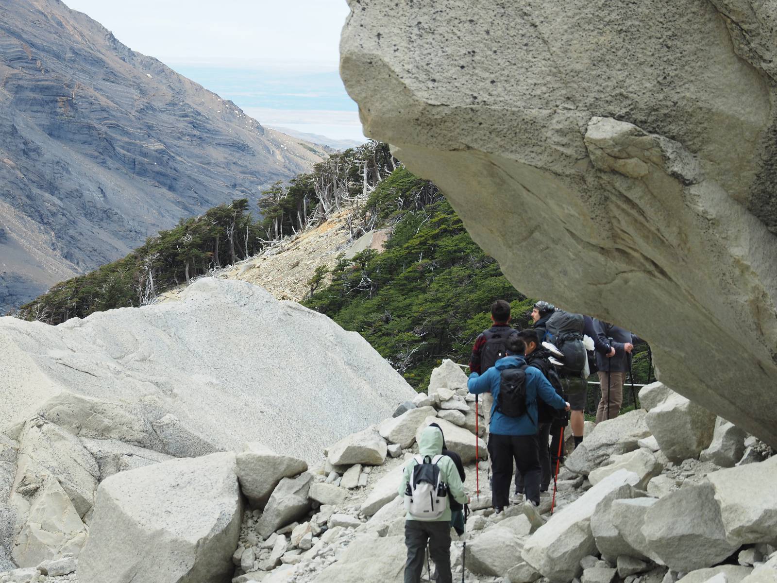 Tags drauf reise ich ab. Die Tour steckt noch etwas in den Oberschenkeln und der Wetterbericht sag so lala aber das Zimmer verlängern ging nicht mehr. Ich hatte mitbekommen, dass das Ticket vom Park drei Tage Gültigkeit hat und so will ich je nachdem, wie sich das Wetter nun entwickelt einmal von der anderen Seite aus durch den Park fahren oder vielleicht sogar eine Nacht drin verbringen. Ich begebe mich in die Spur, die mich am Milodon vorbei an den anderen Parkeingang führt. Ich darf mit meinem Ticket passieren und erfreue mich am herrlichen Anblick der Felsenformationen von der anderen Seite. Mir kommt es heute fast viel schöner vor, obwohl ich den Torres selber fast nicht sehe. Mein erstes Ziel im Park ist eine kleine fast Insel auf die man Laufen kann und von der aus man auf den weit dahinter liegenden Gletscher schauen kann. Ich lasse das Motorrad auf dem Parkplatz bei vielen anderen Ausflüglerautos und stiefle in voller Montur los. Das Wetter hat etwas aufgeklart und so mache ich mir vorerst keine Sorgen, dass es nass werden könnte. Über eine Art Strandstreifen stapfe ich zum Inselchen und dort vor bis zum Aussichtspunkt. Ok, ich kann den Gletscher sehen aber er ist wirklich noch weit weg!! Macht aber nichts! Die Sonne tut gut und macht warm und ich habe Zeit und kein sehr weites Ziel. Zumindest würde ich nur bis hinter den Park fahren und dort in dem kleinen Ort ein Bett für eine Nacht finden, sagt zumindest Google-Maps. Ich laufe zurück und mache Mittagspause im Restauran was direkat am Parkplatz liegt und überlege, wie ich nun weiterfahre. Der Tag ist nun doch schon etwas fortgeschritten aber vielleicht taugt ja der Campingplatz an dem ich einige Kilometer weiter vorbeikommen werde. Oder es ist auch wieder so etwas wie ich bereits gesehen habe, mit überteuerten Preisen.