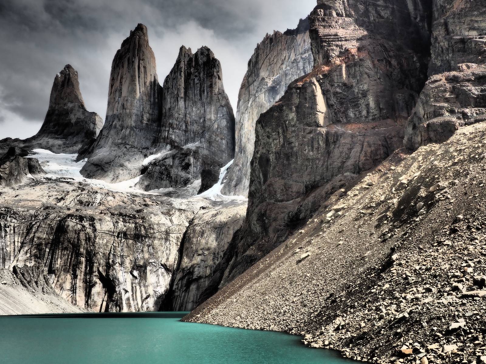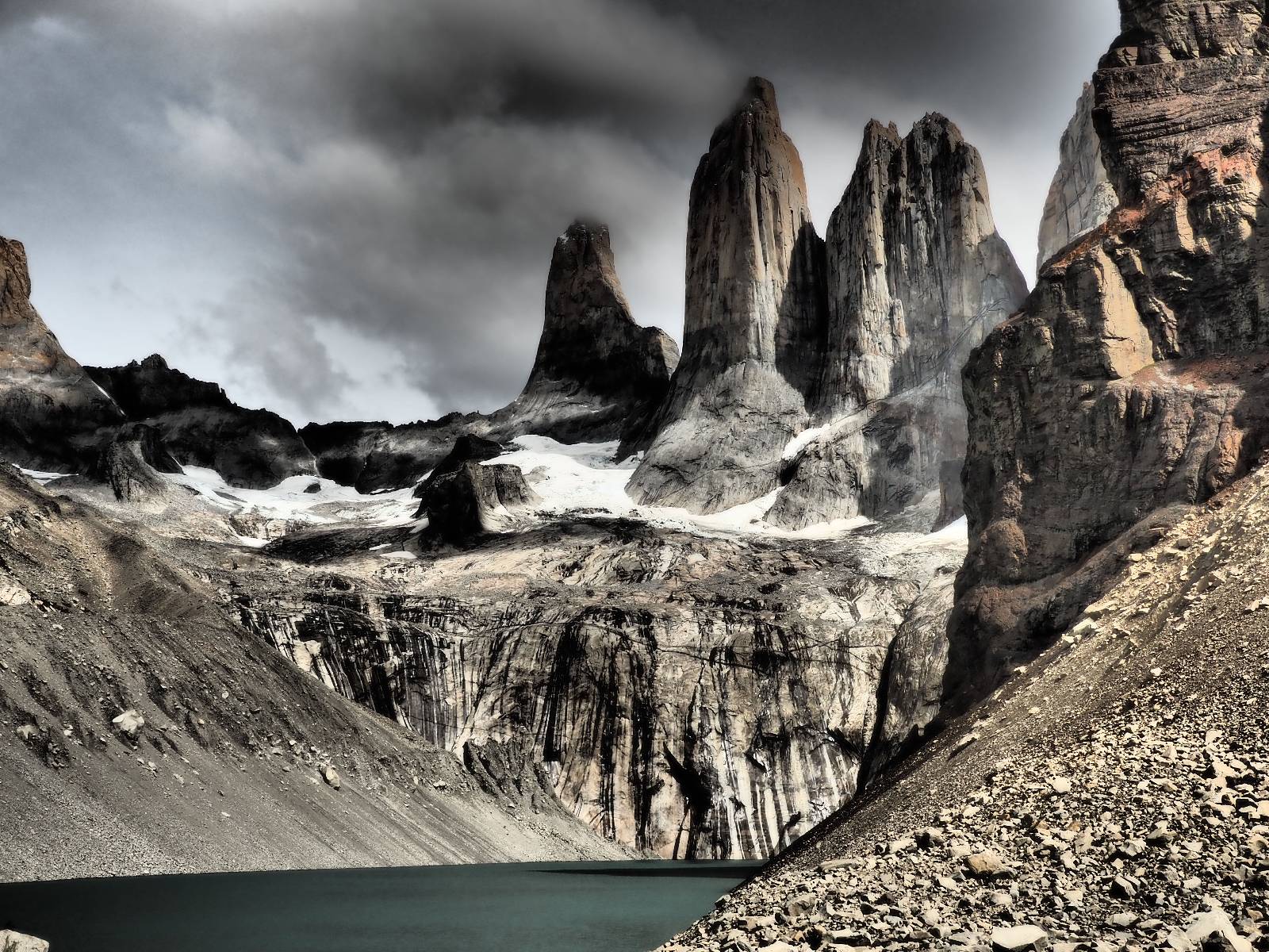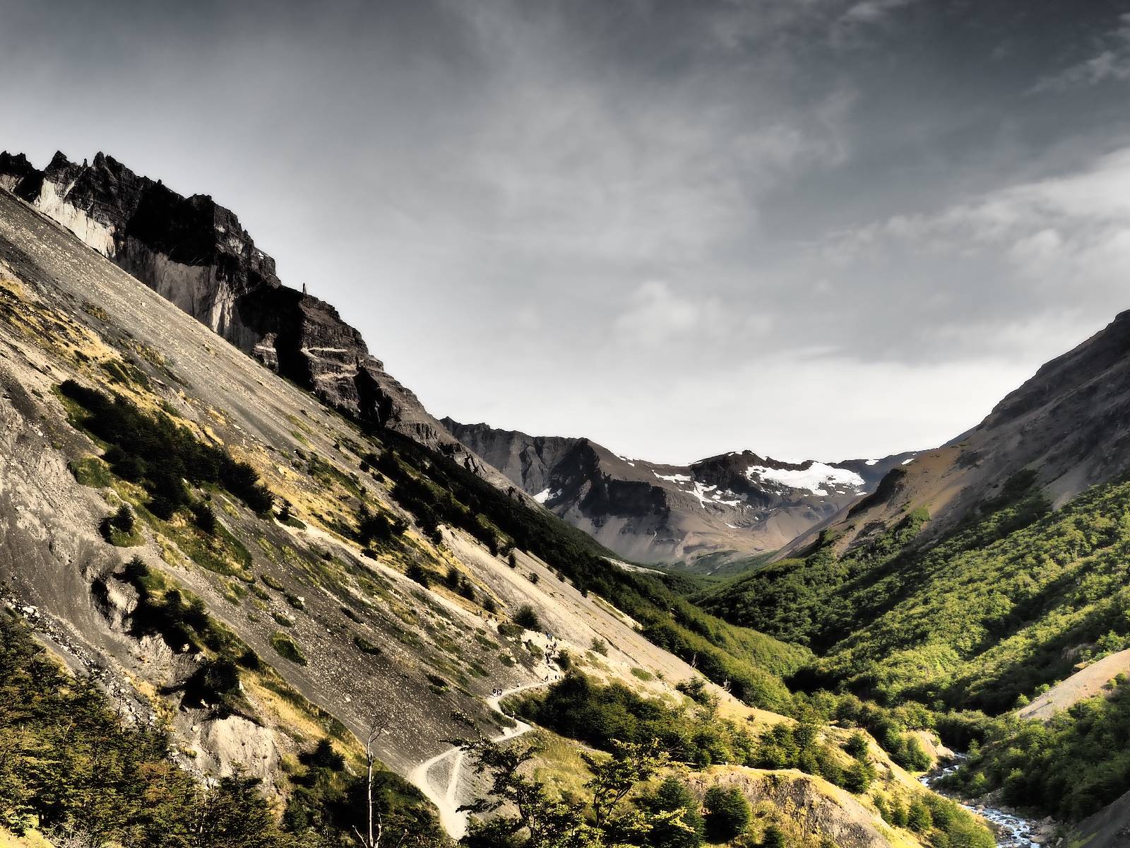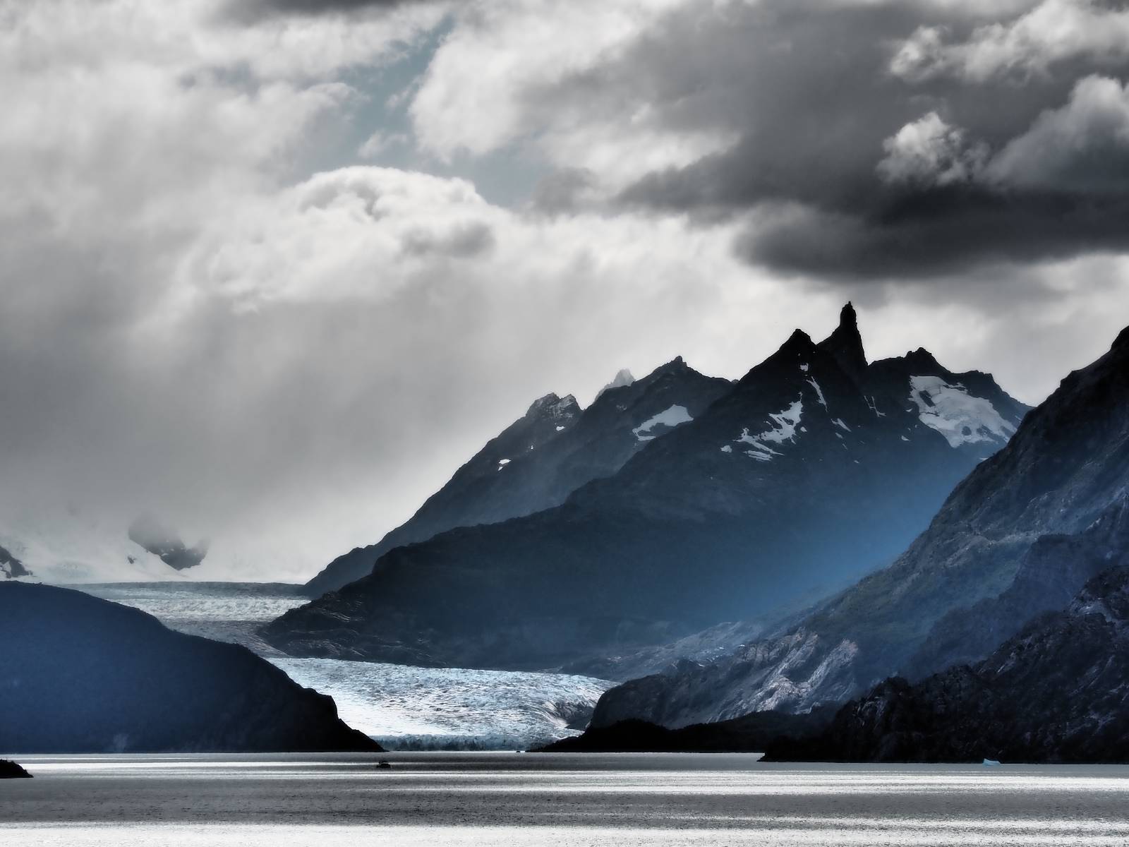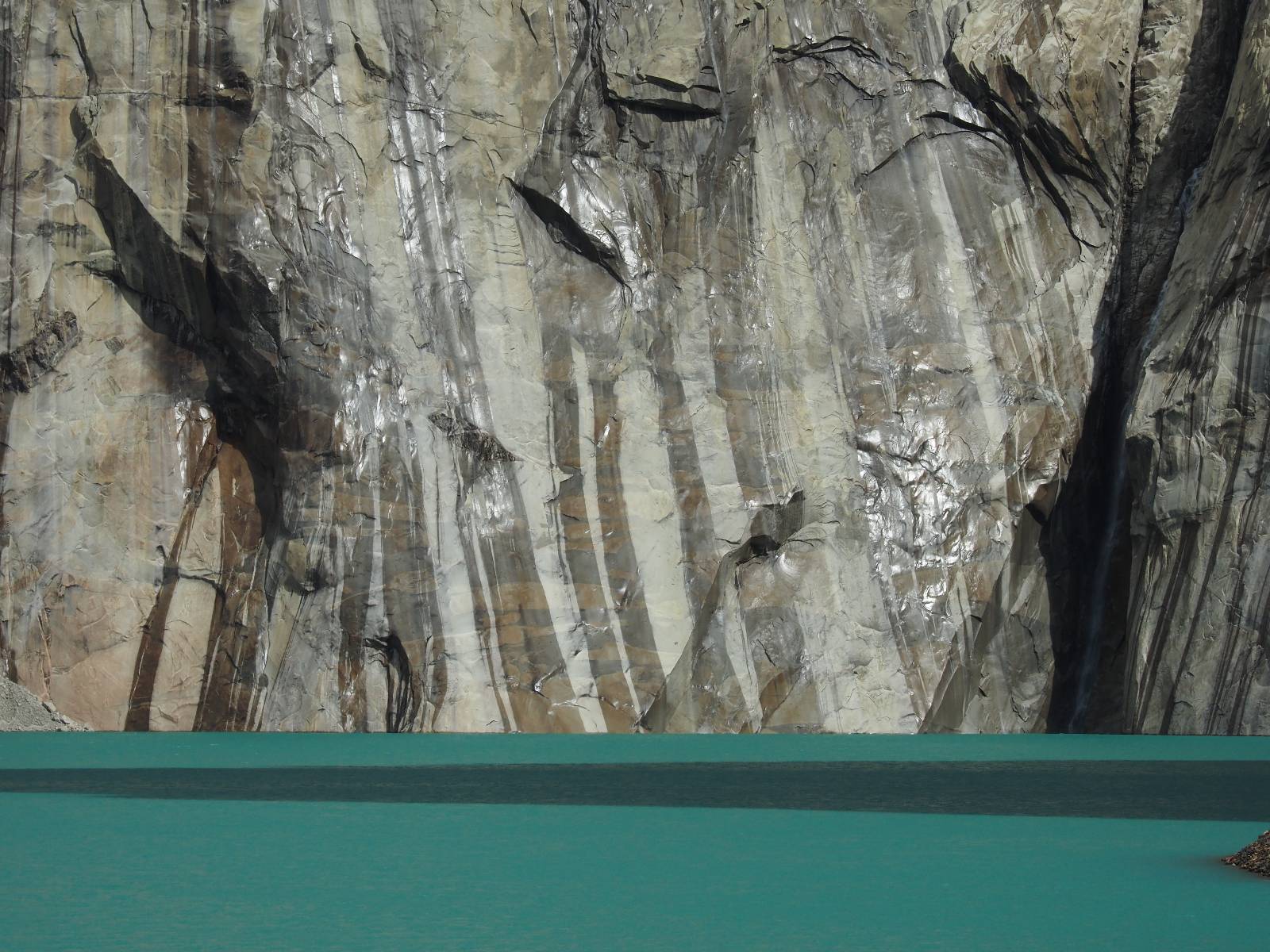 Tags drauf reise ich ab. Die Tour steckt noch etwas in den Oberschenkeln und der Wetterbericht sag so lala aber das Zimmer verlängern ging nicht mehr. Ich hatte mitbekommen, dass das Ticket vom Park drei Tage Gültigkeit hat und so will ich je nachdem, wie sich das Wetter nun entwickelt einmal von der anderen Seite aus durch den Park fahren oder vielleicht sogar eine Nacht drin verbringen. Ich begebe mich in die Spur, die mich am Milodon vorbei an den anderen Parkeingang führt. Ich darf mit meinem Ticket passieren und erfreue mich am herrlichen Anblick der Felsenformationen von der anderen Seite. Mir kommt es heute fast viel schöner vor, obwohl ich den Torres selber fast nicht sehe. Mein erstes Ziel im Park ist eine kleine fast Insel auf die man Laufen kann und von der aus man auf den weit dahinter liegenden Gletscher schauen kann. Ich lasse das Motorrad auf dem Parkplatz bei vielen anderen Ausflüglerautos und stiefle in voller Montur los. Das Wetter hat etwas aufgeklart und so mache ich mir vorerst keine Sorgen, dass es nass werden könnte. Über eine Art Strandstreifen stapfe ich zum Inselchen und dort vor bis zum Aussichtspunkt. Ok, ich kann den Gletscher sehen aber er ist wirklich noch weit weg!! Macht aber nichts! Die Sonne tut gut und macht warm und ich habe Zeit und kein sehr weites Ziel. Zumindest würde ich nur bis hinter den Park fahren und dort in dem kleinen Ort ein Bett für eine Nacht finden, sagt zumindest Google-Maps. Ich laufe zurück und mache Mittagspause im Restauran was direkat am Parkplatz liegt und überlege, wie ich nun weiterfahre. Der Tag ist nun doch schon etwas fortgeschritten aber vielleicht taugt ja der Campingplatz an dem ich einige Kilometer weiter vorbeikommen werde. Oder es ist auch wieder so etwas wie ich bereits gesehen habe, mit überteuerten Preisen.
