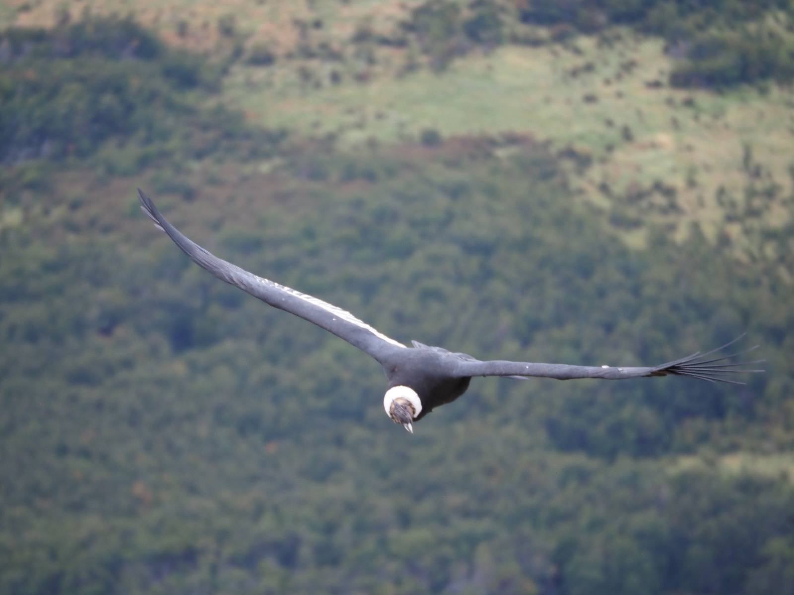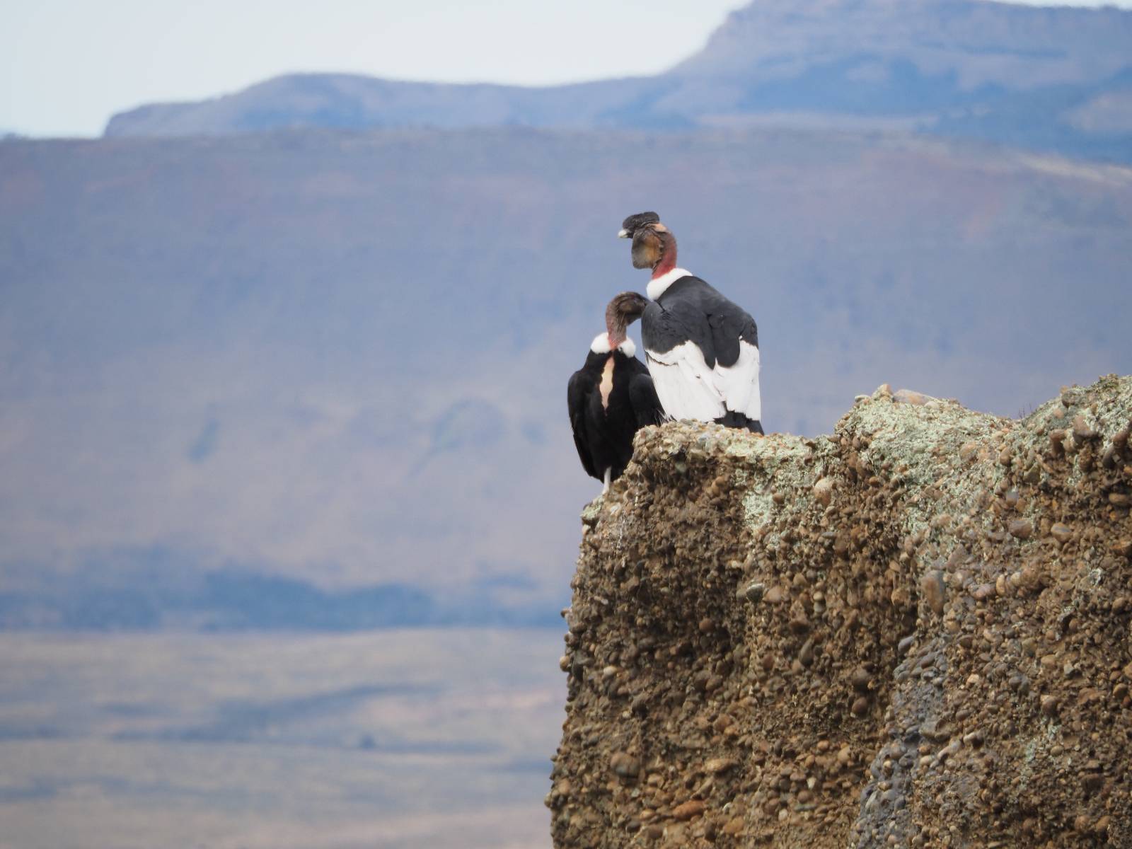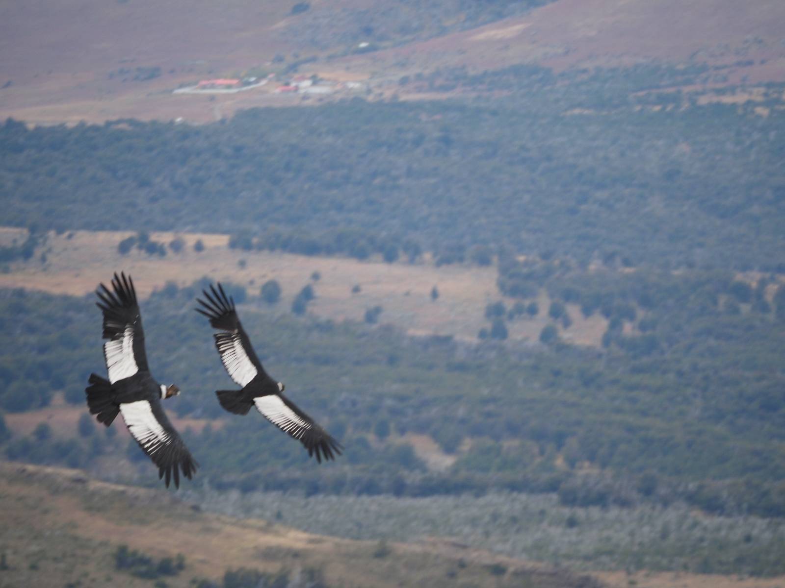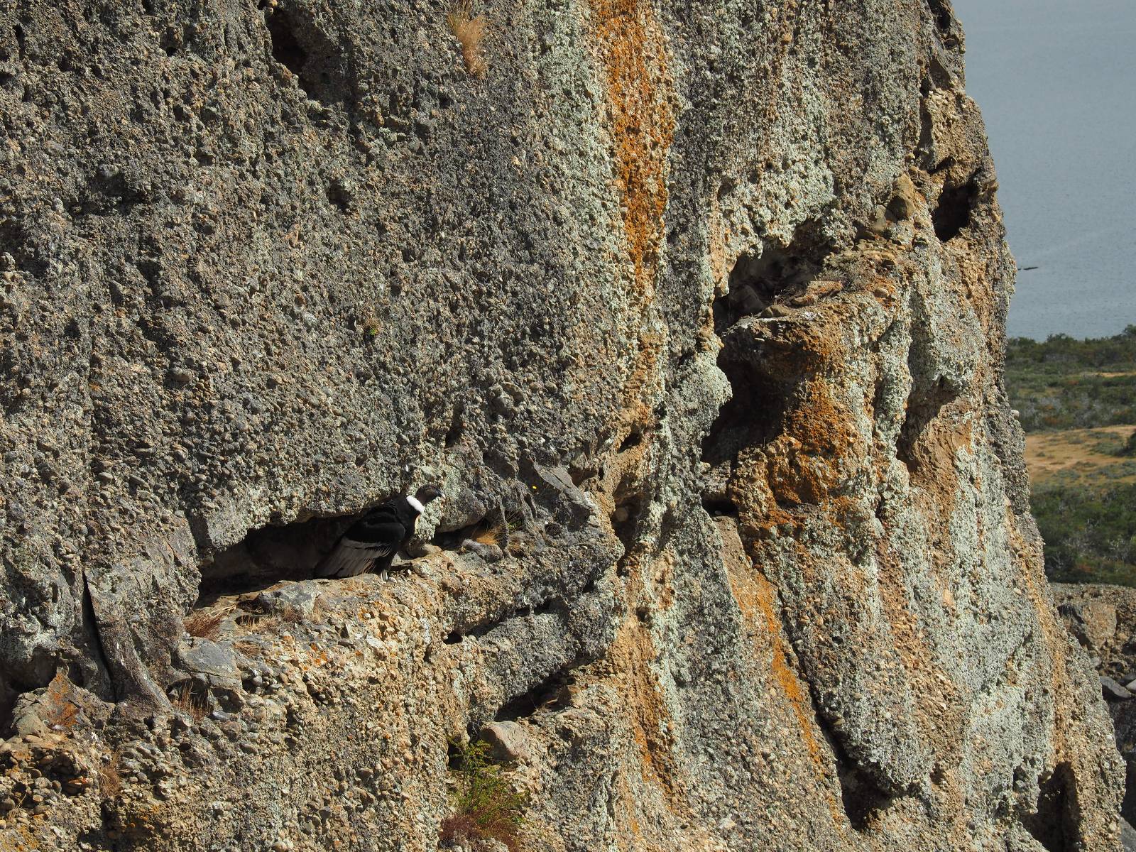 Allerdings zeigt MapsMe etwas unterhalb weitere Wanderwege an, die mich zum Felsen bringen sollten. Ich folge den gestrichelten Linien, finde mich aber ganz schnell auf privatem Grund wieder, wo auch gleich ein junger Mann auf mich zukommt und mich aufklärt. Es ist tatsächlich privat aber sie haben einen Rundwanderweg angelegt dem ich folgen kann, mit schönen Aussichten und Erklärungen zur Geologie, Pflanzen und Tieren für ca. 10,- EUR. Also gut, ich bezahle und mache mich auf den Weg. Sie haben ihn tatsächlich ganz nett angelegt und auch die Info-tafeln sind durchaus interessant! Ich habe mal wieder Glück mit dem Wetter und so genieße ich gemütlich den Weg. Aber mein eigentliches Ziel ist es noch nicht. Zumindest gelange ich aber an den Aussichtspunkt auf die Laguna Sofia. Ein paar Andere sind schon dort und genießen die Aussicht. Eine hervorragende Gelegenheit eine Snackpaucse zu machen. Alledings wird die Pause plötzlich gestört! Aber ganz positiv gestört! Ein Condor kommt vorbeigeschwebt und setzt sich ganz dicht bei uns in eine kleine Felsenhöhle. Ich pflanze mein anderes Bajonett auf die Kamera, um näher heranzukommen. Wow, sehr beeindruckend sie so Nahe zu sehen! Und dann kommt auch noch er und setzt sich dazu! Was für ein Glückstreffer ein Condorpaar so nahe zu erleben. Leider bleiben sie nicht all zu lange und erheben sich wieder in die Lüfte, nach oben zum Cerro Benitez. Den kann ich von hier schön sehen, auch das Leute dort oben sind und dort noch mehr Condore kreisen. Das ist mein eigentliches Ziel, von der Steilwand dort die Aussicht ins Land drum herum zu genießen! Kurze Zeit später bin ich alleine am Aussichtspunkt und schiele immernoch nach oben. Mich trennt etwas unterhalb von meinem Punkt der Zaun des Privatgrundstücks!