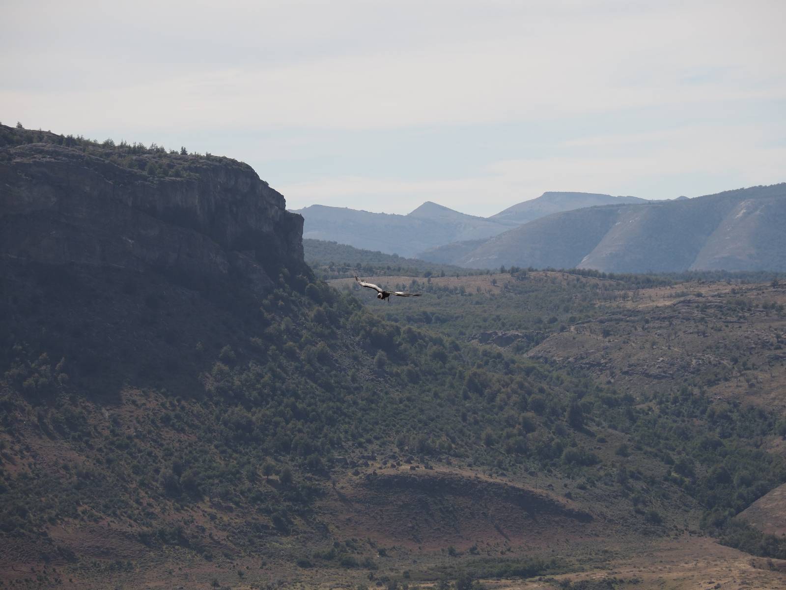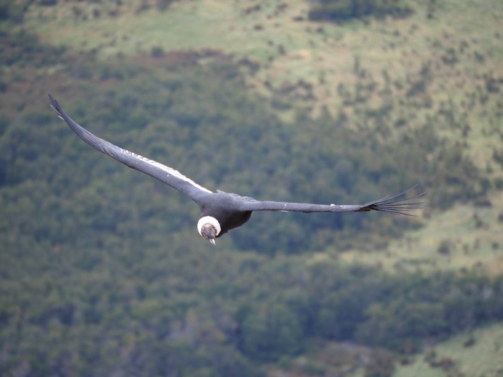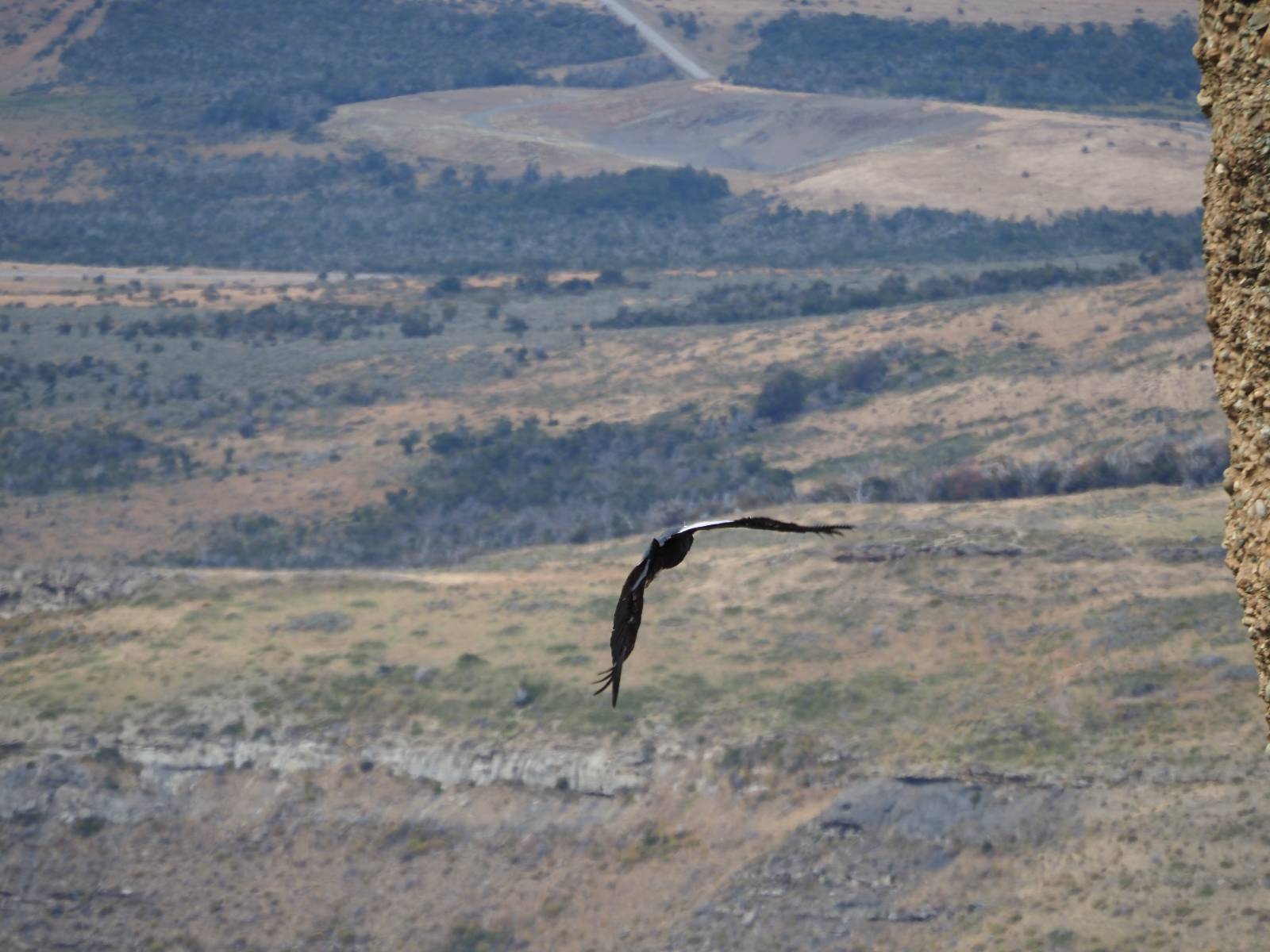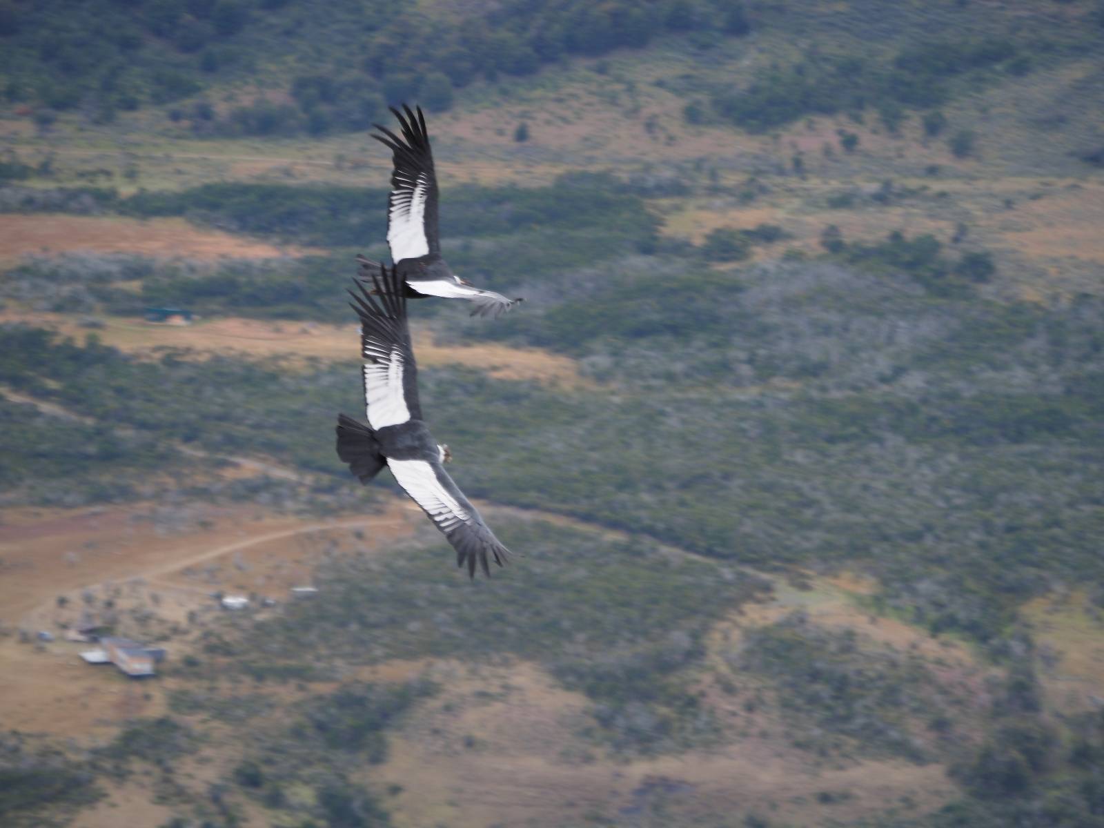 Allerdings zeigt MapsMe etwas unterhalb weitere Wanderwege an, die mich zum Felsen bringen sollten. Ich folge den gestrichelten Linien, finde mich aber ganz schnell auf privatem Grund wieder, wo auch gleich ein junger Mann auf mich zukommt und mich aufklärt. Es ist tatsächlich privat aber sie haben einen Rundwanderweg angelegt dem ich folgen kann, mit schönen Aussichten und Erklärungen zur Geologie, Pflanzen und Tieren für ca. 10,- EUR. Also gut, ich bezahle und mache mich auf den Weg. Sie haben ihn tatsächlich ganz nett angelegt und auch die Info-tafeln sind durchaus interessant! Ich habe mal wieder Glück mit dem Wetter und so genieße ich gemütlich den Weg. Aber mein eigentliches Ziel ist es noch nicht. Zumindest gelange ich aber an den Aussichtspunkt auf die Laguna Sofia. Ein paar Andere sind schon dort und genießen die Aussicht. Eine hervorragende Gelegenheit eine Snackpaucse zu machen. Alledings wird die Pause plötzlich gestört! Aber ganz positiv gestört! Ein Condor kommt vorbeigeschwebt und setzt sich ganz dicht bei uns in eine kleine Felsenhöhle. Ich pflanze mein anderes Bajonett auf die Kamera, um näher heranzukommen. Wow, sehr beeindruckend sie so Nahe zu sehen! Und dann kommt auch noch er und setzt sich dazu! Was für ein Glückstreffer ein Condorpaar so nahe zu erleben. Leider bleiben sie nicht all zu lange und erheben sich wieder in die Lüfte, nach oben zum Cerro Benitez. Den kann ich von hier schön sehen, auch das Leute dort oben sind und dort noch mehr Condore kreisen. Das ist mein eigentliches Ziel, von der Steilwand dort die Aussicht ins Land drum herum zu genießen! Kurze Zeit später bin ich alleine am Aussichtspunkt und schiele immernoch nach oben. Mich trennt etwas unterhalb von meinem Punkt der Zaun des Privatgrundstücks!