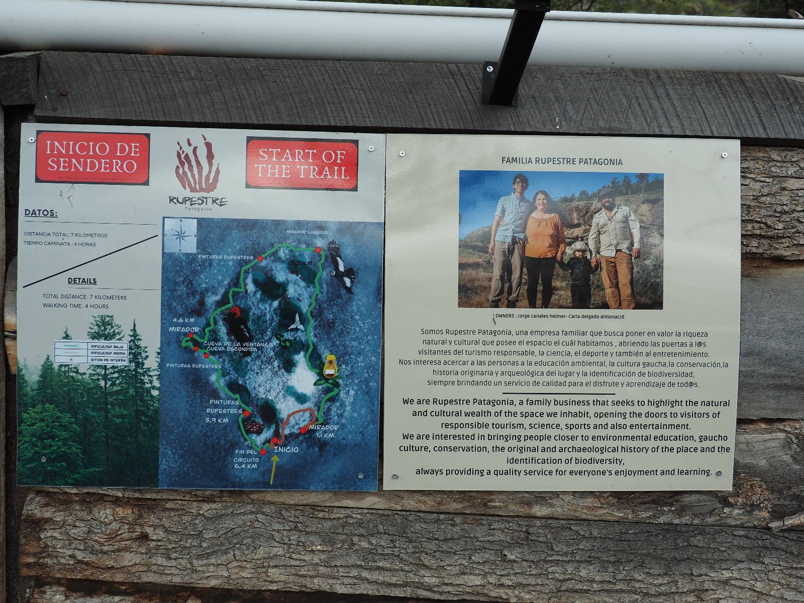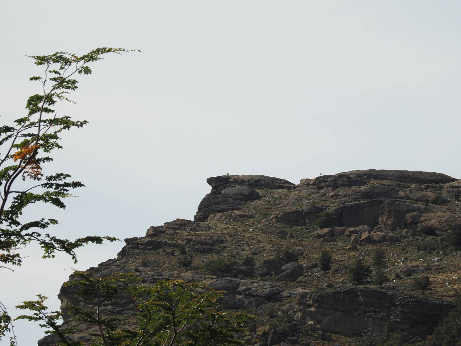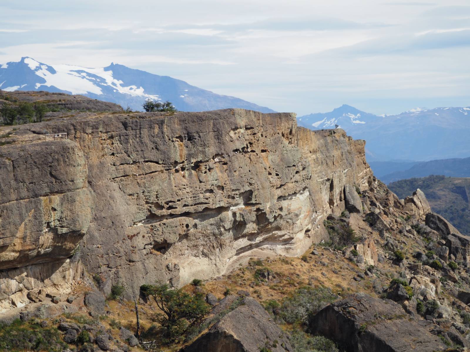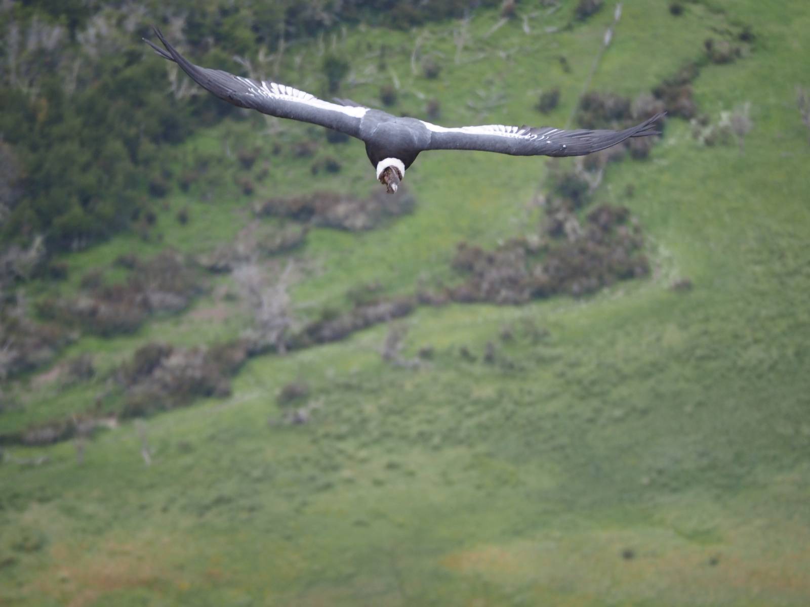 Allerdings zeigt MapsMe etwas unterhalb weitere Wanderwege an, die mich zum Felsen bringen sollten. Ich folge den gestrichelten Linien, finde mich aber ganz schnell auf privatem Grund wieder, wo auch gleich ein junger Mann auf mich zukommt und mich aufklärt. Es ist tatsächlich privat aber sie haben einen Rundwanderweg angelegt dem ich folgen kann, mit schönen Aussichten und Erklärungen zur Geologie, Pflanzen und Tieren für ca. 10,- EUR. Also gut, ich bezahle und mache mich auf den Weg. Sie haben ihn tatsächlich ganz nett angelegt und auch die Info-tafeln sind durchaus interessant! Ich habe mal wieder Glück mit dem Wetter und so genieße ich gemütlich den Weg. Aber mein eigentliches Ziel ist es noch nicht. Zumindest gelange ich aber an den Aussichtspunkt auf die Laguna Sofia. Ein paar Andere sind schon dort und genießen die Aussicht. Eine hervorragende Gelegenheit eine Snackpaucse zu machen. Alledings wird die Pause plötzlich gestört! Aber ganz positiv gestört! Ein Condor kommt vorbeigeschwebt und setzt sich ganz dicht bei uns in eine kleine Felsenhöhle. Ich pflanze mein anderes Bajonett auf die Kamera, um näher heranzukommen. Wow, sehr beeindruckend sie so Nahe zu sehen! Und dann kommt auch noch er und setzt sich dazu! Was für ein Glückstreffer ein Condorpaar so nahe zu erleben. Leider bleiben sie nicht all zu lange und erheben sich wieder in die Lüfte, nach oben zum Cerro Benitez. Den kann ich von hier schön sehen, auch das Leute dort oben sind und dort noch mehr Condore kreisen. Das ist mein eigentliches Ziel, von der Steilwand dort die Aussicht ins Land drum herum zu genießen! Kurze Zeit später bin ich alleine am Aussichtspunkt und schiele immernoch nach oben. Mich trennt etwas unterhalb von meinem Punkt der Zaun des Privatgrundstücks!