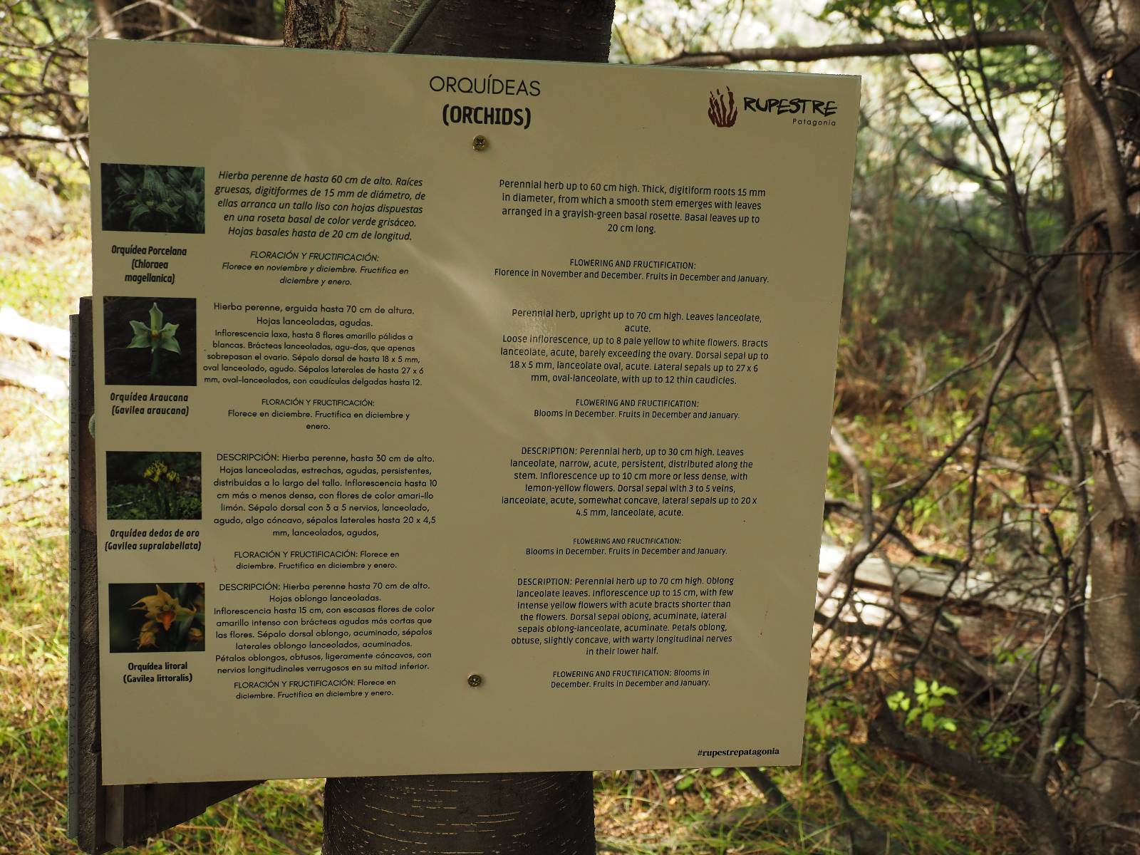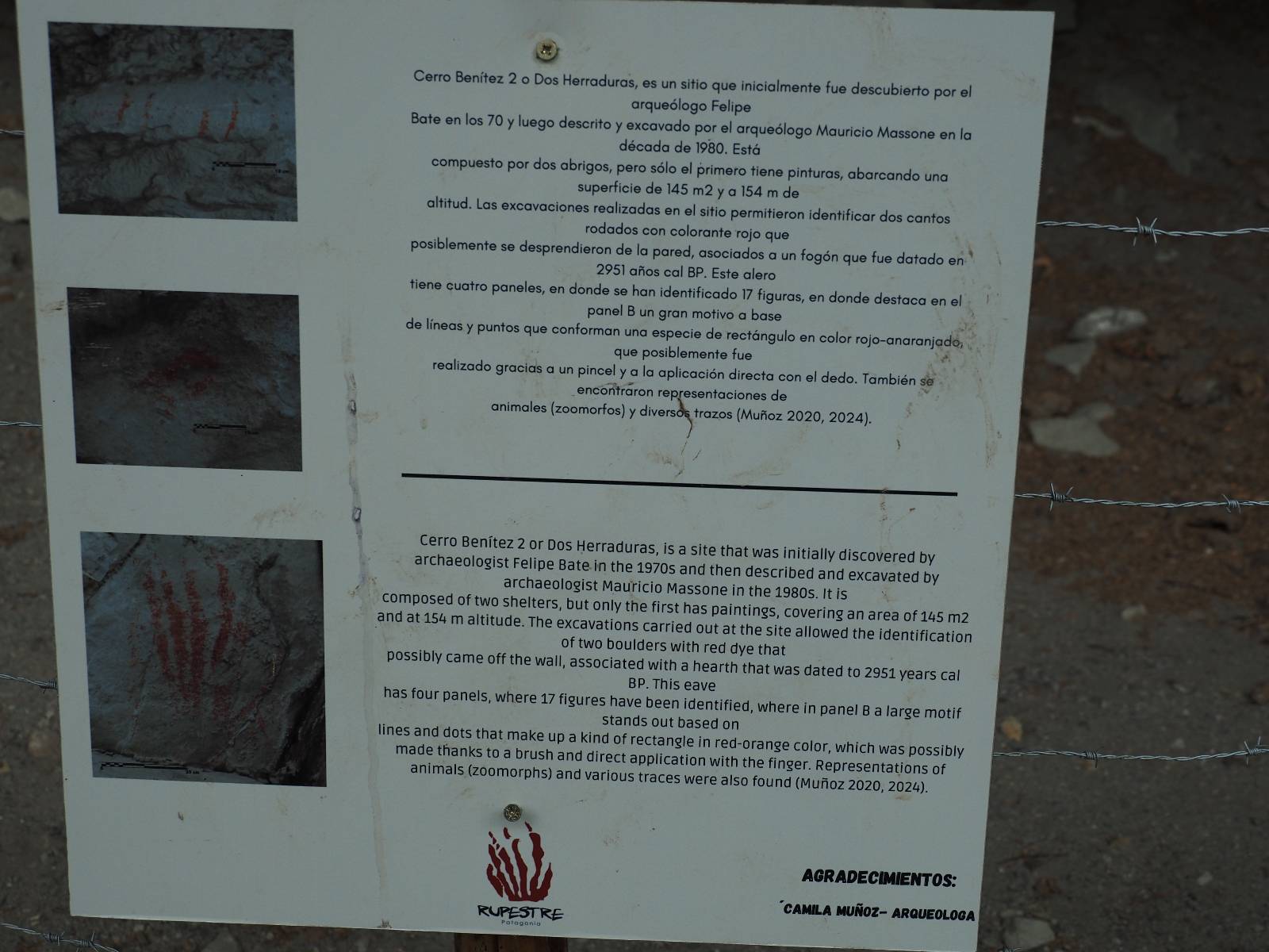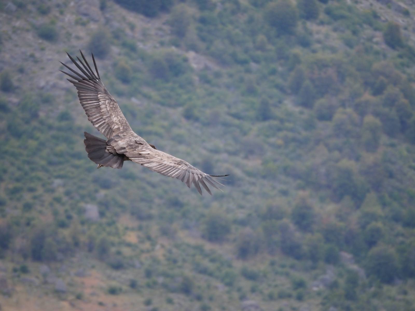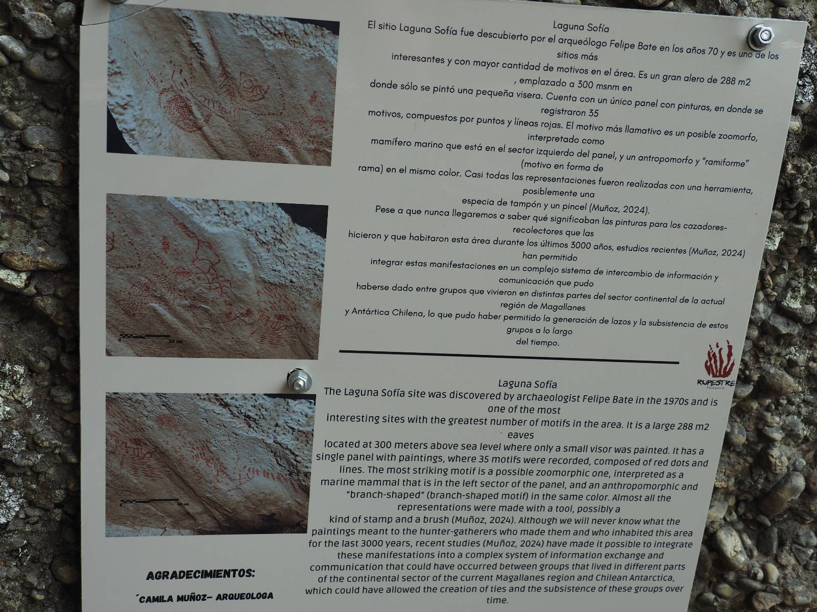Allerdings zeigt MapsMe etwas unterhalb weitere Wanderwege an, die mich zum Felsen bringen sollten. Ich folge den gestrichelten Linien, finde mich aber ganz schnell auf privatem Grund wieder, wo auch gleich ein junger Mann auf mich zukommt und mich aufklärt. Es ist tatsächlich privat aber sie haben einen Rundwanderweg angelegt dem ich folgen kann, mit schönen Aussichten und Erklärungen zur Geologie, Pflanzen und Tieren für ca. 10,- EUR. Also gut, ich bezahle und mache mich auf den Weg. Sie haben ihn tatsächlich ganz nett angelegt und auch die Info-tafeln sind durchaus interessant! Ich habe mal wieder Glück mit dem Wetter und so genieße ich gemütlich den Weg. Aber mein eigentliches Ziel ist es noch nicht. Zumindest gelange ich aber an den Aussichtspunkt auf die Laguna Sofia. Ein paar Andere sind schon dort und genießen die Aussicht. Eine hervorragende Gelegenheit eine Snackpaucse zu machen. Alledings wird die Pause plötzlich gestört! Aber ganz positiv gestört! Ein Condor kommt vorbeigeschwebt und setzt sich ganz dicht bei uns in eine kleine Felsenhöhle. Ich pflanze mein anderes Bajonett auf die Kamera, um näher heranzukommen. Wow, sehr beeindruckend sie so Nahe zu sehen! Und dann kommt auch noch er und setzt sich dazu! Was für ein Glückstreffer ein Condorpaar so nahe zu erleben. Leider bleiben sie nicht all zu lange und erheben sich wieder in die Lüfte, nach oben zum Cerro Benitez. Den kann ich von hier schön sehen, auch das Leute dort oben sind und dort noch mehr Condore kreisen. Das ist mein eigentliches Ziel, von der Steilwand dort die Aussicht ins Land drum herum zu genießen! Kurze Zeit später bin ich alleine am Aussichtspunkt und schiele immernoch nach oben. Mich trennt etwas unterhalb von meinem Punkt der Zaun des Privatgrundstücks!