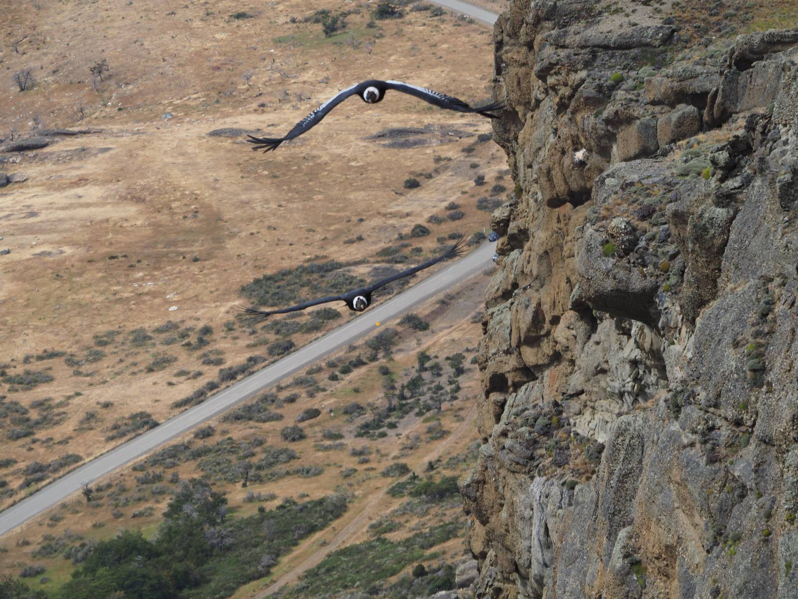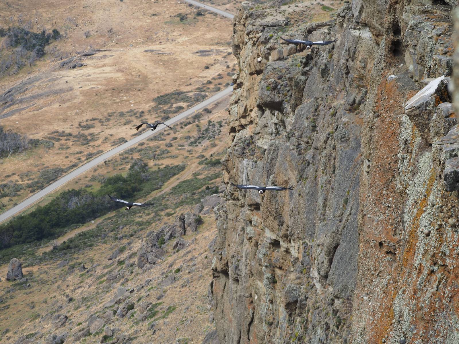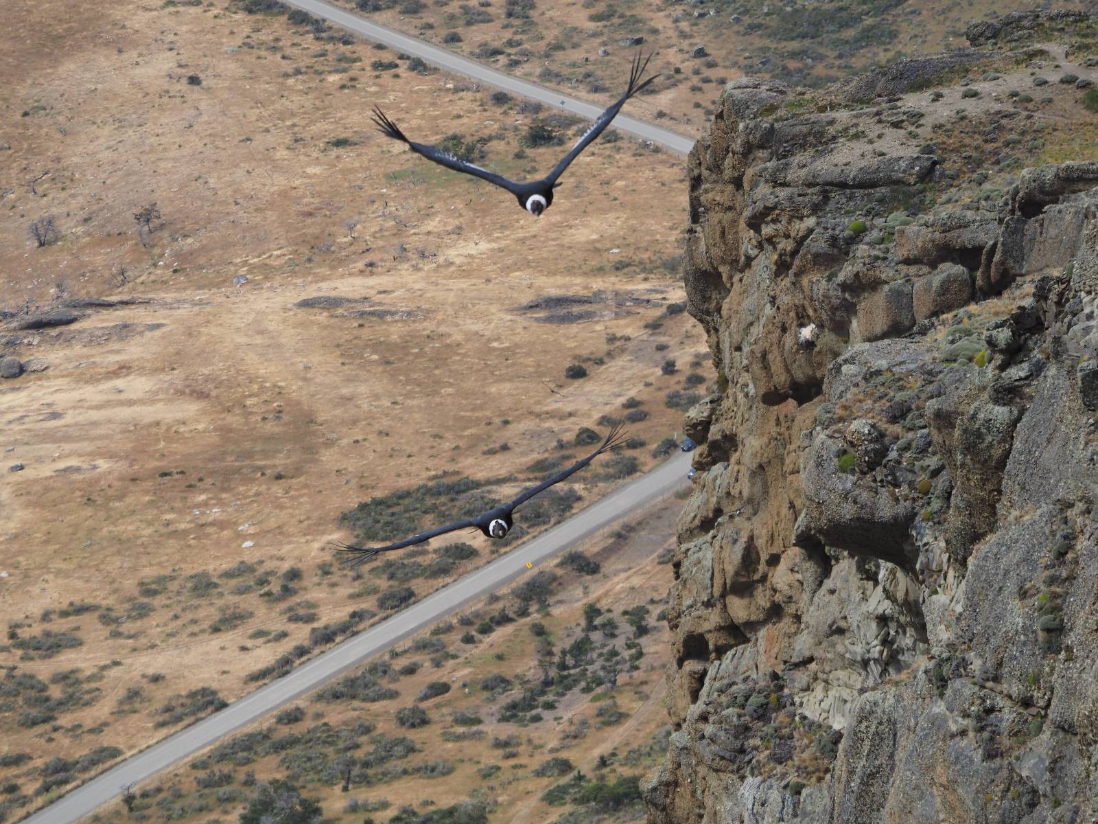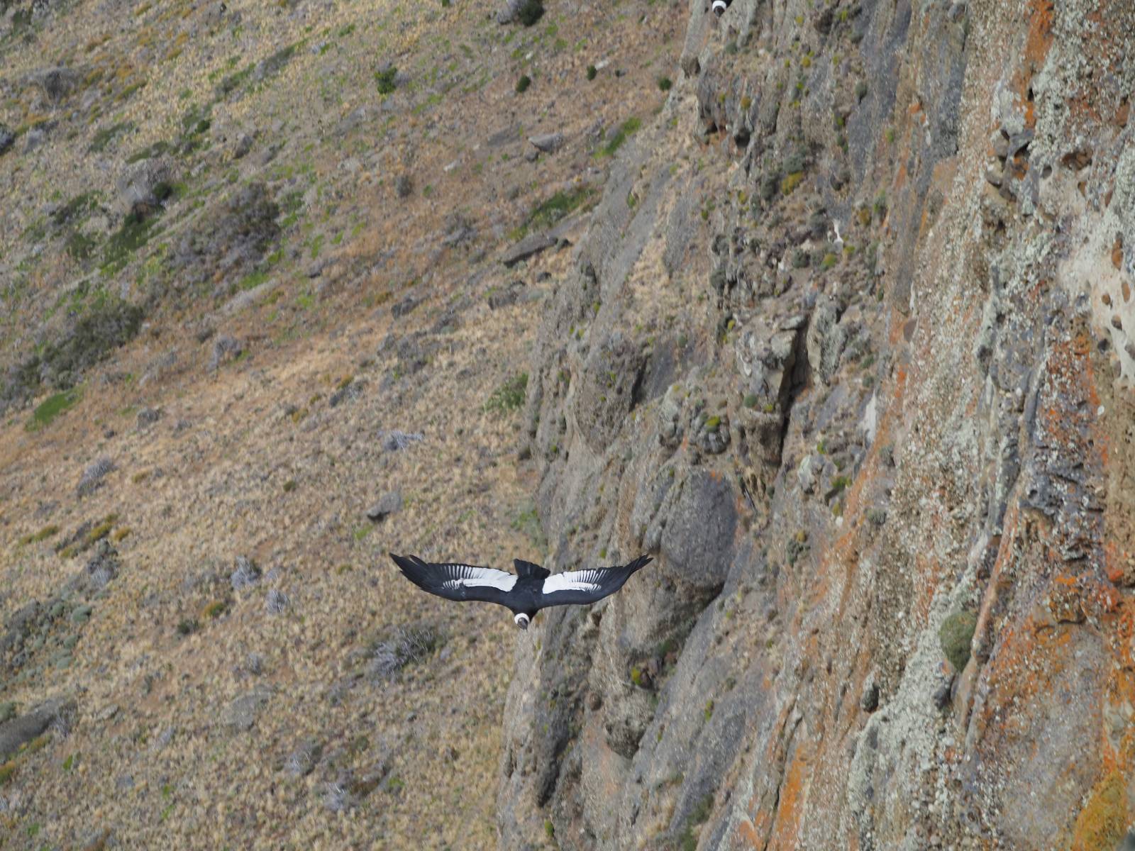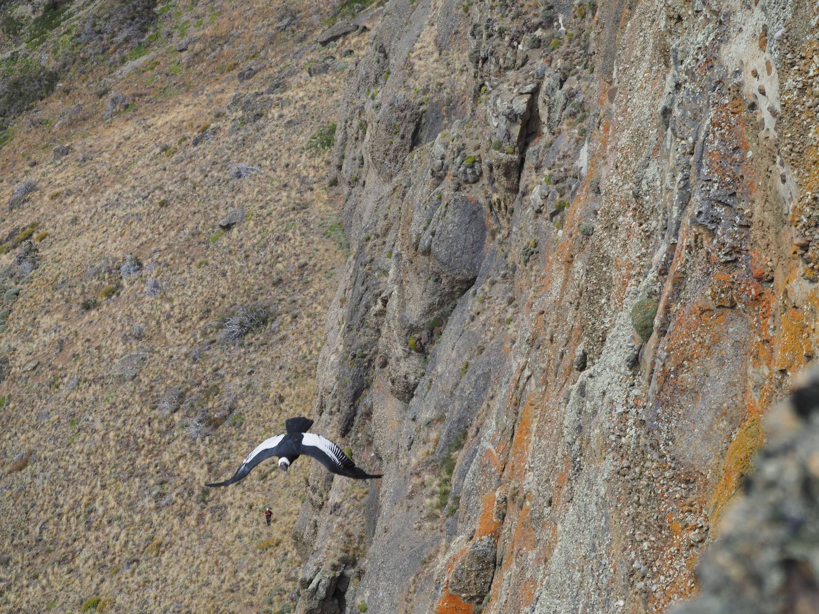 Ich denke ich muss mir das mal von nahem ansehen! Das Zäunchen ist zum Glück nicht hoch und bei meiner Schrittlänge kann ich auch so ganz einfach drüber steigen. Ich freue mich etwas schelmisch und dass ich nun doch auf den Benitez gehe auch wenn es jetzt noch einen schicken steilen Anstieg von ungefähr 30-40 Minuten gibt! Es ist tatsächlich anstrengend und ich schnaufe ganz ordentlich und ich merke meine rechte Ferse! Das war was ich befürchtet hatte! Ich habe schon immer das Problem das es da gerne drückt und gerade nun beim Aufwärtsgehen bekomme ich da ordentlich Druck. Es ist keine Blase die ich mir reibe, einfach nur Druck der unangenehm wird. Doch gleich habe ich es geschafft und der Schmerz ist vergessen! Was für eine irre schöne Aussicht hier oben und die Steilwand herunter auf den Lago Sofia! Ich packe die Drohne aus und lasse sie von mir wegfliegen, um die Dimension der Steilwand und die Landschaft drum herum zu filmen. Aber als wenn ich sie damit gerufen hätte tauchen plötzlich Condore auf. Nun bekomme ich widerum etwas Panik die Drohne wieder zu landen, ohne einen Unfall anzustellen. Es funktioniert aber ich vergesse dabei zu filmen. Aber macht nichts, jetzt die Kamera mit dem Tele und ich fotografiere wie wild, in der Hoffnung, wenigsten ein paar Condore gut zu erwischen! Was für ein Schauspiel! Wie krass sie so nahe an mir vorbeifliegen zu sehen! Ich war ja unten mit dem Pärchen schon beeindruckt aber das ist wirklich ein irres Erlebnis! Und wie groß sie sind! Dazu ihre Fluggeräusche, als wenn tatsächlich ein Flugzeug drüber weg geht. Ich bin hin und weg und etwas neidisch auf den Typen neben mir, der mit einer viel größeren Wumme draufhält! Der hat sicher geile Fotos!! Von ihm erfahre ich auch, daß die kleine Höhle von vorhin, das Nest von dem Paar war. Ein junger Condor will sich nur wenige Meter vor mir auf die Felskante setzen, merkt es aber und startet wieder durch. Aber da kann ich tatsächlich seine Größe etwas abschätzen. Sie werden bis ca. 120cm groß mit Spannweiten bis zu 320cm! Das glaube ich nun gerne…! Die Männer sind übrigens die mit mehr Gehänge…, am Kopf!