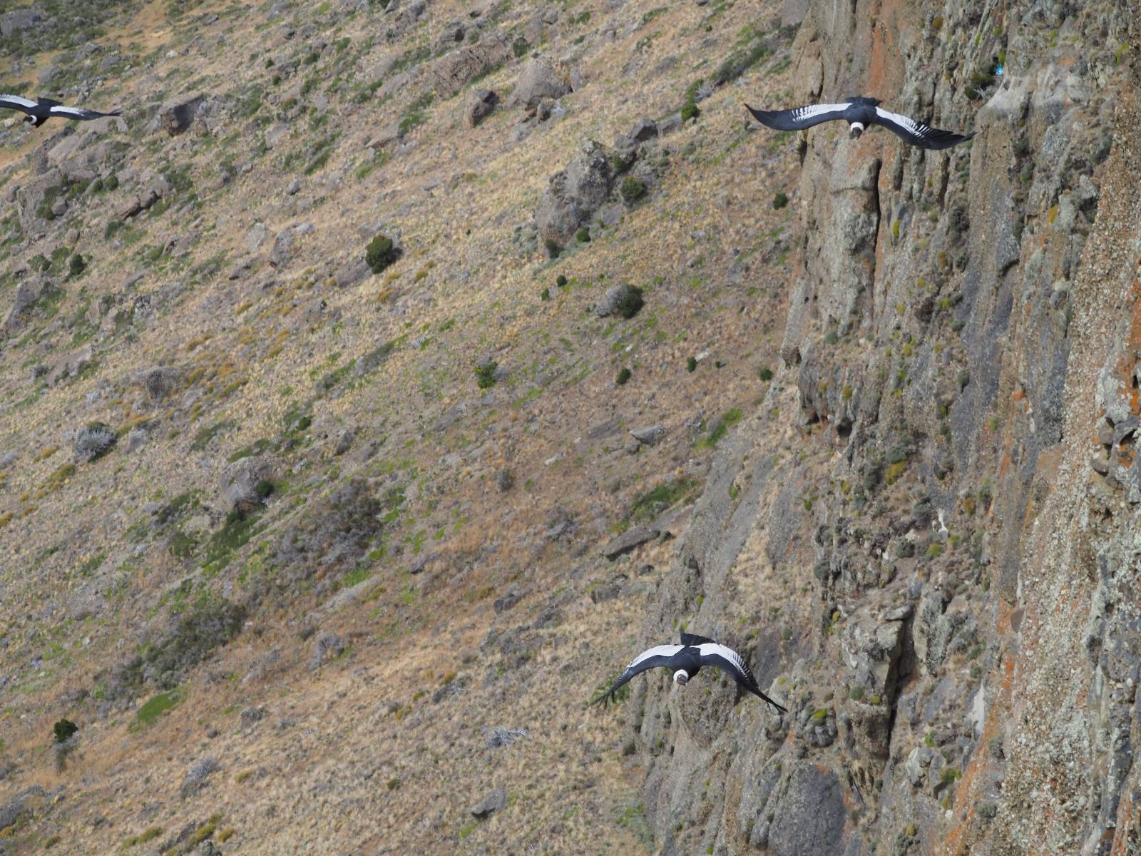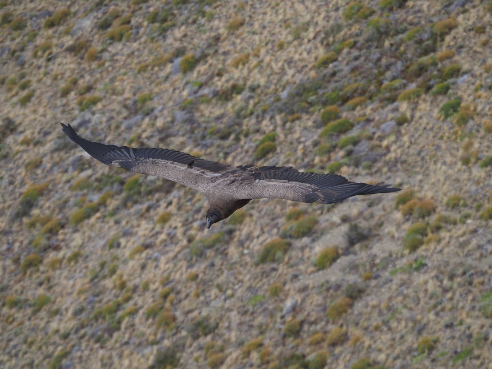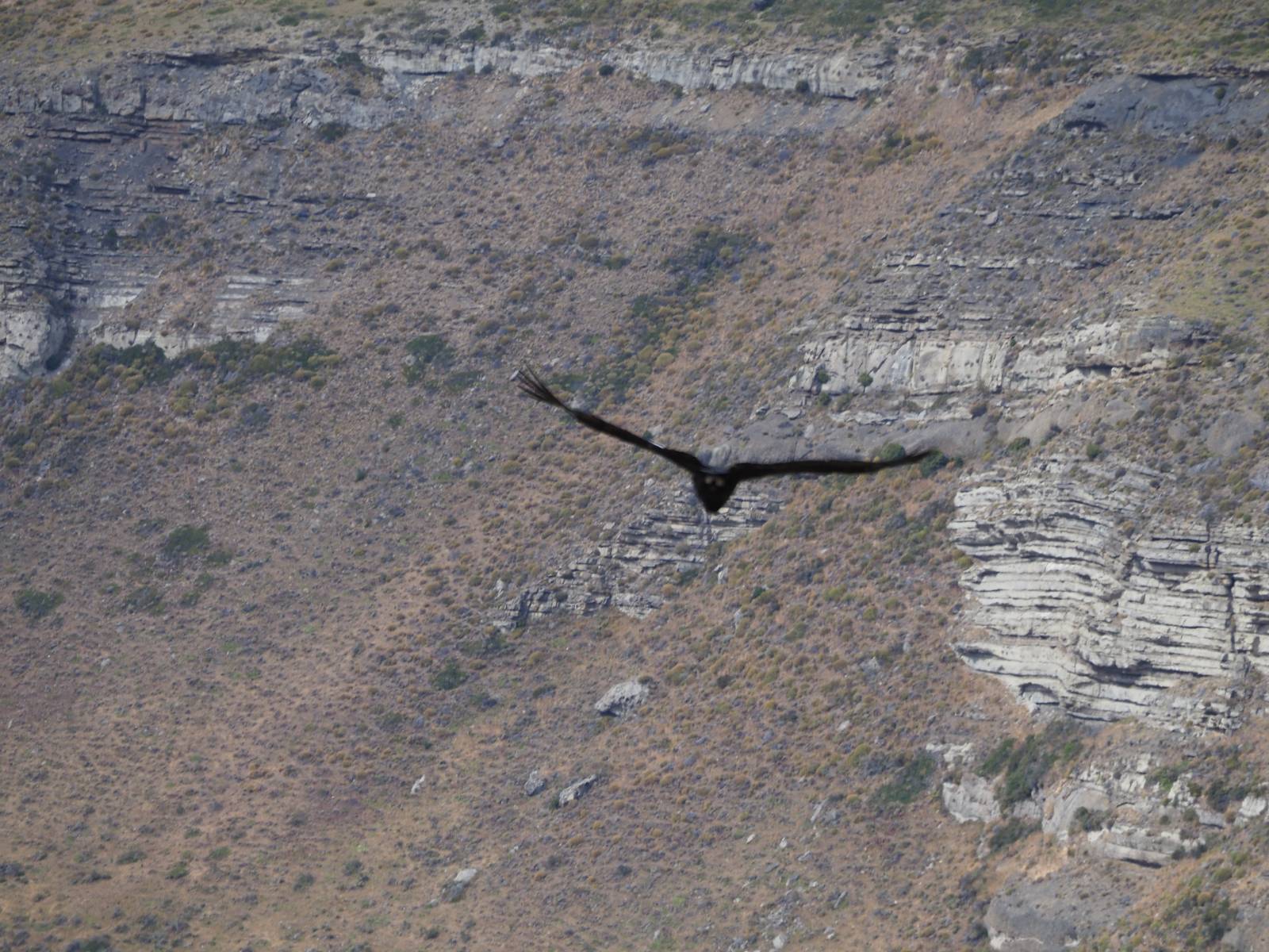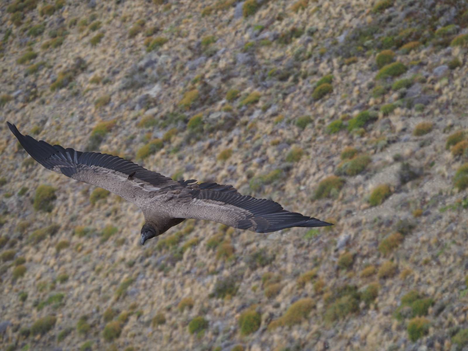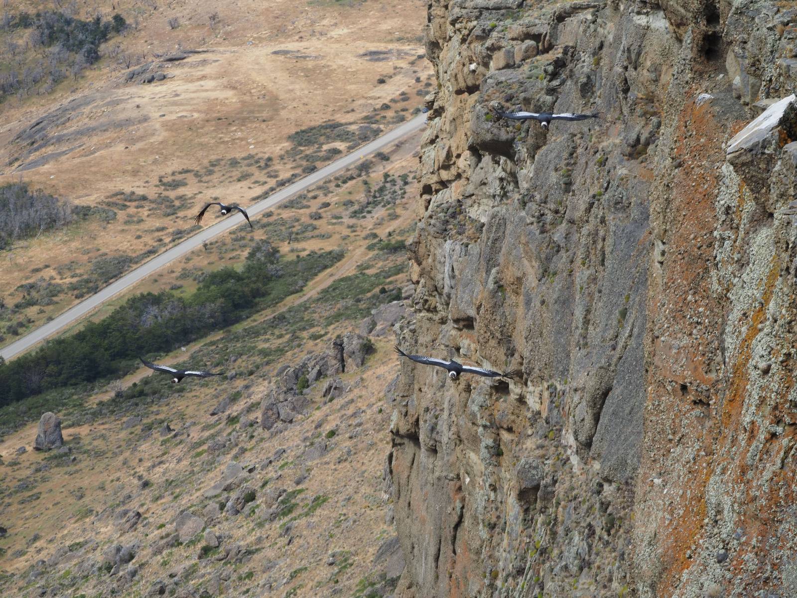 Ich denke ich muss mir das mal von nahem ansehen! Das Zäunchen ist zum Glück nicht hoch und bei meiner Schrittlänge kann ich auch so ganz einfach drüber steigen. Ich freue mich etwas schelmisch und dass ich nun doch auf den Benitez gehe auch wenn es jetzt noch einen schicken steilen Anstieg von ungefähr 30-40 Minuten gibt! Es ist tatsächlich anstrengend und ich schnaufe ganz ordentlich und ich merke meine rechte Ferse! Das war was ich befürchtet hatte! Ich habe schon immer das Problem das es da gerne drückt und gerade nun beim Aufwärtsgehen bekomme ich da ordentlich Druck. Es ist keine Blase die ich mir reibe, einfach nur Druck der unangenehm wird. Doch gleich habe ich es geschafft und der Schmerz ist vergessen! Was für eine irre schöne Aussicht hier oben und die Steilwand herunter auf den Lago Sofia! Ich packe die Drohne aus und lasse sie von mir wegfliegen, um die Dimension der Steilwand und die Landschaft drum herum zu filmen. Aber als wenn ich sie damit gerufen hätte tauchen plötzlich Condore auf. Nun bekomme ich widerum etwas Panik die Drohne wieder zu landen, ohne einen Unfall anzustellen. Es funktioniert aber ich vergesse dabei zu filmen. Aber macht nichts, jetzt die Kamera mit dem Tele und ich fotografiere wie wild, in der Hoffnung, wenigsten ein paar Condore gut zu erwischen! Was für ein Schauspiel! Wie krass sie so nahe an mir vorbeifliegen zu sehen! Ich war ja unten mit dem Pärchen schon beeindruckt aber das ist wirklich ein irres Erlebnis! Und wie groß sie sind! Dazu ihre Fluggeräusche, als wenn tatsächlich ein Flugzeug drüber weg geht. Ich bin hin und weg und etwas neidisch auf den Typen neben mir, der mit einer viel größeren Wumme draufhält! Der hat sicher geile Fotos!! Von ihm erfahre ich auch, daß die kleine Höhle von vorhin, das Nest von dem Paar war. Ein junger Condor will sich nur wenige Meter vor mir auf die Felskante setzen, merkt es aber und startet wieder durch. Aber da kann ich tatsächlich seine Größe etwas abschätzen. Sie werden bis ca. 120cm groß mit Spannweiten bis zu 320cm! Das glaube ich nun gerne…! Die Männer sind übrigens die mit mehr Gehänge…, am Kopf!