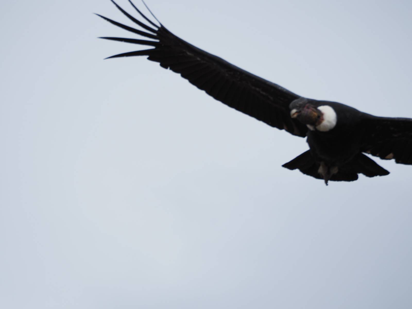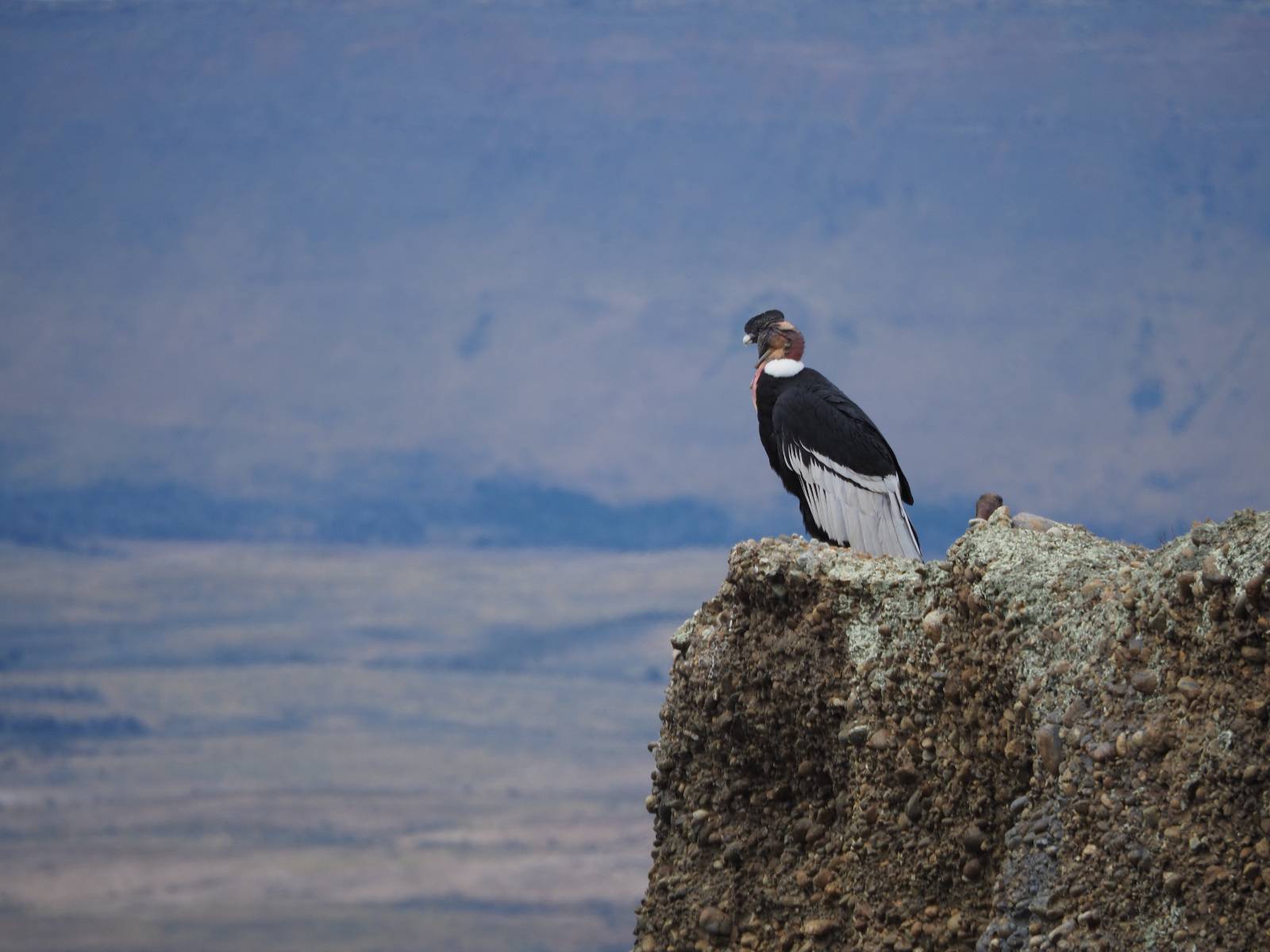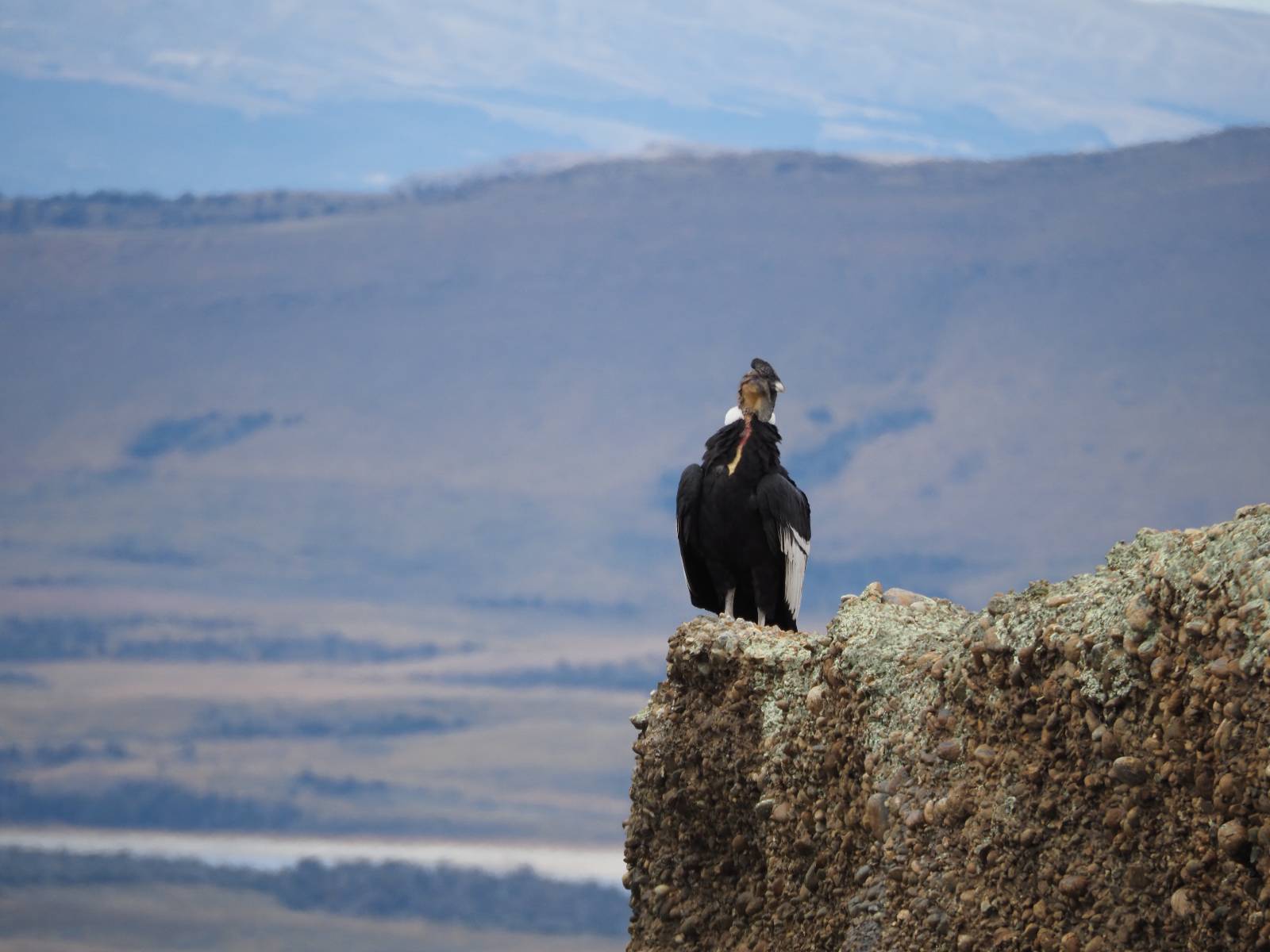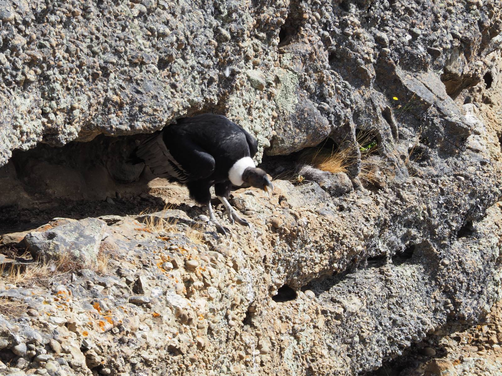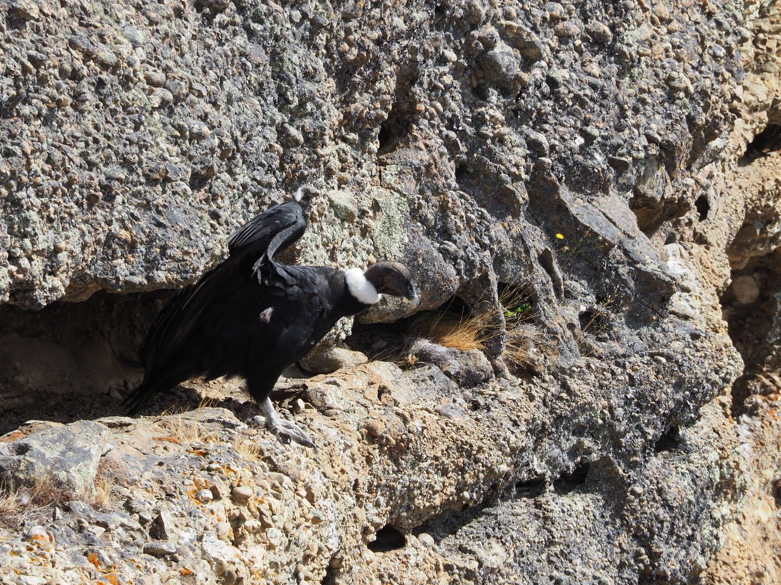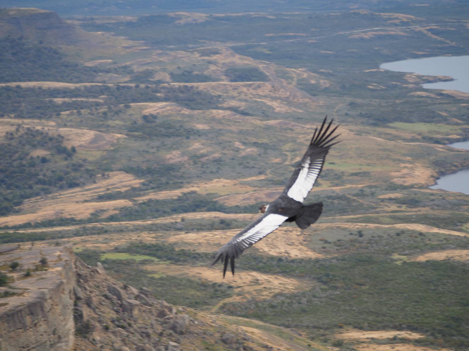 Ich denke ich muss mir das mal von nahem ansehen! Das Zäunchen ist zum Glück nicht hoch und bei meiner Schrittlänge kann ich auch so ganz einfach drüber steigen. Ich freue mich etwas schelmisch und dass ich nun doch auf den Benitez gehe auch wenn es jetzt noch einen schicken steilen Anstieg von ungefähr 30-40 Minuten gibt! Es ist tatsächlich anstrengend und ich schnaufe ganz ordentlich und ich merke meine rechte Ferse! Das war was ich befürchtet hatte! Ich habe schon immer das Problem das es da gerne drückt und gerade nun beim Aufwärtsgehen bekomme ich da ordentlich Druck. Es ist keine Blase die ich mir reibe, einfach nur Druck der unangenehm wird. Doch gleich habe ich es geschafft und der Schmerz ist vergessen! Was für eine irre schöne Aussicht hier oben und die Steilwand herunter auf den Lago Sofia! Ich packe die Drohne aus und lasse sie von mir wegfliegen, um die Dimension der Steilwand und die Landschaft drum herum zu filmen. Aber als wenn ich sie damit gerufen hätte tauchen plötzlich Condore auf. Nun bekomme ich widerum etwas Panik die Drohne wieder zu landen, ohne einen Unfall anzustellen. Es funktioniert aber ich vergesse dabei zu filmen. Aber macht nichts, jetzt die Kamera mit dem Tele und ich fotografiere wie wild, in der Hoffnung, wenigsten ein paar Condore gut zu erwischen! Was für ein Schauspiel! Wie krass sie so nahe an mir vorbeifliegen zu sehen! Ich war ja unten mit dem Pärchen schon beeindruckt aber das ist wirklich ein irres Erlebnis! Und wie groß sie sind! Dazu ihre Fluggeräusche, als wenn tatsächlich ein Flugzeug drüber weg geht. Ich bin hin und weg und etwas neidisch auf den Typen neben mir, der mit einer viel größeren Wumme draufhält! Der hat sicher geile Fotos!! Von ihm erfahre ich auch, daß die kleine Höhle von vorhin, das Nest von dem Paar war. Ein junger Condor will sich nur wenige Meter vor mir auf die Felskante setzen, merkt es aber und startet wieder durch. Aber da kann ich tatsächlich seine Größe etwas abschätzen. Sie werden bis ca. 120cm groß mit Spannweiten bis zu 320cm! Das glaube ich nun gerne…! Die Männer sind übrigens die mit mehr Gehänge…, am Kopf!