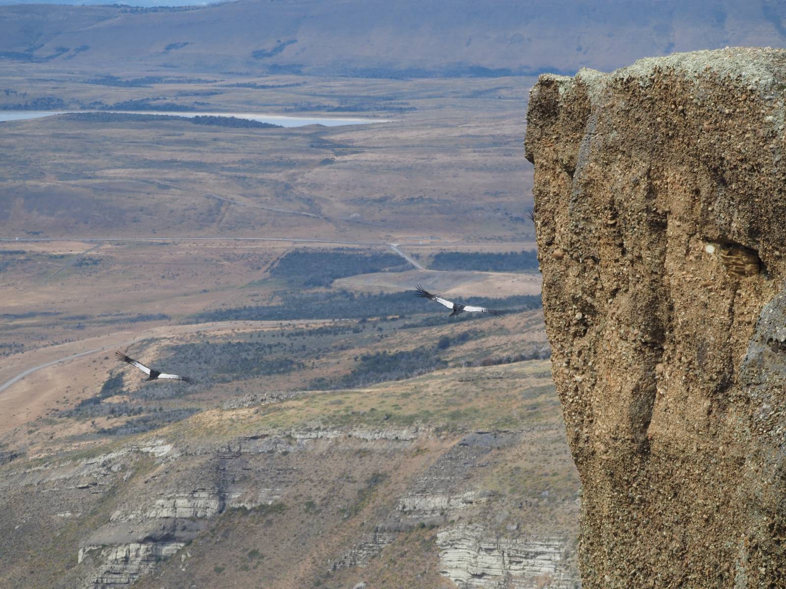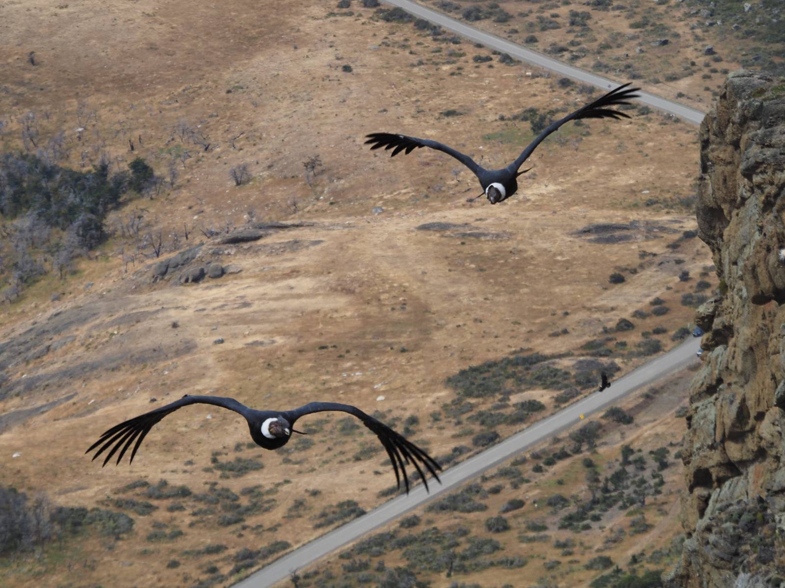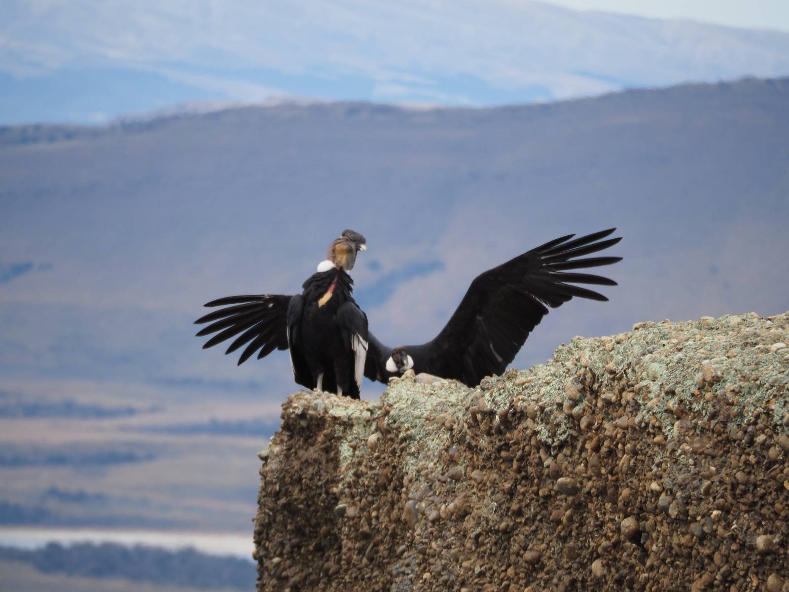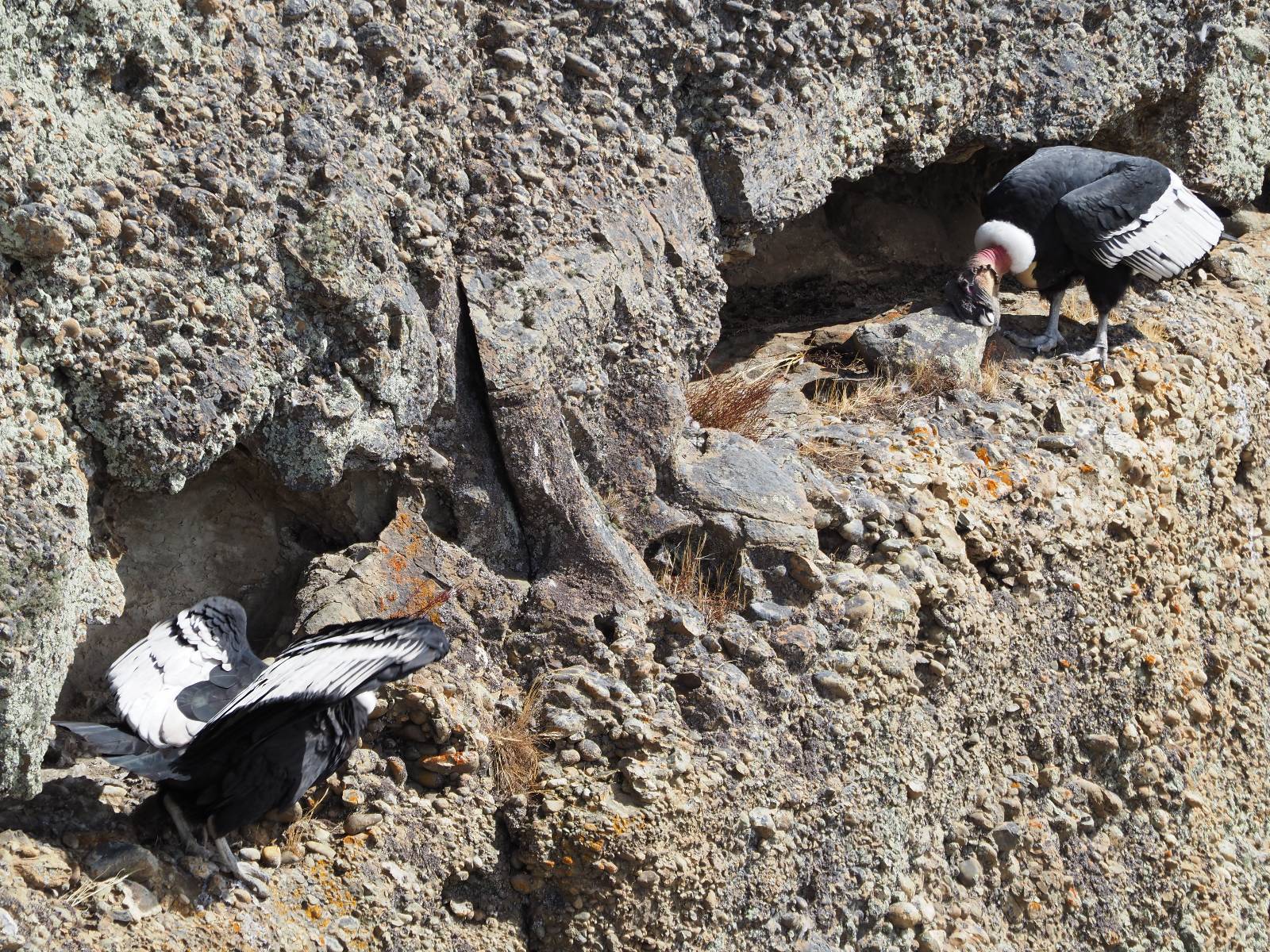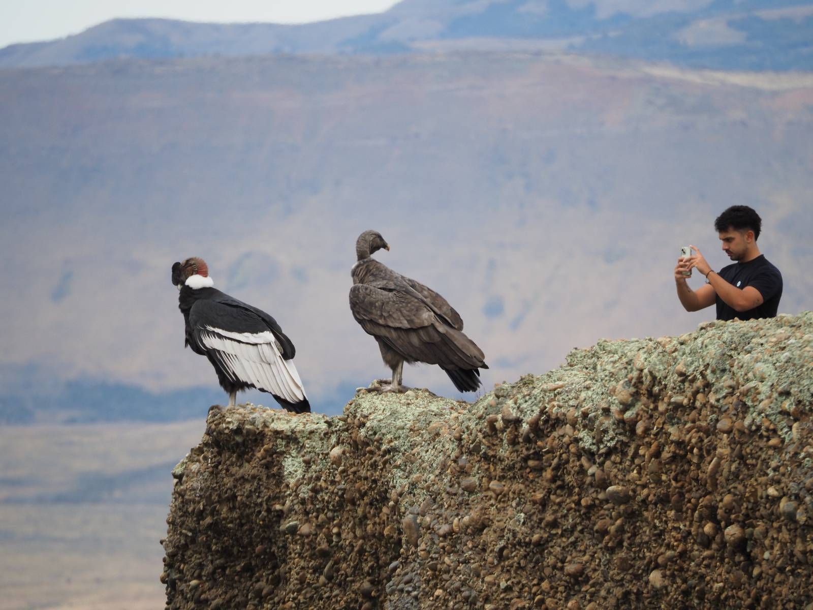 Ich denke ich muss mir das mal von nahem ansehen! Das Zäunchen ist zum Glück nicht hoch und bei meiner Schrittlänge kann ich auch so ganz einfach drüber steigen. Ich freue mich etwas schelmisch und dass ich nun doch auf den Benitez gehe auch wenn es jetzt noch einen schicken steilen Anstieg von ungefähr 30-40 Minuten gibt! Es ist tatsächlich anstrengend und ich schnaufe ganz ordentlich und ich merke meine rechte Ferse! Das war was ich befürchtet hatte! Ich habe schon immer das Problem das es da gerne drückt und gerade nun beim Aufwärtsgehen bekomme ich da ordentlich Druck. Es ist keine Blase die ich mir reibe, einfach nur Druck der unangenehm wird. Doch gleich habe ich es geschafft und der Schmerz ist vergessen! Was für eine irre schöne Aussicht hier oben und die Steilwand herunter auf den Lago Sofia! Ich packe die Drohne aus und lasse sie von mir wegfliegen, um die Dimension der Steilwand und die Landschaft drum herum zu filmen. Aber als wenn ich sie damit gerufen hätte tauchen plötzlich Condore auf. Nun bekomme ich widerum etwas Panik die Drohne wieder zu landen, ohne einen Unfall anzustellen. Es funktioniert aber ich vergesse dabei zu filmen. Aber macht nichts, jetzt die Kamera mit dem Tele und ich fotografiere wie wild, in der Hoffnung, wenigsten ein paar Condore gut zu erwischen! Was für ein Schauspiel! Wie krass sie so nahe an mir vorbeifliegen zu sehen! Ich war ja unten mit dem Pärchen schon beeindruckt aber das ist wirklich ein irres Erlebnis! Und wie groß sie sind! Dazu ihre Fluggeräusche, als wenn tatsächlich ein Flugzeug drüber weg geht. Ich bin hin und weg und etwas neidisch auf den Typen neben mir, der mit einer viel größeren Wumme draufhält! Der hat sicher geile Fotos!! Von ihm erfahre ich auch, daß die kleine Höhle von vorhin, das Nest von dem Paar war. Ein junger Condor will sich nur wenige Meter vor mir auf die Felskante setzen, merkt es aber und startet wieder durch. Aber da kann ich tatsächlich seine Größe etwas abschätzen. Sie werden bis ca. 120cm groß mit Spannweiten bis zu 320cm! Das glaube ich nun gerne…! Die Männer sind übrigens die mit mehr Gehänge…, am Kopf!