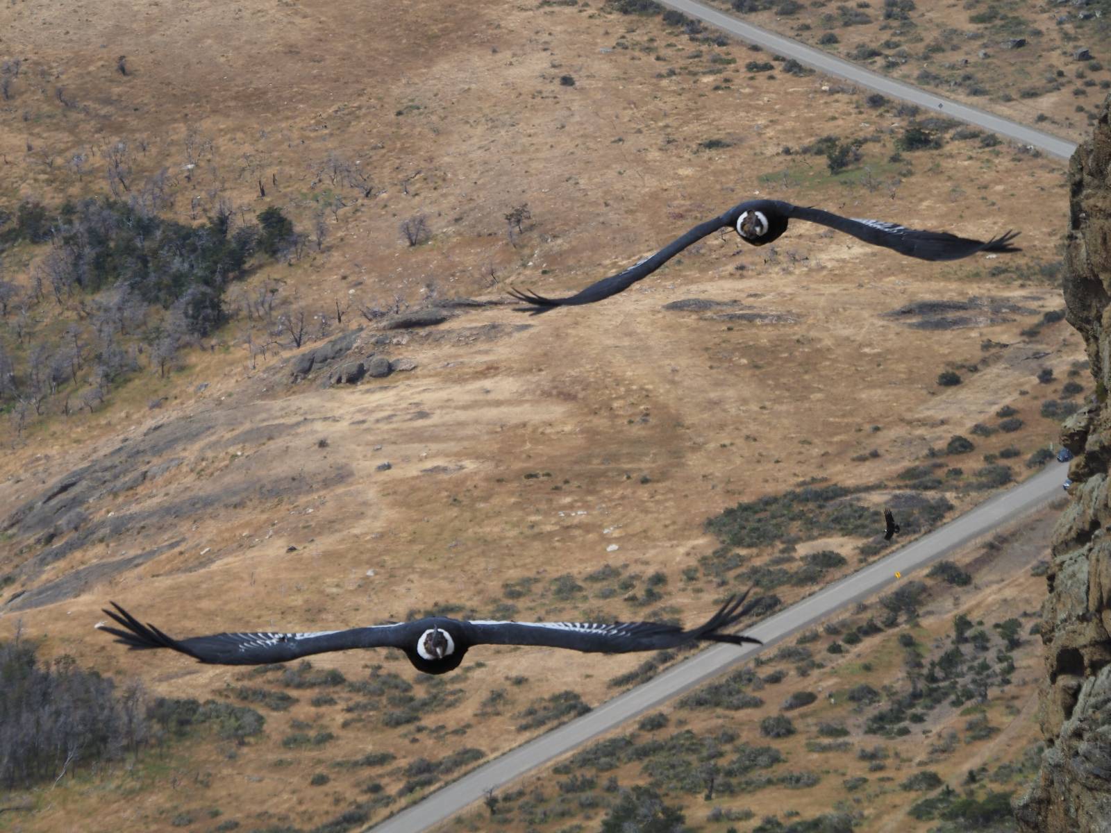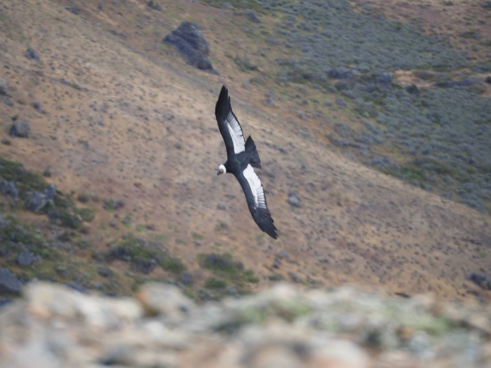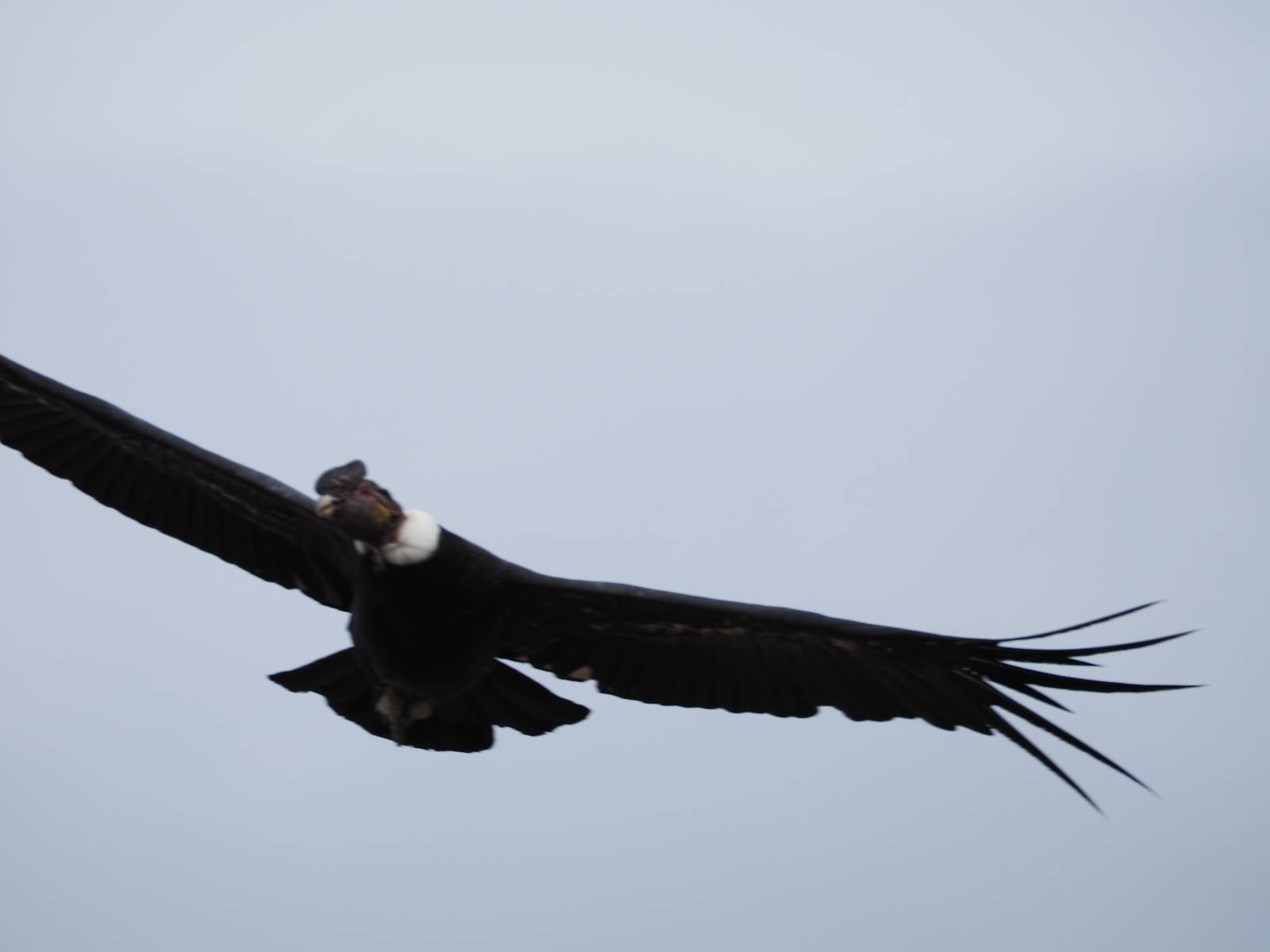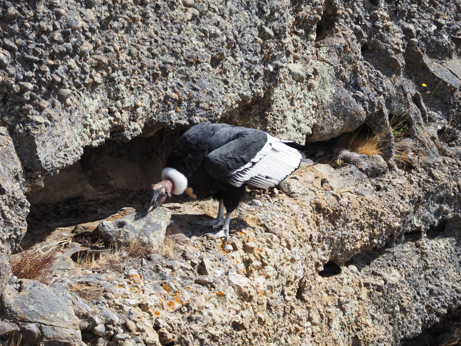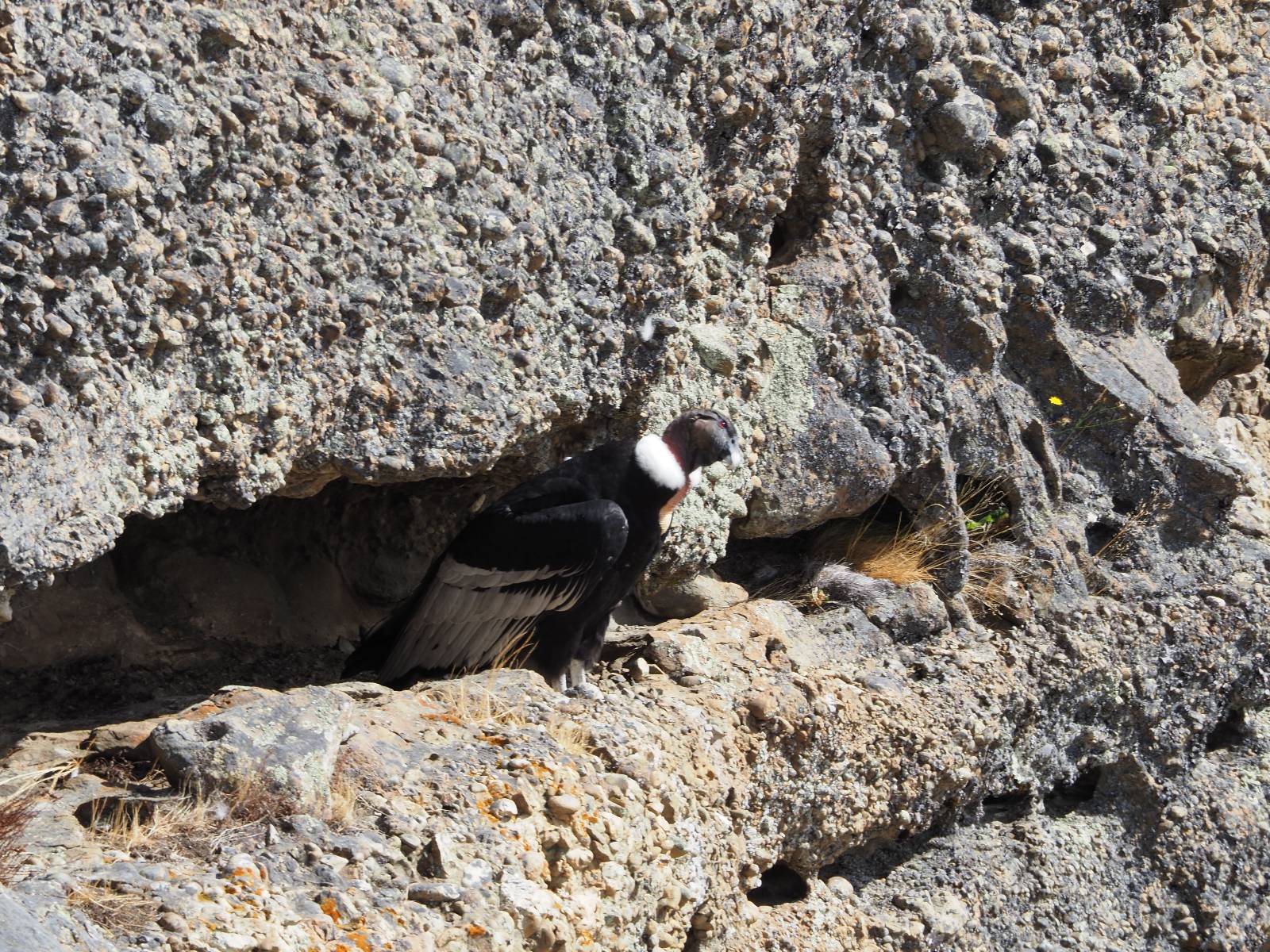Ich denke ich muss mir das mal von nahem ansehen! Das Zäunchen ist zum Glück nicht hoch und bei meiner Schrittlänge kann ich auch so ganz einfach drüber steigen. Ich freue mich etwas schelmisch und dass ich nun doch auf den Benitez gehe auch wenn es jetzt noch einen schicken steilen Anstieg von ungefähr 30-40 Minuten gibt! Es ist tatsächlich anstrengend und ich schnaufe ganz ordentlich und ich merke meine rechte Ferse! Das war was ich befürchtet hatte! Ich habe schon immer das Problem das es da gerne drückt und gerade nun beim Aufwärtsgehen bekomme ich da ordentlich Druck. Es ist keine Blase die ich mir reibe, einfach nur Druck der unangenehm wird. Doch gleich habe ich es geschafft und der Schmerz ist vergessen! Was für eine irre schöne Aussicht hier oben und die Steilwand herunter auf den Lago Sofia! Ich packe die Drohne aus und lasse sie von mir wegfliegen, um die Dimension der Steilwand und die Landschaft drum herum zu filmen. Aber als wenn ich sie damit gerufen hätte tauchen plötzlich Condore auf. Nun bekomme ich widerum etwas Panik die Drohne wieder zu landen, ohne einen Unfall anzustellen. Es funktioniert aber ich vergesse dabei zu filmen. Aber macht nichts, jetzt die Kamera mit dem Tele und ich fotografiere wie wild, in der Hoffnung, wenigsten ein paar Condore gut zu erwischen! Was für ein Schauspiel! Wie krass sie so nahe an mir vorbeifliegen zu sehen! Ich war ja unten mit dem Pärchen schon beeindruckt aber das ist wirklich ein irres Erlebnis! Und wie groß sie sind! Dazu ihre Fluggeräusche, als wenn tatsächlich ein Flugzeug drüber weg geht. Ich bin hin und weg und etwas neidisch auf den Typen neben mir, der mit einer viel größeren Wumme draufhält! Der hat sicher geile Fotos!! Von ihm erfahre ich auch, daß die kleine Höhle von vorhin, das Nest von dem Paar war. Ein junger Condor will sich nur wenige Meter vor mir auf die Felskante setzen, merkt es aber und startet wieder durch. Aber da kann ich tatsächlich seine Größe etwas abschätzen. Sie werden bis ca. 120cm groß mit Spannweiten bis zu 320cm! Das glaube ich nun gerne…! Die Männer sind übrigens die mit mehr Gehänge…, am Kopf!