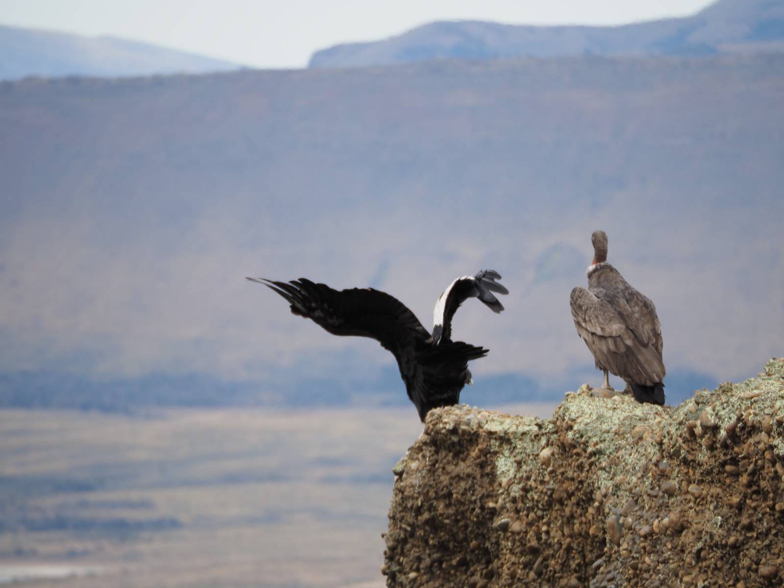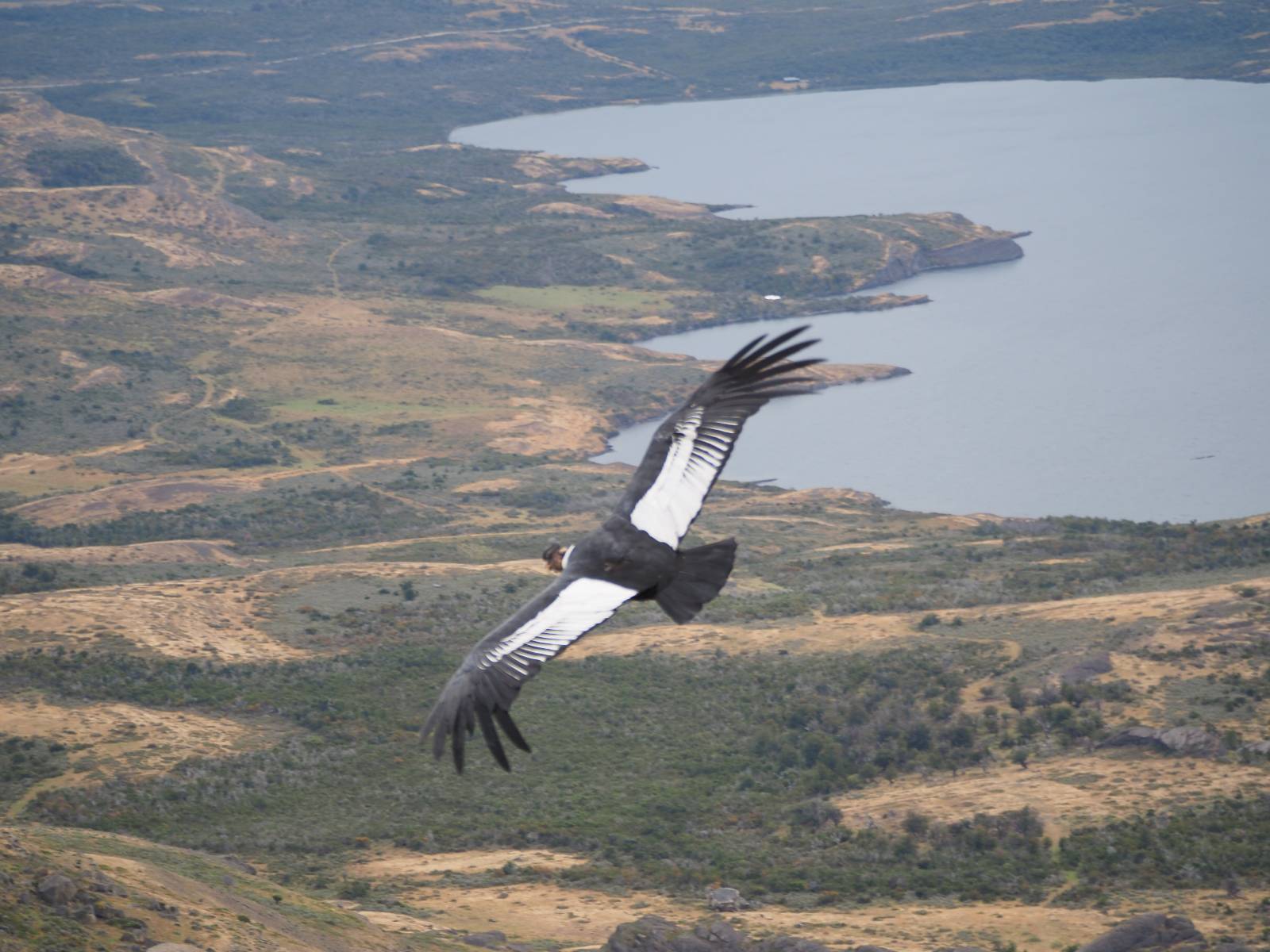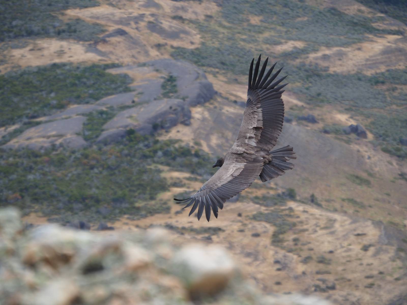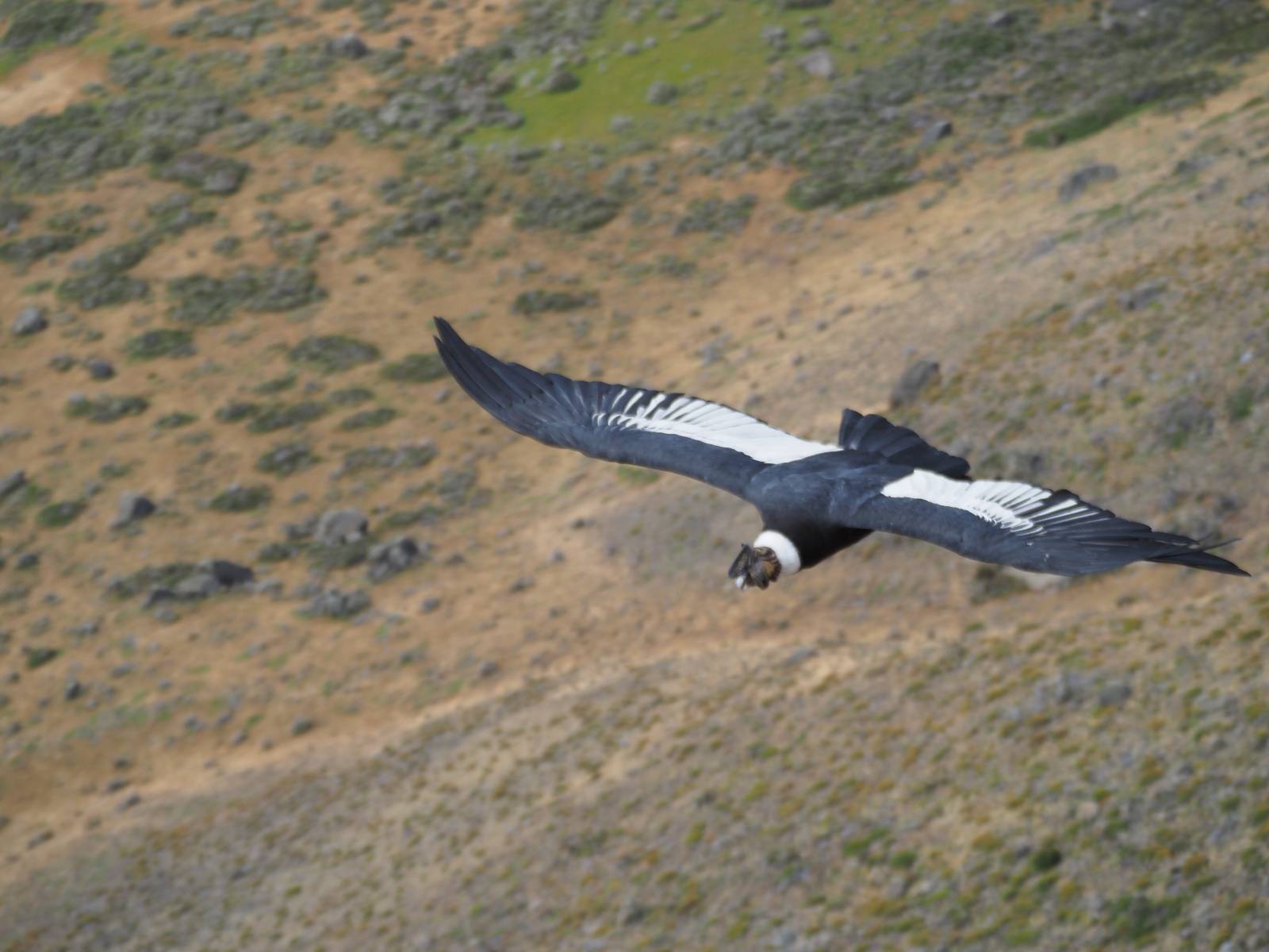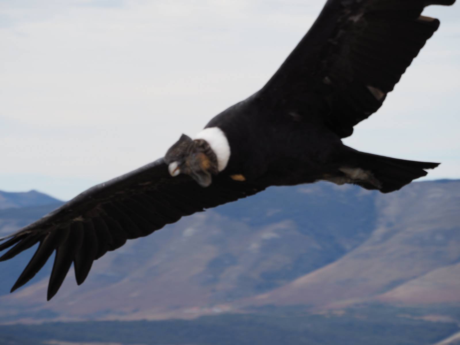 Ich denke ich muss mir das mal von nahem ansehen! Das Zäunchen ist zum Glück nicht hoch und bei meiner Schrittlänge kann ich auch so ganz einfach drüber steigen. Ich freue mich etwas schelmisch und dass ich nun doch auf den Benitez gehe auch wenn es jetzt noch einen schicken steilen Anstieg von ungefähr 30-40 Minuten gibt! Es ist tatsächlich anstrengend und ich schnaufe ganz ordentlich und ich merke meine rechte Ferse! Das war was ich befürchtet hatte! Ich habe schon immer das Problem das es da gerne drückt und gerade nun beim Aufwärtsgehen bekomme ich da ordentlich Druck. Es ist keine Blase die ich mir reibe, einfach nur Druck der unangenehm wird. Doch gleich habe ich es geschafft und der Schmerz ist vergessen! Was für eine irre schöne Aussicht hier oben und die Steilwand herunter auf den Lago Sofia! Ich packe die Drohne aus und lasse sie von mir wegfliegen, um die Dimension der Steilwand und die Landschaft drum herum zu filmen. Aber als wenn ich sie damit gerufen hätte tauchen plötzlich Condore auf. Nun bekomme ich widerum etwas Panik die Drohne wieder zu landen, ohne einen Unfall anzustellen. Es funktioniert aber ich vergesse dabei zu filmen. Aber macht nichts, jetzt die Kamera mit dem Tele und ich fotografiere wie wild, in der Hoffnung, wenigsten ein paar Condore gut zu erwischen! Was für ein Schauspiel! Wie krass sie so nahe an mir vorbeifliegen zu sehen! Ich war ja unten mit dem Pärchen schon beeindruckt aber das ist wirklich ein irres Erlebnis! Und wie groß sie sind! Dazu ihre Fluggeräusche, als wenn tatsächlich ein Flugzeug drüber weg geht. Ich bin hin und weg und etwas neidisch auf den Typen neben mir, der mit einer viel größeren Wumme draufhält! Der hat sicher geile Fotos!! Von ihm erfahre ich auch, daß die kleine Höhle von vorhin, das Nest von dem Paar war. Ein junger Condor will sich nur wenige Meter vor mir auf die Felskante setzen, merkt es aber und startet wieder durch. Aber da kann ich tatsächlich seine Größe etwas abschätzen. Sie werden bis ca. 120cm groß mit Spannweiten bis zu 320cm! Das glaube ich nun gerne…! Die Männer sind übrigens die mit mehr Gehänge…, am Kopf!