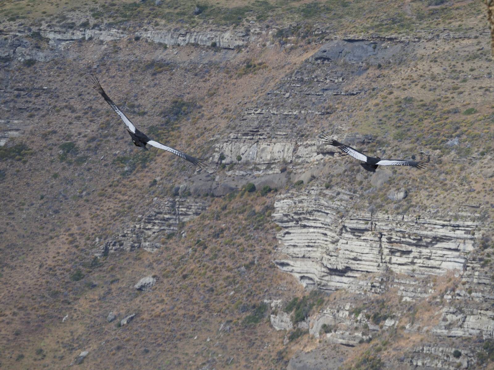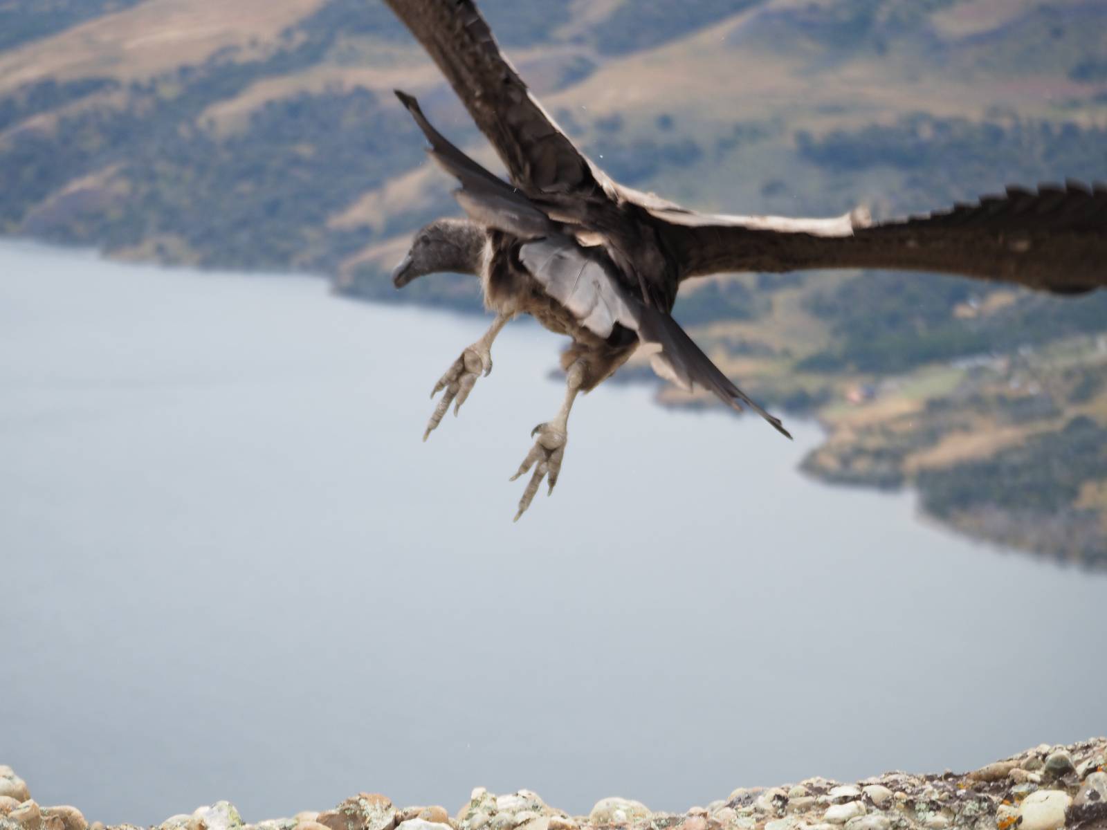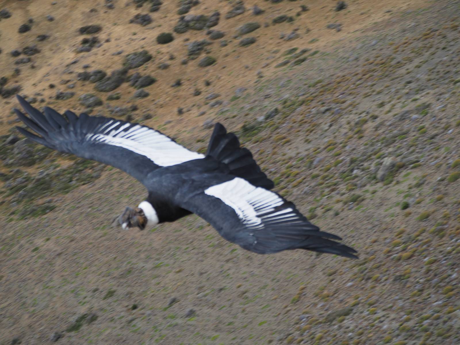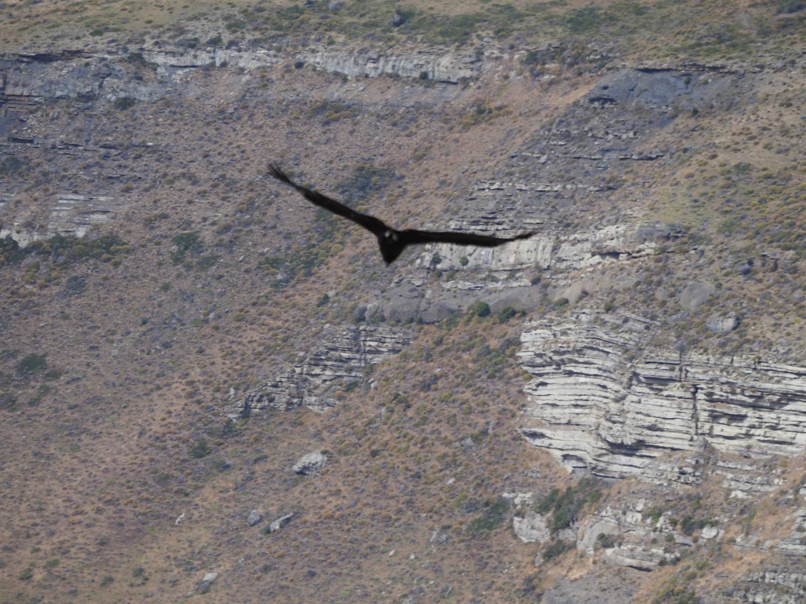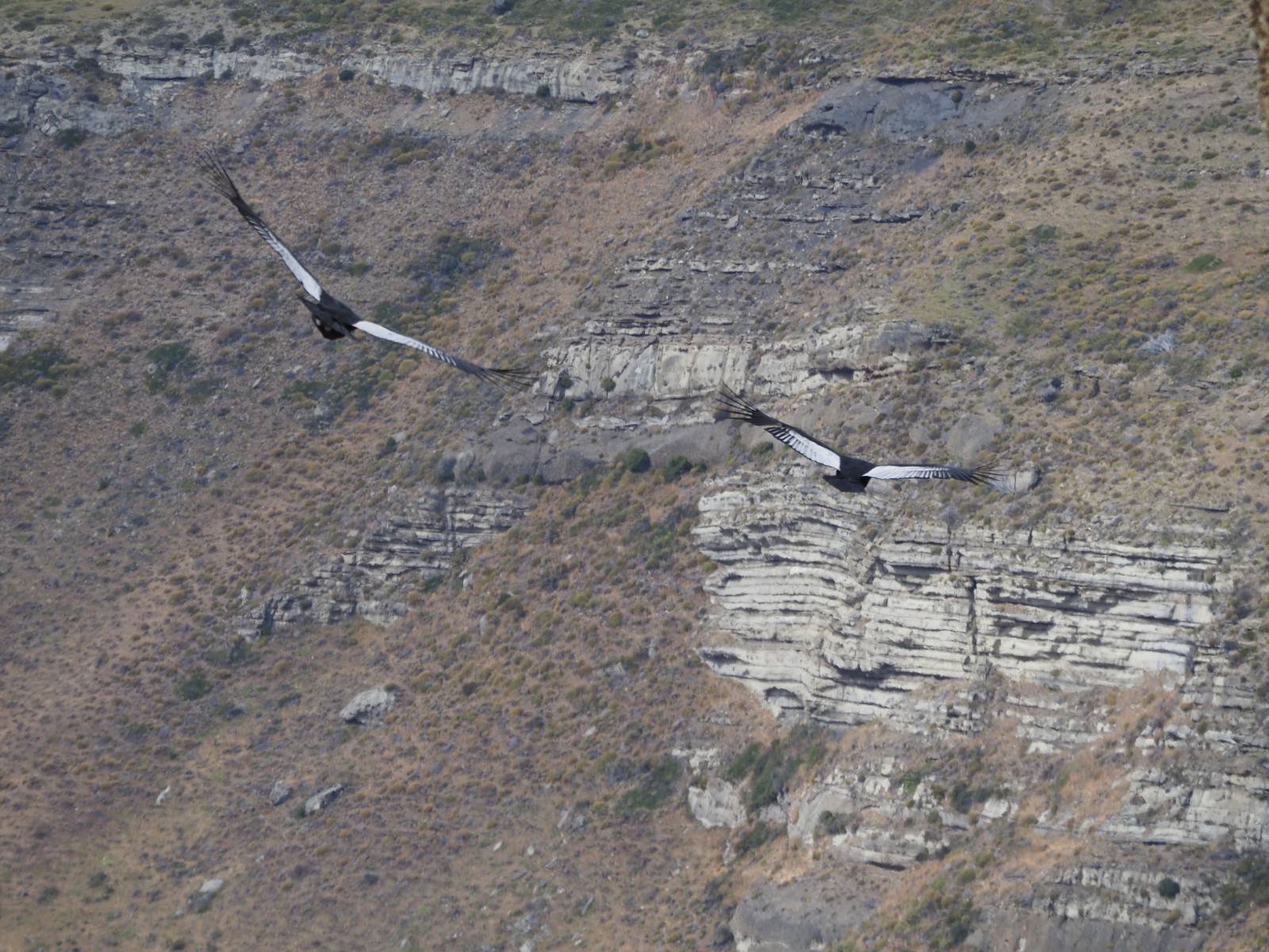 Ich denke ich muss mir das mal von nahem ansehen! Das Zäunchen ist zum Glück nicht hoch und bei meiner Schrittlänge kann ich auch so ganz einfach drüber steigen. Ich freue mich etwas schelmisch und dass ich nun doch auf den Benitez gehe auch wenn es jetzt noch einen schicken steilen Anstieg von ungefähr 30-40 Minuten gibt! Es ist tatsächlich anstrengend und ich schnaufe ganz ordentlich und ich merke meine rechte Ferse! Das war was ich befürchtet hatte! Ich habe schon immer das Problem das es da gerne drückt und gerade nun beim Aufwärtsgehen bekomme ich da ordentlich Druck. Es ist keine Blase die ich mir reibe, einfach nur Druck der unangenehm wird. Doch gleich habe ich es geschafft und der Schmerz ist vergessen! Was für eine irre schöne Aussicht hier oben und die Steilwand herunter auf den Lago Sofia! Ich packe die Drohne aus und lasse sie von mir wegfliegen, um die Dimension der Steilwand und die Landschaft drum herum zu filmen. Aber als wenn ich sie damit gerufen hätte tauchen plötzlich Condore auf. Nun bekomme ich widerum etwas Panik die Drohne wieder zu landen, ohne einen Unfall anzustellen. Es funktioniert aber ich vergesse dabei zu filmen. Aber macht nichts, jetzt die Kamera mit dem Tele und ich fotografiere wie wild, in der Hoffnung, wenigsten ein paar Condore gut zu erwischen! Was für ein Schauspiel! Wie krass sie so nahe an mir vorbeifliegen zu sehen! Ich war ja unten mit dem Pärchen schon beeindruckt aber das ist wirklich ein irres Erlebnis! Und wie groß sie sind! Dazu ihre Fluggeräusche, als wenn tatsächlich ein Flugzeug drüber weg geht. Ich bin hin und weg und etwas neidisch auf den Typen neben mir, der mit einer viel größeren Wumme draufhält! Der hat sicher geile Fotos!! Von ihm erfahre ich auch, daß die kleine Höhle von vorhin, das Nest von dem Paar war. Ein junger Condor will sich nur wenige Meter vor mir auf die Felskante setzen, merkt es aber und startet wieder durch. Aber da kann ich tatsächlich seine Größe etwas abschätzen. Sie werden bis ca. 120cm groß mit Spannweiten bis zu 320cm! Das glaube ich nun gerne…! Die Männer sind übrigens die mit mehr Gehänge…, am Kopf!