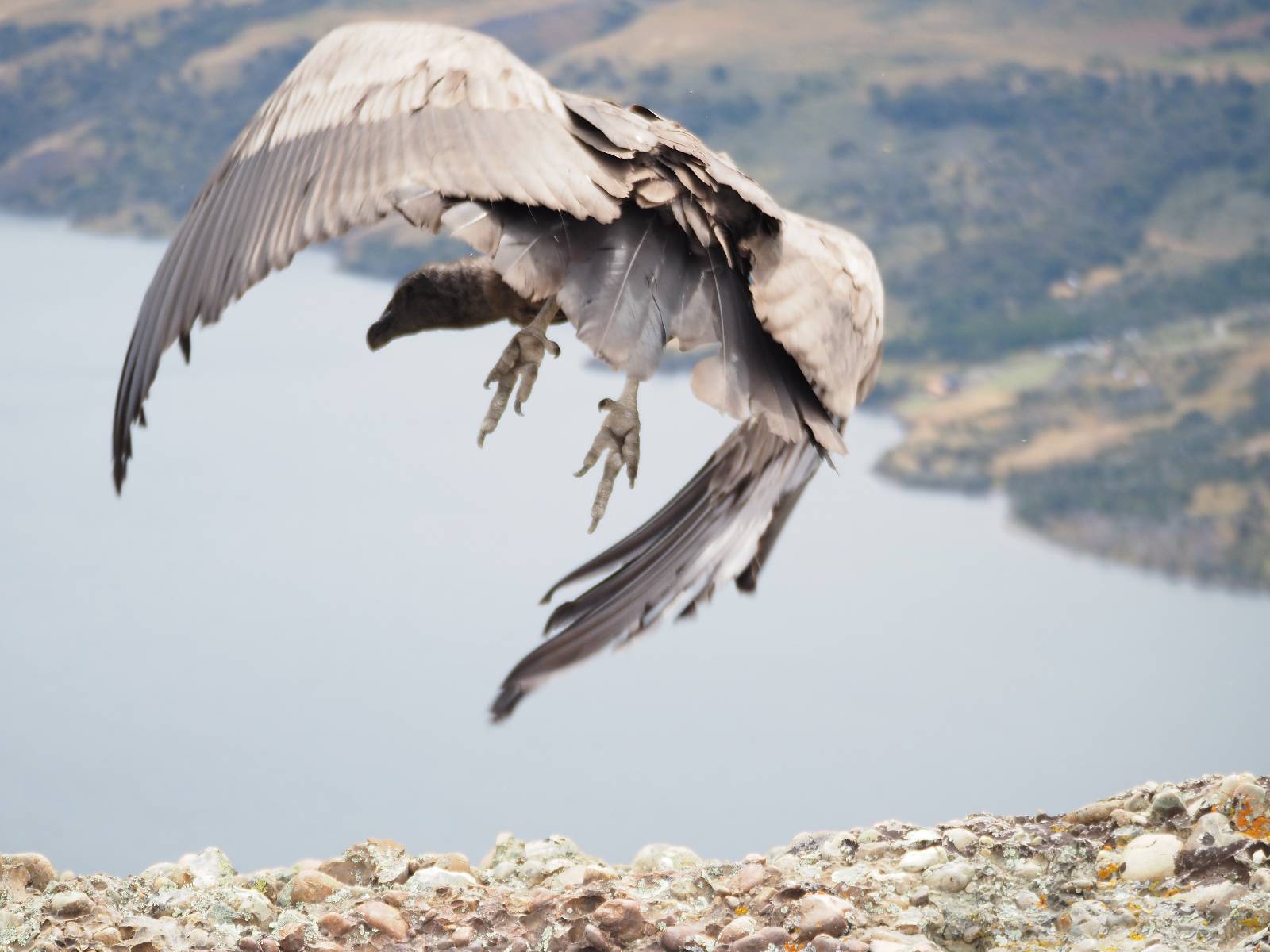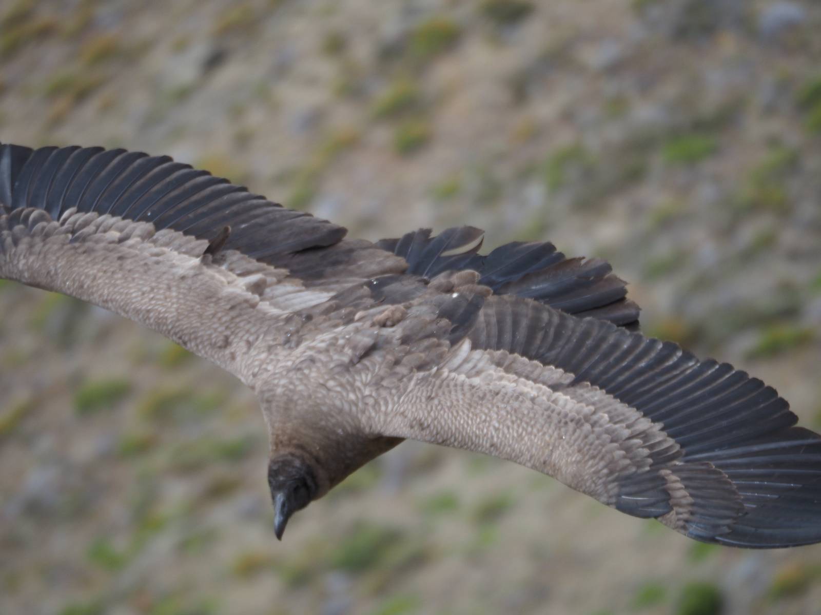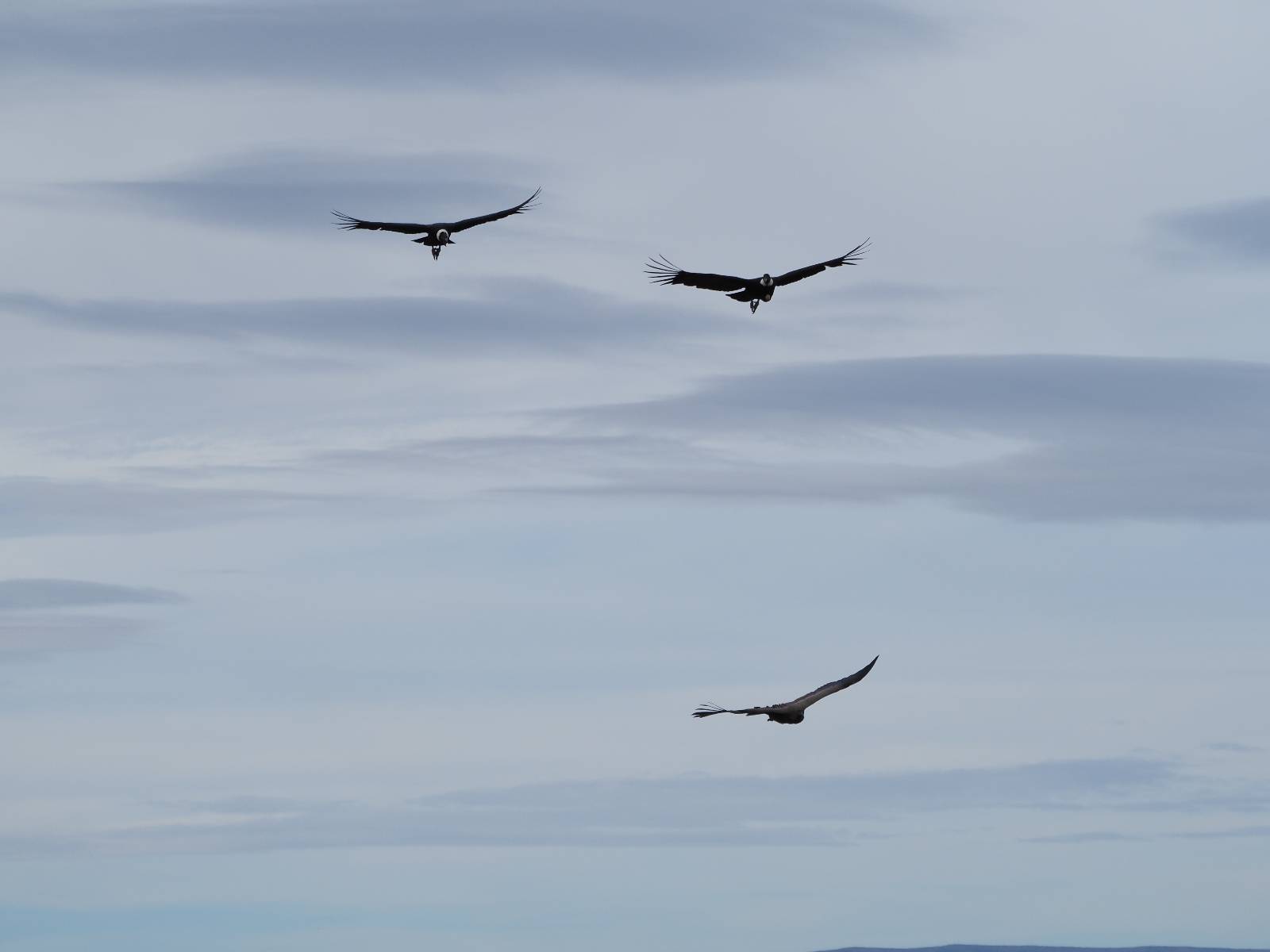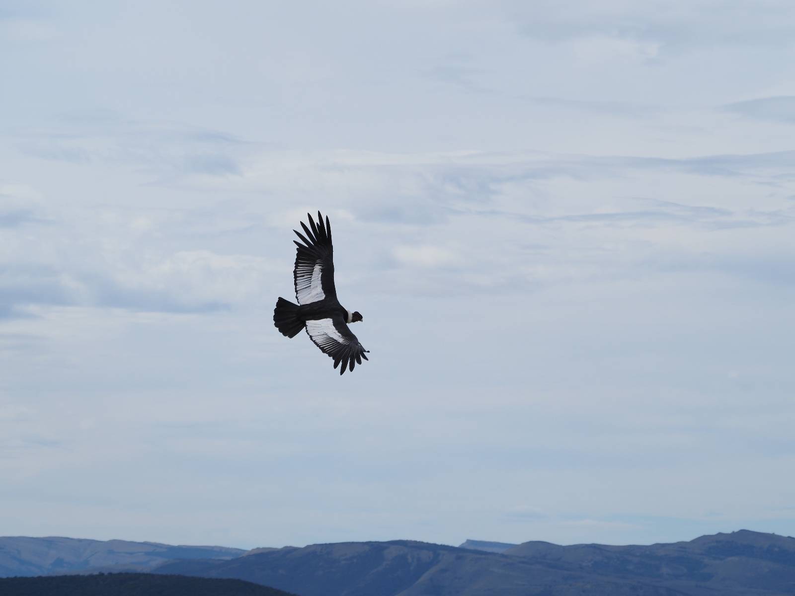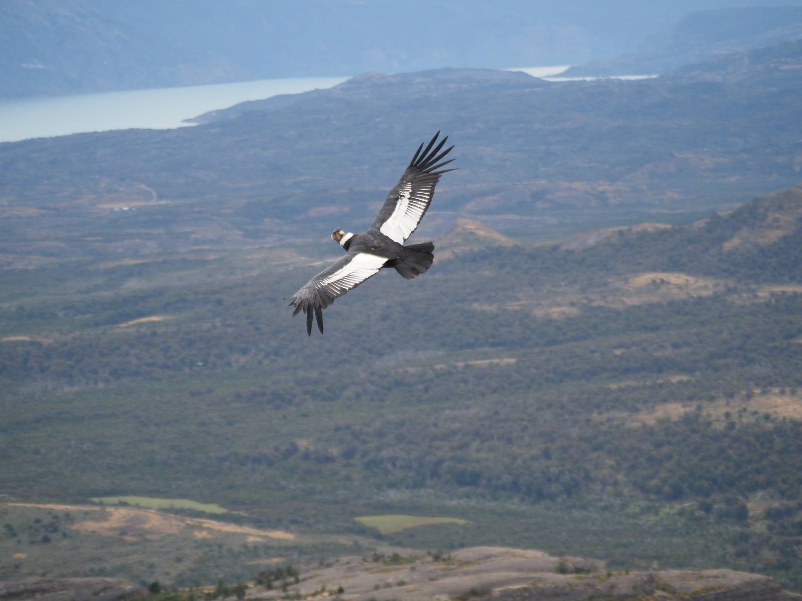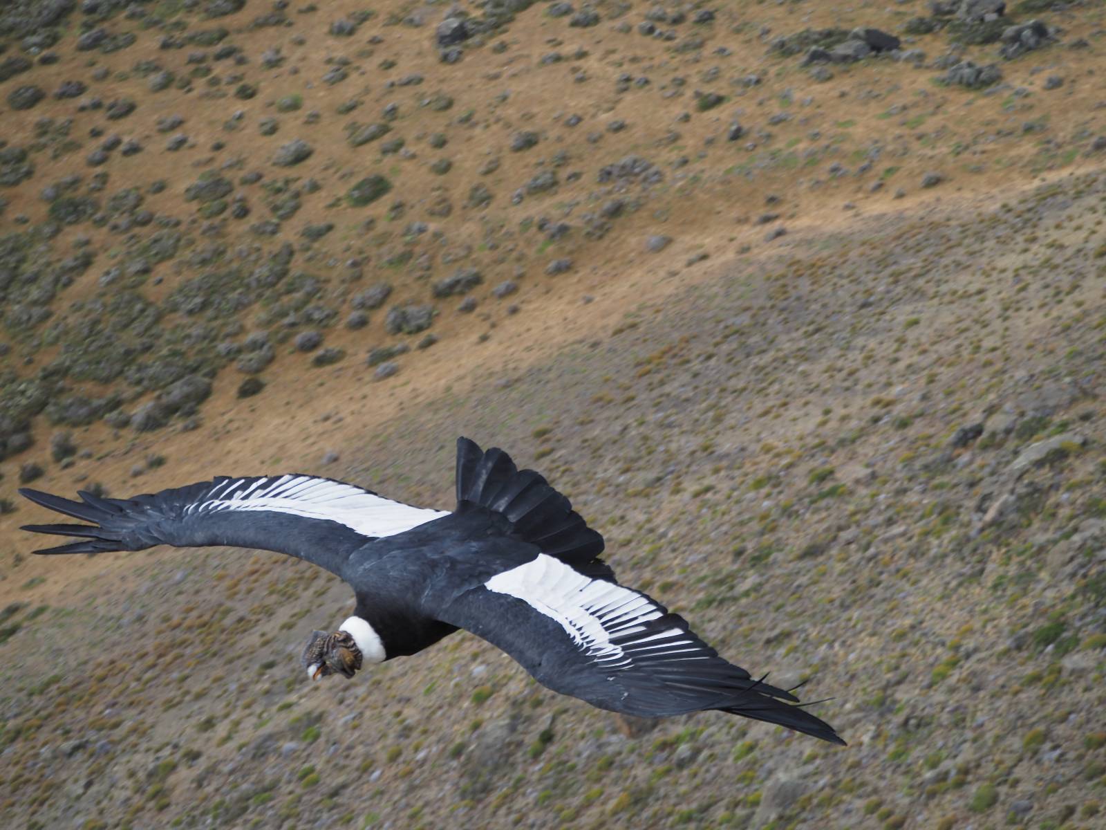 Ich denke ich muss mir das mal von nahem ansehen! Das Zäunchen ist zum Glück nicht hoch und bei meiner Schrittlänge kann ich auch so ganz einfach drüber steigen. Ich freue mich etwas schelmisch und dass ich nun doch auf den Benitez gehe auch wenn es jetzt noch einen schicken steilen Anstieg von ungefähr 30-40 Minuten gibt! Es ist tatsächlich anstrengend und ich schnaufe ganz ordentlich und ich merke meine rechte Ferse! Das war was ich befürchtet hatte! Ich habe schon immer das Problem das es da gerne drückt und gerade nun beim Aufwärtsgehen bekomme ich da ordentlich Druck. Es ist keine Blase die ich mir reibe, einfach nur Druck der unangenehm wird. Doch gleich habe ich es geschafft und der Schmerz ist vergessen! Was für eine irre schöne Aussicht hier oben und die Steilwand herunter auf den Lago Sofia! Ich packe die Drohne aus und lasse sie von mir wegfliegen, um die Dimension der Steilwand und die Landschaft drum herum zu filmen. Aber als wenn ich sie damit gerufen hätte tauchen plötzlich Condore auf. Nun bekomme ich widerum etwas Panik die Drohne wieder zu landen, ohne einen Unfall anzustellen. Es funktioniert aber ich vergesse dabei zu filmen. Aber macht nichts, jetzt die Kamera mit dem Tele und ich fotografiere wie wild, in der Hoffnung, wenigsten ein paar Condore gut zu erwischen! Was für ein Schauspiel! Wie krass sie so nahe an mir vorbeifliegen zu sehen! Ich war ja unten mit dem Pärchen schon beeindruckt aber das ist wirklich ein irres Erlebnis! Und wie groß sie sind! Dazu ihre Fluggeräusche, als wenn tatsächlich ein Flugzeug drüber weg geht. Ich bin hin und weg und etwas neidisch auf den Typen neben mir, der mit einer viel größeren Wumme draufhält! Der hat sicher geile Fotos!! Von ihm erfahre ich auch, daß die kleine Höhle von vorhin, das Nest von dem Paar war. Ein junger Condor will sich nur wenige Meter vor mir auf die Felskante setzen, merkt es aber und startet wieder durch. Aber da kann ich tatsächlich seine Größe etwas abschätzen. Sie werden bis ca. 120cm groß mit Spannweiten bis zu 320cm! Das glaube ich nun gerne…! Die Männer sind übrigens die mit mehr Gehänge…, am Kopf!