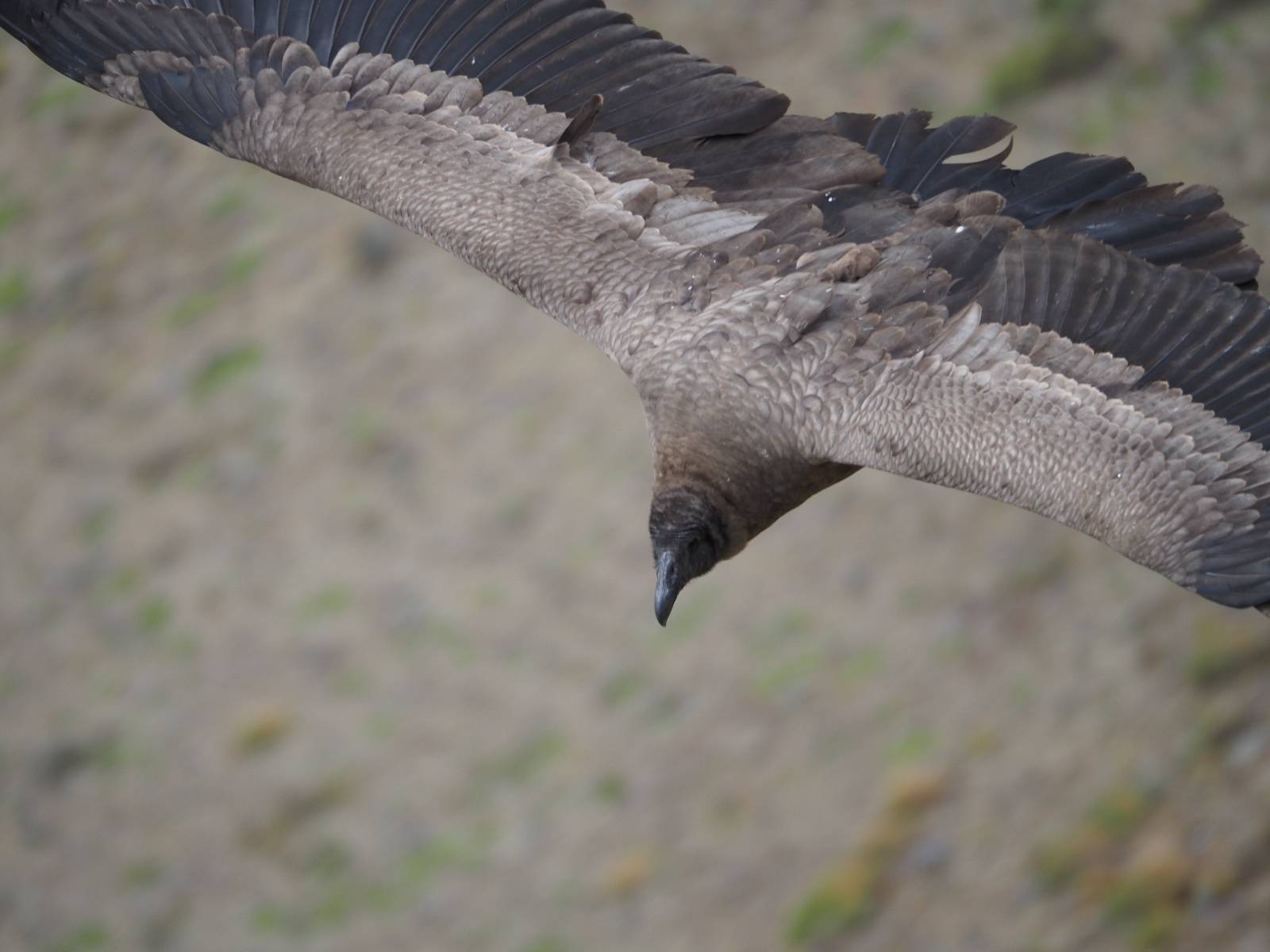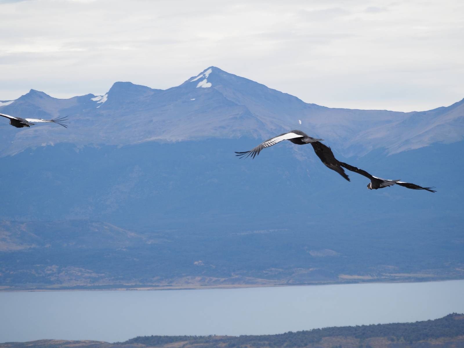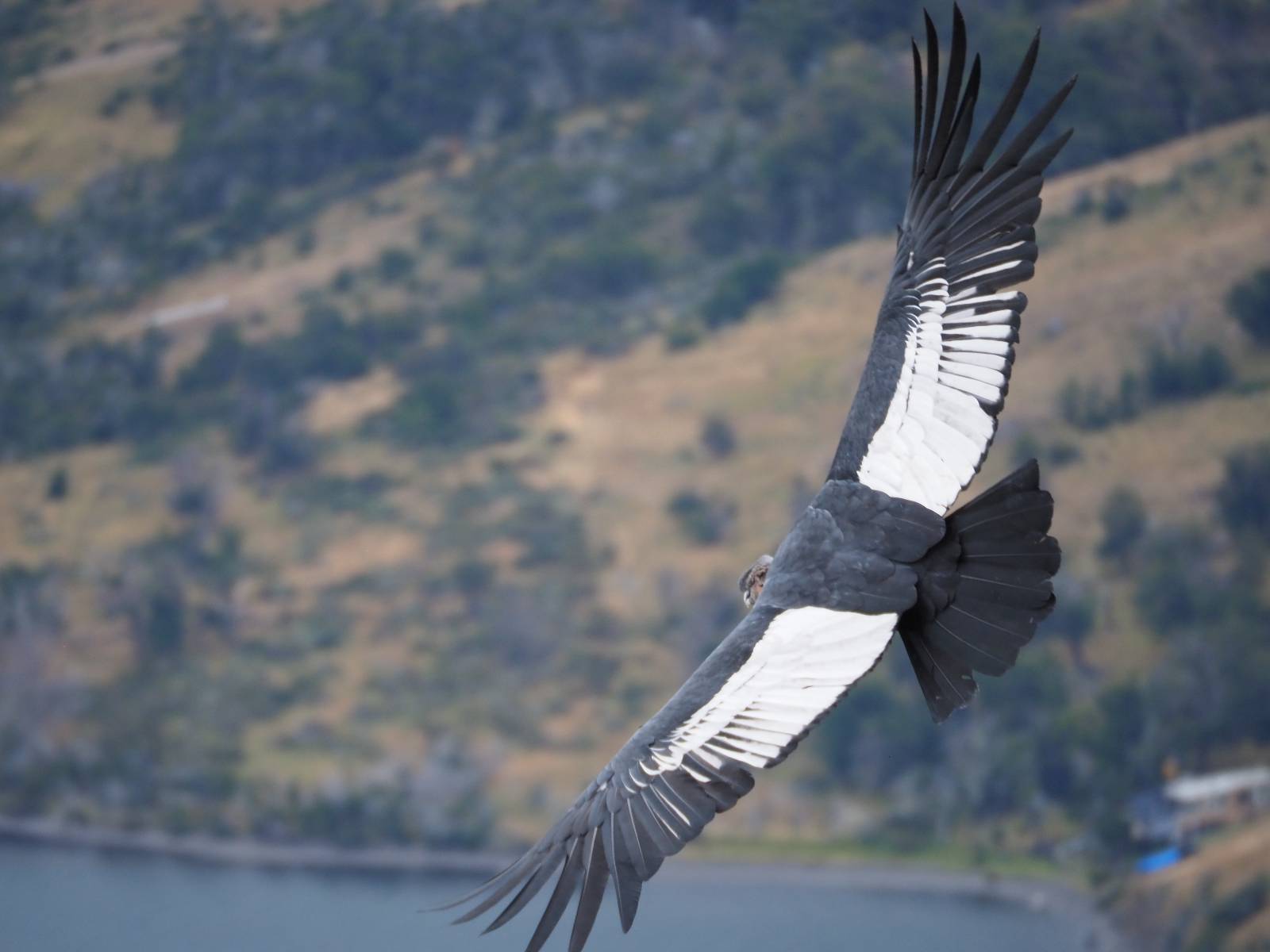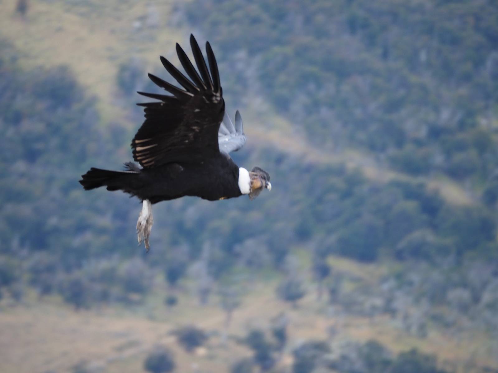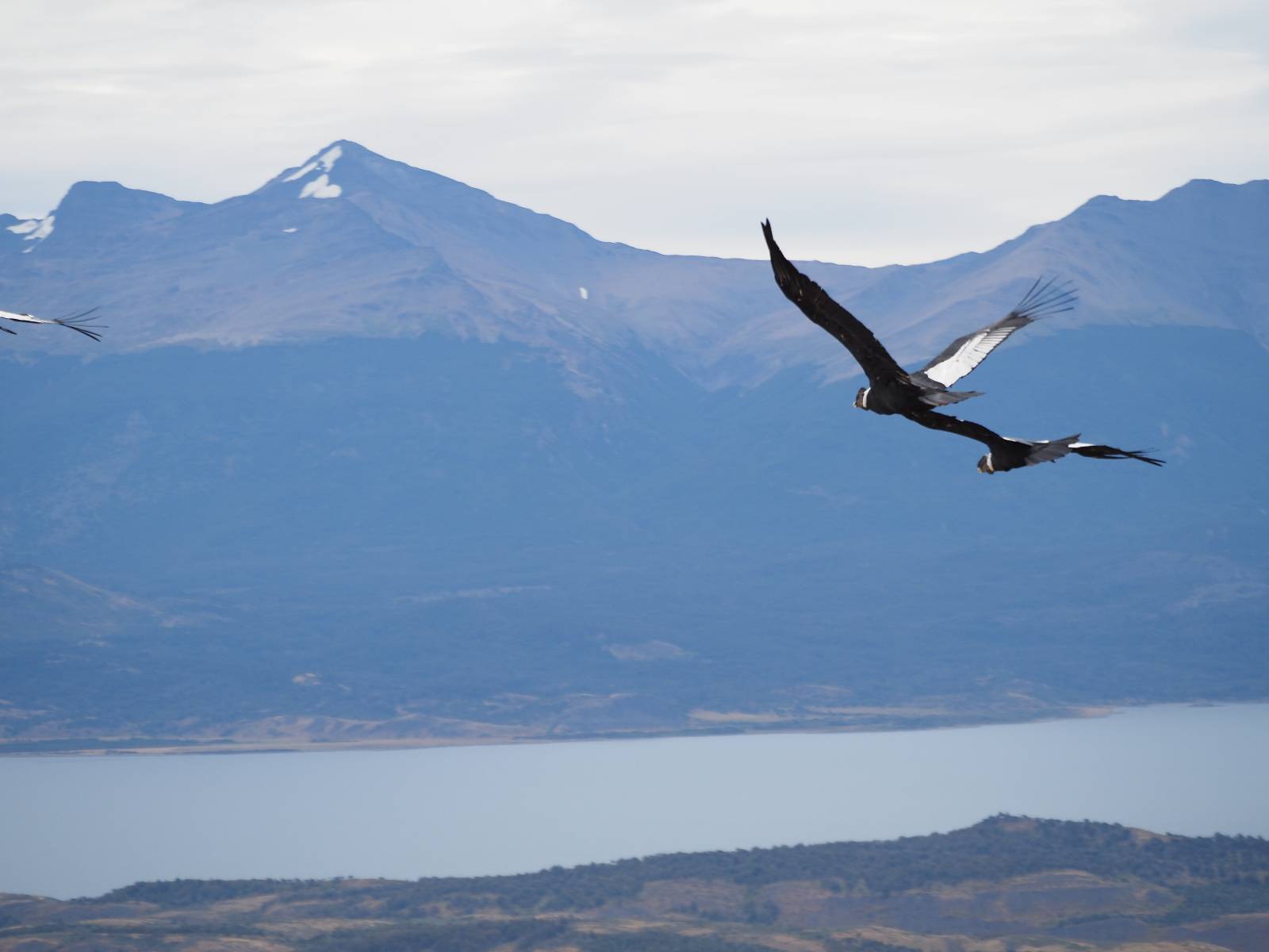 Ich denke ich muss mir das mal von nahem ansehen! Das Zäunchen ist zum Glück nicht hoch und bei meiner Schrittlänge kann ich auch so ganz einfach drüber steigen. Ich freue mich etwas schelmisch und dass ich nun doch auf den Benitez gehe auch wenn es jetzt noch einen schicken steilen Anstieg von ungefähr 30-40 Minuten gibt! Es ist tatsächlich anstrengend und ich schnaufe ganz ordentlich und ich merke meine rechte Ferse! Das war was ich befürchtet hatte! Ich habe schon immer das Problem das es da gerne drückt und gerade nun beim Aufwärtsgehen bekomme ich da ordentlich Druck. Es ist keine Blase die ich mir reibe, einfach nur Druck der unangenehm wird. Doch gleich habe ich es geschafft und der Schmerz ist vergessen! Was für eine irre schöne Aussicht hier oben und die Steilwand herunter auf den Lago Sofia! Ich packe die Drohne aus und lasse sie von mir wegfliegen, um die Dimension der Steilwand und die Landschaft drum herum zu filmen. Aber als wenn ich sie damit gerufen hätte tauchen plötzlich Condore auf. Nun bekomme ich widerum etwas Panik die Drohne wieder zu landen, ohne einen Unfall anzustellen. Es funktioniert aber ich vergesse dabei zu filmen. Aber macht nichts, jetzt die Kamera mit dem Tele und ich fotografiere wie wild, in der Hoffnung, wenigsten ein paar Condore gut zu erwischen! Was für ein Schauspiel! Wie krass sie so nahe an mir vorbeifliegen zu sehen! Ich war ja unten mit dem Pärchen schon beeindruckt aber das ist wirklich ein irres Erlebnis! Und wie groß sie sind! Dazu ihre Fluggeräusche, als wenn tatsächlich ein Flugzeug drüber weg geht. Ich bin hin und weg und etwas neidisch auf den Typen neben mir, der mit einer viel größeren Wumme draufhält! Der hat sicher geile Fotos!! Von ihm erfahre ich auch, daß die kleine Höhle von vorhin, das Nest von dem Paar war. Ein junger Condor will sich nur wenige Meter vor mir auf die Felskante setzen, merkt es aber und startet wieder durch. Aber da kann ich tatsächlich seine Größe etwas abschätzen. Sie werden bis ca. 120cm groß mit Spannweiten bis zu 320cm! Das glaube ich nun gerne…! Die Männer sind übrigens die mit mehr Gehänge…, am Kopf!