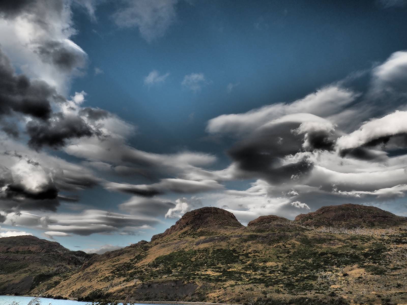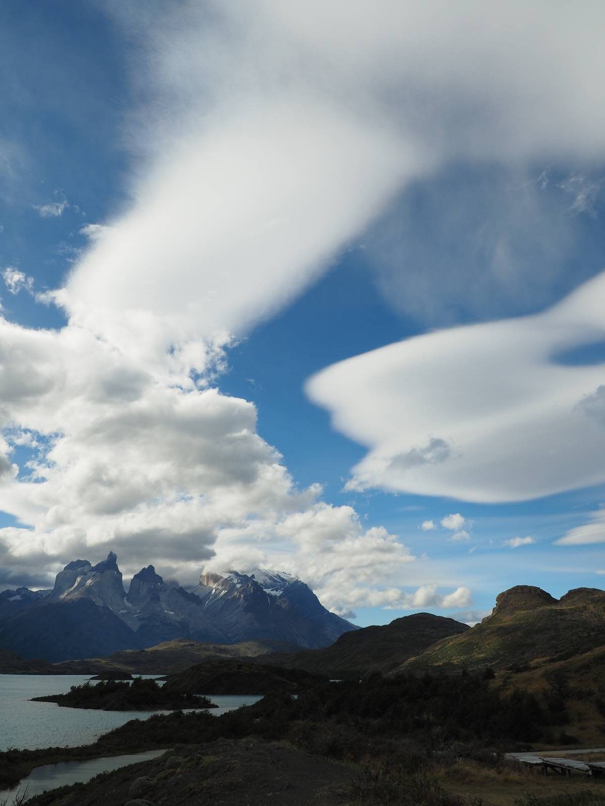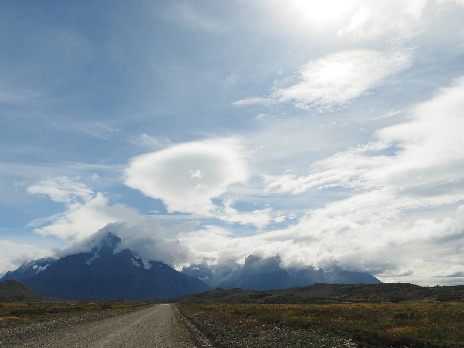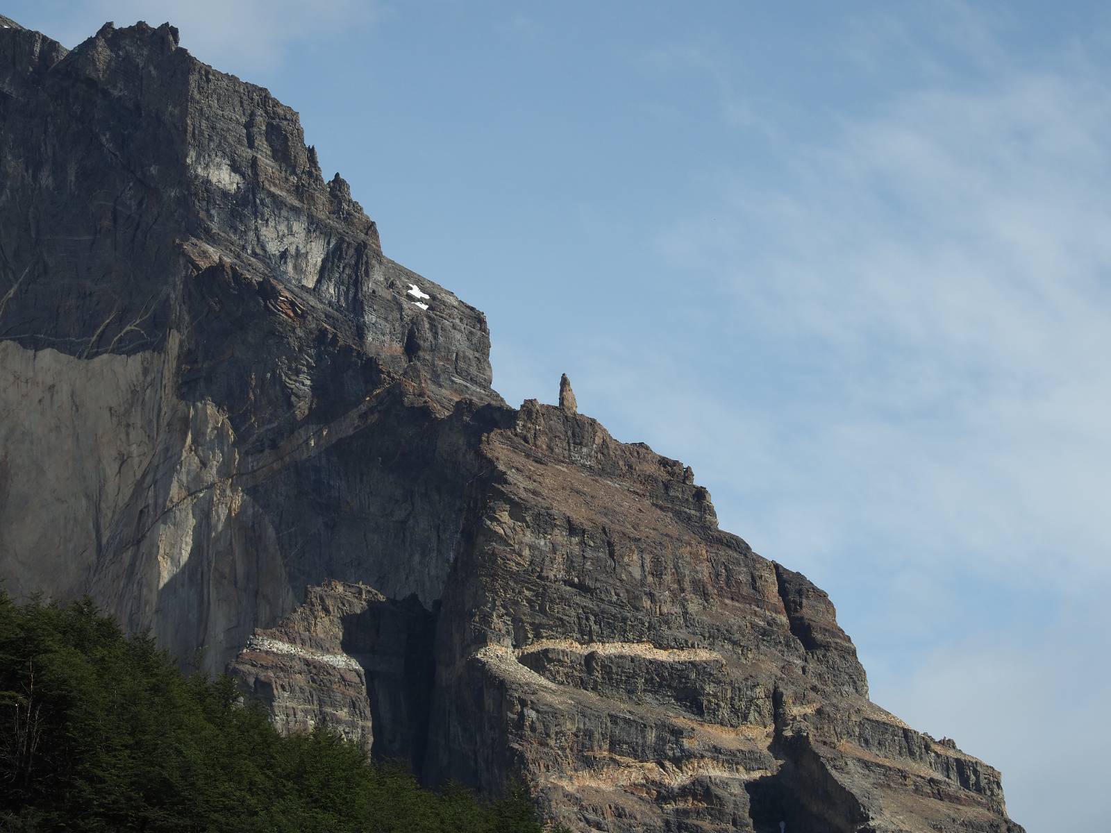 Der Weg ist gar nicht mehr so lang aber ich genieße das gemütliche Fahren und mache noch einige Fotostops, bis ich an den Campingplatz komme. Der sieht tatsächlich ganz normal aus!! Ich halte an und frage und für mein Zelt wollen sie ca. 20,- EUR haben. Ich bleibe eine Nacht, verstehe aber nicht, daß ich kaum Informationen gefunden habe, daß der Platz tatsächlich nicht so teuer ist und genügend Platz hat. Das Zelt ist bald aufgebaut und so schaue ich ins Restaurant und kaufe mir da ein kleines Bier. Das allerdings ist dann doch teuer! 8,- EUR für eine 0,33l Flasche! Aber das eine gönne ich mir und gehe etwas weiter vorn auf einen kleinen Aussichtspunkt mit Bänkchen und herrlichstem Blick über einen See auf das rückseitige Torre-Massiv. Ich erwische eine wunderbare Abendstimmung und hocke eine ganze Weile dort, bis ich mich zurück ins Restaurant begebe, um etwas zu essen. Auch das Essen ist teuer, einfach aber soweit ok. Ich hole mir meine Tüte Chips, die ich irgend wann aus Lust gekauft hatte und nun schon eine Weile mit mir rumfahre und gehe zurück auf das Bänkchen und lasse beim Anblick des vor mir liegenden Massivs die Chips knacken. Der tiefe Taleinschnitt ist also der mittlere Zacken vom „W“ den man laufen könnte. Ich erkenne Gesichter in den Felsen und habe mir bald drei Piraten rausgeschaut, die nun ständig zu mir zurück blicken. Oben scheint der Wind ganz gut zu gehen, so wie die linsenförmigen Wolken aussehen aber das stört den Condor der da kreist nicht. So langsam tauchen die ersten Sterne auf und die Sonne erleuchte nur noch ein paar Bergkanten und -spitzen in einem leichten Rot. Heute sollen alle Planeten in einer Linie zu sehen sein aber meine App sagt, dass die meisten noch unterm Horizont versteckt sind und außerdem ziehen aus der Richtung ein paar Wolken auf. Als es mir zu frisch wird gehe ich dann doch zurück und verkrieche mich in mein Zelt.