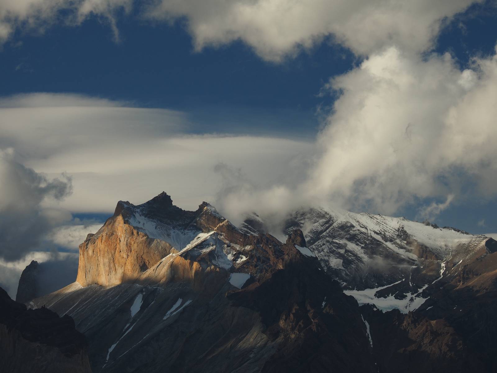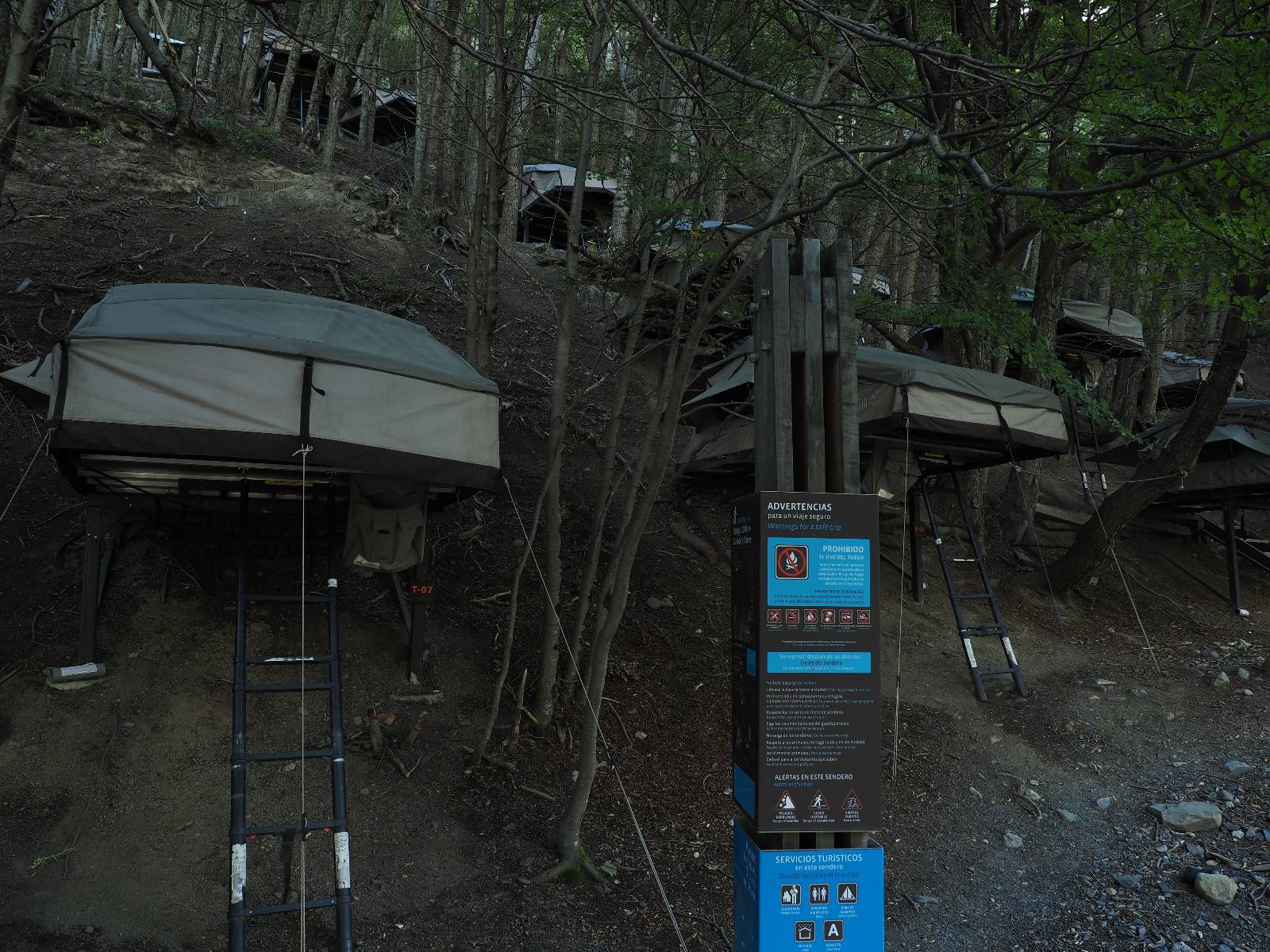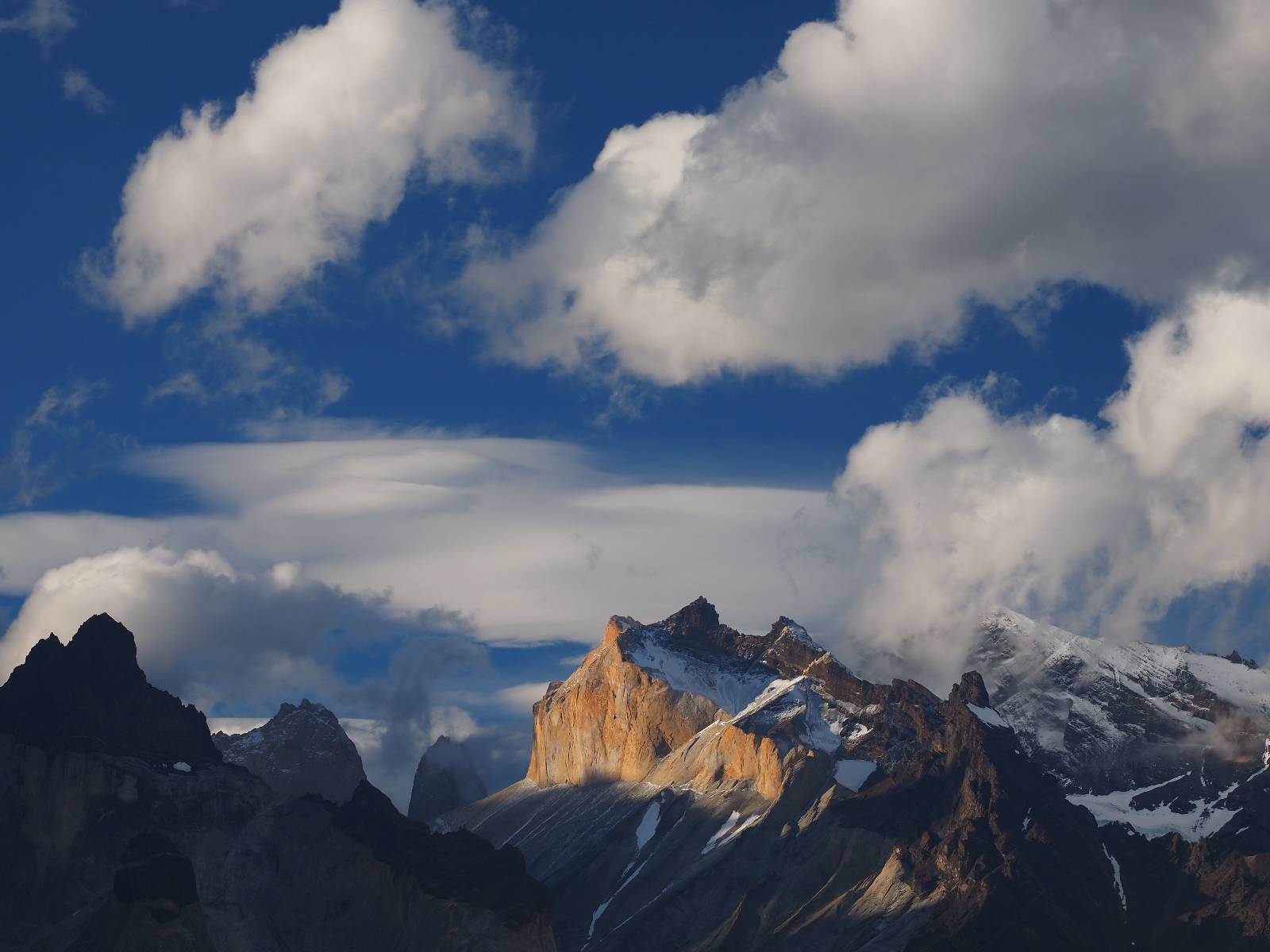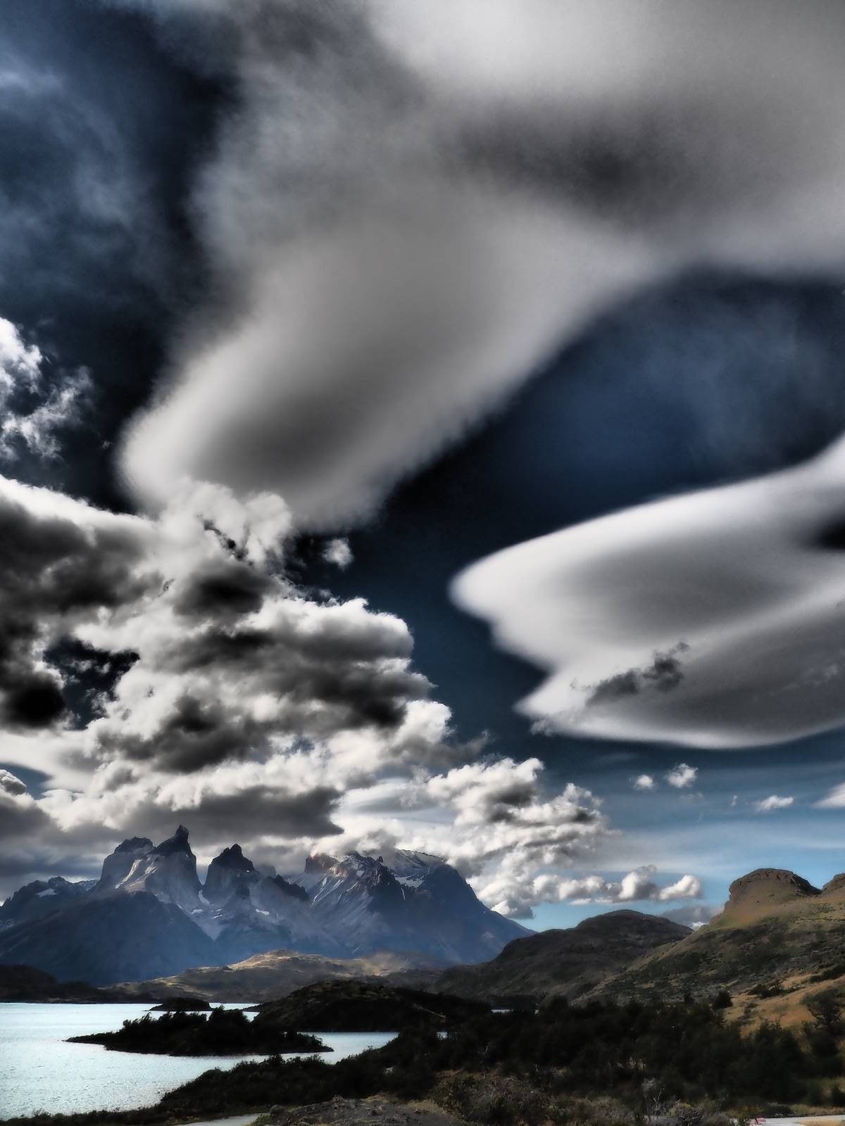 Der Weg ist gar nicht mehr so lang aber ich genieße das gemütliche Fahren und mache noch einige Fotostops, bis ich an den Campingplatz komme. Der sieht tatsächlich ganz normal aus!! Ich halte an und frage und für mein Zelt wollen sie ca. 20,- EUR haben. Ich bleibe eine Nacht, verstehe aber nicht, daß ich kaum Informationen gefunden habe, daß der Platz tatsächlich nicht so teuer ist und genügend Platz hat. Das Zelt ist bald aufgebaut und so schaue ich ins Restaurant und kaufe mir da ein kleines Bier. Das allerdings ist dann doch teuer! 8,- EUR für eine 0,33l Flasche! Aber das eine gönne ich mir und gehe etwas weiter vorn auf einen kleinen Aussichtspunkt mit Bänkchen und herrlichstem Blick über einen See auf das rückseitige Torre-Massiv. Ich erwische eine wunderbare Abendstimmung und hocke eine ganze Weile dort, bis ich mich zurück ins Restaurant begebe, um etwas zu essen. Auch das Essen ist teuer, einfach aber soweit ok. Ich hole mir meine Tüte Chips, die ich irgend wann aus Lust gekauft hatte und nun schon eine Weile mit mir rumfahre und gehe zurück auf das Bänkchen und lasse beim Anblick des vor mir liegenden Massivs die Chips knacken. Der tiefe Taleinschnitt ist also der mittlere Zacken vom „W“ den man laufen könnte. Ich erkenne Gesichter in den Felsen und habe mir bald drei Piraten rausgeschaut, die nun ständig zu mir zurück blicken. Oben scheint der Wind ganz gut zu gehen, so wie die linsenförmigen Wolken aussehen aber das stört den Condor der da kreist nicht. So langsam tauchen die ersten Sterne auf und die Sonne erleuchte nur noch ein paar Bergkanten und -spitzen in einem leichten Rot. Heute sollen alle Planeten in einer Linie zu sehen sein aber meine App sagt, dass die meisten noch unterm Horizont versteckt sind und außerdem ziehen aus der Richtung ein paar Wolken auf. Als es mir zu frisch wird gehe ich dann doch zurück und verkrieche mich in mein Zelt.