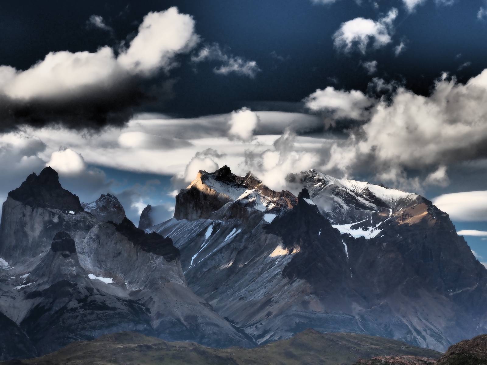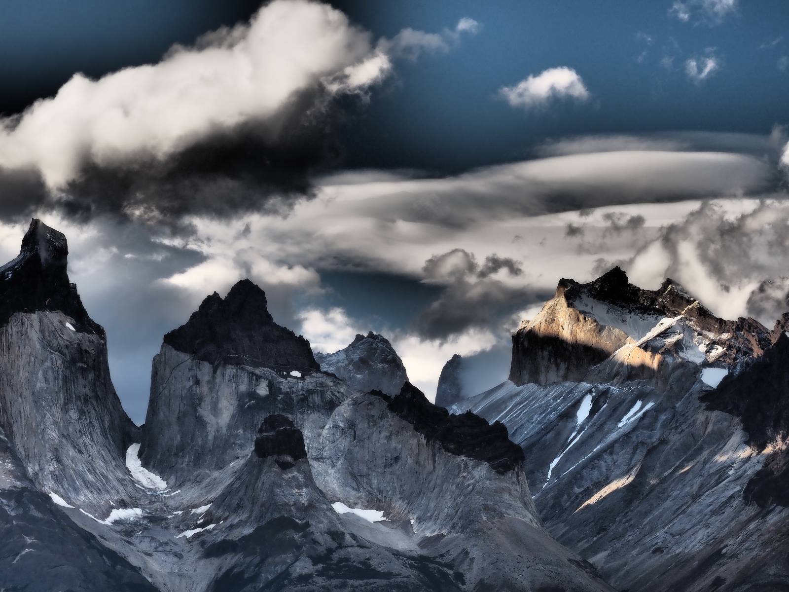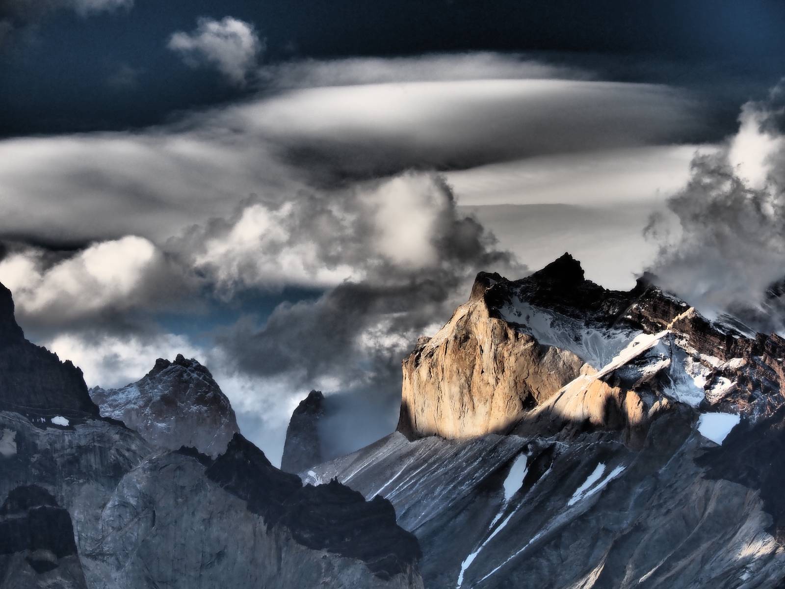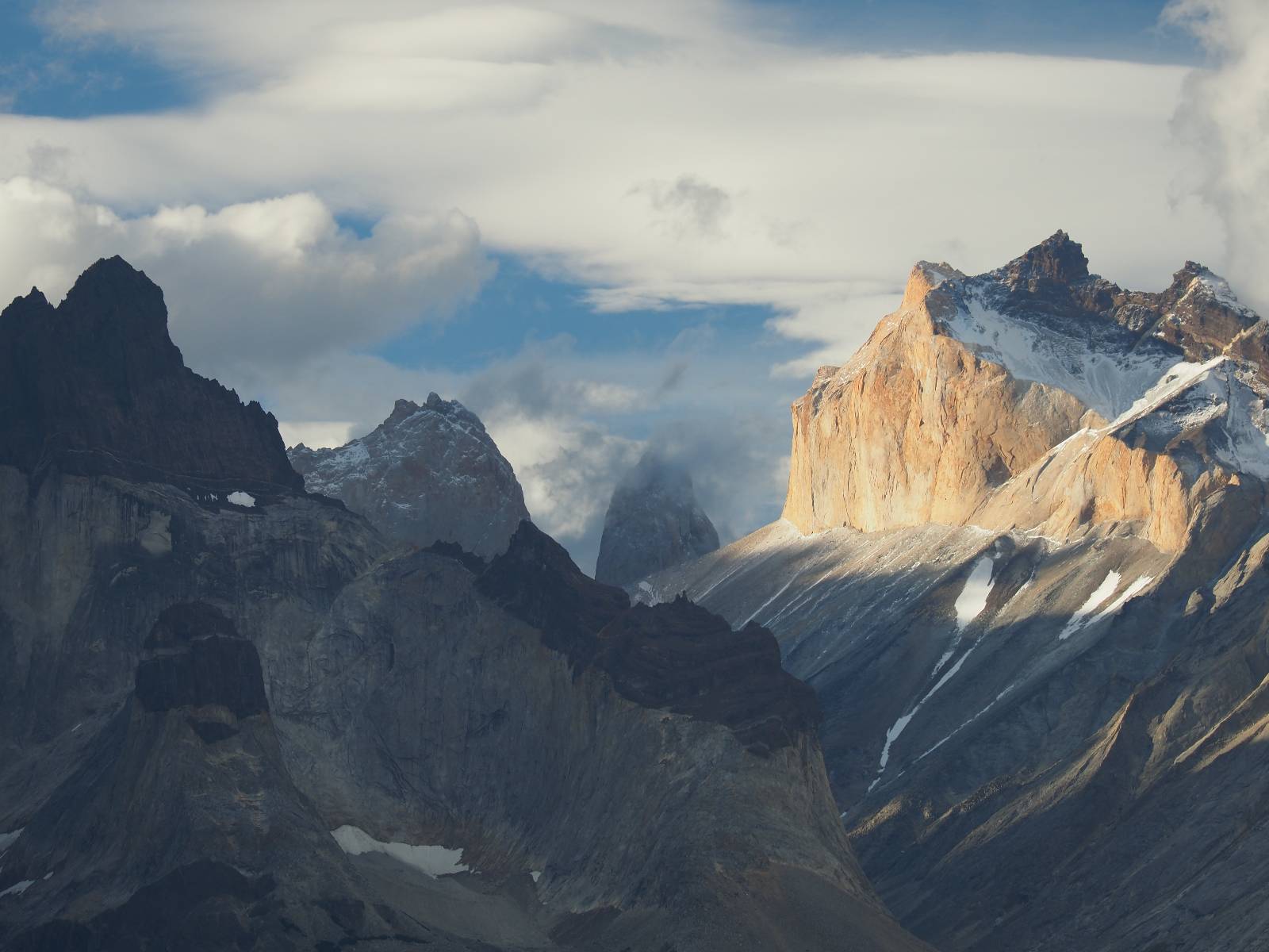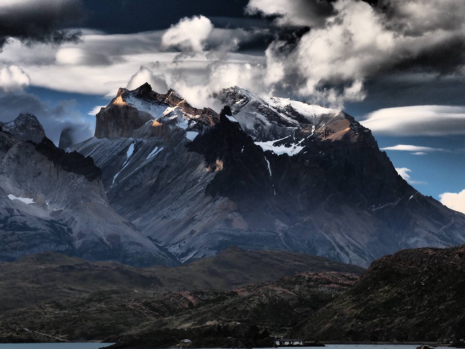 Der Weg ist gar nicht mehr so lang aber ich genieße das gemütliche Fahren und mache noch einige Fotostops, bis ich an den Campingplatz komme. Der sieht tatsächlich ganz normal aus!! Ich halte an und frage und für mein Zelt wollen sie ca. 20,- EUR haben. Ich bleibe eine Nacht, verstehe aber nicht, daß ich kaum Informationen gefunden habe, daß der Platz tatsächlich nicht so teuer ist und genügend Platz hat. Das Zelt ist bald aufgebaut und so schaue ich ins Restaurant und kaufe mir da ein kleines Bier. Das allerdings ist dann doch teuer! 8,- EUR für eine 0,33l Flasche! Aber das eine gönne ich mir und gehe etwas weiter vorn auf einen kleinen Aussichtspunkt mit Bänkchen und herrlichstem Blick über einen See auf das rückseitige Torre-Massiv. Ich erwische eine wunderbare Abendstimmung und hocke eine ganze Weile dort, bis ich mich zurück ins Restaurant begebe, um etwas zu essen. Auch das Essen ist teuer, einfach aber soweit ok. Ich hole mir meine Tüte Chips, die ich irgend wann aus Lust gekauft hatte und nun schon eine Weile mit mir rumfahre und gehe zurück auf das Bänkchen und lasse beim Anblick des vor mir liegenden Massivs die Chips knacken. Der tiefe Taleinschnitt ist also der mittlere Zacken vom „W“ den man laufen könnte. Ich erkenne Gesichter in den Felsen und habe mir bald drei Piraten rausgeschaut, die nun ständig zu mir zurück blicken. Oben scheint der Wind ganz gut zu gehen, so wie die linsenförmigen Wolken aussehen aber das stört den Condor der da kreist nicht. So langsam tauchen die ersten Sterne auf und die Sonne erleuchte nur noch ein paar Bergkanten und -spitzen in einem leichten Rot. Heute sollen alle Planeten in einer Linie zu sehen sein aber meine App sagt, dass die meisten noch unterm Horizont versteckt sind und außerdem ziehen aus der Richtung ein paar Wolken auf. Als es mir zu frisch wird gehe ich dann doch zurück und verkrieche mich in mein Zelt.