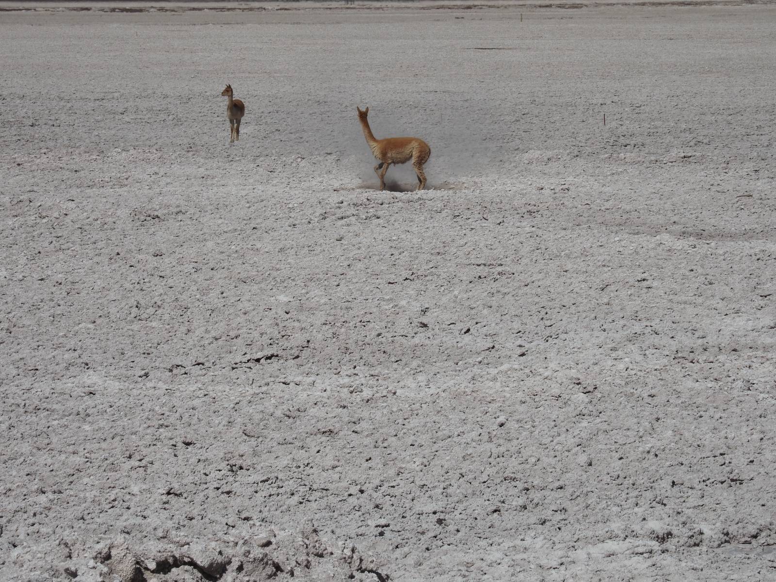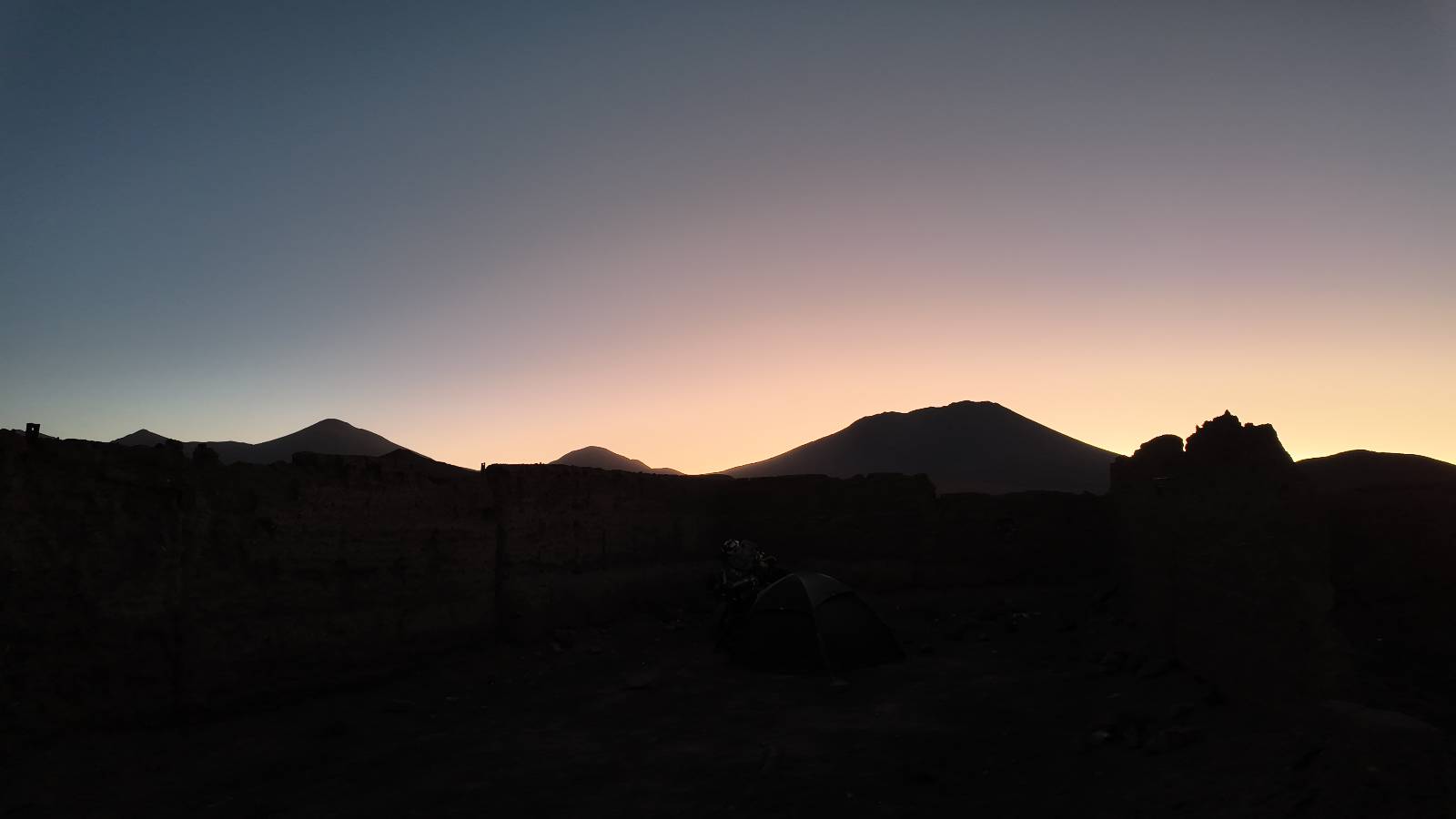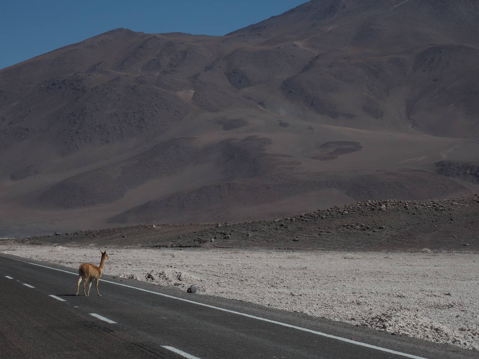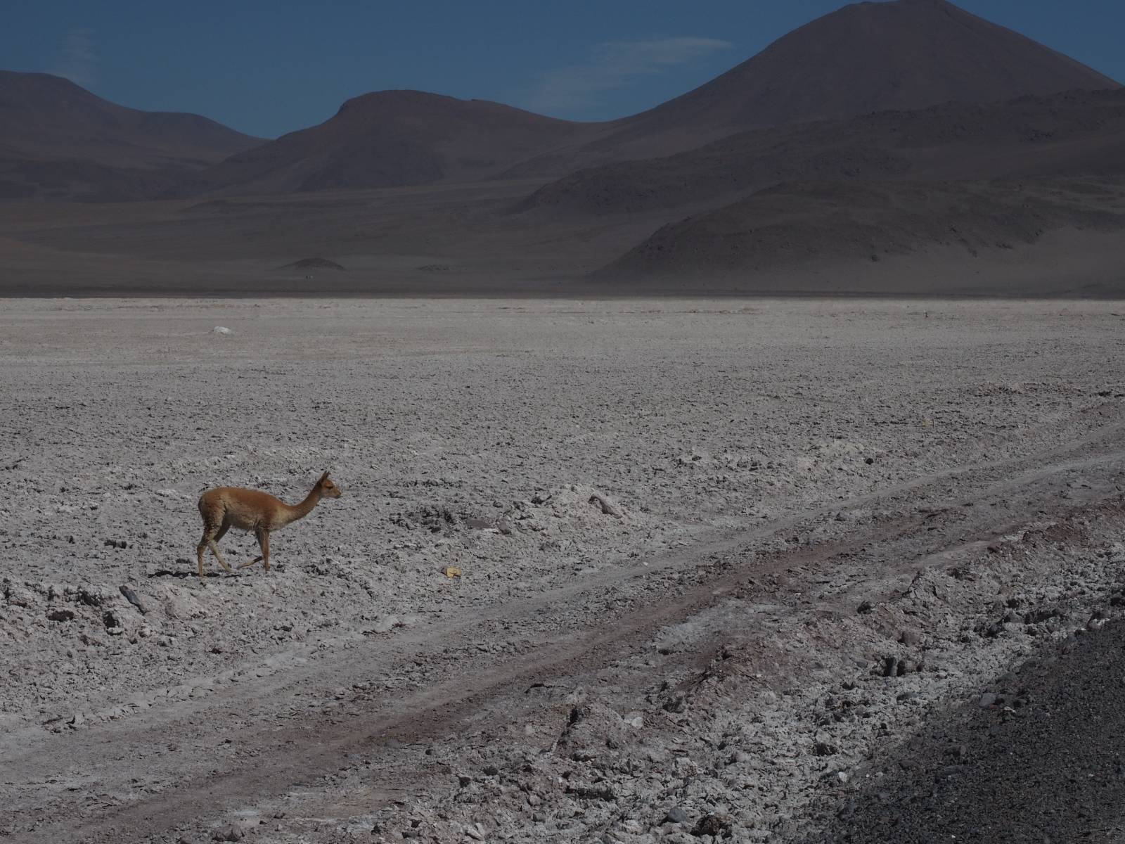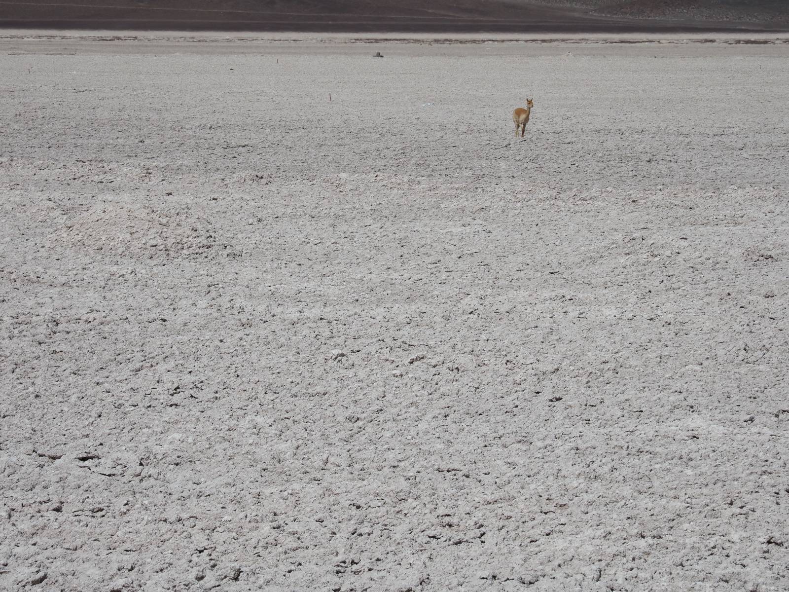 Ich habe San Pedro hinter mir gelassen. Da ich nun nicht die Laguna Route nehe fahre ich nach einem Tankstopp in Calama weiter zur Grenze nach Ollaguë. Auch wenn es nicht die Abenteuerstraße ist, so gibt es trotzdem viel zu staunen. Seicht und langsam werde ich immer höher geführt von ca 2600m in San Pedro auf erstmal ca. 3700m in Ollaguë. Aber wie das so ist, zum einen habe ich ja schon die ersten 100km bis Calama hinter mir, so dass es schon Nachmittag ist und zum anderen halte ich natürlich wieder andauernd an. Bis ich ich zum Salar Ascotan komme. Auch hier, wie schon auf der ganzen Strecke sensationelle Natur. Ich beobachte die hiesiegen Rehe, wie sie über den Salzsee an mir vorbeilaufen und wundere mich gerade wieder, wie sie es schaffen hier oben zu überleben! Ein Stückchen weiter Flamungos äh, Flamingos! Ich denke an Jessi und versuche sie sogar mit dem Tele zu kriegen! Und natürlich bietet sich mir ein neuer Hauseingang an. Ich habe keine Lust mehr bis zur Grenze zu hetzen. Ich habe wieder drei Wände, die mich vor Wind schützen und diesmal darf ich sogar das Motorrad mit rein nehemen. Schräg aber ich habe Netz! Und so kann ich von der sich minütlich ändernden Abendstimmung ein paar Bilder in den Status stellen. So stolpere ich hin und her zwischen Zelt bauen, kochen und Fotos und Videos machen…und… ich hatte eine unglaubliche Nacht…
