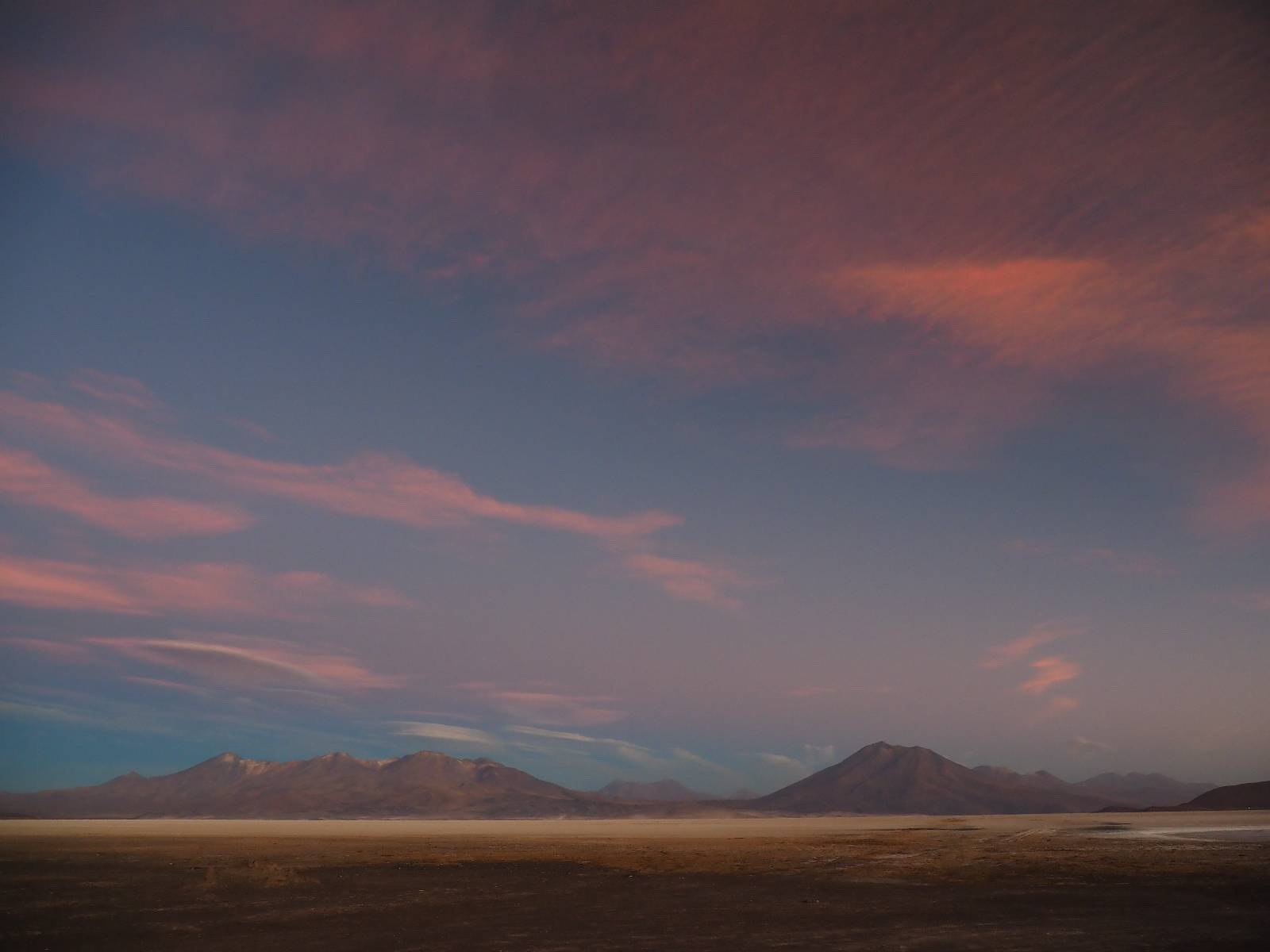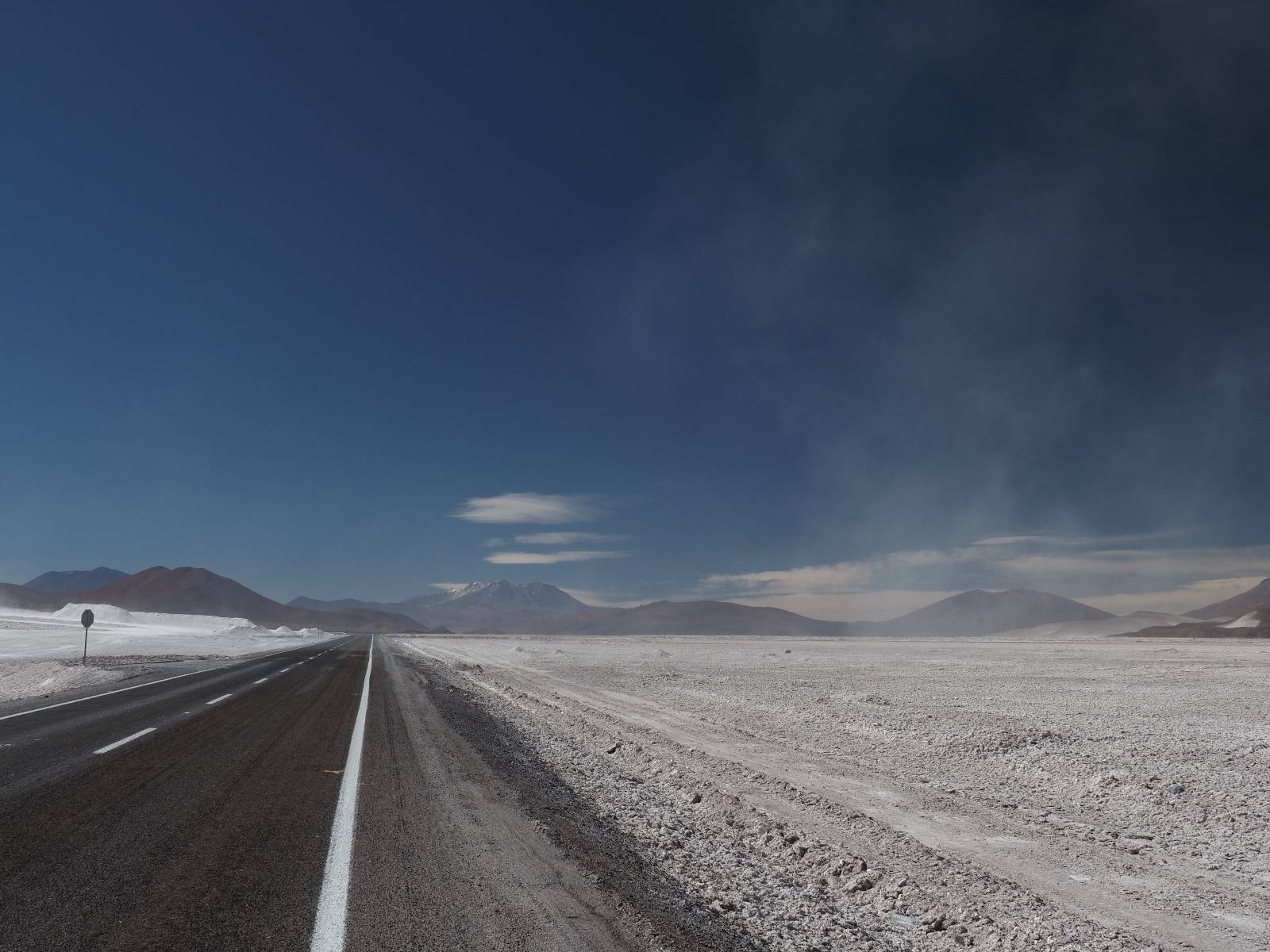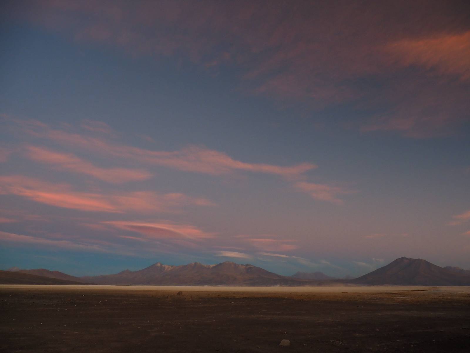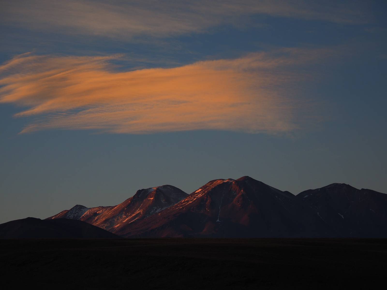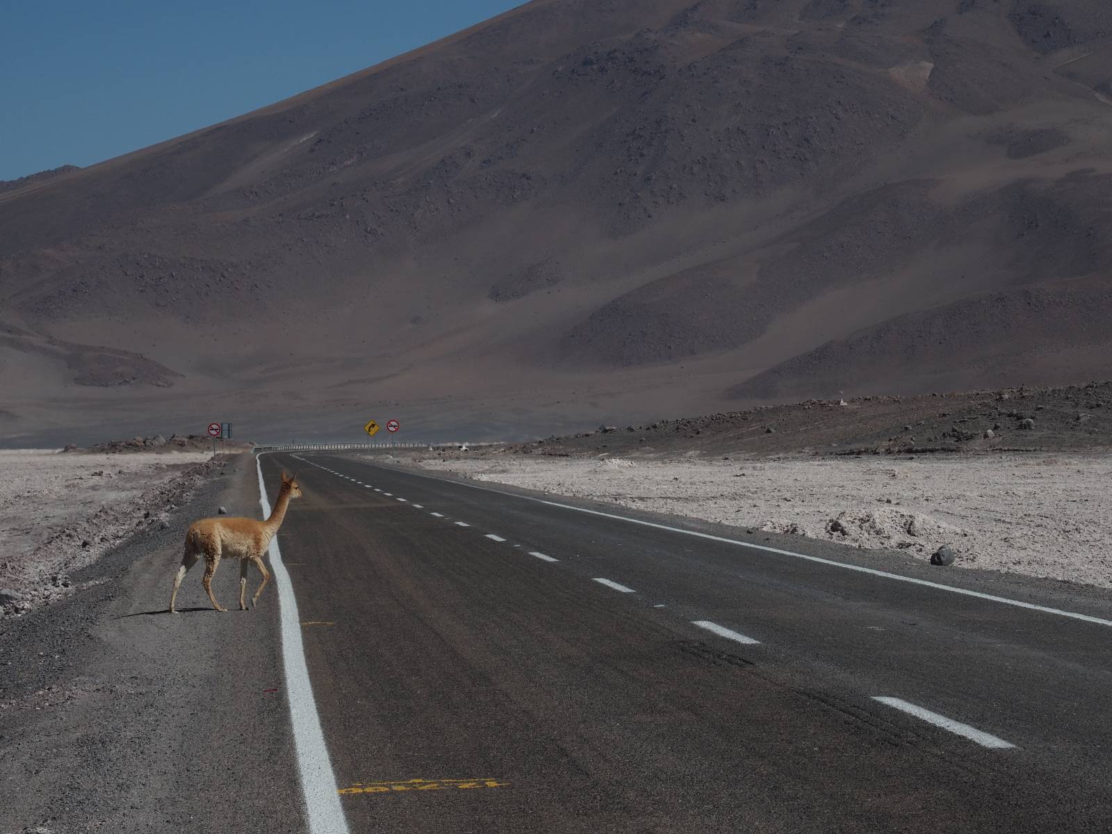 Ich habe San Pedro hinter mir gelassen. Da ich nun nicht die Laguna Route nehe fahre ich nach einem Tankstopp in Calama weiter zur Grenze nach Ollaguë. Auch wenn es nicht die Abenteuerstraße ist, so gibt es trotzdem viel zu staunen. Seicht und langsam werde ich immer höher geführt von ca 2600m in San Pedro auf erstmal ca. 3700m in Ollaguë. Aber wie das so ist, zum einen habe ich ja schon die ersten 100km bis Calama hinter mir, so dass es schon Nachmittag ist und zum anderen halte ich natürlich wieder andauernd an. Bis ich ich zum Salar Ascotan komme. Auch hier, wie schon auf der ganzen Strecke sensationelle Natur. Ich beobachte die hiesiegen Rehe, wie sie über den Salzsee an mir vorbeilaufen und wundere mich gerade wieder, wie sie es schaffen hier oben zu überleben! Ein Stückchen weiter Flamungos äh, Flamingos! Ich denke an Jessi und versuche sie sogar mit dem Tele zu kriegen! Und natürlich bietet sich mir ein neuer Hauseingang an. Ich habe keine Lust mehr bis zur Grenze zu hetzen. Ich habe wieder drei Wände, die mich vor Wind schützen und diesmal darf ich sogar das Motorrad mit rein nehemen. Schräg aber ich habe Netz! Und so kann ich von der sich minütlich ändernden Abendstimmung ein paar Bilder in den Status stellen. So stolpere ich hin und her zwischen Zelt bauen, kochen und Fotos und Videos machen…und… ich hatte eine unglaubliche Nacht…