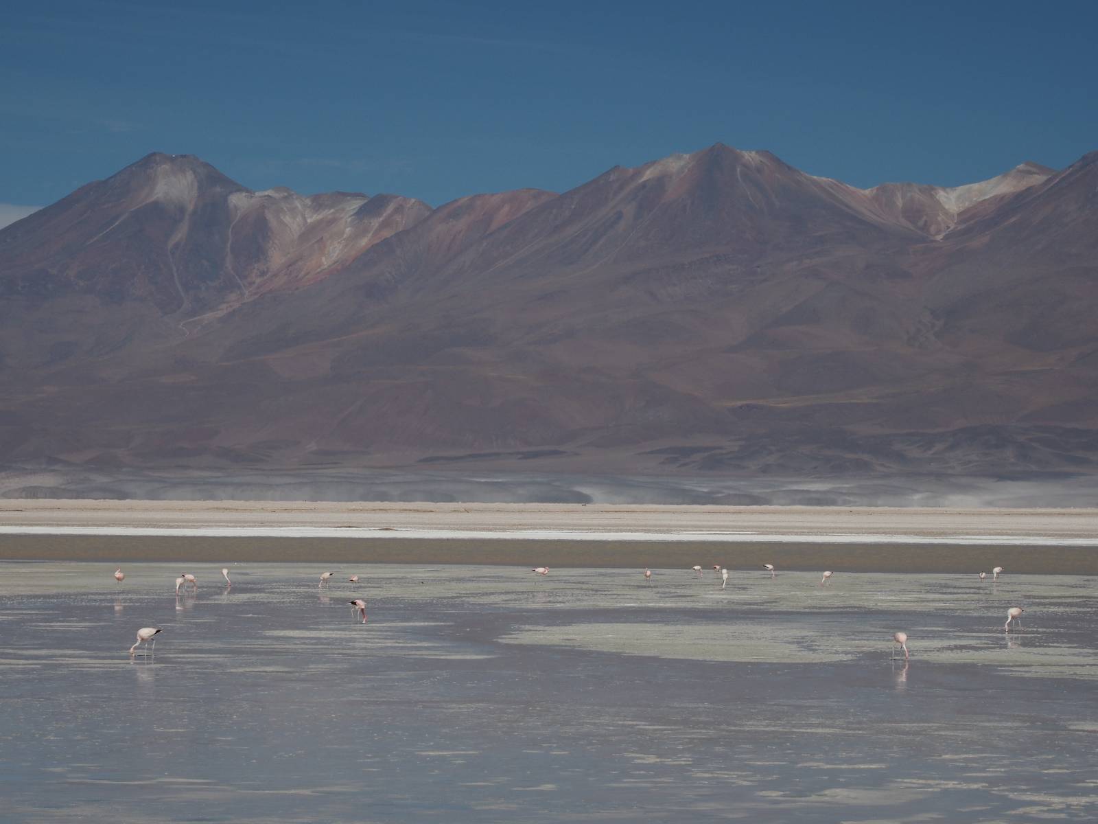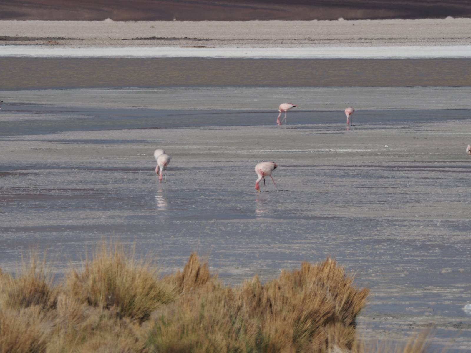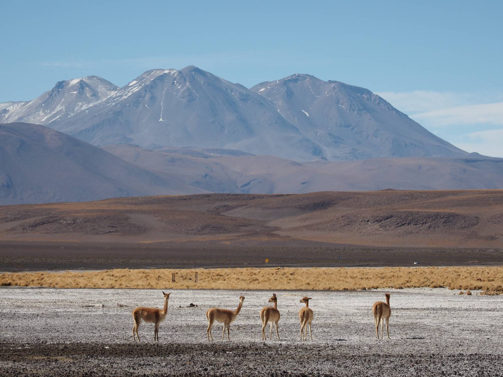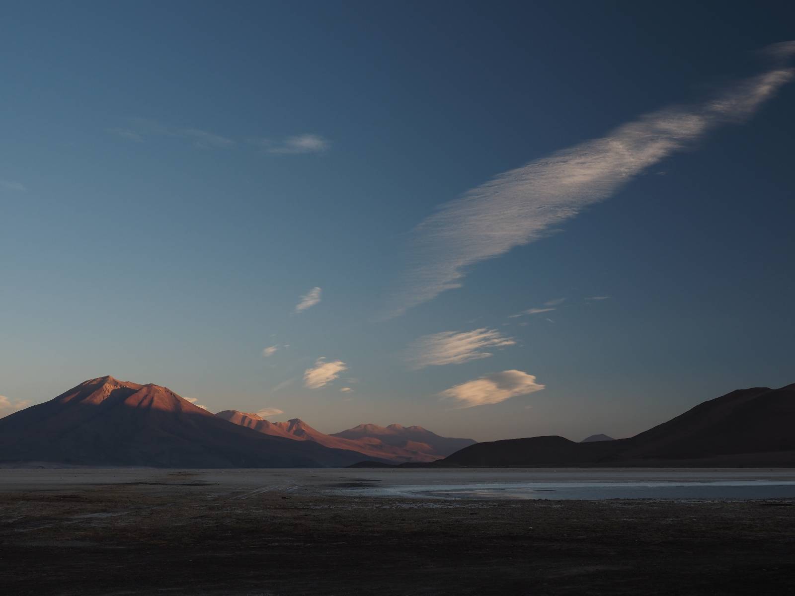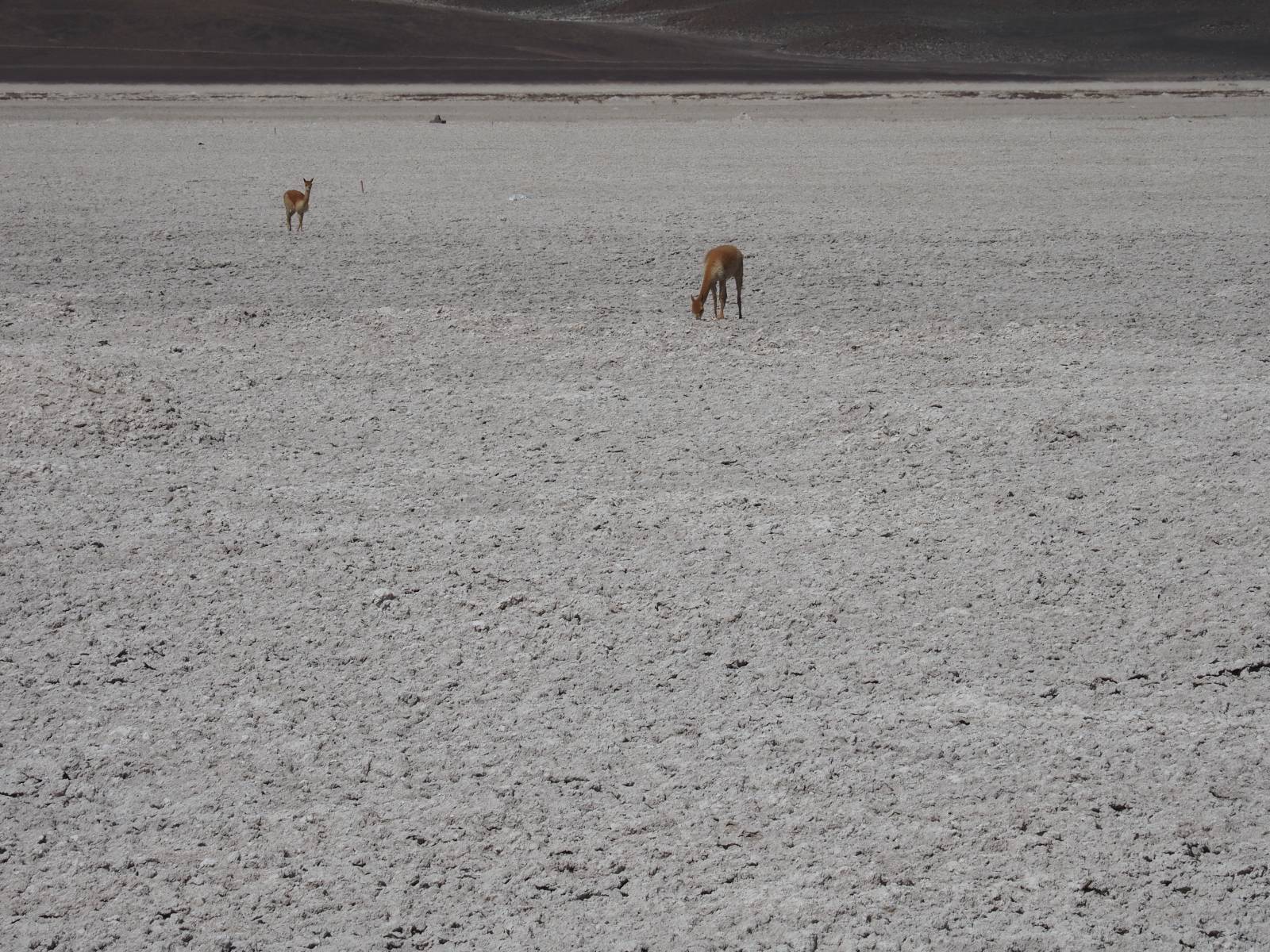 Ich habe San Pedro hinter mir gelassen. Da ich nun nicht die Laguna Route nehe fahre ich nach einem Tankstopp in Calama weiter zur Grenze nach Ollaguë. Auch wenn es nicht die Abenteuerstraße ist, so gibt es trotzdem viel zu staunen. Seicht und langsam werde ich immer höher geführt von ca 2600m in San Pedro auf erstmal ca. 3700m in Ollaguë. Aber wie das so ist, zum einen habe ich ja schon die ersten 100km bis Calama hinter mir, so dass es schon Nachmittag ist und zum anderen halte ich natürlich wieder andauernd an. Bis ich ich zum Salar Ascotan komme. Auch hier, wie schon auf der ganzen Strecke sensationelle Natur. Ich beobachte die hiesiegen Rehe, wie sie über den Salzsee an mir vorbeilaufen und wundere mich gerade wieder, wie sie es schaffen hier oben zu überleben! Ein Stückchen weiter Flamungos äh, Flamingos! Ich denke an Jessi und versuche sie sogar mit dem Tele zu kriegen! Und natürlich bietet sich mir ein neuer Hauseingang an. Ich habe keine Lust mehr bis zur Grenze zu hetzen. Ich habe wieder drei Wände, die mich vor Wind schützen und diesmal darf ich sogar das Motorrad mit rein nehemen. Schräg aber ich habe Netz! Und so kann ich von der sich minütlich ändernden Abendstimmung ein paar Bilder in den Status stellen. So stolpere ich hin und her zwischen Zelt bauen, kochen und Fotos und Videos machen…und… ich hatte eine unglaubliche Nacht…