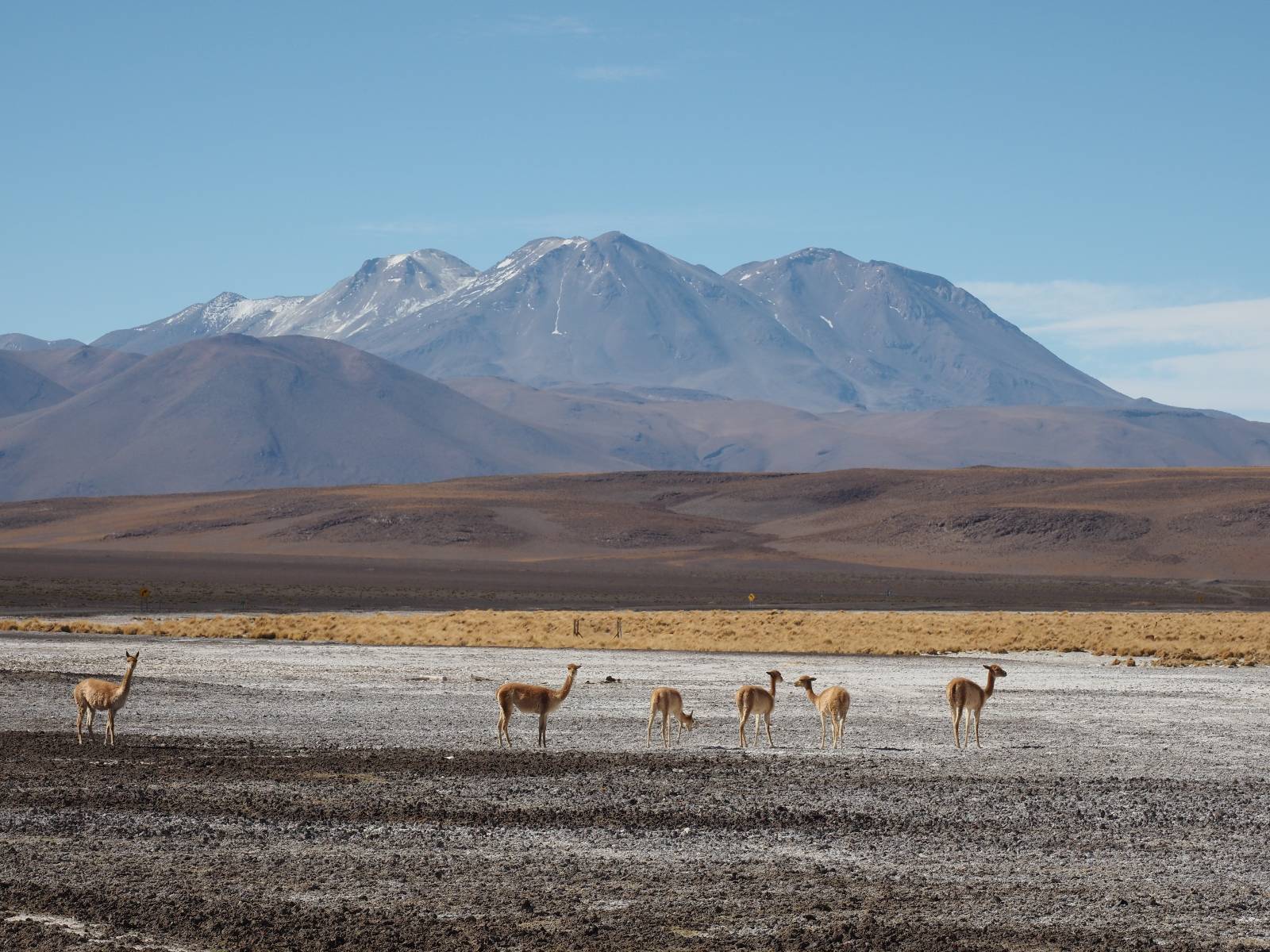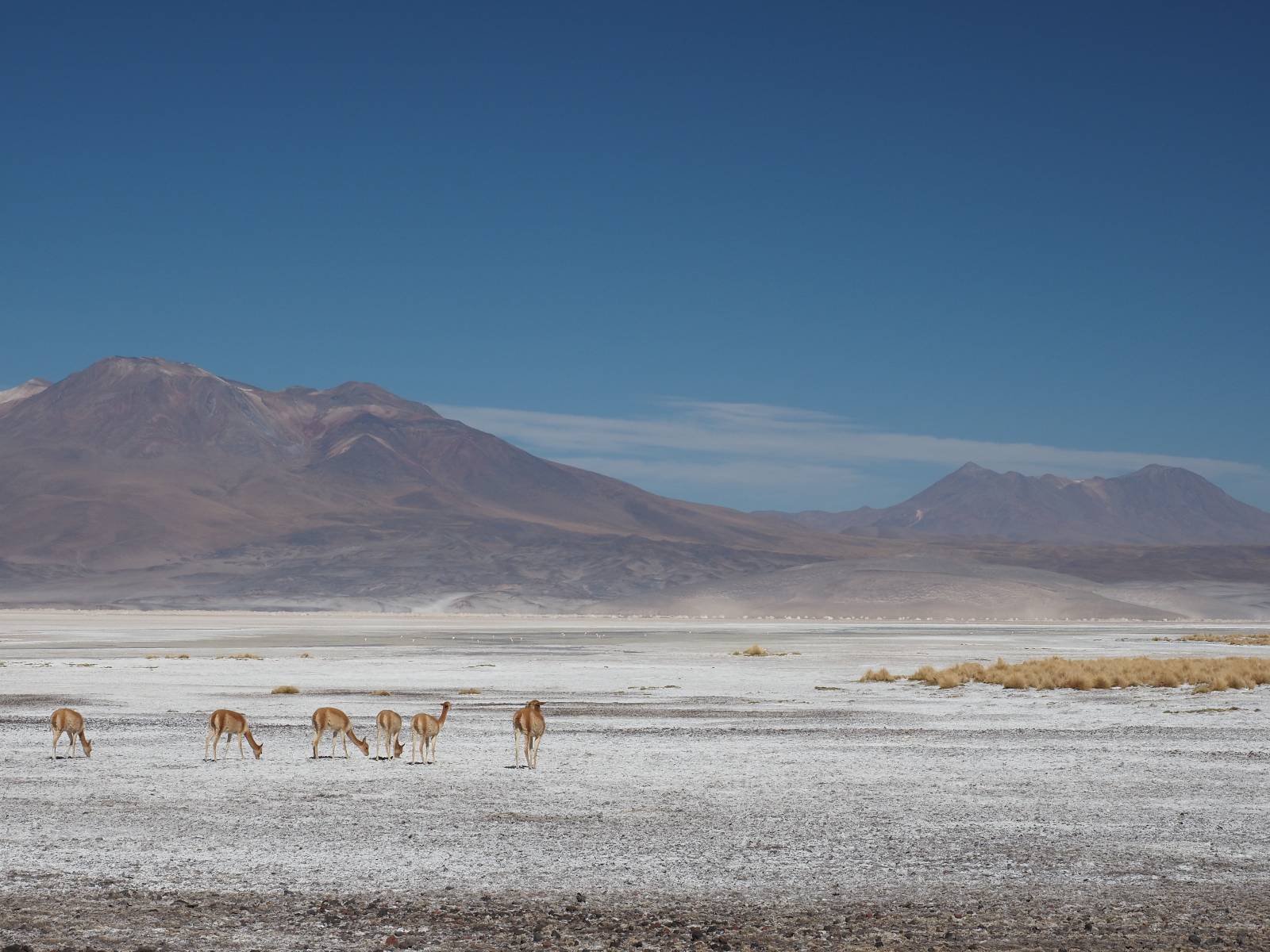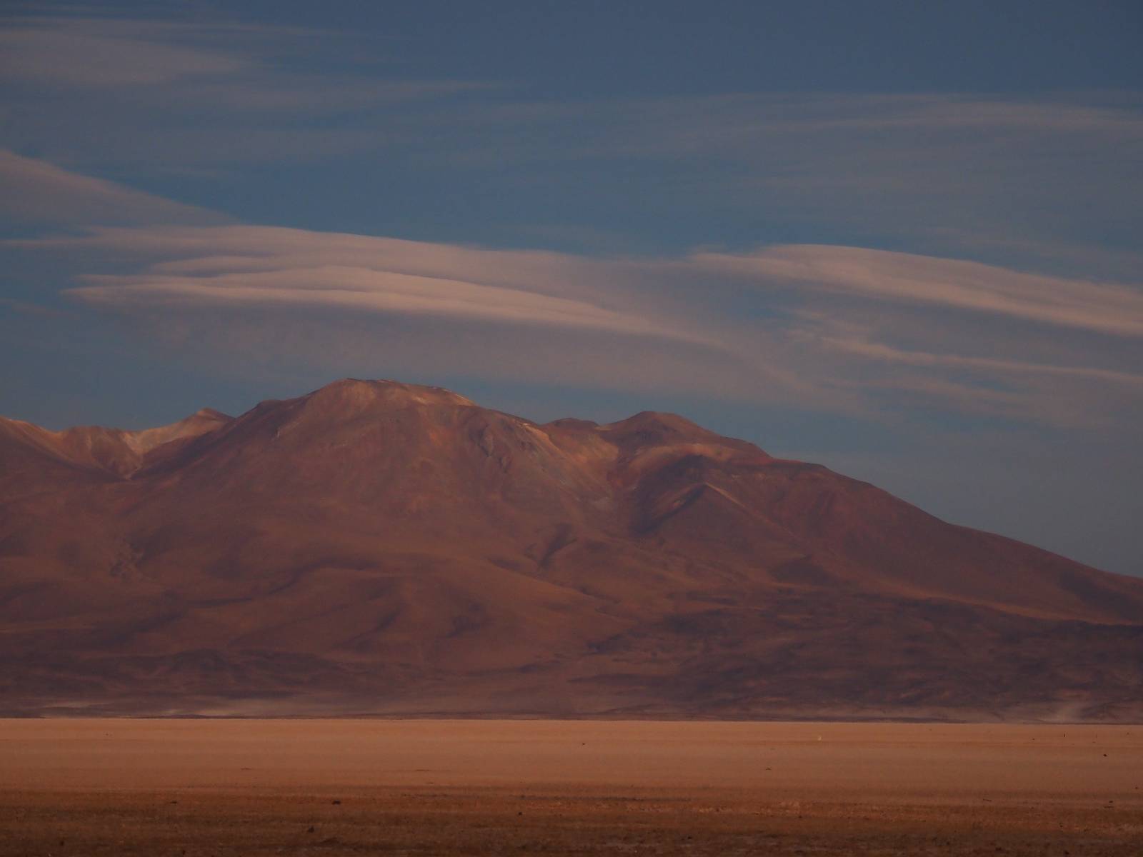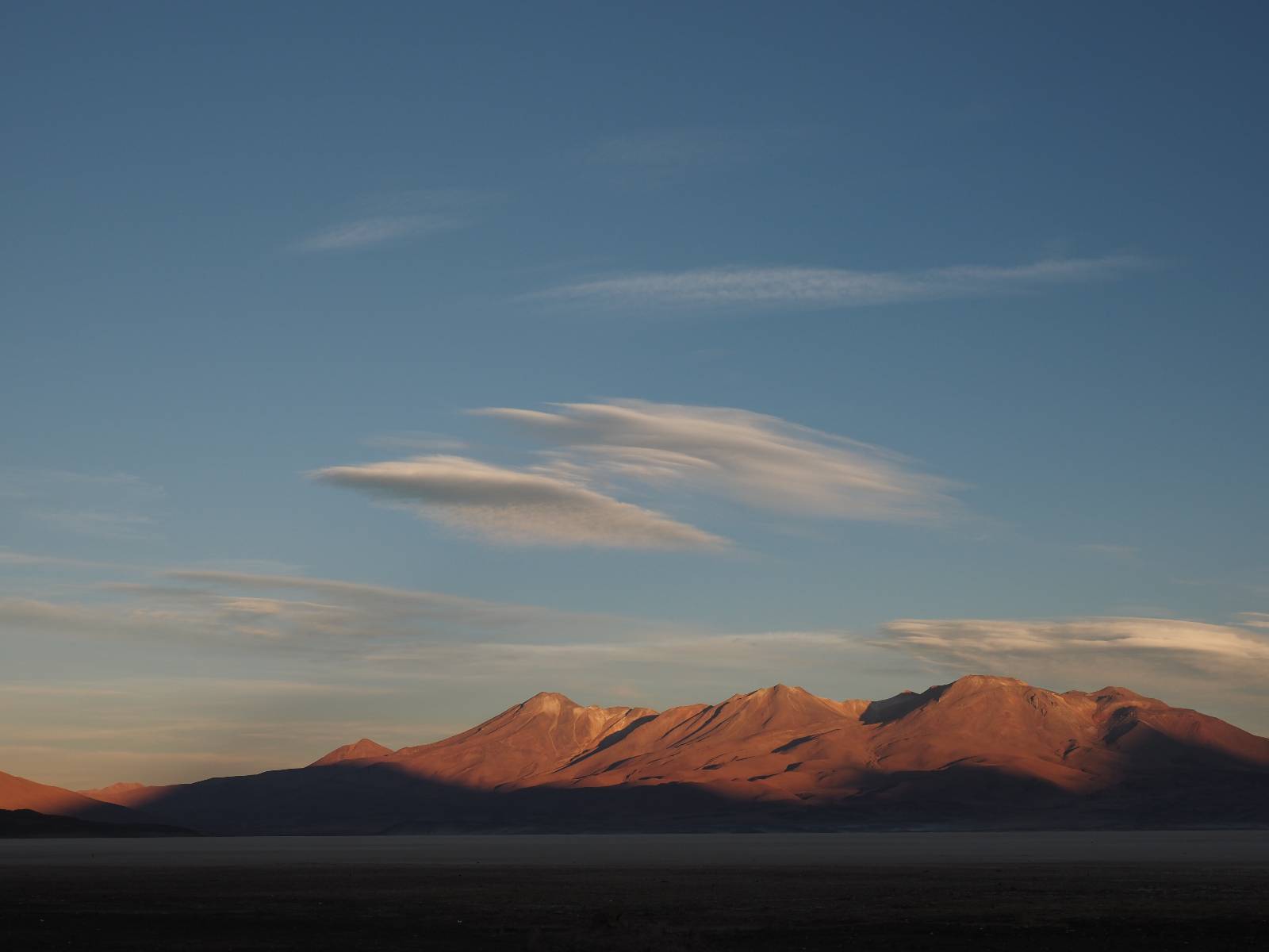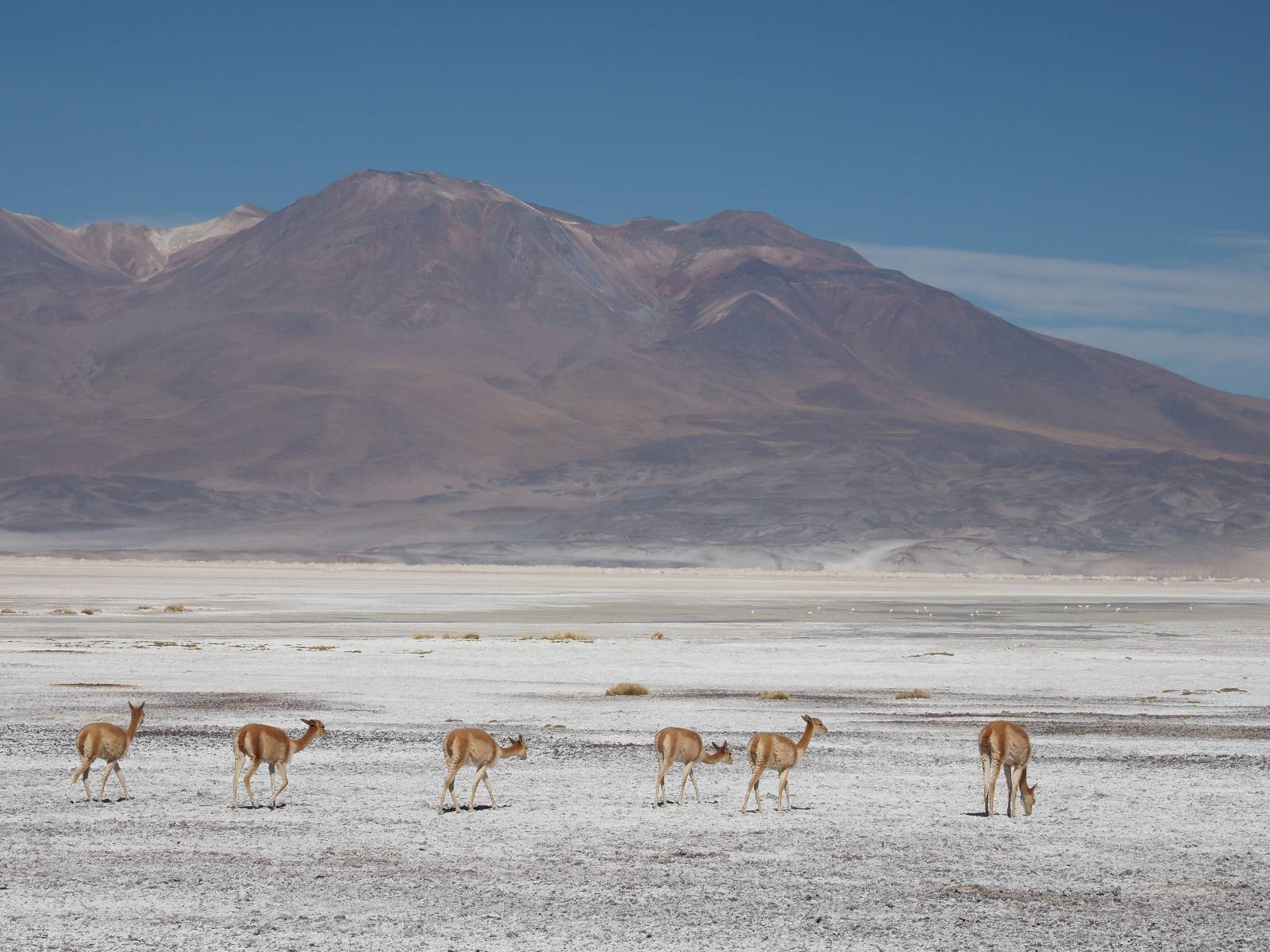 Ich habe San Pedro hinter mir gelassen. Da ich nun nicht die Laguna Route nehe fahre ich nach einem Tankstopp in Calama weiter zur Grenze nach Ollaguë. Auch wenn es nicht die Abenteuerstraße ist, so gibt es trotzdem viel zu staunen. Seicht und langsam werde ich immer höher geführt von ca 2600m in San Pedro auf erstmal ca. 3700m in Ollaguë. Aber wie das so ist, zum einen habe ich ja schon die ersten 100km bis Calama hinter mir, so dass es schon Nachmittag ist und zum anderen halte ich natürlich wieder andauernd an. Bis ich ich zum Salar Ascotan komme. Auch hier, wie schon auf der ganzen Strecke sensationelle Natur. Ich beobachte die hiesiegen Rehe, wie sie über den Salzsee an mir vorbeilaufen und wundere mich gerade wieder, wie sie es schaffen hier oben zu überleben! Ein Stückchen weiter Flamungos äh, Flamingos! Ich denke an Jessi und versuche sie sogar mit dem Tele zu kriegen! Und natürlich bietet sich mir ein neuer Hauseingang an. Ich habe keine Lust mehr bis zur Grenze zu hetzen. Ich habe wieder drei Wände, die mich vor Wind schützen und diesmal darf ich sogar das Motorrad mit rein nehemen. Schräg aber ich habe Netz! Und so kann ich von der sich minütlich ändernden Abendstimmung ein paar Bilder in den Status stellen. So stolpere ich hin und her zwischen Zelt bauen, kochen und Fotos und Videos machen…und… ich hatte eine unglaubliche Nacht…